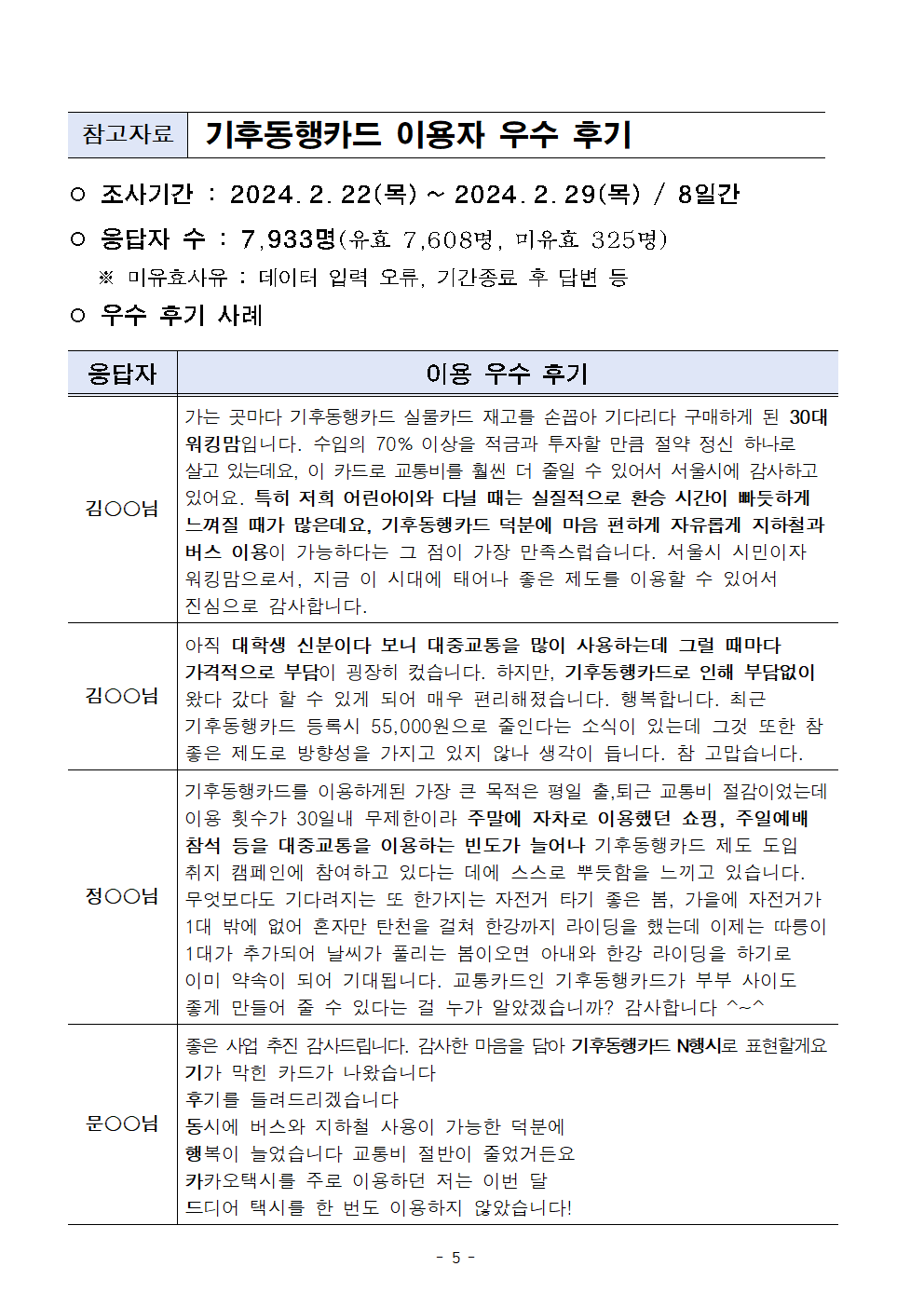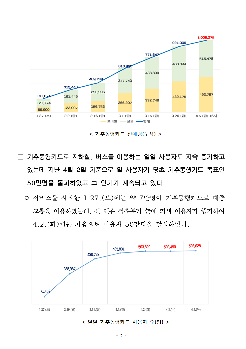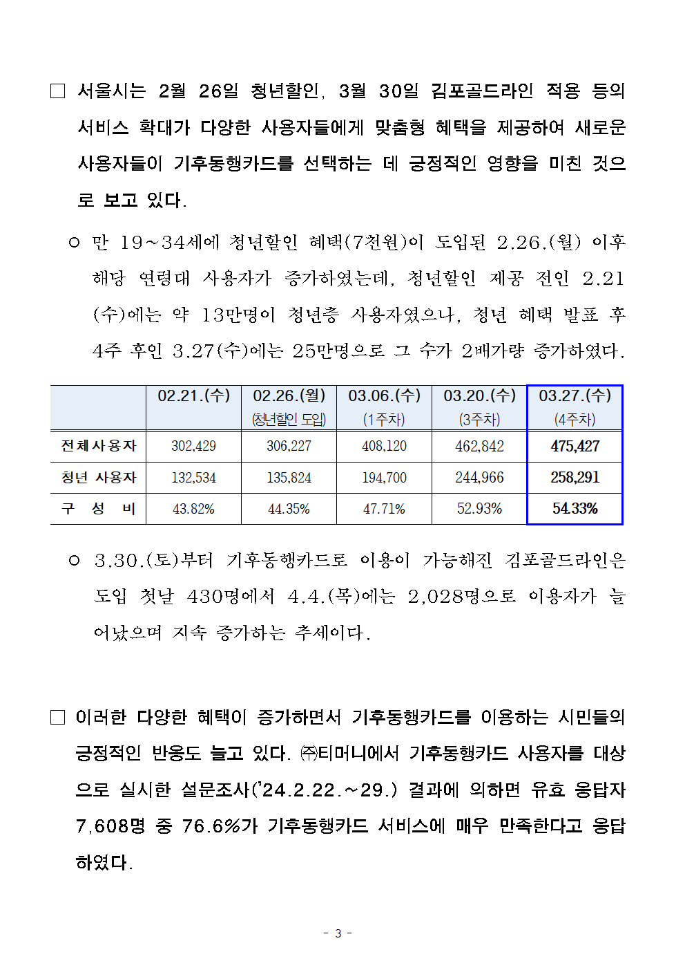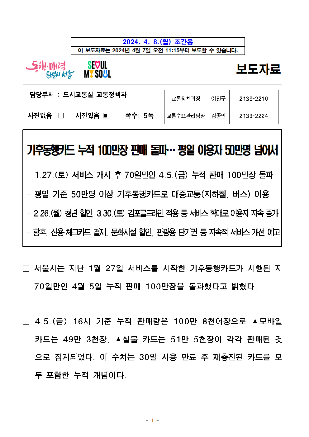 - 1 - 2024. 4. 8.(월) 조간용 이 보도자료는 2024년 4월 7일 오전 11:15부터 보도할 수 있습니다.보도자료담당부서 : 도시교통실 교통정책과 교통정책과장 이진구 2133-2210 사진없음 □ 사진있음 ▣ 쪽수: 5쪽 교통수요관리팀장 김종민 2133-2224 기후동행카드 누적 100만장 판매 돌파… 평일 이용자 50만명 넘어서- 1.27.(토) 서비스 개시 후 70일만인 4.5.(금) 누적 판매 100만장돌파- 평일 기준 50만명 이상 기후동행카드로 대중교통(지하철, 버스) 이용- 2.26.(월) 청년 할인, 3.30.(토) 김포골드라인 적용 등 서비스 확대로 이용자지속증가- 향후, 신용·체크카드 결제, 문화시설 할인, 관광용 단기권 등 지속적 서비스개선예고□ 서울시는 지난 1월 27일 서비스를 시작한 기후동행카드가 시행된지70일만인 4월 5일 누적 판매 100만장을 돌파했다고 밝혔다. □ 4.5.(금) 16시 기준 누적 판매량은 100만 8천여장으로 ▴모바일카드는 49만 3천장, ▴실물 카드는 51만 5천장이 각각 판매된것으로 집계되었다. 이 수치는 30일 사용 만료 후 재충전된 카드를모두 포함한 누적 개념이다. - 2 - < 기후동행카드 판매량(누적) > □ 기후동행카드로 지하철, 버스를 이용하는 일일 사용자도 지속 증가하고있는데 지난 4월 2일 기준으로 일 사용자가 당초 기후동행카드목표인50만명을 돌파하였고 그 인기가 계속되고 있다. ○ 서비스를 시작한 1.27.(토)에는 약 7만명이 기후동행카드로대중교통을 이용하였는데, 설 연휴 직후부터 눈에 띄게 이용자가 증가하여4.2.(화)에는 처음으로 이용자 50만명을 달성하였다. < 일일 기후동행카드 사용자 수(명) > - 3 - □ 서울시는 2월 26일 청년할인, 3월 30일 김포골드라인 적용등의서비스 확대가 다양한 사용자들에게 맞춤형 혜택을 제공하여새로운사용자들이 기후동행카드를 선택하는 데 긍정적인 영향을 미친것으로 보고 있다. ○ 만 19~34세에 청년할인 혜택(7천원)이 도입된 2.26.(월) 이후해당 연령대 사용자가 증가하였는데, 청년할인 제공 전인2.21(수)에는 약 13만명이 청년층 사용자였으나, 청년 혜택 발표후4주 후인 3.27(수)에는 25만명으로 그 수가 2배가량 증가하였다. 02.21.(수) 02.26.(월) (청년할인 도입) 03.06.(수) (1주차) 03.20.(수) (3주차) 03.27.(수) (4주차) 전체사용자 302,429 306,227 408,120 462,842 475,427 청년 사용자 132,534 135,824 194,700 244,966 258,291 구 성 비 43.82% 44.35% 47.71% 52.93% 54.33% ○ 3.30.(토)부터 기후동행카드로 이용이 가능해진 김포골드라인은도입 첫날 430명에서 4.4.(목)에는 2,028명으로 이용자가늘어났으며 지속 증가하는 추세이다. □ 이러한 다양한 혜택이 증가하면서 기후동행카드를 이용하는 시민들의긍정적인 반응도 늘고 있다. ㈜티머니에서 기후동행카드 사용자를대상으로 실시한 설문조사(’24.2.22.~29.) 결과에 의하면 유효응답자7,608명 중 76.6%가 기후동행카드 서비스에 매우 만족한다고응답하였다. - 4 - ○ 기후동행카드에 만족하는 이유로는 ▴교통비 절감, ▴대중교통이용편의 증진, ▴기후위기 대응에 기여 등을 꼽았으며, 앞으로도기후동행카드를 계속 이용하겠다고 응답한 시민은 98%에 달했다. □ 서울시는 앞으로도 기후동행카드를 이용하는 시민의 편의를 증진하기위해 혁신을 계속할 계획이다. 4월 말에는 신용·체크카드까지기후동행카드 충전 수단을 확대하고 상반기 중 서울대공원 등 문화·공원시설 입장 시 할인 혜택 제공, 본사업(7월)에는 관광객을 위한단기권출시 등 다양한 서비스를 준비하고 있다. □ 윤종장 서울시 도시교통실장은 “기후동행카드에 대한 시민들의관심과 참여에 감사드린다”라며 “앞으로 시민들이 원하는 다양한 부가혜택을 마련하여 더 편리하게 기후동행카드를 이용할 수 있도록서비스개선에 총력을 다하겠다“고 밝혔다. - 5 - 참고자료 기후동행카드 이용자 우수 후기 ○ 조사기간 : 2024. 2. 22(목) ~ 2024. 2. 29(목) / 8일간 ○ 응답자 수 : 7,933명(유효 7,608명, 미유효 325명) ※ 미유효사유 : 데이터 입력 오류, 기간종료 후 답변 등 ○ 우수 후기 사례 응답자 이용 우수 후기 김○○님 가는 곳마다 기후동행카드 실물카드 재고를 손꼽아 기다리다 구매하게 된 30대 워킹맘입니다. 수입의 70% 이상을 적금과 투자할 만큼 절약 정신 하나로 살고 있는데요, 이 카드로 교통비를 훨씬 더 줄일 수 있어서 서울시에 감사하고 있어요. 특히 저희 어린아이와 다닐 때는 실질적으로 환승 시간이 빠듯하게 느껴질 때가 많은데요, 기후동행카드 덕분에 마음 편하게 자유롭게 지하철과 버스 이용이 가능하다는 그 점이 가장 만족스럽습니다. 서울시 시민이자 워킹맘으로서, 지금 이 시대에 태어나 좋은 제도를 이용할 수 있어서 진심으로 감사합니다. 김○○님 아직 대학생 신분이다 보니 대중교통을 많이 사용하는데 그럴 때마다 가격적으로 부담이 굉장히 컸습니다. 하지만, 기후동행카드로 인해 부담없이왔다 갔다 할 수 있게 되어 매우 편리해졌습니다. 행복합니다. 최근 기후동행카드 등록시 55,000원으로 줄인다는 소식이 있는데 그것 또한 참 좋은 제도로 방향성을 가지고 있지 않나 생각이 듭니다. 참 고맙습니다. 정○○님 기후동행카드를 이용하게된 가장 큰 목적은 평일 출,퇴근 교통비 절감이었는데 이