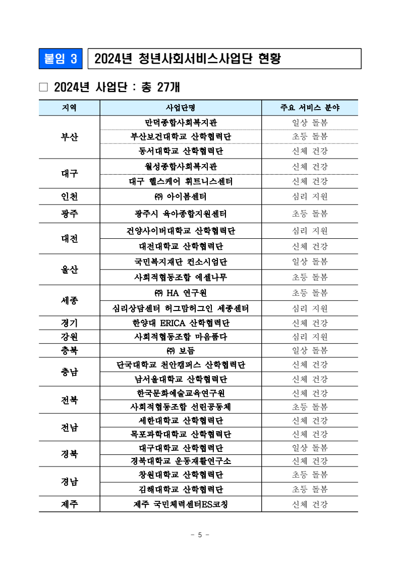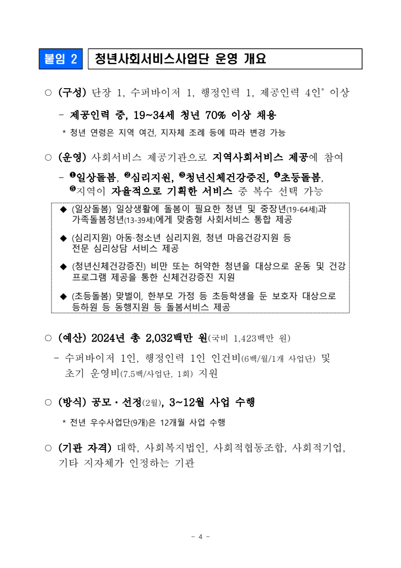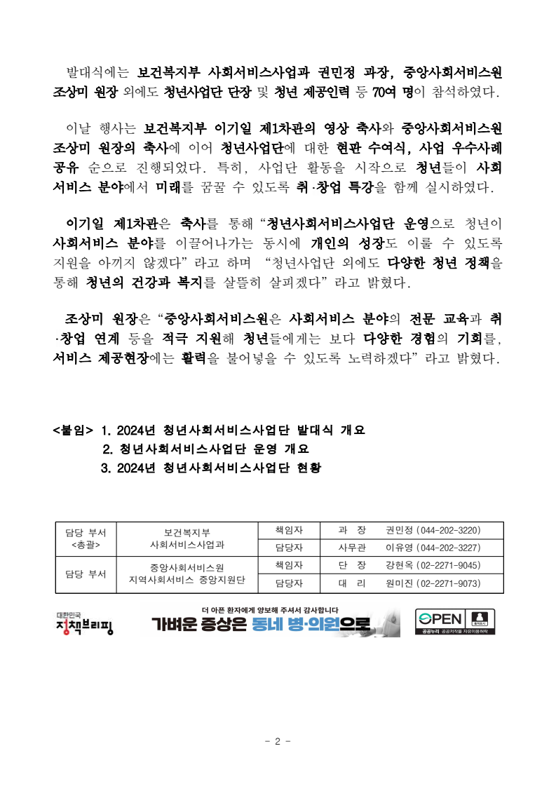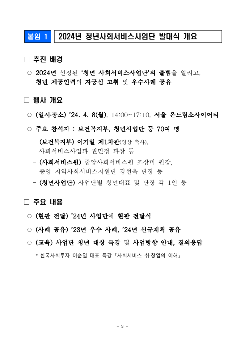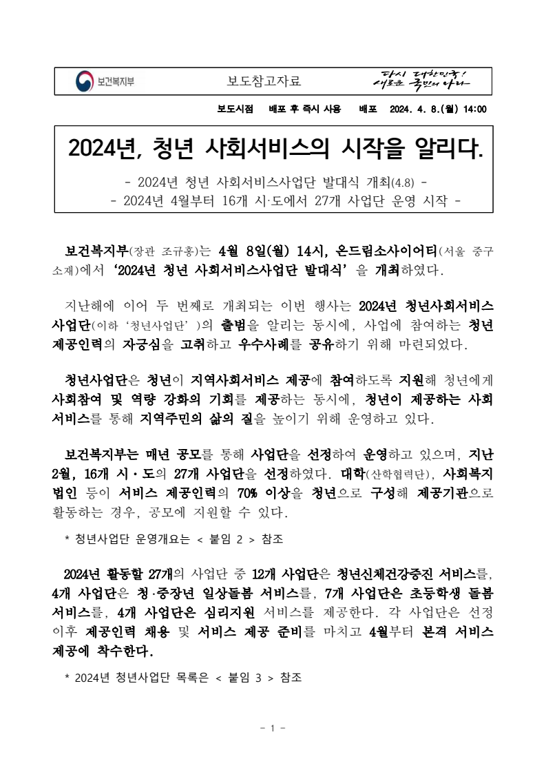 - 1 - 광부 보도참고자료 보도시점 배포 후 즉시 사용 배포 2024. 4. 8.(월) 14:00 2024년, 청년 사회서비스의 시작을 알리다. - 2024년 청년 사회서비스사업단 발대식 개최(4.8) - - 2024년 4월부터 16개 시‧도에서 27개 사업단 운영 시작 - 보건복지부(장관 조규홍)는 4월 8일(월) 14시, 온드림소사이어티(서울 중구 소재)에서‘2024년 청년 사회서비스사업단 발대식’을 개최하였다. 지난해에 이어 두 번째로 개최되는 이번 행사는 2024년 청년사회서비스사업단(이하‘청년사업단’)의 출범을 알리는 동시에, 사업에 참여하는 청년제공인력의 자긍심을 고취하고 우수사례를 공유하기 위해 마련되었다. 청년사업단은 청년이 지역사회서비스 제공에 참여하도록 지원해 청년에게 사회참여 및 역량 강화의 기회를 제공하는 동시에, 청년이 제공하는 사회 서비스를 통해 지역주민의 삶의 질을 높이기 위해 운영하고 있다. 보건복지부는 매년 공모를 통해 사업단을 선정하여 운영하고 있으며, 지난 2월, 16개 시․도의 27개 사업단을 선정하였다. 대학(산학협력단), 사회복지법인 등이 서비스 제공인력의 70% 이상을 청년으로 구성해 제공기관으로 활동하는 경우, 공모에 지원할 수 있다. * 청년사업단 운영개요는 < 붙임 2 > 참조 2024년 활동할 27개의 사업단 중 12개 사업단은 청년신체건강증진 서비스를, 4개 사업단은 청‧중장년 일상돌봄 서비스를, 7개 사업단은 초등학생 돌봄 서비스를, 4개 사업단은 심리지원 서비스를 제공한다. 각 사업단은 선정 이후 제공인력 채용 및 서비스 제공 준비를 마치고 4월부터 본격 서비스 제공에 착수한다. * 2024년 청년사업단 목록은 < 붙임 3 > 참조 - 2 - 발대식에는 보건복지부 사회서비스사업과 권민정 과장, 중앙사회서비스원 조상미 원장 외에도 청년사업단 단장 및 청년 제공인력 등 70여 명이 참석하였다. 이날 행사는 보건복지부 이기일 제1차관의 영상 축사와 중앙사회서비스원 조상미 원장의 축사에 이어 청년사업단에 대한 현판 수여식, 사업 우수사례 공유 순으로 진행되었다. 특히, 사업단 활동을 시작으로 청년들이 사회 서비스 분야에서 미래를 꿈꿀 수 있도록 취‧창업 특강을 함께 실시하였다. 이기일 제1차관은 축사를 통해“청년사회서비스사업단 운영으로 청년이 사회서비스 분야를 이끌어나가는 동시에 개인의 성장도 이룰 수 있도록 지원을 아끼지 않겠다”라고 하며 “청년사업단 외에도 다양한 청년 정책을 통해 청년의 건강과 복지를 살뜰히 살피겠다”라고 밝혔다. 조상미 원장은“중앙사회서비스원은 사회서비스 분야의 전문 교육과 취‧창업 연계 등을 적극 지원해 청년들에게는 보다 다양한 경험의 기회를, 서비스 제공현장에는 활력을 불어넣을 수 있도록 노력하겠다”라고 밝혔다. <붙임> 1. 2024년 청년사회서비스사업단 발대식 개요 2. 청년사회서비스사업단 운영 개요 3. 2024년 청년사회서비스사업단 현황 담당 부서 보건복지부 책임자 과 장 권민정 (044-202-3220) <총괄> 사회서비스사업과 담당자 사무관 이유영 (044-202-3227) 담당 부서 중앙사회서비스원 지역사회서비스 중앙지원단 책임자 단 장 강현옥 (02-2271-9045) 담당자 대 리 원미진 (02-2271-9073) - 3 - 붙임 1 2024년 청년사회서비스사업단 발대식 개요□ 추진 배경 ○ 2024년 선정된 ‘청년 사회서비스사업단’의 출범을 알리고, 청년 제공인력의 자긍심 고취 및 우수사례 공유 □ 행사 개요 ○ (일시․장소) ’24. 4. 8(월), 14:00~17:10, 서울 온드림소사이어티 ○ 주요 참석자 : 보건복지부, 청년사업단 등 70여 명 - (보건복지부) 이기일 제1차관(영상 축사), 사회서비스사업과 권민정 과장 등 - (사회서비스원) 중앙사회서비스원 조상미 원장, 중앙 지역사회서비스지원단 강현옥 단장 등 - (청년사업단) 사업단별 청년대표 및 단장 각 1인 등 □ 주요 내용 ○ (현판 전달) ’24년 사업단에 현판 전달식 ○ (사례 공유) ’23년 우수 사례, ’24년 신규계획 공유 ○ (교육) 사업단 청년 대상 특강 및 사업방향 안내, 질의응답 * 한국사회투자 이순열 대표 특강 「사회서비스 취‧창업의 이해」 - 4 - 붙임 2 청년사회서비스사업단 운영 개요 ○ (구성) 단장 1, 수퍼바이저 1, 행정인력 1, 제공인력 4인* 이상 - 제공인력 중, 19~34세 청년 70% 이상 채용 * 청년 연령은 지역 여건, 지자체 조례 등에 따라 변경 가능 ○ (운영) 사회서비스 제공기관으로 지역사회서비스 제공에 참여 - ❶일상돌봄, ❷심리지원, ❸청년신체건강증진, ❹초등돌봄, ❺지역이 자율적으로 기획한 서비스 중 복수 선택 가능 (일상돌봄) 일상생활에 돌봄이 필요한 청년 및 중장년(19-64세)과 가족돌봄청년(13-39세)에게 맞춤형 사회서비스 통합 제공 (심리지원) 아동‧청소년 심리지원, 청년 마음건강지원 등 전문 심리상담 서비스 제공 (청년신체건강증진) 비만 또는 허약한 청년을 대상으로 운동 및 건강프로그램 제공을 통한 신체건강증진 지원 (초등돌봄) 맞벌이, 한부모 가정 등 초등학생을 둔 보호자 대상으로 등하원 등 동행지원 등 돌봄서비스 제공 ○ (예산) 2024년 총 2,032백만 원(국비 1,423백만 원) - 수퍼바이저 1인, 행정인력 1인 인건비(6백/월/1개 사업단) 및 초기 운영비(7.5백/사업단, 1회) 지원