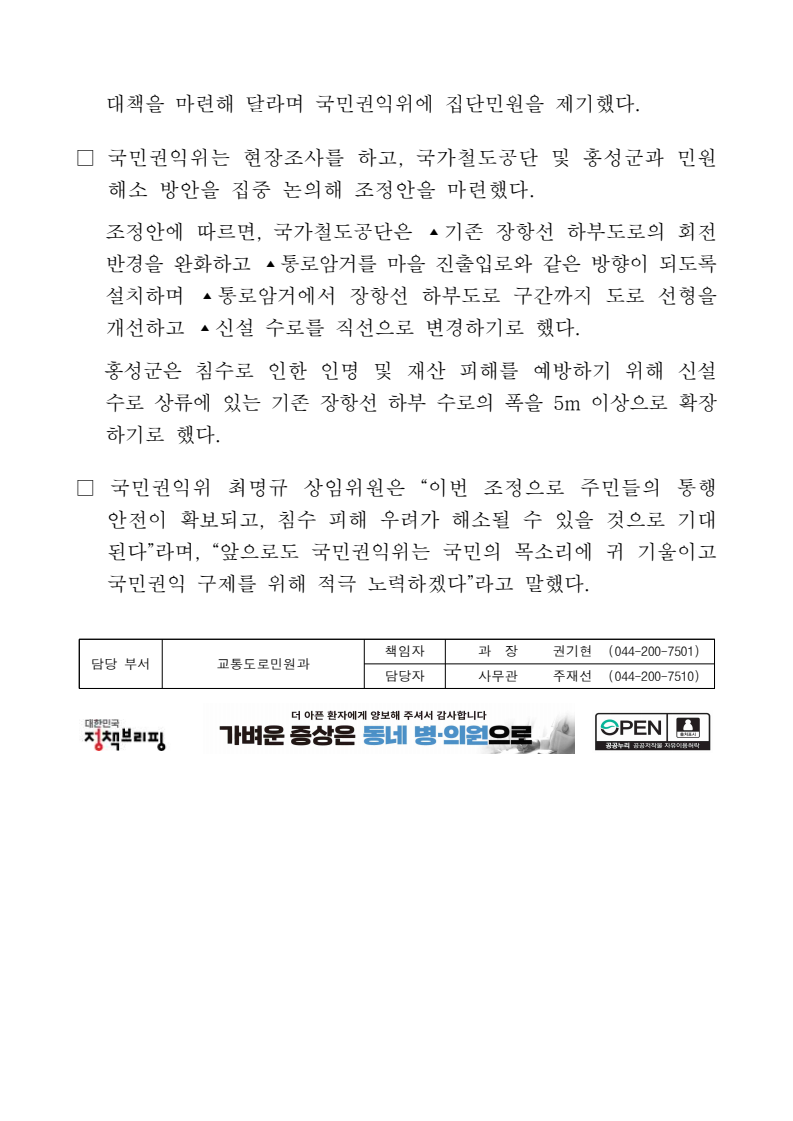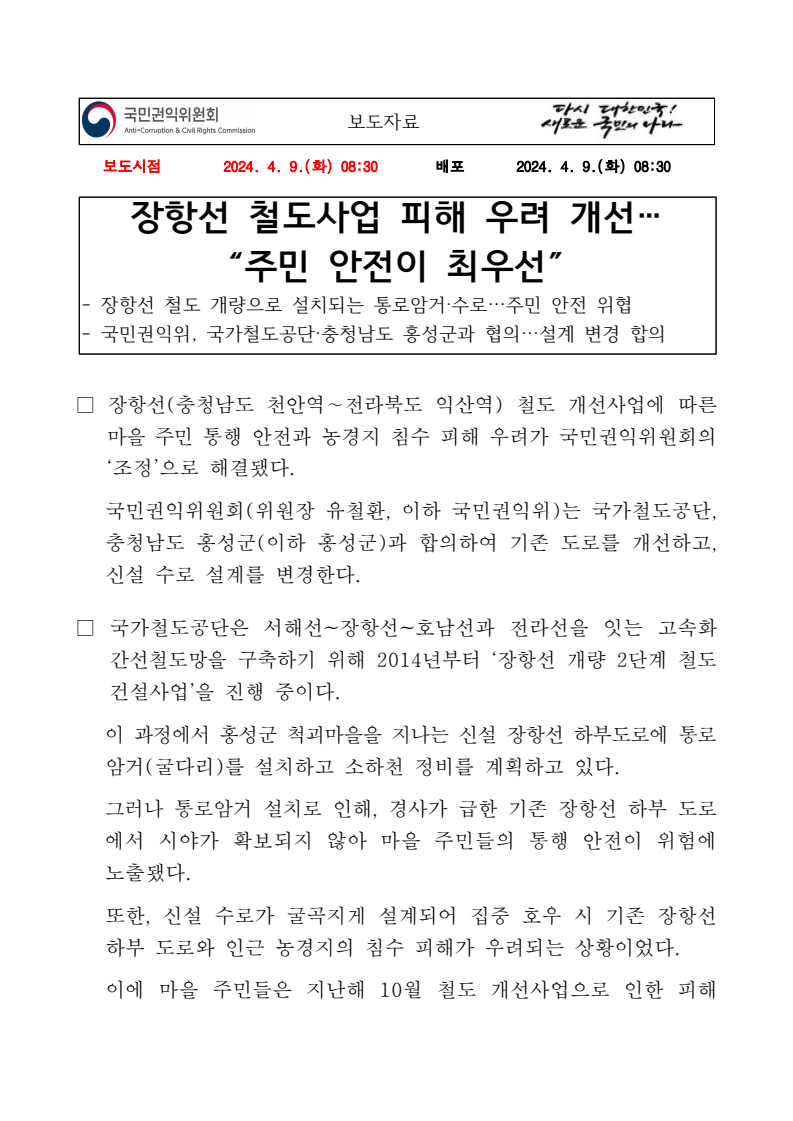 금융위원회 보도자료 보도시점 2024. 4. 9.(화) 08:30 배포 2024. 4. 9.(화) 08:30 장항선 철도사업 피해 우려 개선…“주민 안전이 최우선” - 장항선 철도 개량으로 설치되는 통로암거‧수로…주민 안전 위협 - 국민권익위, 국가철도공단·충청남도 홍성군과 협의…설계 변경 합의□ 장항선(충청남도 천안역∼전라북도 익산역) 철도 개선사업에 따른 마을 주민 통행 안전과 농경지 침수 피해 우려가 국민권익위원회의 ‘조정’으로 해결됐다. 국민권익위원회(위원장 유철환, 이하 국민권익위)는 국가철도공단, 충청남도 홍성군(이하 홍성군)과 합의하여 기존 도로를 개선하고, 신설 수로 설계를 변경한다. □ 국가철도공단은 서해선~장항선~호남선과 전라선을 잇는 고속화 간선철도망을 구축하기 위해 2014년부터 ‘장항선 개량 2단계 철도 건설사업’을 진행 중이다. 이 과정에서 홍성군 척괴마을을 지나는 신설 장항선 하부도로에 통로암거(굴다리)를 설치하고 소하천 정비를 계획하고 있다. 그러나 통로암거 설치로 인해, 경사가 급한 기존 장항선 하부 도로에서 시야가 확보되지 않아 마을 주민들의 통행 안전이 위험에 노출됐다. 또한, 신설 수로가 굴곡지게 설계되어 집중 호우 시 기존 장항선 하부 도로와 인근 농경지의 침수 피해가 우려되는 상황이었다. 이에 마을 주민들은 지난해 10월 철도 개선사업으로 인한 피해 대책을 마련해 달라며 국민권익위에 집단민원을 제기했다. □ 국민권익위는 현장조사를 하고, 국가철도공단 및 홍성군과 민원 해소 방안을 집중 논의해 조정안을 마련했다. 조정안에 따르면, 국가철도공단은 ▴기존 장항선 하부도로의 회전반경을 완화하고 ▴통로암거를 마을 진출입로와 같은 방향이 되도록 설치하며 ▴통로암거에서 장항선 하부도로 구간까지 도로 선형을 개선하고 ▴신설 수로를 직선으로 변경하기로 했다. 홍성군은 침수로 인한 인명 및 재산 피해를 예방하기 위해 신설 수로 상류에 있는 기존 장항선 하부 수로의 폭을 5m 이상으로 확장하기로 했다. □ 국민권익위 최명규 상임위원은 “이번 조정으로 주민들의 통행 안전이 확보되고, 침수 피해 우려가 해소될 수 있을 것으로 기대된다”라며, “앞으로도 국민권익위는 국민의 목소리에 귀 기울이고 국민권익 구제를 위해 적극 노력하겠다”라고 말했다. 담당 부서 교통도로민원과 책임자 과 장 권기현 (044-200-7501) 담당자 사무관 주재선 (044-200-7510)