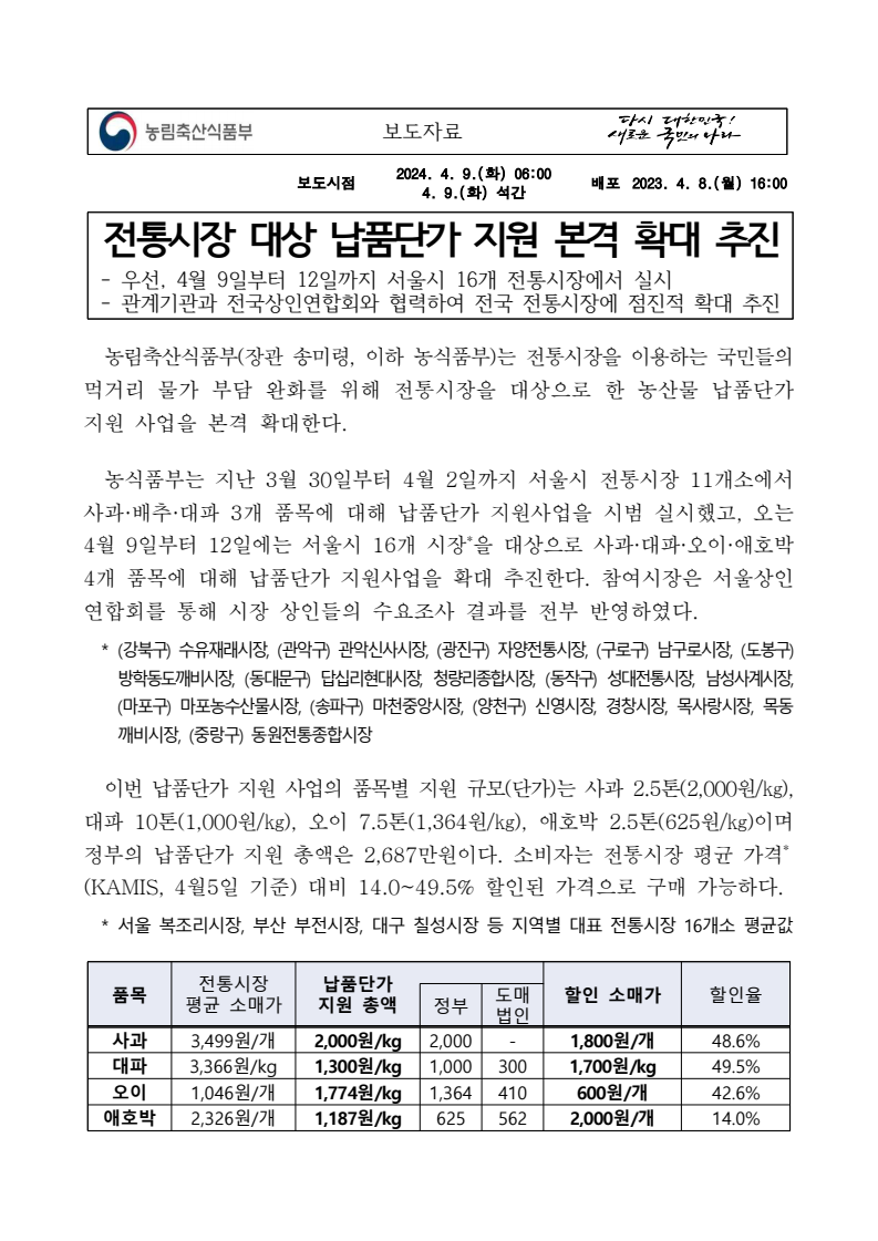 광부 보도자료 보도시점 2024. 4. 9.(화) 06:00 4. 9.(화) 석간 배포 2023. 4. 8.(월) 16:00 전통시장 대상 납품단가 지원 본격 확대 추진- 우선, 4월 9일부터 12일까지 서울시 16개 전통시장에서 실시 - 관계기관과 전국상인연합회와 협력하여 전국 전통시장에 점진적 확대 추진 농림축산식품부(장관 송미령, 이하 농식품부)는 전통시장을 이용하는 국민들의먹거리 물가 부담 완화를 위해 전통시장을 대상으로 한 농산물 납품단가 지원 사업을 본격 확대한다. 농식품부는 지난 3월 30일부터 4월 2일까지 서울시 전통시장 11개소에서사과·배추·대파 3개 품목에 대해 납품단가 지원사업을 시범 실시했고, 오는4월 9일부터 12일에는 서울시 16개 시장*을 대상으로 사과·대파·오이·애호박4개 품목에 대해 납품단가 지원사업을 확대 추진한다. 참여시장은 서울상인연합회를 통해 시장 상인들의 수요조사 결과를 전부 반영하였다. * (강북구) 수유재래시장, (관악구) 관악신사시장, (광진구) 자양전통시장, (구로구) 남구로시장, (도봉구) 방학동도깨비시장, (동대문구) 답십리현대시장, 청량리종합시장, (동작구) 성대전통시장, 남성사계시장, (마포구) 마포농수산물시장, (송파구) 마천중앙시장, (양천구) 신영시장, 경창시장, 목사랑시장, 목동깨비시장, (중랑구) 동원전통종합시장 이번 납품단가 지원 사업의 품목별 지원 규모(단가)는 사과 2.5톤(2,000원/㎏), 대파 10톤(1,000원/㎏), 오이 7.5톤(1,364원/㎏), 애호박 2.5톤(625원/㎏)이며정부의 납품단가 지원 총액은 2,687만원이다. 소비자는 전통시장 평균 가격* (KAMIS, 4월5일 기준) 대비 14.0~49.5% 할인된 가격으로 구매 가능하다. * 서울 복조리시장, 부산 부전시장, 대구 칠성시장 등 지역별 대표 전통시장 16개소 평균값품목 전통시장 평균 소매가 납품단가 지원 총액 할인 소매가 할인율정부 도매 법인 사과 3,499원/개 2,000원/kg 2,000 - 1,800원/개 48.6% 대파 3,366원/kg 1,300원/kg 1,000 300 1,700원/kg 49.5% 오이 1,046원/개 1,774원/kg 1,364 410 600원/개 42.6% 애호박 2,326원/개 1,187원/kg 625 562 2,000원/개 14.0% 이 외에도 농식품부는 4월 6일부터 12일까지 온누리상품권 환급행사 추진, 4월말까지 총 300억원 규모의 제로페이 상품권을 발행하는 등 전통시장에 대한 지원을 확대한다. 농식품부는 앞으로 납품단가 지원사업을 전국단위 전통시장으로 확대할 계획으로, 이를 위해 중기부, 전국상인연합회, 소상공인진흥공단 등과 협력체계를 구축하고, 매월 특정 기간을 「(가칭)전통시장 가는 날」로 정하는 등브랜드화하여 농식품 물가 안정 및 전통시장 활성화를 도모할 계획이다. 담당 부서 농림축산식품부 책임자 과 장 강혜영 (044-201-2211) 유통정책과 담당자 사무관 정성수 (044-201-2223)