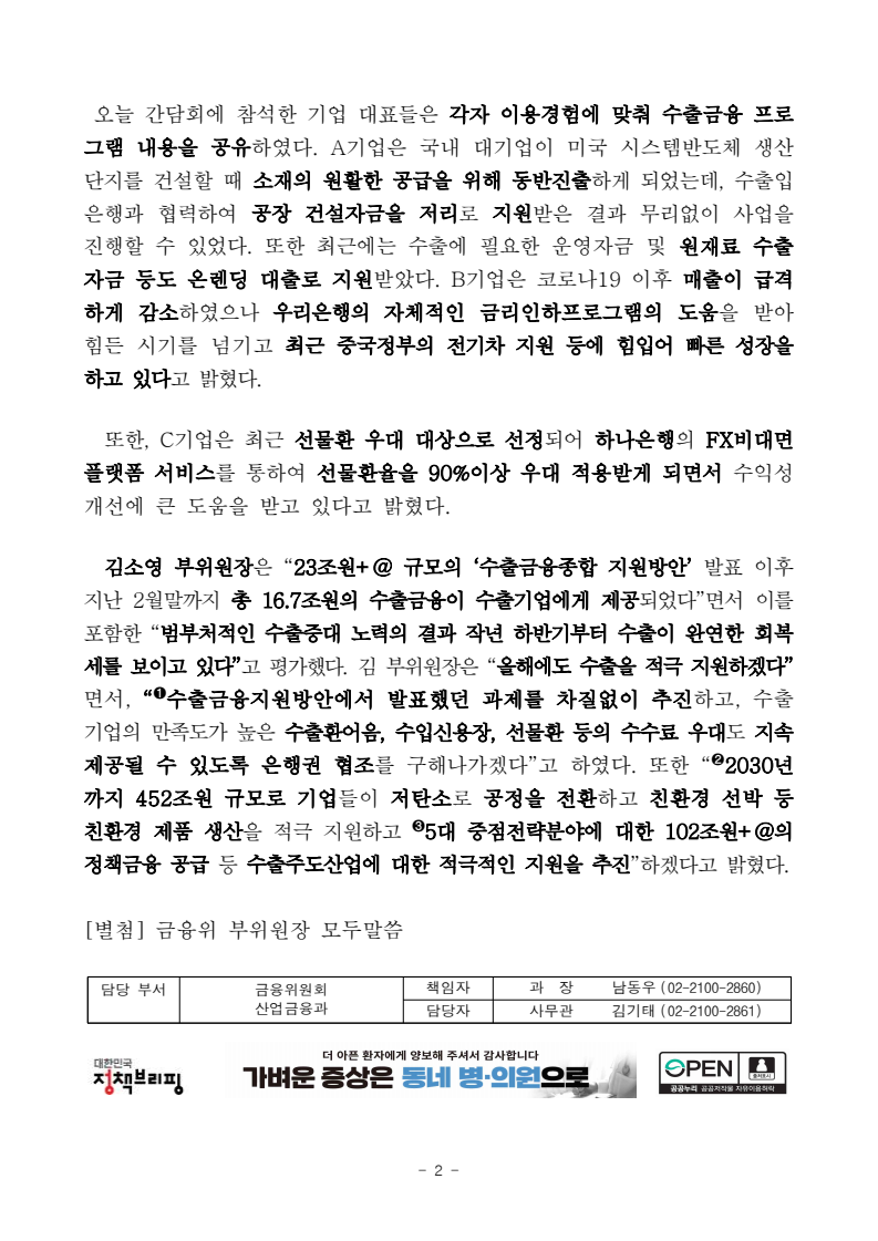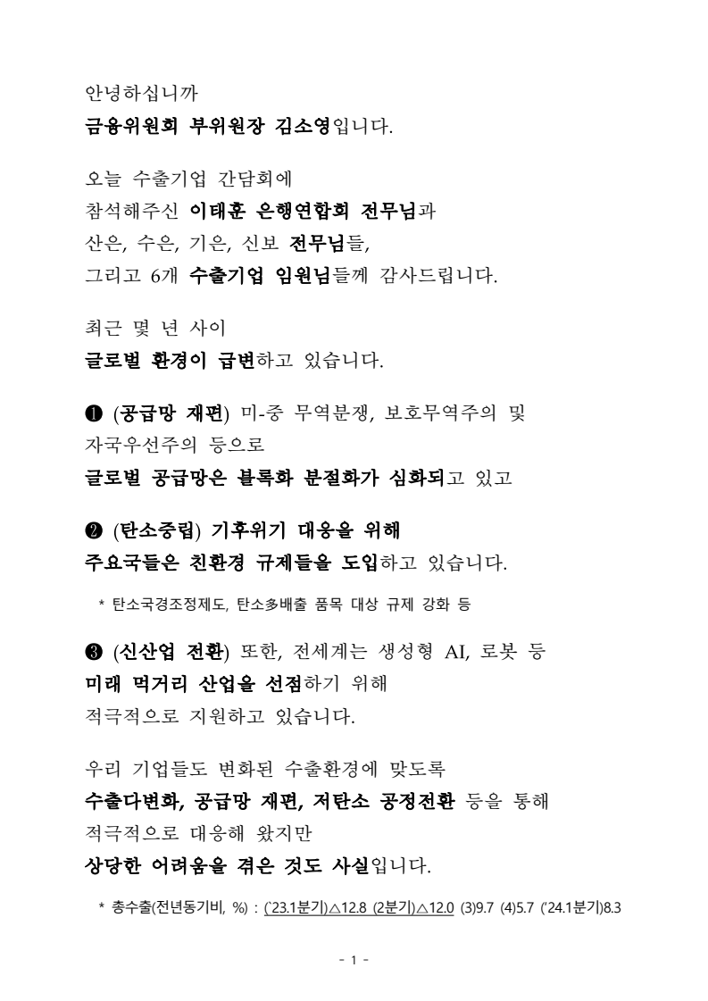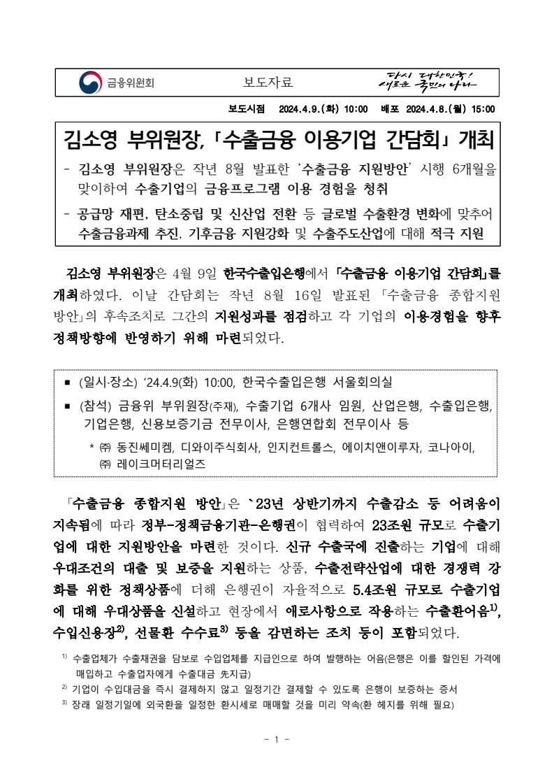 - 1 - 보도자료 보도시점 2024.4.9.(화) 10:00 배포 2024.4.8.(월) 15:00 김소영 부위원장, 「수출금융 이용기업 간담회」 개최- 김소영 부위원장은 작년 8월 발표한 ‘수출금융 지원방안’ 시행 6개월을맞이하여 수출기업의 금융프로그램 이용 경험을 청취 - 공급망 재편, 탄소중립 및 신산업 전환 등 글로벌 수출환경 변화에 맞추어수출금융과제 추진, 기후금융 지원강화 및 수출주도산업에 대해 적극 지원 김소영 부위원장은 4월 9일 한국수출입은행에서 「수출금융 이용기업 간담회」를 개최하였다. 이날 간담회는 작년 8월 16일 발표된 「수출금융 종합지원 방안」의 후속조치로 그간의 지원성과를 점검하고 각 기업의 이용경험을 향후 정책방향에 반영하기 위해 마련되었다. ▪ (일시·장소) ‘24.4.9(화) 10:00, 한국수출입은행 서울회의실 ▪ (참석) 금융위 부위원장(주재), 수출기업 6개사 임원, 산업은행, 수출입은행, 기업은행, 신용보증기금 전무이사, 은행연합회 전무이사 등 * ㈜ 동진쎄미켐, 디와이주식회사, 인지컨트롤스, 에이치앤이루자, 코나아이, ㈜ 레이크머터리얼즈 「수출금융 종합지원 방안」은 `23년 상반기까지 수출감소 등 어려움이 지속됨에 따라 정부-정책금융기관-은행권이 협력하여 23조원 규모로 수출기업에 대한 지원방안을 마련한 것이다. 신규 수출국에 진출하는 기업에 대해 우대조건의 대출 및 보증을 지원하는 상품, 수출전략산업에 대한 경쟁력 강화를 위한 정책상품에 더해 은행권이 자율적으로 5.4조원 규모로 수출기업에 대해 우대상품을 신설하고 현장에서 애로사항으로 작용하는 수출환어음1) , 수입신용장2) , 선물환 수수료3) 등을 감면하는 조치 등이 포함되었다. 1) 수출업체가 수출채권을 담보로 수입업체를 지급인으로 하여 발행하는 어음(은행은 이를 할인된 가격에매입하고 수출업자에게 수출대금 先지급) 2) 기업이 수입대금을 즉시 결제하지 않고 일정기간 결제할 수 있도록 은행이 보증하는 증서 3) 장래 일정기일에 외국환을 일정한 환시세로 매매할 것을 미리 약속(환 헤지를 위해 필요) - 2 - 오늘 간담회에 참석한 기업 대표들은 각자 이용경험에 맞춰 수출금융 프로그램 내용을 공유하였다. A기업은 국내 대기업이 미국 시스템반도체 생산단지를 건설할 때 소재의 원활한 공급을 위해 동반진출하게 되었는데, 수출입은행과 협력하여 공장 건설자금을 저리로 지원받은 결과 무리없이 사업을 진행할 수 있었다. 또한 최근에는 수출에 필요한 운영자금 및 원재료 수출자금 등도 온렌딩 대출로 지원받았다. B기업은 코로나19 이후 매출이 급격하게 감소하였으나 우리은행의 자체적인 금리인하프로그램의 도움을 받아 힘든 시기를 넘기고 최근 중국정부의 전기차 지원 등에 힘입어 빠른 성장을 하고 있다고 밝혔다. 또한, C기업은 최근 선물환 우대 대상으로 선정되어 하나은행의 FX비대면 플랫폼 서비스를 통하여 선물환율을 90%이상 우대 적용받게 되면서 수익성개선에 큰 도움을 받고 있다고 밝혔다. 김소영 부위원장은 “23조원+@ 규모의 ‘수출금융종합 지원방안’ 발표 이후지난 2월말까지 총 16.7조원의 수출금융이 수출기업에게 제공되었다”면서 이를포함한 “범부처적인 수출증대 노력의 결과 작년 하반기부터 수출이 완연한 회복세를 보이고 있다”고 평가했다. 김 부위원장은 “올해에도 수출을 적극 지원하겠다” 면서, “➊수출금융지원방안에서 발표했던 과제를 차질없이 추진하고, 수출기업의 만족도가 높은 수출환어음, 수입신용장, 선물환 등의 수수료 우대도 지속 제공될 수 있도록 은행권 협조를 구해나가겠다”고 하였다. 또한 “➋2030년까지 452조원 규모로 기업들이 저탄소로 공정을 전환하고 친환경 선박 등 친환경 제품 생산을 적극 지원하고 ➌5대 중점전략분야에 대한 102조원+@의 정책금융 공급 등 수출주도산업에 대한 적극적인 지원을 추진”하겠다고 밝혔다. [별첨] 금융위 부위원장 모두말씀 담당 부서 금융위원회 책임자 과 장 남동우 (02-2100-2860) 산업금융과 담당자 사무관 김기태 (02-2100-2861) 24. 4. 9. 수출기업 금융지원 간담회 모 두 발 언2024. 4. 9. (화) 10:00 수출입은행 서울회의실 금융위원회 부위원장 김 소 영 - 1 - 안녕하십니까 금융위원회 부위원장 김소영입니다. 오늘 수출기업 간담회에 참석해주신 이태훈 은행연합회 전무님과 산은, 수은, 기은, 신보 전무님들, 그리고 6개 수출기업 임원님들께 감사드립니다. 최근 몇 년 사이 글로벌 환경이 급변하고 있습니다. ❶ (공급망 재편) 미-중 무역분쟁, 보호무역주의 및 자국우선주의 등으로 글로벌 공급망은 블록화 분절화가 심화되고 있고 ❷ (탄소중립) 기후위기 대응을 위해 주요국들은 친환경 규제들을 도입하고 있습니다. * 탄소국경조정제도, 탄소多배출 품목 대상 규제 강화 등 ❸ (신산업 전환) 또한, 전세계는 생성형 AI, 로봇 등 미래 먹거리 산업을 선점하기 위해 적극적으로 지원하고 있습니다. 우리 기업들도 변화된 수출환경에 맞도록 수출다변화, 공급망 재편, 저탄소 공정전환 등을 통해 적극적으로 대응해 왔지만 상당한 어려움을 겪은 것도 사실입니다. * 총수출(전년동기비, %) : (`23.1분기)△12.8 (2