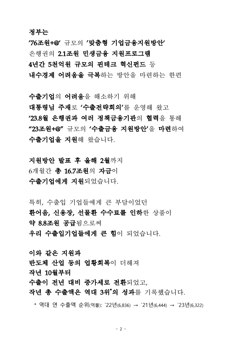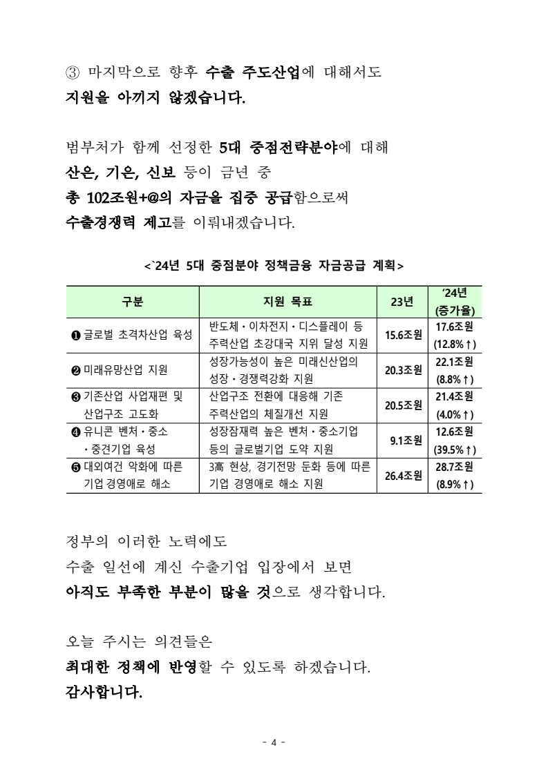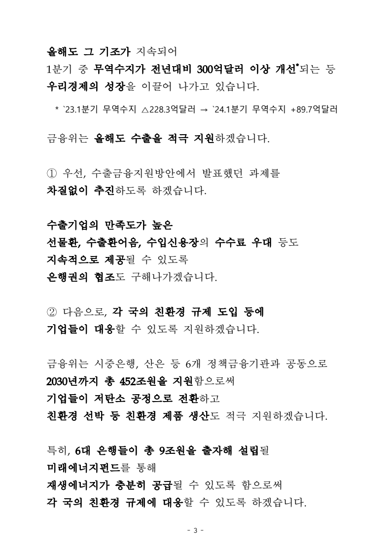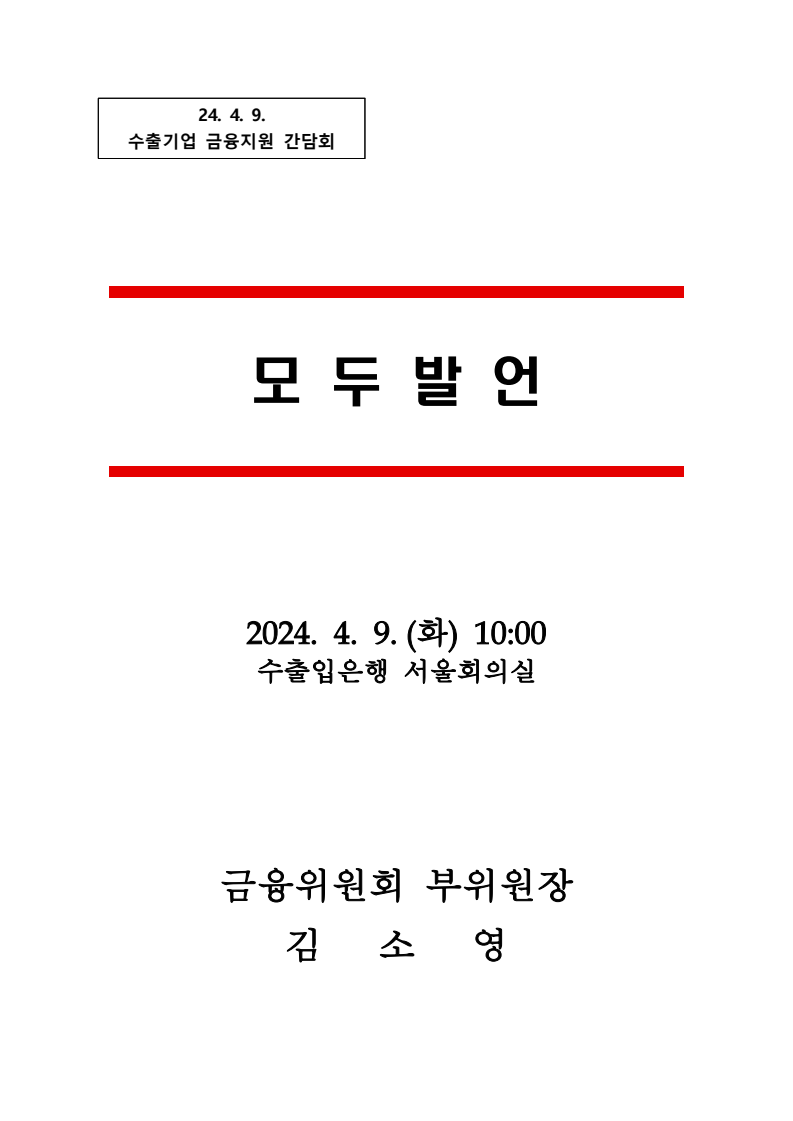 - 1 - 보도자료 보도시점 2024.4.9.(화) 10:00 배포 2024.4.8.(월) 15:00 김소영 부위원장, 「수출금융 이용기업 간담회」 개최- 김소영 부위원장은 작년 8월 발표한 ‘수출금융 지원방안’ 시행 6개월을맞이하여 수출기업의 금융프로그램 이용 경험을 청취 - 공급망 재편, 탄소중립 및 신산업 전환 등 글로벌 수출환경 변화에 맞추어수출금융과제 추진, 기후금융 지원강화 및 수출주도산업에 대해 적극 지원 김소영 부위원장은 4월 9일 한국수출입은행에서 「수출금융 이용기업 간담회」를 개최하였다. 이날 간담회는 작년 8월 16일 발표된 「수출금융 종합지원 방안」의 후속조치로 그간의 지원성과를 점검하고 각 기업의 이용경험을 향후 정책방향에 반영하기 위해 마련되었다. ▪ (일시·장소) ‘24.4.9(화) 10:00, 한국수출입은행 서울회의실 ▪ (참석) 금융위 부위원장(주재), 수출기업 6개사 임원, 산업은행, 수출입은행, 기업은행, 신용보증기금 전무이사, 은행연합회 전무이사 등 * ㈜ 동진쎄미켐, 디와이주식회사, 인지컨트롤스, 에이치앤이루자, 코나아이, ㈜ 레이크머터리얼즈 「수출금융 종합지원 방안」은 `23년 상반기까지 수출감소 등 어려움이 지속됨에 따라 정부-정책금융기관-은행권이 협력하여 23조원 규모로 수출기업에 대한 지원방안을 마련한 것이다. 신규 수출국에 진출하는 기업에 대해 우대조건의 대출 및 보증을 지원하는 상품, 수출전략산업에 대한 경쟁력 강화를 위한 정책상품에 더해 은행권이 자율적으로 5.4조원 규모로 수출기업에 대해 우대상품을 신설하고 현장에서 애로사항으로 작용하는 수출환어음1) , 수입신용장2) , 선물환 수수료3) 등을 감면하는 조치 등이 포함되었다. 1) 수출업체가 수출채권을 담보로 수입업체를 지급인으로 하여 발행하는 어음(은행은 이를 할인된 가격에매입하고 수출업자에게 수출대금 先지급) 2) 기업이 수입대금을 즉시 결제하지 않고 일정기간 결제할 수 있도록 은행이 보증하는 증서 3) 장래 일정기일에 외국환을 일정한 환시세로 매매할 것을 미리 약속(환 헤지를 위해 필요) - 2 - 오늘 간담회에 참석한 기업 대표들은 각자 이용경험에 맞춰 수출금융 프로그램 내용을 공유하였다. A기업은 국내 대기업이 미국 시스템반도체 생산단지를 건설할 때 소재의 원활한 공급을 위해 동반진출하게 되었는데, 수출입은행과 협력하여 공장 건설자금을 저리로 지원받은 결과 무리없이 사업을 진행할 수 있었다. 또한 최근에는 수출에 필요한 운영자금 및 원재료 수출자금 등도 온렌딩 대출로 지원받았다. B기업은 코로나19 이후 매출이 급격하게 감소하였으나 우리은행의 자체적인 금리인하프로그램의 도움을 받아 힘든 시기를 넘기고 최근 중국정부의 전기차 지원 등에 힘입어 빠른 성장을 하고 있다고 밝혔다. 또한, C기업은 최근 선물환 우대 대상으로 선정되어 하나은행의 FX비대면 플랫폼 서비스를 통하여 선물환율을 90%이상 우대 적용받게 되면서 수익성개선에 큰 도움을 받고 있다고 밝혔다. 김소영 부위원장은 “23조원+@ 규모의 ‘수출금융종합 지원방안’ 발표 이후지난 2월말까지 총 16.7조원의 수출금융이 수출기업에게 제공되었다”면서 이를포함한 “범부처적인 수출증대 노력의 결과 작년 하반기부터 수출이 완연한 회복세를 보이고 있다”고 평가했다. 김 부위원장은 “올해에도 수출을 적극 지원하겠다” 면서, “➊수출금융지원방안에서 발표했던 과제를 차질없이 추진하고, 수출기업의 만족도가 높은 수출환어음, 수입신용장, 선물환 등의 수수료 우대도 지속 제공될 수 있도록 은행권 협조를 구해나가겠다”고 하였다. 또한 “➋2030년까지 452조원 규모로 기업들이 저탄소로 공정을 전환하고 친환경 선박 등 친환경 제품 생산을 적극 지원하고 ➌5대 중점전략분야에 대한 102조원+@의 정책금융 공급 등 수출주도산업에 대한 적극적인 지원을 추진”하겠다고 밝혔다. [별첨] 금융위 부위원장 모두말씀 담당 부서 금융위원회 책임자 과 장 남동우 (02-2100-2860) 산업금융과 담당자 사무관 김기태 (02-2100-2861) 24. 4. 9. 수출기업 금융지원 간담회 모 두 발 언2024. 4. 9. (화) 10:00 수출입은행 서울회의실 금융위원회 부위원장 김 소 영 - 1 - 안녕하십니까 금융위원회 부위원장 김소영입니다. 오늘 수출기업 간담회에 참석해주신 이태훈 은행연합회 전무님과 산은, 수은, 기은, 신보 전무님들, 그리고 6개 수출기업 임원님들께 감사드립니다. 최근 몇 년 사이 글로벌 환경이 급변하고 있습니다. ❶ (공급망 재편) 미-중 무역분쟁, 보호무역주의 및 자국우선주의 등으로 글로벌 공급망은 블록화 분절화가 심화되고 있고 ❷ (탄소중립) 기후위기 대응을 위해 주요국들은 친환경 규제들을 도입하고 있습니다. * 탄소국경조정제도, 탄소多배출 품목 대상 규제 강화 등 ❸ (신산업 전환) 또한, 전세계는 생성형 AI, 로봇 등 미래 먹거리 산업을 선점하기 위해 적극적으로 지원하고 있습니다. 우리 기업들도 변화된 수출환경에 맞도록 수출다변화, 공급망 재편, 저탄소 공정전환 등을 통해 적극적으로 대응해 왔지만 상당한 어려움을 겪은 것도 사실입니다. * 총수출(전년동기비, %) : (`23.1분기)△12.8 (2