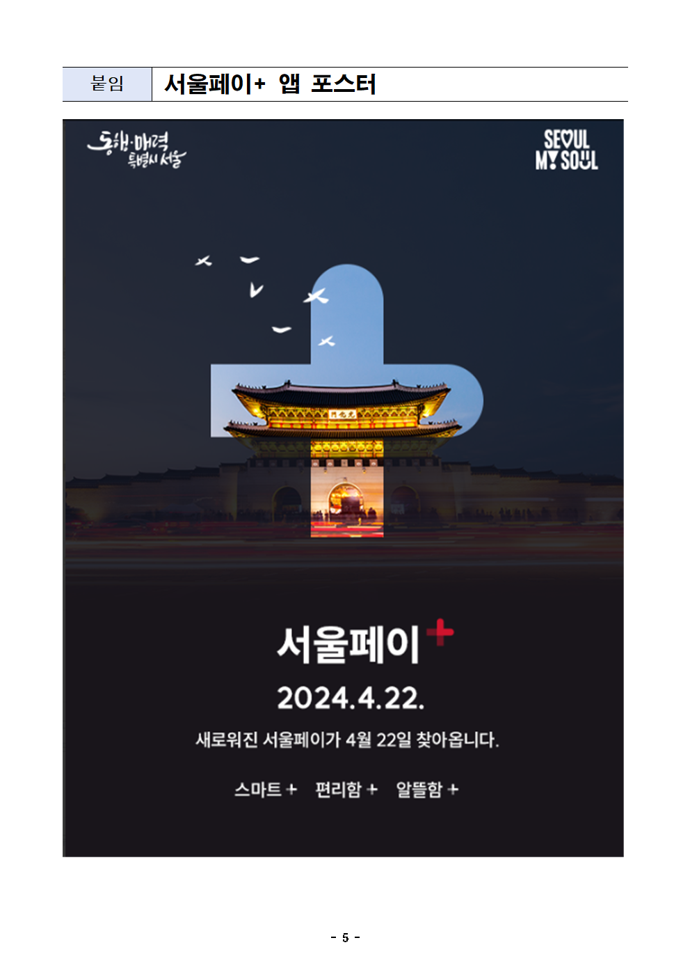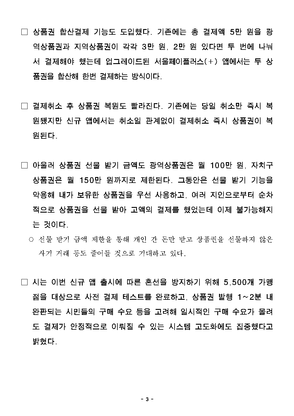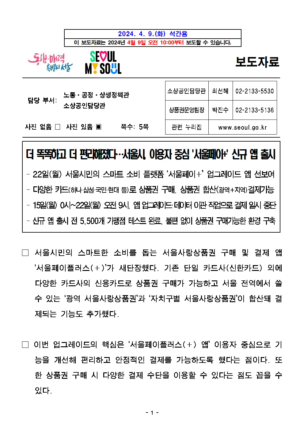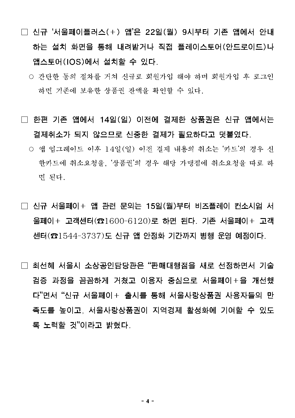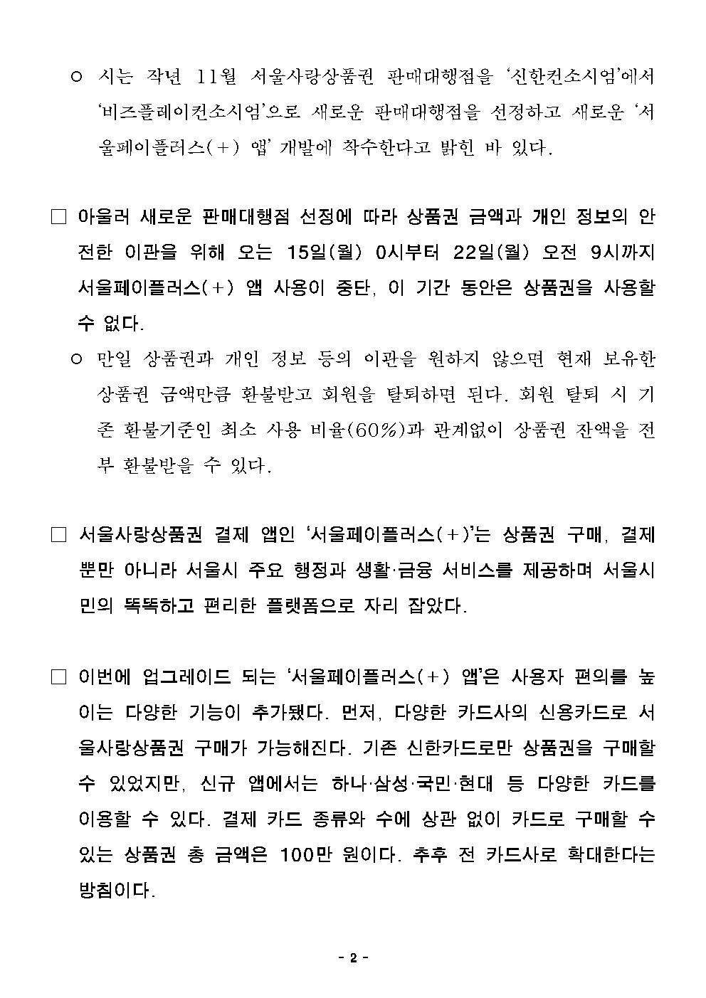 - 1 - 2024. 4. 9.(화) 석간용 이 보도자료는 2024년 4월 9일 오전 10:00부터 보도할 수 있습니다. 보도자료담당 부서: 노동․공정․상생정책관 소상공인담당관 소상공인담당관 최선혜 02-2133-5530상품권운영팀장 박진수 02-2133-5136사진 없음 □ 사진 있음 ▣ 쪽수: 5쪽 관련 누리집 www.seoul.go.kr 더 똑똑하고 더 편리해졌다…서울시, 이용자 중심 '서울페이+' 신규 앱 출시- 22일(월) 서울시민의 스마트 소비 플랫폼 ‘서울페이+’ 업그레이드 앱선보여- 다양한 카드(하나·삼성·국민·현대 등)로 상품권 구매, 상품권 합산(광역+지역)결제가능- 15일(월) 0시~22일(월) 오전9시, 앱업그레이드‧데이터이관작업으로결제일시중단- 신규 앱 출시 전 5,500개 가맹점 테스트 완료, 불편 없이 상품권 구매가능한환경구축□ 서울시민의 스마트한 소비를 돕는 서울사랑상품권 구매 및결제앱‘서울페이플러스(+)’가 새단장했다. 기존 단일 카드사(신한카드) 외에다양한 카드사의 신용카드로 상품권 구매가 가능하고 서울 전역에서쓸수 있는 ‘광역 서울사랑상품권’과 ‘자치구별 서울사랑상품권’이 합산돼결제되는 기능도 추가했다. □ 이번 업그레이드의 핵심은 ‘서울페이플러스(+) 앱’ 이용자 중심으로기능을 개선해 편리하고 안정적인 결제를 가능하도록 했다는 점이다. 또한 상품권 구매 시 다양한 결제 수단을 이용할 수 있다는 점도꼽을수있다. - 2 - ○ 시는 작년 11월 서울사랑상품권 판매대행점을 ‘신한컨소시엄’에서‘비즈플레이컨소시엄’으로 새로운 판매대행점을 선정하고 새로운‘서울페이플러스(+) 앱’ 개발에 착수한다고 밝힌 바 있다. □ 아울러 새로운 판매대행점 선정에 따라 상품권 금액과 개인 정보의안전한 이관을 위해 오는 15일(월) 0시부터 22일(월) 오전9시까지서울페이플러스(+) 앱 사용이 중단, 이 기간 동안은 상품권을사용할수 없다. ○ 만일 상품권과 개인 정보 등의 이관을 원하지 않으면 현재보유한상품권 금액만큼 환불받고 회원을 탈퇴하면 된다. 회원 탈퇴시기존 환불기준인 최소 사용 비율(60%)과 관계없이 상품권 잔액을전부 환불받을 수 있다. □ 서울사랑상품권 결제 앱인 ‘서울페이플러스(+)’는 상품권 구매, 결제뿐만 아니라 서울시 주요 행정과 생활·금융 서비스를 제공하며서울시민의 똑똑하고 편리한 플랫폼으로 자리 잡았다. □ 이번에 업그레이드 되는 ‘서울페이플러스(+) 앱’은 사용자 편의를높이는 다양한 기능이 추가됐다. 먼저, 다양한 카드사의 신용카드로서울사랑상품권 구매가 가능해진다. 기존 신한카드로만 상품권을구매할수 있었지만, 신규 앱에서는 하나·삼성·국민·현대 등 다양한카드를이용할 수 있다. 결제 카드 종류와 수에 상관 없이 카드로 구매할수있는 상품권 총 금액은 100만 원이다. 추후 전 카드사로 확대한다는방침이다. - 3 - □ 상품권 합산결제 기능도 도입했다. 기존에는 총 결제액 5만원을광역상품권과 지역상품권이 각각 3만 원, 2만 원 있다면 두 번에나눠서 결제해야 했는데 업그레이드된 서울페이플러스(+) 앱에서는두상품권을 합산해 한번 결제하는 방식이다. □ 결제취소 후 상품권 복원도 빨라진다. 기존에는 당일 취소만즉시복원됐지만 신규 앱에서는 취소일 관계없이 결제취소 즉시 상품권이복원된다. □ 아울러 상품권 선물 받기 금액도 광역상품권은 월 100만 원, 자치구상품권은 월 150만 원까지로 제한된다. 그동안은 선물 받기기능을악용해 내가 보유한 상품권을 우선 사용하고, 여러 지인으로부터순차적으로 상품권을 선물 받아 고액의 결제를 했었는데 이제 불가능해지는 것이다. ○ 선물 받기 금액 제한을 통해 개인 간 돈만 받고 상품권을 선물하지않은사기 거래 등도 줄어들 것으로 기대하고 있다. □ 시는 이번 신규 앱 출시에 따른 혼선을 방지하기 위해 5,500개가맹점을 대상으로 사전 결제 테스트를 완료하고, 상품권 발행 1~2분내완판되는 시민들의 구매 수요 등을 고려해 일시적인 구매 수요가몰려도 결제가 안정적으로 이뤄질 수 있는 시스템 고도화에도 집중했다고밝혔다. - 4 - □ 신규 ‘서울페이플러스(+) 앱’은 22일(월) 9시부터 기존 앱에서안내하는 설치 화면을 통해 내려받거나 직접 플레이스토어(안드로이드)나앱스토어(IOS)에서 설치할 수 있다. ○ 간단한 동의 절차를 거쳐 신규로 회원가입 해야 하며 회원가입 후로그인하면 기존에 보유한 상품권 잔액을 확인할 수 있다. □ 한편 기존 앱에서 14일(일) 이전에 결제한 상품권은 신규 앱에서는결제취소가 되지 않으므로 신중한 결제가 필요하다고 덧붙였다. ○ 앱 업그레이드 이후 14일(일) 이전 결제 내용의 취소는 ‘카드’의경우신한카드에 취소요청을, ‘상품권’의 경우 해당 가맹점에 취소요청을따로하면 된다. □ 신규 서울페이+ 앱 관련 문의는 15일(월)부터 비즈플레이 컨소시엄서울페이+ 고객센터(☎1600-6120)로 하면 된다. 기존 서울페이+고객센터(☎1544-3737)도 신규 앱 안정화 기간까지 병행 운영 예정이다. □ 최선혜 서울시 소상공인담당관은 “판매대행점을 새로 선정하면서기술검증 과정을 꼼꼼하게 거쳤고 이용자 중심으로 서울페이+을개선했다”면서 “신규 서울페이+ 출시를