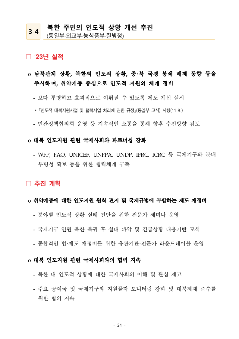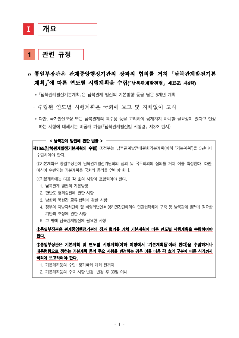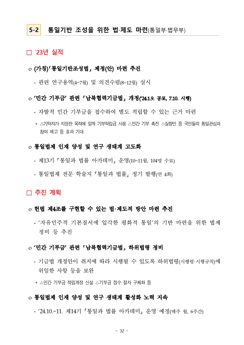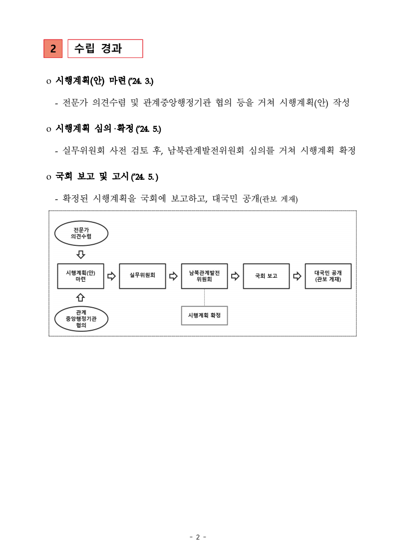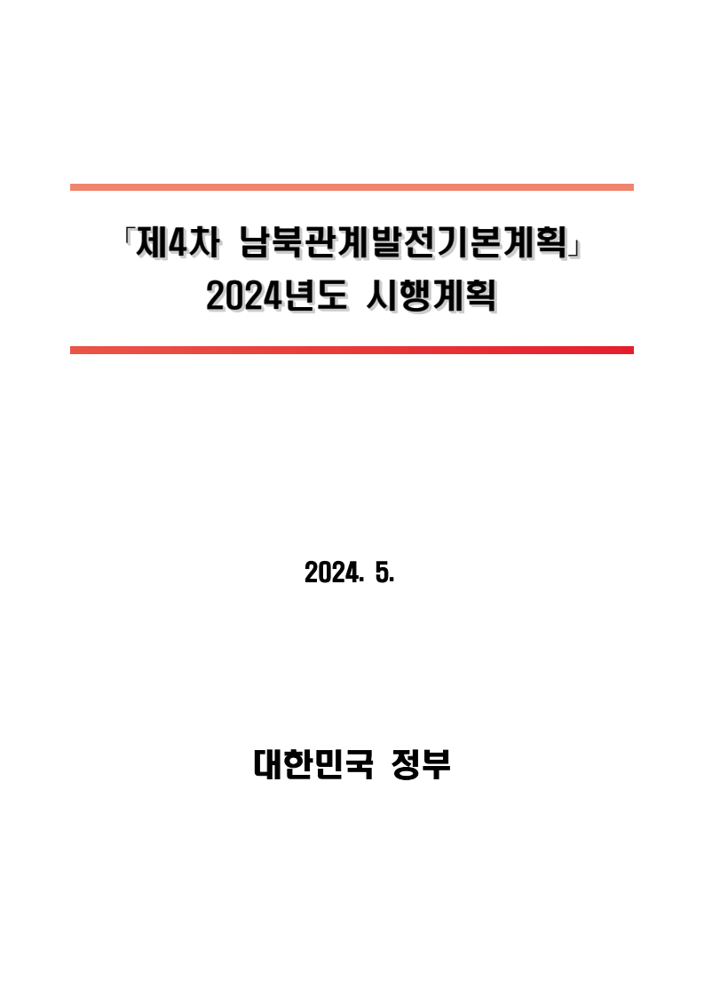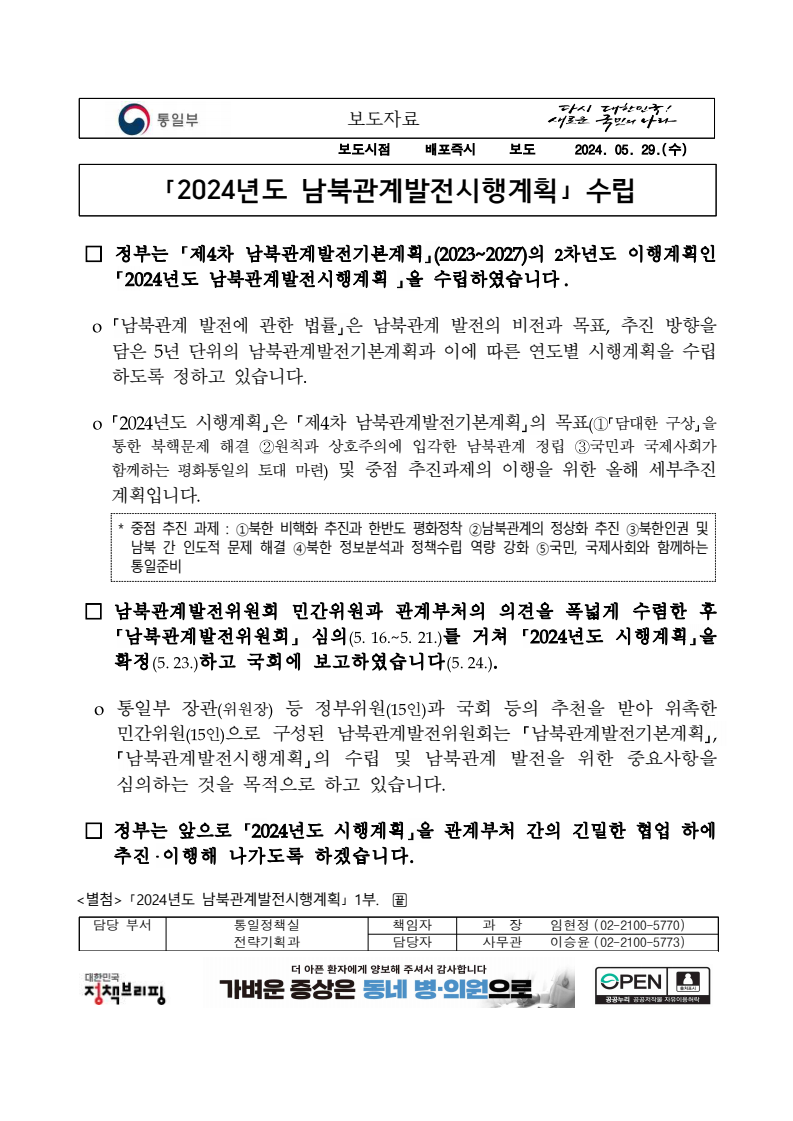 보도자료 보도시점 배포즉시 보도 2024. 05. 29.(수) 「2024년도 남북관계발전시행계획」 수립□ 정부는 「제4차 남북관계발전기본계획」(2023~2027)의 2차년도 이행계획인「2024년도 남북관계발전시행계획 」을 수립하였습니다 . o 「남북관계 발전에 관한 법률」은 남북관계 발전의 비전과 목표, 추진방향을 담은 5년 단위의 남북관계발전기본계획과 이에 따른 연도별 시행계획을 수립하도록 정하고 있습니다. o 「2024년도 시행계획」은 「제4차 남북관계발전기본계획」의 목표(①「담대한 구상」을통한 북핵문제 해결 ②원칙과 상호주의에 입각한 남북관계 정립 ③국민과 국제사회가 함께하는 평화통일의 토대 마련) 및 중점 추진과제의 이행을 위한 올해 세부추진계획입니다. □ 남북관계발전위원회 민간위원과 관계부처의 의견을 폭넓게 수렴한 후「남북관계발전위원회」 심의(5. 16.~5. 21.)를 거쳐 「2024년도 시행계획」을확정(5. 23.)하고 국회에 보고하였습니다(5. 24.). o 통일부 장관(위원장) 등 정부위원(15인)과 국회 등의 추천을 받아 위촉한 민간위원(15인)으로 구성된 남북관계발전위원회는 「남북관계발전기본계획」, 「남북관계발전시행계획」의 수립 및 남북관계 발전을 위한 중요사항을 심의하는 것을 목적으로 하고 있습니다. □ 정부는 앞으로 「2024년도 시행계획」을 관계부처 간의 긴밀한 협업 하에추진‧이행해 나가도록 하겠습니다. <별첨> 「2024년도 남북관계발전시행계획」 1부. 담당 부서 통일정책실 책임자 과 장 임현정 (02-2100-5770) 전략기획과 담당자 사무관 이승윤 (02-2100-5773) * 중점 추진 과제 : ①북한 비핵화 추진과 한반도 평화정착 ②남북관계의 정상화 추진 ③북한인권 및 남북 간 인도적 문제 해결 ④북한 정보분석과 정책수립 역량 강화 ⑤국민, 국제사회와 함께하는 통일준비 「제4차 남북관계발전기본계획남북관계발전기본계획」2024년도 시행계획2024. 5. 대한민국 정부 목 차 Ⅰ. 개 요 ························································································ 1 1. 관련 규정 · 1 2. 수립 경과 · 2 Ⅱ. 2023년 주요 성과 및 한계 ···················································· 3 Ⅲ. 2024년 정책 추진방향 ·························································· 6 Ⅳ. 2024년 중점 추진과제 ·························································· 8 1. 북한 비핵화 추진과 한반도 평화정착 · 8 1-1. 원칙과 일관성에 기초한 북한 비핵화와 평화정착 추진 · 8 1-2. 담대한 구상 으로 북한 비핵화 이행 동력 확보 · 9 1-3. 북한의 불법 외화벌이 차단 · 10 1-4. 북한 핵문제 당사국으로서 국제공조 강화 · 11 2. 남북관계의 정상화 추진 · 12 2-1. 원칙 있는 남북관계 추진 · 12 2-2. 호혜적 실사구시적 남북관계 정립 · 14 2-3. 법과 원칙에 따른 교류협력 추진 질서 확립 · 16 2-4. 개방과 소통을 통한 민족동질성 회복 · 18 3. 북한인권 및 남북 간 인도적 문제 해결 · 19 3-1. 북한주민의 인권 보호 및 실질적 인권 증진 · 19 3-2. 이산가족 문제 해결 노력 지속 추진 · 21 3-3. 국군포로 납북자 억류자 문제 해결 노력 강화 · 22 3-4. 북한 주민의 인도적 상황 개선 추진 · 24 3-5. 북한이탈주민 정착지원 강화 · 25 4. 북한 정보분석과 정책수립 역량 강화 · 27 4-1. 정보분석 역량 강화 · 27 4-2. 정책수립 지원 역량 강화 · 28 4-3. 북한 정보·정책 네트워크 정비 · 29 4-4. 북한자료 대국민 서비스 개선 · 30 5. 국민, 국제사회와 함께하는 통일준비 · 31 5-1. 새로운 통일미래비전(통일담론) 정립 · 31 5-2. 통일기반 조성을 위한 법 제도 마련 · 32 5-3. 북한 실상에 대한 객관적 균형적 이해 제고 · 33 5-4. 통일교육 강화 및 통일 대북정책 공감대 형성 · 34 5-5. 한반도 통일기반 조성을 위한 국제사회 협력 강화 · 36 Ⅴ. 추진체계 및 소요재원 ························································ 38 1. 추진 체계 · 38 2. 소요 재원 · 39 붙임 1. 2024년 남북협력기금 편성 내역 · 40 붙임 2. 과제별 소관 부처(청) 현황 · 41 - 1 - Ⅰ 개요 1 관련 규정 o 통일부장관은 관계중앙행정기관의 장과의 협의를 거쳐 남북관계발전기본계획 *에 따른 연도별 시행계획을 수립( 남북관계발전법 제13조 제4항) * 「남북관계발전기본계획」은 남북관계 발전의 기본방향 등을 담은 5개년 계획 - 수립된 연도별 시행계획은 국회에 보고 및 지체없이 고시 * 다만, 국가안전보장 또는 남북관계의 특수성 등을 고려하여 공개하지 아니할 필요성이 있다고 인정하는 사항에 대해서는 비공개 가능(「남북관계발전법 시행령」 제3조 단서) < 남북관계 발전에 관한 법률 > 제13조(남북관계발전기본계획의 수립) ①정부는 남북관계발전에관한기본계획(이하 ‘기본계획’)을 5년마다 수립하여야 한다. ②기본계획은 통일부장관이 남북관계발전위원회의 심의 및 국무회의의 심의를 거쳐 이를 확정한다. 다만, 예산이 수반되는 기본계획은 국회의 동의를 얻어야 한다. ③기본계획에는 다음 각 호의 사항이 포함되