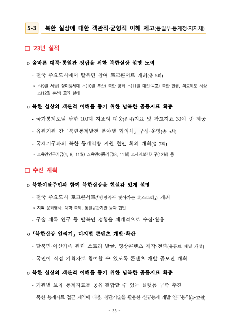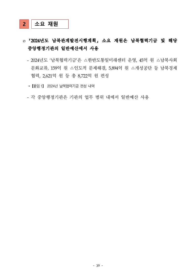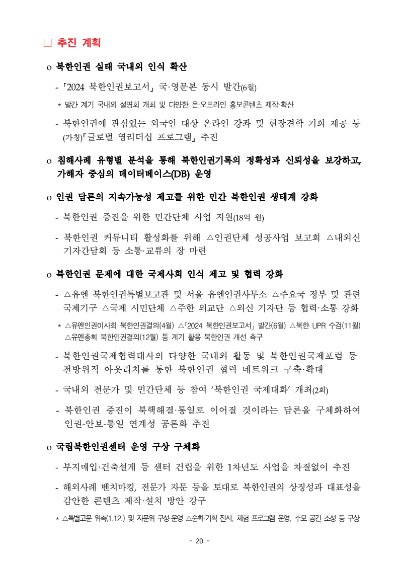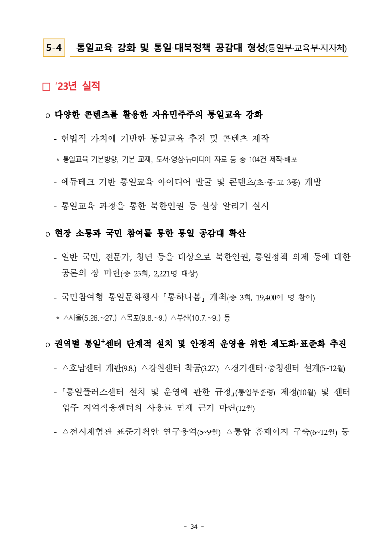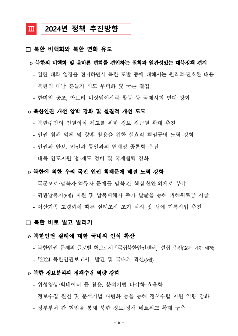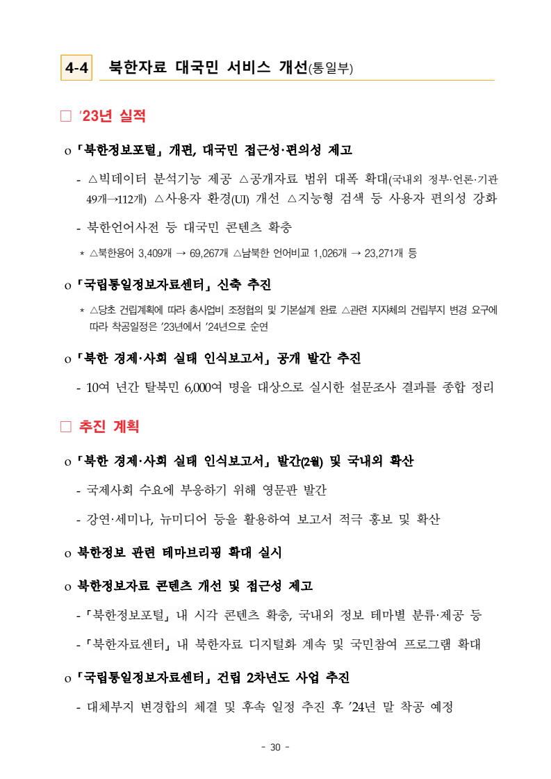 보도자료 보도시점 배포즉시 보도 2024. 05. 29.(수) 「2024년도 남북관계발전시행계획」 수립□ 정부는 「제4차 남북관계발전기본계획」(2023~2027)의 2차년도 이행계획인「2024년도 남북관계발전시행계획 」을 수립하였습니다 . o 「남북관계 발전에 관한 법률」은 남북관계 발전의 비전과 목표, 추진방향을 담은 5년 단위의 남북관계발전기본계획과 이에 따른 연도별 시행계획을 수립하도록 정하고 있습니다. o 「2024년도 시행계획」은 「제4차 남북관계발전기본계획」의 목표(①「담대한 구상」을통한 북핵문제 해결 ②원칙과 상호주의에 입각한 남북관계 정립 ③국민과 국제사회가 함께하는 평화통일의 토대 마련) 및 중점 추진과제의 이행을 위한 올해 세부추진계획입니다. □ 남북관계발전위원회 민간위원과 관계부처의 의견을 폭넓게 수렴한 후「남북관계발전위원회」 심의(5. 16.~5. 21.)를 거쳐 「2024년도 시행계획」을확정(5. 23.)하고 국회에 보고하였습니다(5. 24.). o 통일부 장관(위원장) 등 정부위원(15인)과 국회 등의 추천을 받아 위촉한 민간위원(15인)으로 구성된 남북관계발전위원회는 「남북관계발전기본계획」, 「남북관계발전시행계획」의 수립 및 남북관계 발전을 위한 중요사항을 심의하는 것을 목적으로 하고 있습니다. □ 정부는 앞으로 「2024년도 시행계획」을 관계부처 간의 긴밀한 협업 하에추진‧이행해 나가도록 하겠습니다. <별첨> 「2024년도 남북관계발전시행계획」 1부. 담당 부서 통일정책실 책임자 과 장 임현정 (02-2100-5770) 전략기획과 담당자 사무관 이승윤 (02-2100-5773) * 중점 추진 과제 : ①북한 비핵화 추진과 한반도 평화정착 ②남북관계의 정상화 추진 ③북한인권 및 남북 간 인도적 문제 해결 ④북한 정보분석과 정책수립 역량 강화 ⑤국민, 국제사회와 함께하는 통일준비 「제4차 남북관계발전기본계획남북관계발전기본계획」2024년도 시행계획2024. 5. 대한민국 정부 목 차 Ⅰ. 개 요 ························································································ 1 1. 관련 규정 · 1 2. 수립 경과 · 2 Ⅱ. 2023년 주요 성과 및 한계 ···················································· 3 Ⅲ. 2024년 정책 추진방향 ·························································· 6 Ⅳ. 2024년 중점 추진과제 ·························································· 8 1. 북한 비핵화 추진과 한반도 평화정착 · 8 1-1. 원칙과 일관성에 기초한 북한 비핵화와 평화정착 추진 · 8 1-2. 담대한 구상 으로 북한 비핵화 이행 동력 확보 · 9 1-3. 북한의 불법 외화벌이 차단 · 10 1-4. 북한 핵문제 당사국으로서 국제공조 강화 · 11 2. 남북관계의 정상화 추진 · 12 2-1. 원칙 있는 남북관계 추진 · 12 2-2. 호혜적 실사구시적 남북관계 정립 · 14 2-3. 법과 원칙에 따른 교류협력 추진 질서 확립 · 16 2-4. 개방과 소통을 통한 민족동질성 회복 · 18 3. 북한인권 및 남북 간 인도적 문제 해결 · 19 3-1. 북한주민의 인권 보호 및 실질적 인권 증진 · 19 3-2. 이산가족 문제 해결 노력 지속 추진 · 21 3-3. 국군포로 납북자 억류자 문제 해결 노력 강화 · 22 3-4. 북한 주민의 인도적 상황 개선 추진 · 24 3-5. 북한이탈주민 정착지원 강화 · 25 4. 북한 정보분석과 정책수립 역량 강화 · 27 4-1. 정보분석 역량 강화 · 27 4-2. 정책수립 지원 역량 강화 · 28 4-3. 북한 정보·정책 네트워크 정비 · 29 4-4. 북한자료 대국민 서비스 개선 · 30 5. 국민, 국제사회와 함께하는 통일준비 · 31 5-1. 새로운 통일미래비전(통일담론) 정립 · 31 5-2. 통일기반 조성을 위한 법 제도 마련 · 32 5-3. 북한 실상에 대한 객관적 균형적 이해 제고 · 33 5-4. 통일교육 강화 및 통일 대북정책 공감대 형성 · 34 5-5. 한반도 통일기반 조성을 위한 국제사회 협력 강화 · 36 Ⅴ. 추진체계 및 소요재원 ························································ 38 1. 추진 체계 · 38 2. 소요 재원 · 39 붙임 1. 2024년 남북협력기금 편성 내역 · 40 붙임 2. 과제별 소관 부처(청) 현황 · 41 - 1 - Ⅰ 개요 1 관련 규정 o 통일부장관은 관계중앙행정기관의 장과의 협의를 거쳐 남북관계발전기본계획 *에 따른 연도별 시행계획을 수립( 남북관계발전법 제13조 제4항) * 「남북관계발전기본계획」은 남북관계 발전의 기본방향 등을 담은 5개년 계획 - 수립된 연도별 시행계획은 국회에 보고 및 지체없이 고시 * 다만, 국가안전보장 또는 남북관계의 특수성 등을 고려하여 공개하지 아니할 필요성이 있다고 인정하는 사항에 대해서는 비공개 가능(「남북관계발전법 시행령」 제3조 단서) < 남북관계 발전에 관한 법률 > 제13조(남북관계발전기본계획의 수립) ①정부는 남북관계발전에관한기본계획(이하 ‘기본계획’)을 5년마다 수립하여야 한다. ②기본계획은 통일부장관이 남북관계발전위원회의 심의 및 국무회의의 심의를 거쳐 이를 확정한다. 다만, 예산이 수반되는 기본계획은 국회의 동의를 얻어야 한다. ③기본계획에는 다음 각 호의 사항이 포함되