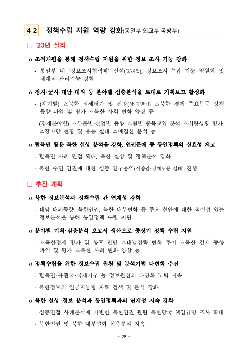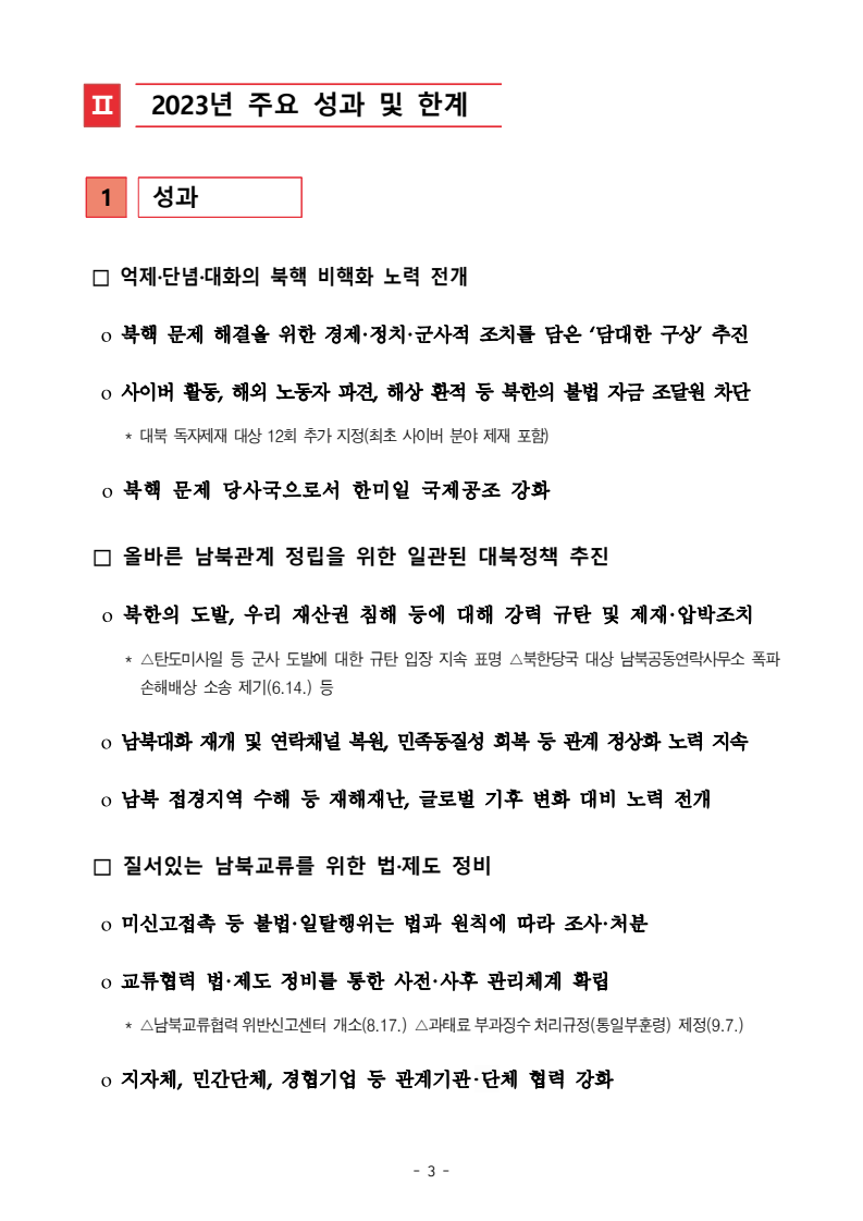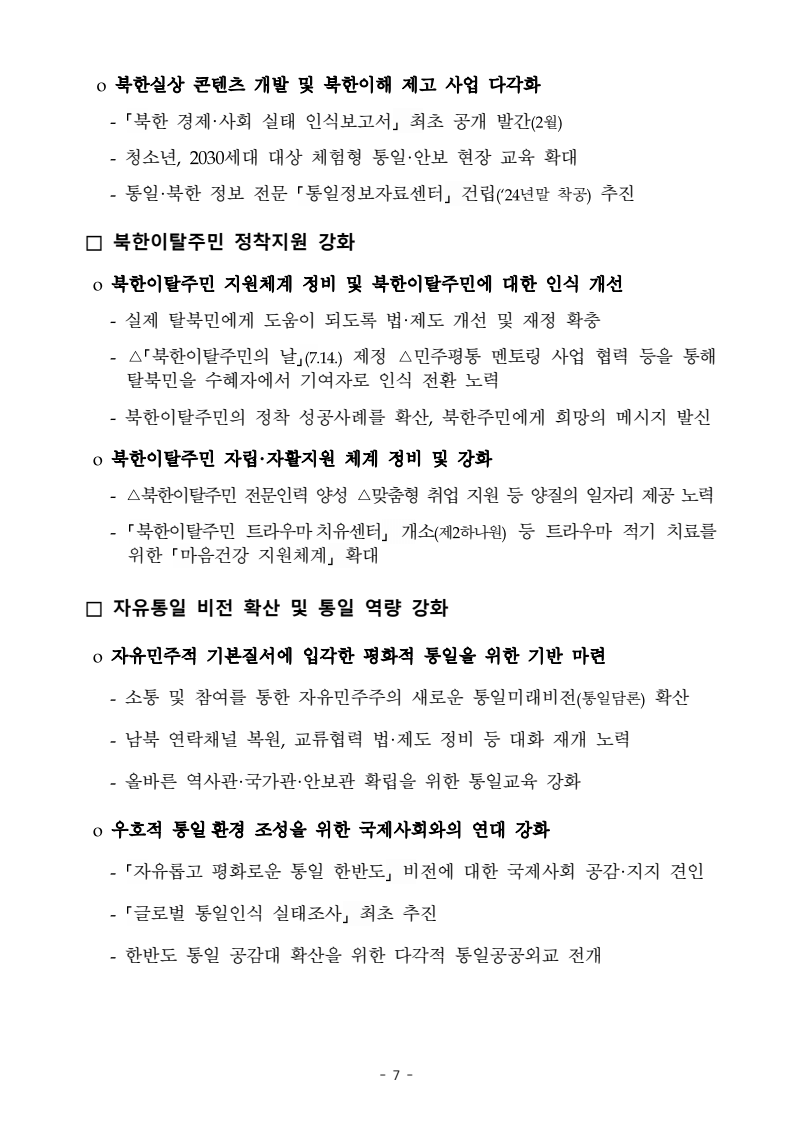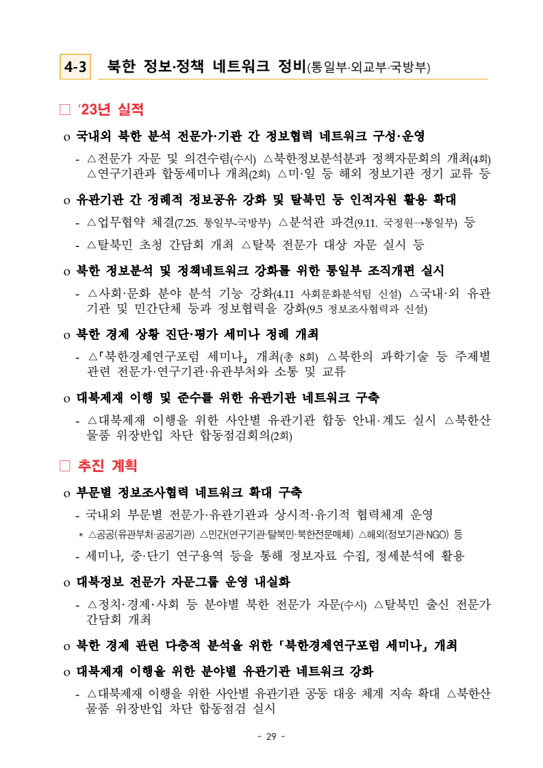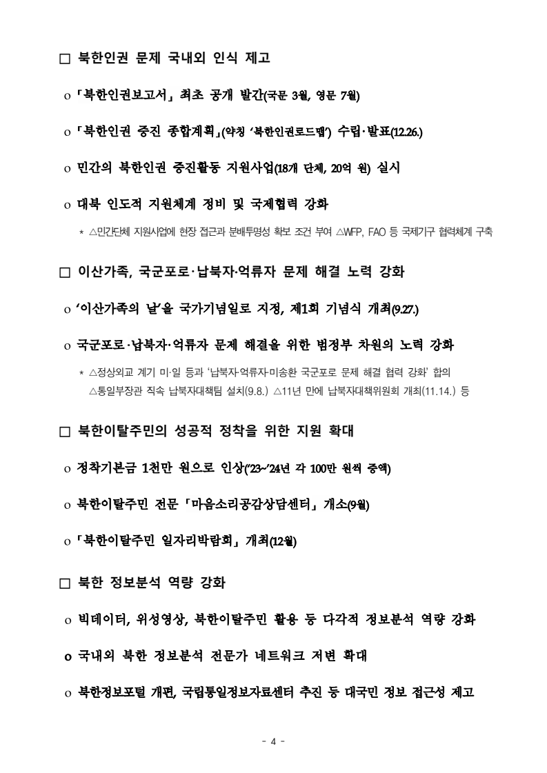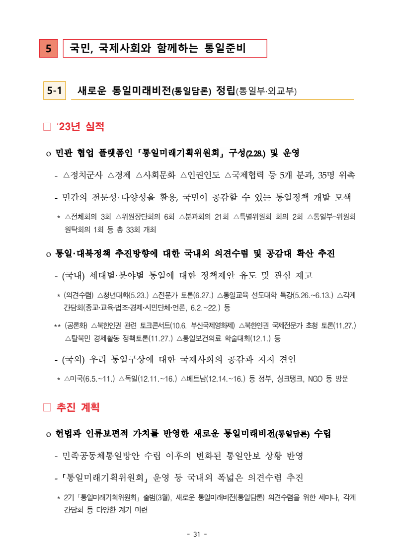 보도자료 보도시점 배포즉시 보도 2024. 05. 29.(수) 「2024년도 남북관계발전시행계획」 수립□ 정부는 「제4차 남북관계발전기본계획」(2023~2027)의 2차년도 이행계획인「2024년도 남북관계발전시행계획 」을 수립하였습니다 . o 「남북관계 발전에 관한 법률」은 남북관계 발전의 비전과 목표, 추진방향을 담은 5년 단위의 남북관계발전기본계획과 이에 따른 연도별 시행계획을 수립하도록 정하고 있습니다. o 「2024년도 시행계획」은 「제4차 남북관계발전기본계획」의 목표(①「담대한 구상」을통한 북핵문제 해결 ②원칙과 상호주의에 입각한 남북관계 정립 ③국민과 국제사회가 함께하는 평화통일의 토대 마련) 및 중점 추진과제의 이행을 위한 올해 세부추진계획입니다. □ 남북관계발전위원회 민간위원과 관계부처의 의견을 폭넓게 수렴한 후「남북관계발전위원회」 심의(5. 16.~5. 21.)를 거쳐 「2024년도 시행계획」을확정(5. 23.)하고 국회에 보고하였습니다(5. 24.). o 통일부 장관(위원장) 등 정부위원(15인)과 국회 등의 추천을 받아 위촉한 민간위원(15인)으로 구성된 남북관계발전위원회는 「남북관계발전기본계획」, 「남북관계발전시행계획」의 수립 및 남북관계 발전을 위한 중요사항을 심의하는 것을 목적으로 하고 있습니다. □ 정부는 앞으로 「2024년도 시행계획」을 관계부처 간의 긴밀한 협업 하에추진‧이행해 나가도록 하겠습니다. <별첨> 「2024년도 남북관계발전시행계획」 1부. 담당 부서 통일정책실 책임자 과 장 임현정 (02-2100-5770) 전략기획과 담당자 사무관 이승윤 (02-2100-5773) * 중점 추진 과제 : ①북한 비핵화 추진과 한반도 평화정착 ②남북관계의 정상화 추진 ③북한인권 및 남북 간 인도적 문제 해결 ④북한 정보분석과 정책수립 역량 강화 ⑤국민, 국제사회와 함께하는 통일준비 「제4차 남북관계발전기본계획남북관계발전기본계획」2024년도 시행계획2024. 5. 대한민국 정부 목 차 Ⅰ. 개 요 ························································································ 1 1. 관련 규정 · 1 2. 수립 경과 · 2 Ⅱ. 2023년 주요 성과 및 한계 ···················································· 3 Ⅲ. 2024년 정책 추진방향 ·························································· 6 Ⅳ. 2024년 중점 추진과제 ·························································· 8 1. 북한 비핵화 추진과 한반도 평화정착 · 8 1-1. 원칙과 일관성에 기초한 북한 비핵화와 평화정착 추진 · 8 1-2. 담대한 구상 으로 북한 비핵화 이행 동력 확보 · 9 1-3. 북한의 불법 외화벌이 차단 · 10 1-4. 북한 핵문제 당사국으로서 국제공조 강화 · 11 2. 남북관계의 정상화 추진 · 12 2-1. 원칙 있는 남북관계 추진 · 12 2-2. 호혜적 실사구시적 남북관계 정립 · 14 2-3. 법과 원칙에 따른 교류협력 추진 질서 확립 · 16 2-4. 개방과 소통을 통한 민족동질성 회복 · 18 3. 북한인권 및 남북 간 인도적 문제 해결 · 19 3-1. 북한주민의 인권 보호 및 실질적 인권 증진 · 19 3-2. 이산가족 문제 해결 노력 지속 추진 · 21 3-3. 국군포로 납북자 억류자 문제 해결 노력 강화 · 22 3-4. 북한 주민의 인도적 상황 개선 추진 · 24 3-5. 북한이탈주민 정착지원 강화 · 25 4. 북한 정보분석과 정책수립 역량 강화 · 27 4-1. 정보분석 역량 강화 · 27 4-2. 정책수립 지원 역량 강화 · 28 4-3. 북한 정보·정책 네트워크 정비 · 29 4-4. 북한자료 대국민 서비스 개선 · 30 5. 국민, 국제사회와 함께하는 통일준비 · 31 5-1. 새로운 통일미래비전(통일담론) 정립 · 31 5-2. 통일기반 조성을 위한 법 제도 마련 · 32 5-3. 북한 실상에 대한 객관적 균형적 이해 제고 · 33 5-4. 통일교육 강화 및 통일 대북정책 공감대 형성 · 34 5-5. 한반도 통일기반 조성을 위한 국제사회 협력 강화 · 36 Ⅴ. 추진체계 및 소요재원 ························································ 38 1. 추진 체계 · 38 2. 소요 재원 · 39 붙임 1. 2024년 남북협력기금 편성 내역 · 40 붙임 2. 과제별 소관 부처(청) 현황 · 41 - 1 - Ⅰ 개요 1 관련 규정 o 통일부장관은 관계중앙행정기관의 장과의 협의를 거쳐 남북관계발전기본계획 *에 따른 연도별 시행계획을 수립( 남북관계발전법 제13조 제4항) * 「남북관계발전기본계획」은 남북관계 발전의 기본방향 등을 담은 5개년 계획 - 수립된 연도별 시행계획은 국회에 보고 및 지체없이 고시 * 다만, 국가안전보장 또는 남북관계의 특수성 등을 고려하여 공개하지 아니할 필요성이 있다고 인정하는 사항에 대해서는 비공개 가능(「남북관계발전법 시행령」 제3조 단서) < 남북관계 발전에 관한 법률 > 제13조(남북관계발전기본계획의 수립) ①정부는 남북관계발전에관한기본계획(이하 ‘기본계획’)을 5년마다 수립하여야 한다. ②기본계획은 통일부장관이 남북관계발전위원회의 심의 및 국무회의의 심의를 거쳐 이를 확정한다. 다만, 예산이 수반되는 기본계획은 국회의 동의를 얻어야 한다. ③기본계획에는 다음 각 호의 사항이 포함되