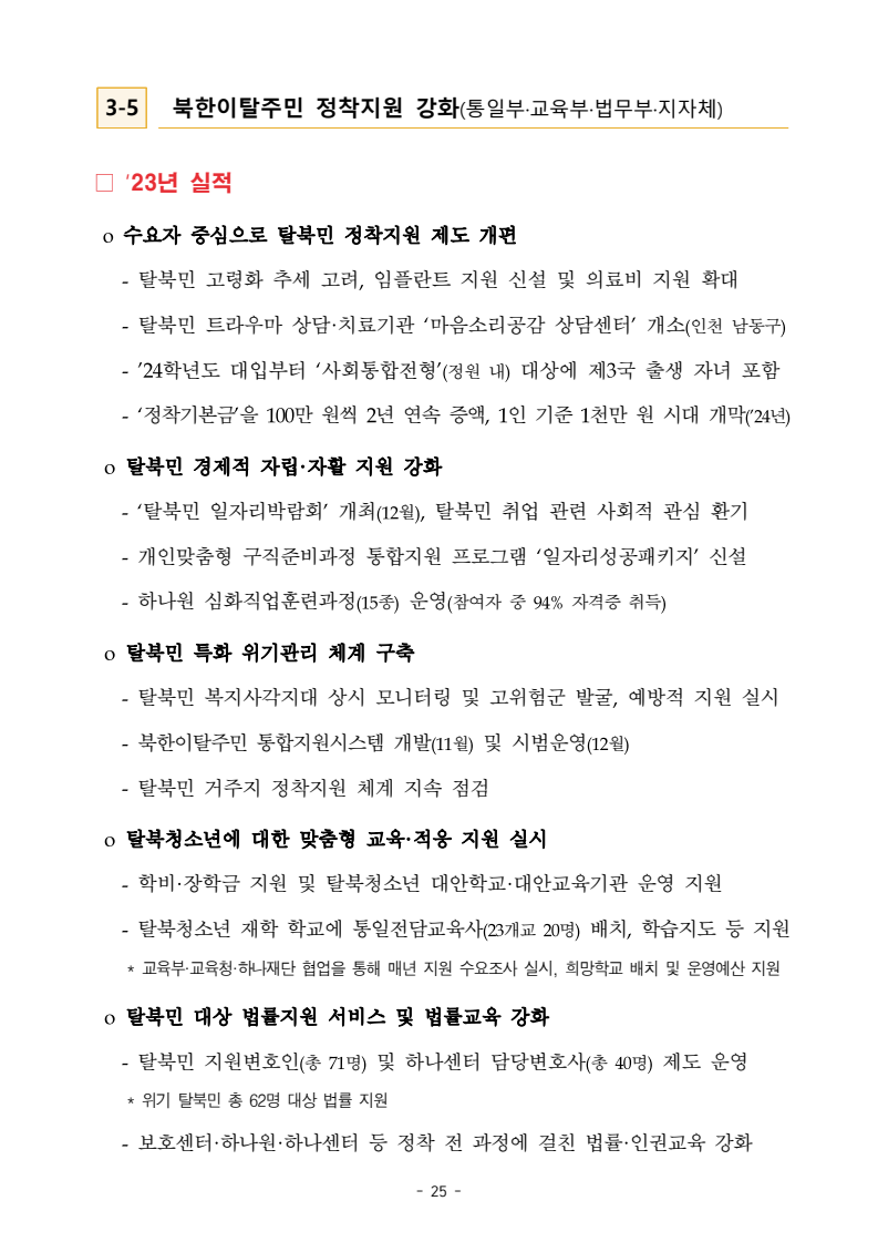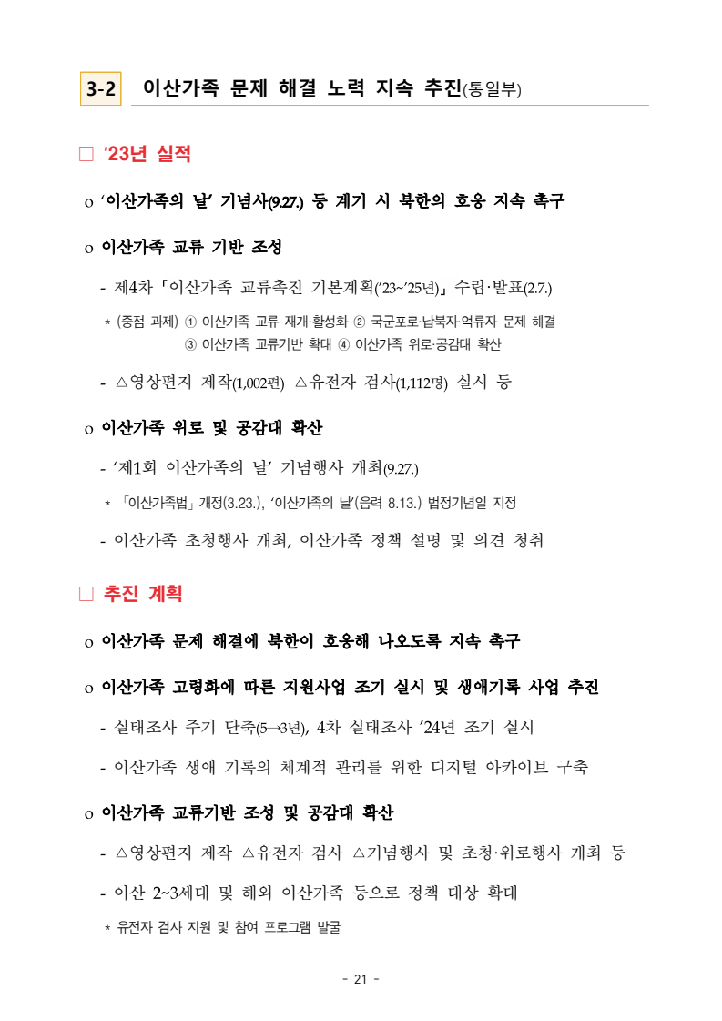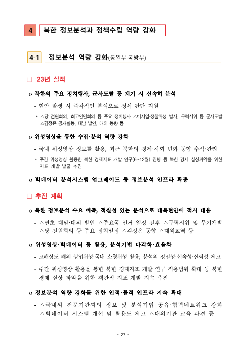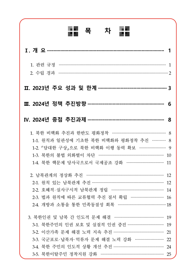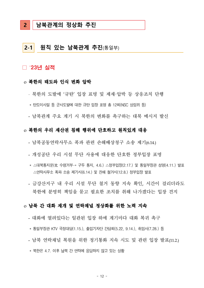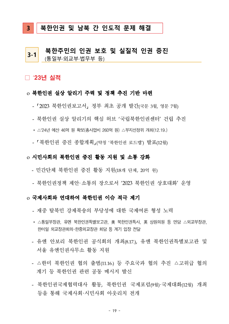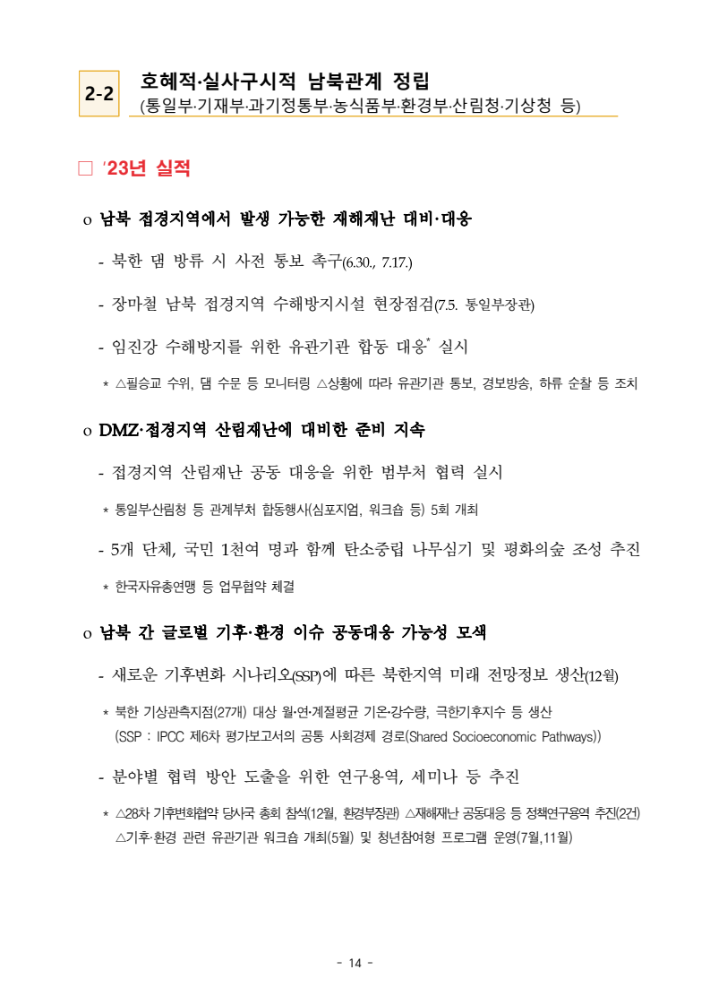 보도자료 보도시점 배포즉시 보도 2024. 05. 29.(수) 「2024년도 남북관계발전시행계획」 수립□ 정부는 「제4차 남북관계발전기본계획」(2023~2027)의 2차년도 이행계획인「2024년도 남북관계발전시행계획 」을 수립하였습니다 . o 「남북관계 발전에 관한 법률」은 남북관계 발전의 비전과 목표, 추진방향을 담은 5년 단위의 남북관계발전기본계획과 이에 따른 연도별 시행계획을 수립하도록 정하고 있습니다. o 「2024년도 시행계획」은 「제4차 남북관계발전기본계획」의 목표(①「담대한 구상」을통한 북핵문제 해결 ②원칙과 상호주의에 입각한 남북관계 정립 ③국민과 국제사회가 함께하는 평화통일의 토대 마련) 및 중점 추진과제의 이행을 위한 올해 세부추진계획입니다. □ 남북관계발전위원회 민간위원과 관계부처의 의견을 폭넓게 수렴한 후「남북관계발전위원회」 심의(5. 16.~5. 21.)를 거쳐 「2024년도 시행계획」을확정(5. 23.)하고 국회에 보고하였습니다(5. 24.). o 통일부 장관(위원장) 등 정부위원(15인)과 국회 등의 추천을 받아 위촉한 민간위원(15인)으로 구성된 남북관계발전위원회는 「남북관계발전기본계획」, 「남북관계발전시행계획」의 수립 및 남북관계 발전을 위한 중요사항을 심의하는 것을 목적으로 하고 있습니다. □ 정부는 앞으로 「2024년도 시행계획」을 관계부처 간의 긴밀한 협업 하에추진‧이행해 나가도록 하겠습니다. <별첨> 「2024년도 남북관계발전시행계획」 1부. 담당 부서 통일정책실 책임자 과 장 임현정 (02-2100-5770) 전략기획과 담당자 사무관 이승윤 (02-2100-5773) * 중점 추진 과제 : ①북한 비핵화 추진과 한반도 평화정착 ②남북관계의 정상화 추진 ③북한인권 및 남북 간 인도적 문제 해결 ④북한 정보분석과 정책수립 역량 강화 ⑤국민, 국제사회와 함께하는 통일준비 「제4차 남북관계발전기본계획남북관계발전기본계획」2024년도 시행계획2024. 5. 대한민국 정부 목 차 Ⅰ. 개 요 ························································································ 1 1. 관련 규정 · 1 2. 수립 경과 · 2 Ⅱ. 2023년 주요 성과 및 한계 ···················································· 3 Ⅲ. 2024년 정책 추진방향 ·························································· 6 Ⅳ. 2024년 중점 추진과제 ·························································· 8 1. 북한 비핵화 추진과 한반도 평화정착 · 8 1-1. 원칙과 일관성에 기초한 북한 비핵화와 평화정착 추진 · 8 1-2. 담대한 구상 으로 북한 비핵화 이행 동력 확보 · 9 1-3. 북한의 불법 외화벌이 차단 · 10 1-4. 북한 핵문제 당사국으로서 국제공조 강화 · 11 2. 남북관계의 정상화 추진 · 12 2-1. 원칙 있는 남북관계 추진 · 12 2-2. 호혜적 실사구시적 남북관계 정립 · 14 2-3. 법과 원칙에 따른 교류협력 추진 질서 확립 · 16 2-4. 개방과 소통을 통한 민족동질성 회복 · 18 3. 북한인권 및 남북 간 인도적 문제 해결 · 19 3-1. 북한주민의 인권 보호 및 실질적 인권 증진 · 19 3-2. 이산가족 문제 해결 노력 지속 추진 · 21 3-3. 국군포로 납북자 억류자 문제 해결 노력 강화 · 22 3-4. 북한 주민의 인도적 상황 개선 추진 · 24 3-5. 북한이탈주민 정착지원 강화 · 25 4. 북한 정보분석과 정책수립 역량 강화 · 27 4-1. 정보분석 역량 강화 · 27 4-2. 정책수립 지원 역량 강화 · 28 4-3. 북한 정보·정책 네트워크 정비 · 29 4-4. 북한자료 대국민 서비스 개선 · 30 5. 국민, 국제사회와 함께하는 통일준비 · 31 5-1. 새로운 통일미래비전(통일담론) 정립 · 31 5-2. 통일기반 조성을 위한 법 제도 마련 · 32 5-3. 북한 실상에 대한 객관적 균형적 이해 제고 · 33 5-4. 통일교육 강화 및 통일 대북정책 공감대 형성 · 34 5-5. 한반도 통일기반 조성을 위한 국제사회 협력 강화 · 36 Ⅴ. 추진체계 및 소요재원 ························································ 38 1. 추진 체계 · 38 2. 소요 재원 · 39 붙임 1. 2024년 남북협력기금 편성 내역 · 40 붙임 2. 과제별 소관 부처(청) 현황 · 41 - 1 - Ⅰ 개요 1 관련 규정 o 통일부장관은 관계중앙행정기관의 장과의 협의를 거쳐 남북관계발전기본계획 *에 따른 연도별 시행계획을 수립( 남북관계발전법 제13조 제4항) * 「남북관계발전기본계획」은 남북관계 발전의 기본방향 등을 담은 5개년 계획 - 수립된 연도별 시행계획은 국회에 보고 및 지체없이 고시 * 다만, 국가안전보장 또는 남북관계의 특수성 등을 고려하여 공개하지 아니할 필요성이 있다고 인정하는 사항에 대해서는 비공개 가능(「남북관계발전법 시행령」 제3조 단서) < 남북관계 발전에 관한 법률 > 제13조(남북관계발전기본계획의 수립) ①정부는 남북관계발전에관한기본계획(이하 ‘기본계획’)을 5년마다 수립하여야 한다. ②기본계획은 통일부장관이 남북관계발전위원회의 심의 및 국무회의의 심의를 거쳐 이를 확정한다. 다만, 예산이 수반되는 기본계획은 국회의 동의를 얻어야 한다. ③기본계획에는 다음 각 호의 사항이 포함되
