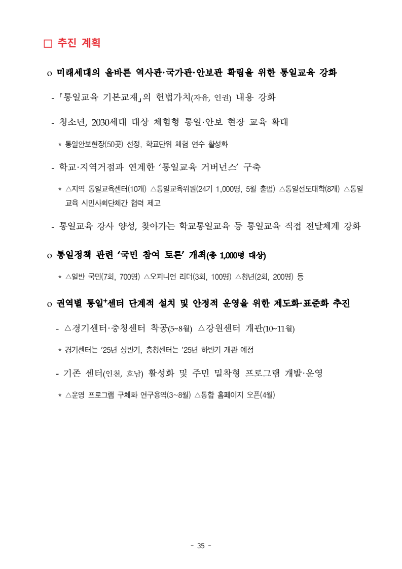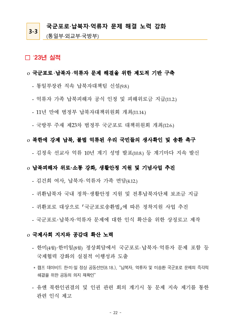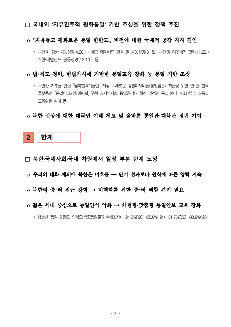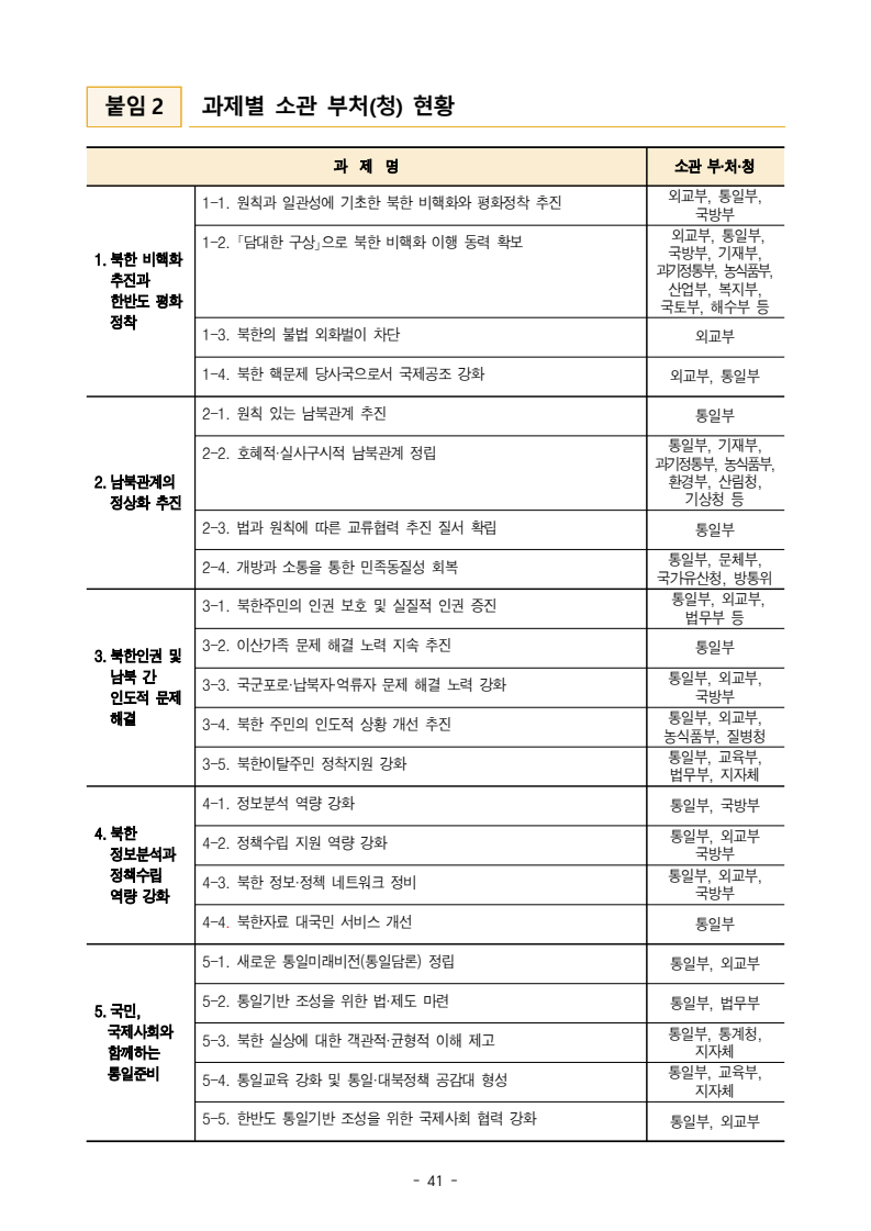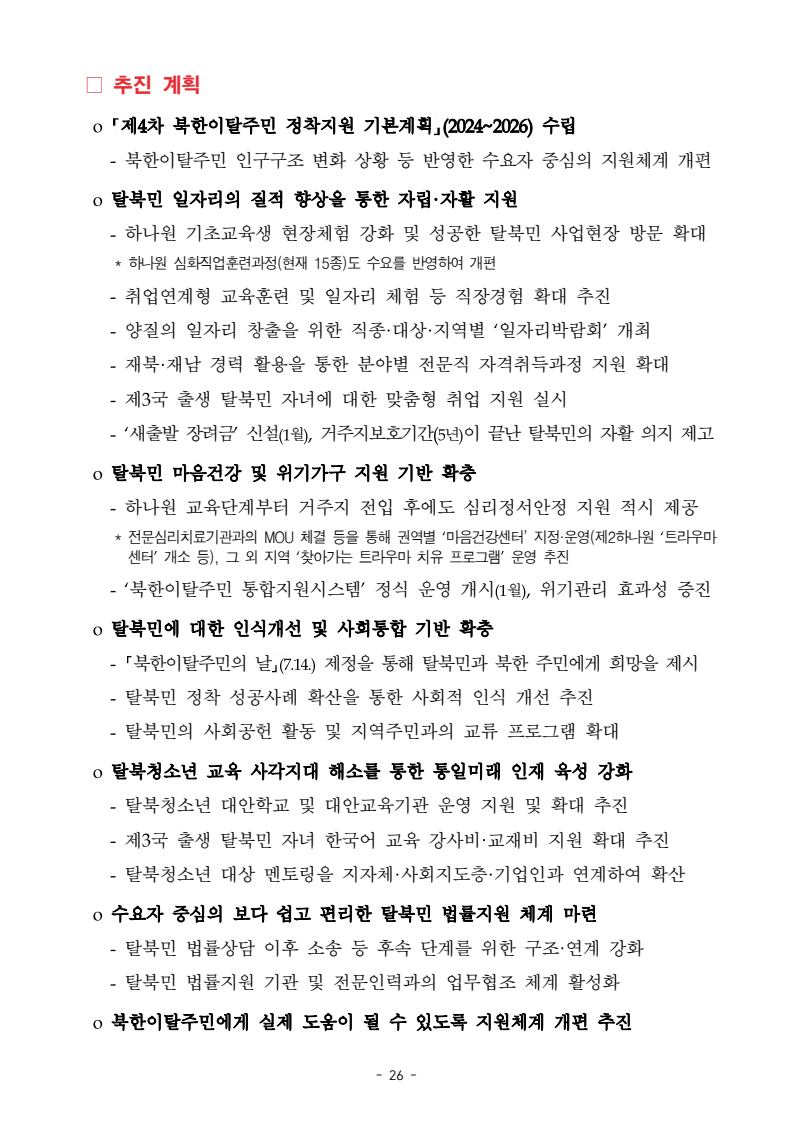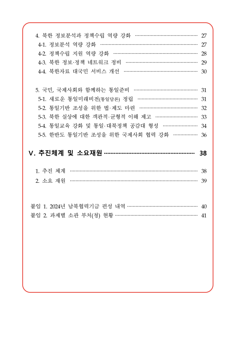 보도자료 보도시점 배포즉시 보도 2024. 05. 29.(수) 「2024년도 남북관계발전시행계획」 수립□ 정부는 「제4차 남북관계발전기본계획」(2023~2027)의 2차년도 이행계획인「2024년도 남북관계발전시행계획 」을 수립하였습니다 . o 「남북관계 발전에 관한 법률」은 남북관계 발전의 비전과 목표, 추진방향을 담은 5년 단위의 남북관계발전기본계획과 이에 따른 연도별 시행계획을 수립하도록 정하고 있습니다. o 「2024년도 시행계획」은 「제4차 남북관계발전기본계획」의 목표(①「담대한 구상」을통한 북핵문제 해결 ②원칙과 상호주의에 입각한 남북관계 정립 ③국민과 국제사회가 함께하는 평화통일의 토대 마련) 및 중점 추진과제의 이행을 위한 올해 세부추진계획입니다. □ 남북관계발전위원회 민간위원과 관계부처의 의견을 폭넓게 수렴한 후「남북관계발전위원회」 심의(5. 16.~5. 21.)를 거쳐 「2024년도 시행계획」을확정(5. 23.)하고 국회에 보고하였습니다(5. 24.). o 통일부 장관(위원장) 등 정부위원(15인)과 국회 등의 추천을 받아 위촉한 민간위원(15인)으로 구성된 남북관계발전위원회는 「남북관계발전기본계획」, 「남북관계발전시행계획」의 수립 및 남북관계 발전을 위한 중요사항을 심의하는 것을 목적으로 하고 있습니다. □ 정부는 앞으로 「2024년도 시행계획」을 관계부처 간의 긴밀한 협업 하에추진‧이행해 나가도록 하겠습니다. <별첨> 「2024년도 남북관계발전시행계획」 1부. 담당 부서 통일정책실 책임자 과 장 임현정 (02-2100-5770) 전략기획과 담당자 사무관 이승윤 (02-2100-5773) * 중점 추진 과제 : ①북한 비핵화 추진과 한반도 평화정착 ②남북관계의 정상화 추진 ③북한인권 및 남북 간 인도적 문제 해결 ④북한 정보분석과 정책수립 역량 강화 ⑤국민, 국제사회와 함께하는 통일준비 「제4차 남북관계발전기본계획남북관계발전기본계획」2024년도 시행계획2024. 5. 대한민국 정부 목 차 Ⅰ. 개 요 ························································································ 1 1. 관련 규정 · 1 2. 수립 경과 · 2 Ⅱ. 2023년 주요 성과 및 한계 ···················································· 3 Ⅲ. 2024년 정책 추진방향 ·························································· 6 Ⅳ. 2024년 중점 추진과제 ·························································· 8 1. 북한 비핵화 추진과 한반도 평화정착 · 8 1-1. 원칙과 일관성에 기초한 북한 비핵화와 평화정착 추진 · 8 1-2. 담대한 구상 으로 북한 비핵화 이행 동력 확보 · 9 1-3. 북한의 불법 외화벌이 차단 · 10 1-4. 북한 핵문제 당사국으로서 국제공조 강화 · 11 2. 남북관계의 정상화 추진 · 12 2-1. 원칙 있는 남북관계 추진 · 12 2-2. 호혜적 실사구시적 남북관계 정립 · 14 2-3. 법과 원칙에 따른 교류협력 추진 질서 확립 · 16 2-4. 개방과 소통을 통한 민족동질성 회복 · 18 3. 북한인권 및 남북 간 인도적 문제 해결 · 19 3-1. 북한주민의 인권 보호 및 실질적 인권 증진 · 19 3-2. 이산가족 문제 해결 노력 지속 추진 · 21 3-3. 국군포로 납북자 억류자 문제 해결 노력 강화 · 22 3-4. 북한 주민의 인도적 상황 개선 추진 · 24 3-5. 북한이탈주민 정착지원 강화 · 25 4. 북한 정보분석과 정책수립 역량 강화 · 27 4-1. 정보분석 역량 강화 · 27 4-2. 정책수립 지원 역량 강화 · 28 4-3. 북한 정보·정책 네트워크 정비 · 29 4-4. 북한자료 대국민 서비스 개선 · 30 5. 국민, 국제사회와 함께하는 통일준비 · 31 5-1. 새로운 통일미래비전(통일담론) 정립 · 31 5-2. 통일기반 조성을 위한 법 제도 마련 · 32 5-3. 북한 실상에 대한 객관적 균형적 이해 제고 · 33 5-4. 통일교육 강화 및 통일 대북정책 공감대 형성 · 34 5-5. 한반도 통일기반 조성을 위한 국제사회 협력 강화 · 36 Ⅴ. 추진체계 및 소요재원 ························································ 38 1. 추진 체계 · 38 2. 소요 재원 · 39 붙임 1. 2024년 남북협력기금 편성 내역 · 40 붙임 2. 과제별 소관 부처(청) 현황 · 41 - 1 - Ⅰ 개요 1 관련 규정 o 통일부장관은 관계중앙행정기관의 장과의 협의를 거쳐 남북관계발전기본계획 *에 따른 연도별 시행계획을 수립( 남북관계발전법 제13조 제4항) * 「남북관계발전기본계획」은 남북관계 발전의 기본방향 등을 담은 5개년 계획 - 수립된 연도별 시행계획은 국회에 보고 및 지체없이 고시 * 다만, 국가안전보장 또는 남북관계의 특수성 등을 고려하여 공개하지 아니할 필요성이 있다고 인정하는 사항에 대해서는 비공개 가능(「남북관계발전법 시행령」 제3조 단서) < 남북관계 발전에 관한 법률 > 제13조(남북관계발전기본계획의 수립) ①정부는 남북관계발전에관한기본계획(이하 ‘기본계획’)을 5년마다 수립하여야 한다. ②기본계획은 통일부장관이 남북관계발전위원회의 심의 및 국무회의의 심의를 거쳐 이를 확정한다. 다만, 예산이 수반되는 기본계획은 국회의 동의를 얻어야 한다. ③기본계획에는 다음 각 호의 사항이 포함되