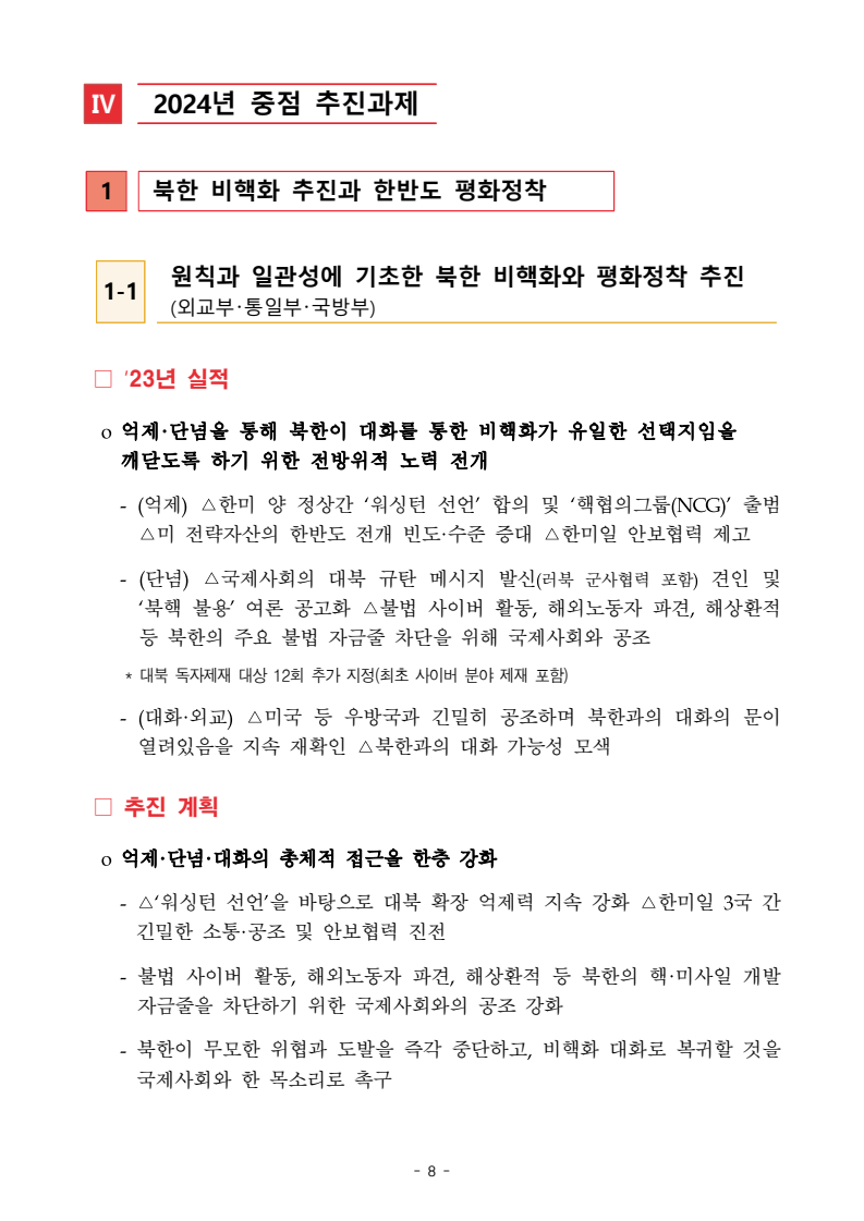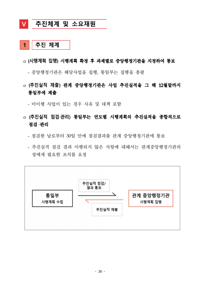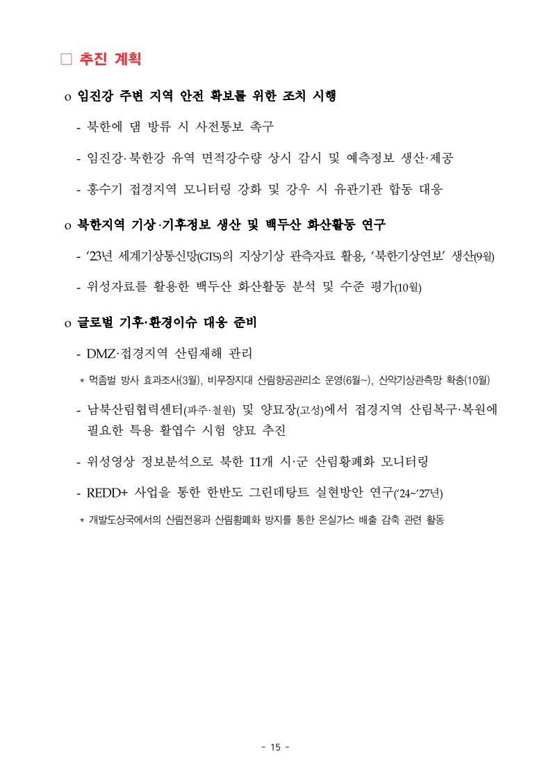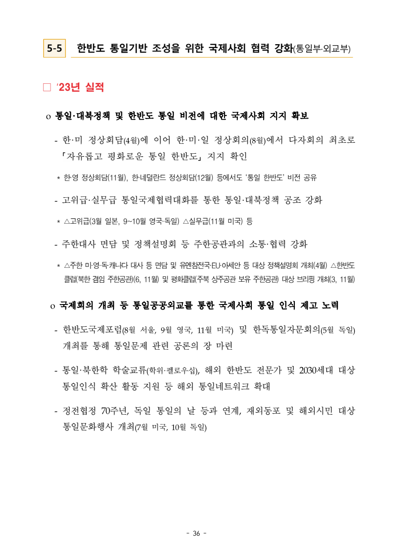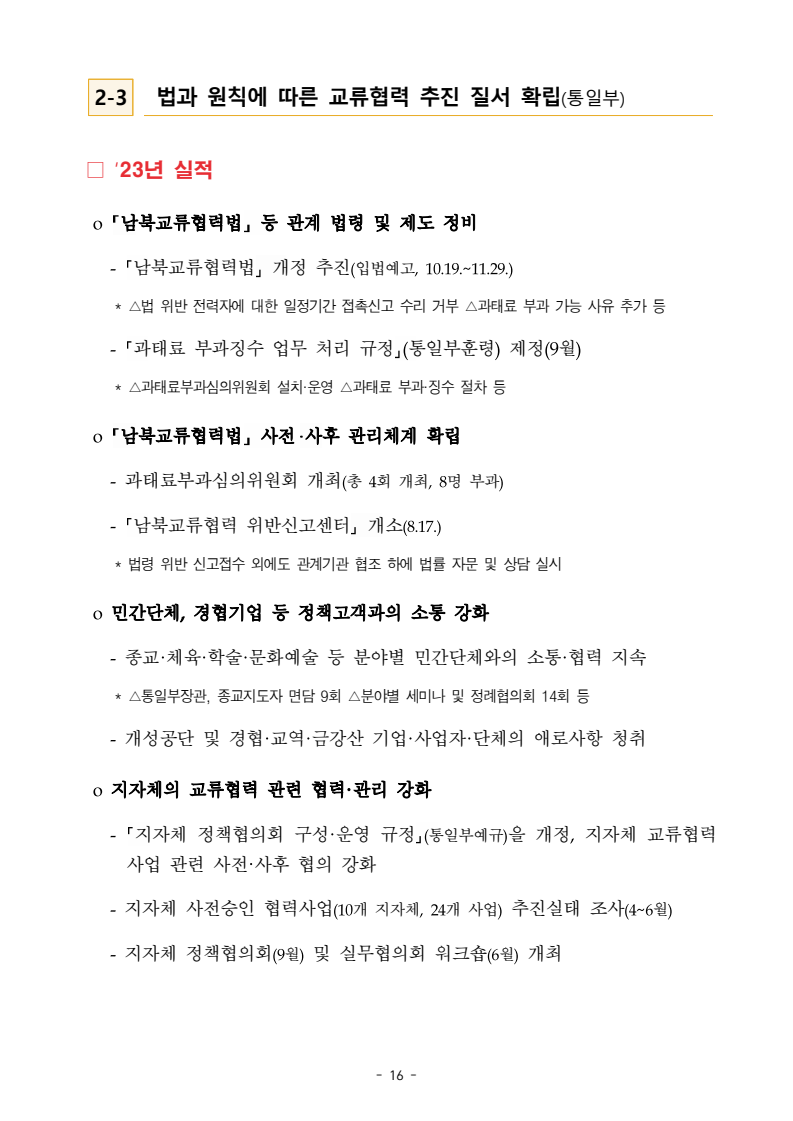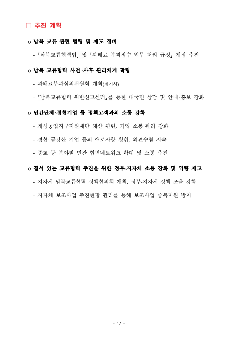 보도자료 보도시점 배포즉시 보도 2024. 05. 29.(수) 「2024년도 남북관계발전시행계획」 수립□ 정부는 「제4차 남북관계발전기본계획」(2023~2027)의 2차년도 이행계획인「2024년도 남북관계발전시행계획 」을 수립하였습니다 . o 「남북관계 발전에 관한 법률」은 남북관계 발전의 비전과 목표, 추진방향을 담은 5년 단위의 남북관계발전기본계획과 이에 따른 연도별 시행계획을 수립하도록 정하고 있습니다. o 「2024년도 시행계획」은 「제4차 남북관계발전기본계획」의 목표(①「담대한 구상」을통한 북핵문제 해결 ②원칙과 상호주의에 입각한 남북관계 정립 ③국민과 국제사회가 함께하는 평화통일의 토대 마련) 및 중점 추진과제의 이행을 위한 올해 세부추진계획입니다. □ 남북관계발전위원회 민간위원과 관계부처의 의견을 폭넓게 수렴한 후「남북관계발전위원회」 심의(5. 16.~5. 21.)를 거쳐 「2024년도 시행계획」을확정(5. 23.)하고 국회에 보고하였습니다(5. 24.). o 통일부 장관(위원장) 등 정부위원(15인)과 국회 등의 추천을 받아 위촉한 민간위원(15인)으로 구성된 남북관계발전위원회는 「남북관계발전기본계획」, 「남북관계발전시행계획」의 수립 및 남북관계 발전을 위한 중요사항을 심의하는 것을 목적으로 하고 있습니다. □ 정부는 앞으로 「2024년도 시행계획」을 관계부처 간의 긴밀한 협업 하에추진‧이행해 나가도록 하겠습니다. <별첨> 「2024년도 남북관계발전시행계획」 1부. 담당 부서 통일정책실 책임자 과 장 임현정 (02-2100-5770) 전략기획과 담당자 사무관 이승윤 (02-2100-5773) * 중점 추진 과제 : ①북한 비핵화 추진과 한반도 평화정착 ②남북관계의 정상화 추진 ③북한인권 및 남북 간 인도적 문제 해결 ④북한 정보분석과 정책수립 역량 강화 ⑤국민, 국제사회와 함께하는 통일준비 「제4차 남북관계발전기본계획남북관계발전기본계획」2024년도 시행계획2024. 5. 대한민국 정부 목 차 Ⅰ. 개 요 ························································································ 1 1. 관련 규정 · 1 2. 수립 경과 · 2 Ⅱ. 2023년 주요 성과 및 한계 ···················································· 3 Ⅲ. 2024년 정책 추진방향 ·························································· 6 Ⅳ. 2024년 중점 추진과제 ·························································· 8 1. 북한 비핵화 추진과 한반도 평화정착 · 8 1-1. 원칙과 일관성에 기초한 북한 비핵화와 평화정착 추진 · 8 1-2. 담대한 구상 으로 북한 비핵화 이행 동력 확보 · 9 1-3. 북한의 불법 외화벌이 차단 · 10 1-4. 북한 핵문제 당사국으로서 국제공조 강화 · 11 2. 남북관계의 정상화 추진 · 12 2-1. 원칙 있는 남북관계 추진 · 12 2-2. 호혜적 실사구시적 남북관계 정립 · 14 2-3. 법과 원칙에 따른 교류협력 추진 질서 확립 · 16 2-4. 개방과 소통을 통한 민족동질성 회복 · 18 3. 북한인권 및 남북 간 인도적 문제 해결 · 19 3-1. 북한주민의 인권 보호 및 실질적 인권 증진 · 19 3-2. 이산가족 문제 해결 노력 지속 추진 · 21 3-3. 국군포로 납북자 억류자 문제 해결 노력 강화 · 22 3-4. 북한 주민의 인도적 상황 개선 추진 · 24 3-5. 북한이탈주민 정착지원 강화 · 25 4. 북한 정보분석과 정책수립 역량 강화 · 27 4-1. 정보분석 역량 강화 · 27 4-2. 정책수립 지원 역량 강화 · 28 4-3. 북한 정보·정책 네트워크 정비 · 29 4-4. 북한자료 대국민 서비스 개선 · 30 5. 국민, 국제사회와 함께하는 통일준비 · 31 5-1. 새로운 통일미래비전(통일담론) 정립 · 31 5-2. 통일기반 조성을 위한 법 제도 마련 · 32 5-3. 북한 실상에 대한 객관적 균형적 이해 제고 · 33 5-4. 통일교육 강화 및 통일 대북정책 공감대 형성 · 34 5-5. 한반도 통일기반 조성을 위한 국제사회 협력 강화 · 36 Ⅴ. 추진체계 및 소요재원 ························································ 38 1. 추진 체계 · 38 2. 소요 재원 · 39 붙임 1. 2024년 남북협력기금 편성 내역 · 40 붙임 2. 과제별 소관 부처(청) 현황 · 41 - 1 - Ⅰ 개요 1 관련 규정 o 통일부장관은 관계중앙행정기관의 장과의 협의를 거쳐 남북관계발전기본계획 *에 따른 연도별 시행계획을 수립( 남북관계발전법 제13조 제4항) * 「남북관계발전기본계획」은 남북관계 발전의 기본방향 등을 담은 5개년 계획 - 수립된 연도별 시행계획은 국회에 보고 및 지체없이 고시 * 다만, 국가안전보장 또는 남북관계의 특수성 등을 고려하여 공개하지 아니할 필요성이 있다고 인정하는 사항에 대해서는 비공개 가능(「남북관계발전법 시행령」 제3조 단서) < 남북관계 발전에 관한 법률 > 제13조(남북관계발전기본계획의 수립) ①정부는 남북관계발전에관한기본계획(이하 ‘기본계획’)을 5년마다 수립하여야 한다. ②기본계획은 통일부장관이 남북관계발전위원회의 심의 및 국무회의의 심의를 거쳐 이를 확정한다. 다만, 예산이 수반되는 기본계획은 국회의 동의를 얻어야 한다. ③기본계획에는 다음 각 호의 사항이 포함되