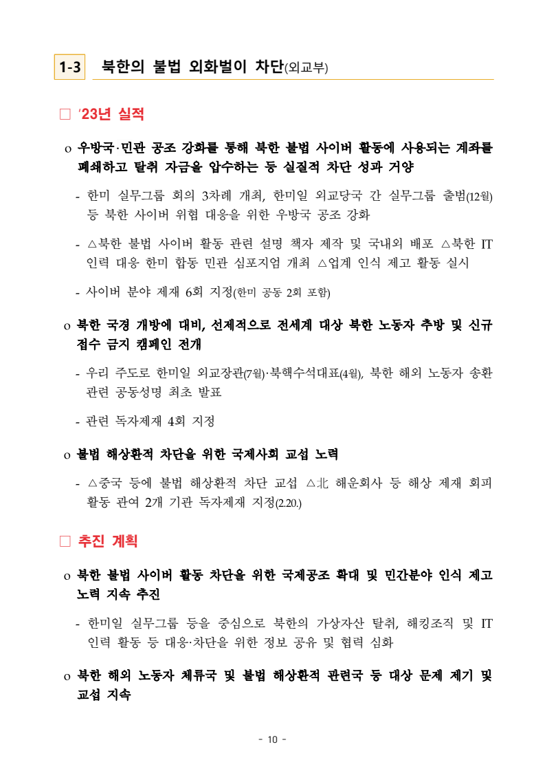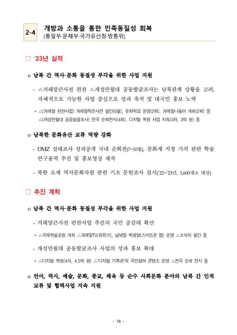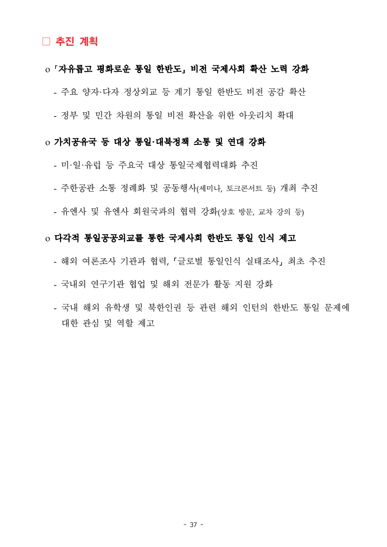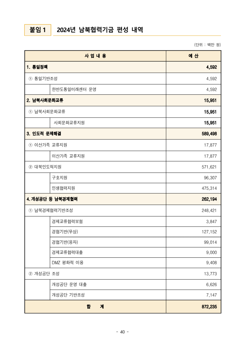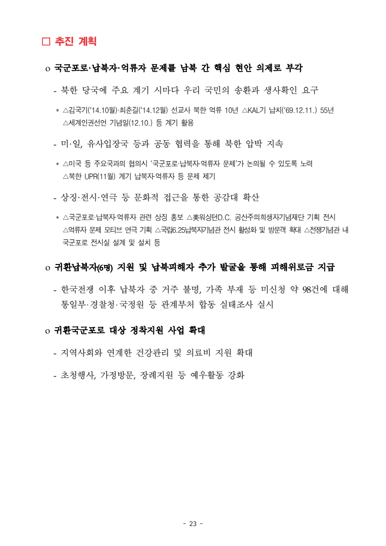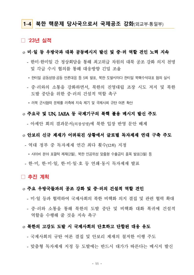 보도자료 보도시점 배포즉시 보도 2024. 05. 29.(수) 「2024년도 남북관계발전시행계획」 수립□ 정부는 「제4차 남북관계발전기본계획」(2023~2027)의 2차년도 이행계획인「2024년도 남북관계발전시행계획 」을 수립하였습니다 . o 「남북관계 발전에 관한 법률」은 남북관계 발전의 비전과 목표, 추진방향을 담은 5년 단위의 남북관계발전기본계획과 이에 따른 연도별 시행계획을 수립하도록 정하고 있습니다. o 「2024년도 시행계획」은 「제4차 남북관계발전기본계획」의 목표(①「담대한 구상」을통한 북핵문제 해결 ②원칙과 상호주의에 입각한 남북관계 정립 ③국민과 국제사회가 함께하는 평화통일의 토대 마련) 및 중점 추진과제의 이행을 위한 올해 세부추진계획입니다. □ 남북관계발전위원회 민간위원과 관계부처의 의견을 폭넓게 수렴한 후「남북관계발전위원회」 심의(5. 16.~5. 21.)를 거쳐 「2024년도 시행계획」을확정(5. 23.)하고 국회에 보고하였습니다(5. 24.). o 통일부 장관(위원장) 등 정부위원(15인)과 국회 등의 추천을 받아 위촉한 민간위원(15인)으로 구성된 남북관계발전위원회는 「남북관계발전기본계획」, 「남북관계발전시행계획」의 수립 및 남북관계 발전을 위한 중요사항을 심의하는 것을 목적으로 하고 있습니다. □ 정부는 앞으로 「2024년도 시행계획」을 관계부처 간의 긴밀한 협업 하에추진‧이행해 나가도록 하겠습니다. <별첨> 「2024년도 남북관계발전시행계획」 1부. 담당 부서 통일정책실 책임자 과 장 임현정 (02-2100-5770) 전략기획과 담당자 사무관 이승윤 (02-2100-5773) * 중점 추진 과제 : ①북한 비핵화 추진과 한반도 평화정착 ②남북관계의 정상화 추진 ③북한인권 및 남북 간 인도적 문제 해결 ④북한 정보분석과 정책수립 역량 강화 ⑤국민, 국제사회와 함께하는 통일준비 「제4차 남북관계발전기본계획남북관계발전기본계획」2024년도 시행계획2024. 5. 대한민국 정부 목 차 Ⅰ. 개 요 ························································································ 1 1. 관련 규정 · 1 2. 수립 경과 · 2 Ⅱ. 2023년 주요 성과 및 한계 ···················································· 3 Ⅲ. 2024년 정책 추진방향 ·························································· 6 Ⅳ. 2024년 중점 추진과제 ·························································· 8 1. 북한 비핵화 추진과 한반도 평화정착 · 8 1-1. 원칙과 일관성에 기초한 북한 비핵화와 평화정착 추진 · 8 1-2. 담대한 구상 으로 북한 비핵화 이행 동력 확보 · 9 1-3. 북한의 불법 외화벌이 차단 · 10 1-4. 북한 핵문제 당사국으로서 국제공조 강화 · 11 2. 남북관계의 정상화 추진 · 12 2-1. 원칙 있는 남북관계 추진 · 12 2-2. 호혜적 실사구시적 남북관계 정립 · 14 2-3. 법과 원칙에 따른 교류협력 추진 질서 확립 · 16 2-4. 개방과 소통을 통한 민족동질성 회복 · 18 3. 북한인권 및 남북 간 인도적 문제 해결 · 19 3-1. 북한주민의 인권 보호 및 실질적 인권 증진 · 19 3-2. 이산가족 문제 해결 노력 지속 추진 · 21 3-3. 국군포로 납북자 억류자 문제 해결 노력 강화 · 22 3-4. 북한 주민의 인도적 상황 개선 추진 · 24 3-5. 북한이탈주민 정착지원 강화 · 25 4. 북한 정보분석과 정책수립 역량 강화 · 27 4-1. 정보분석 역량 강화 · 27 4-2. 정책수립 지원 역량 강화 · 28 4-3. 북한 정보·정책 네트워크 정비 · 29 4-4. 북한자료 대국민 서비스 개선 · 30 5. 국민, 국제사회와 함께하는 통일준비 · 31 5-1. 새로운 통일미래비전(통일담론) 정립 · 31 5-2. 통일기반 조성을 위한 법 제도 마련 · 32 5-3. 북한 실상에 대한 객관적 균형적 이해 제고 · 33 5-4. 통일교육 강화 및 통일 대북정책 공감대 형성 · 34 5-5. 한반도 통일기반 조성을 위한 국제사회 협력 강화 · 36 Ⅴ. 추진체계 및 소요재원 ························································ 38 1. 추진 체계 · 38 2. 소요 재원 · 39 붙임 1. 2024년 남북협력기금 편성 내역 · 40 붙임 2. 과제별 소관 부처(청) 현황 · 41 - 1 - Ⅰ 개요 1 관련 규정 o 통일부장관은 관계중앙행정기관의 장과의 협의를 거쳐 남북관계발전기본계획 *에 따른 연도별 시행계획을 수립( 남북관계발전법 제13조 제4항) * 「남북관계발전기본계획」은 남북관계 발전의 기본방향 등을 담은 5개년 계획 - 수립된 연도별 시행계획은 국회에 보고 및 지체없이 고시 * 다만, 국가안전보장 또는 남북관계의 특수성 등을 고려하여 공개하지 아니할 필요성이 있다고 인정하는 사항에 대해서는 비공개 가능(「남북관계발전법 시행령」 제3조 단서) < 남북관계 발전에 관한 법률 > 제13조(남북관계발전기본계획의 수립) ①정부는 남북관계발전에관한기본계획(이하 ‘기본계획’)을 5년마다 수립하여야 한다. ②기본계획은 통일부장관이 남북관계발전위원회의 심의 및 국무회의의 심의를 거쳐 이를 확정한다. 다만, 예산이 수반되는 기본계획은 국회의 동의를 얻어야 한다. ③기본계획에는 다음 각 호의 사항이 포함되