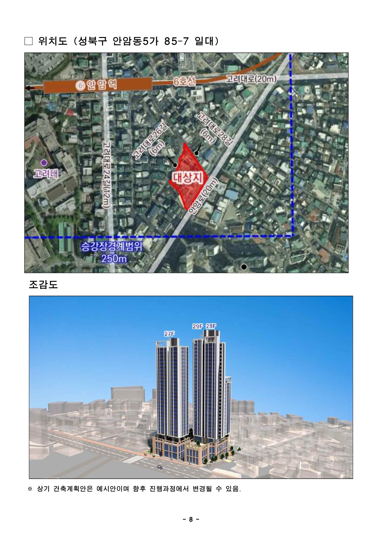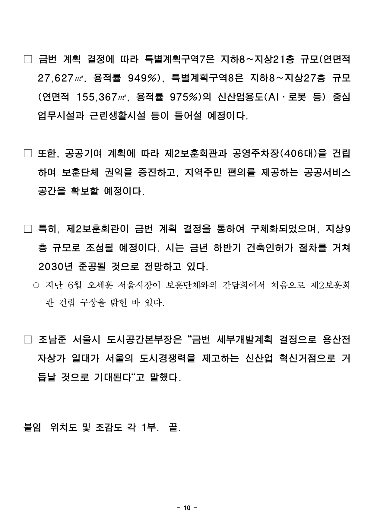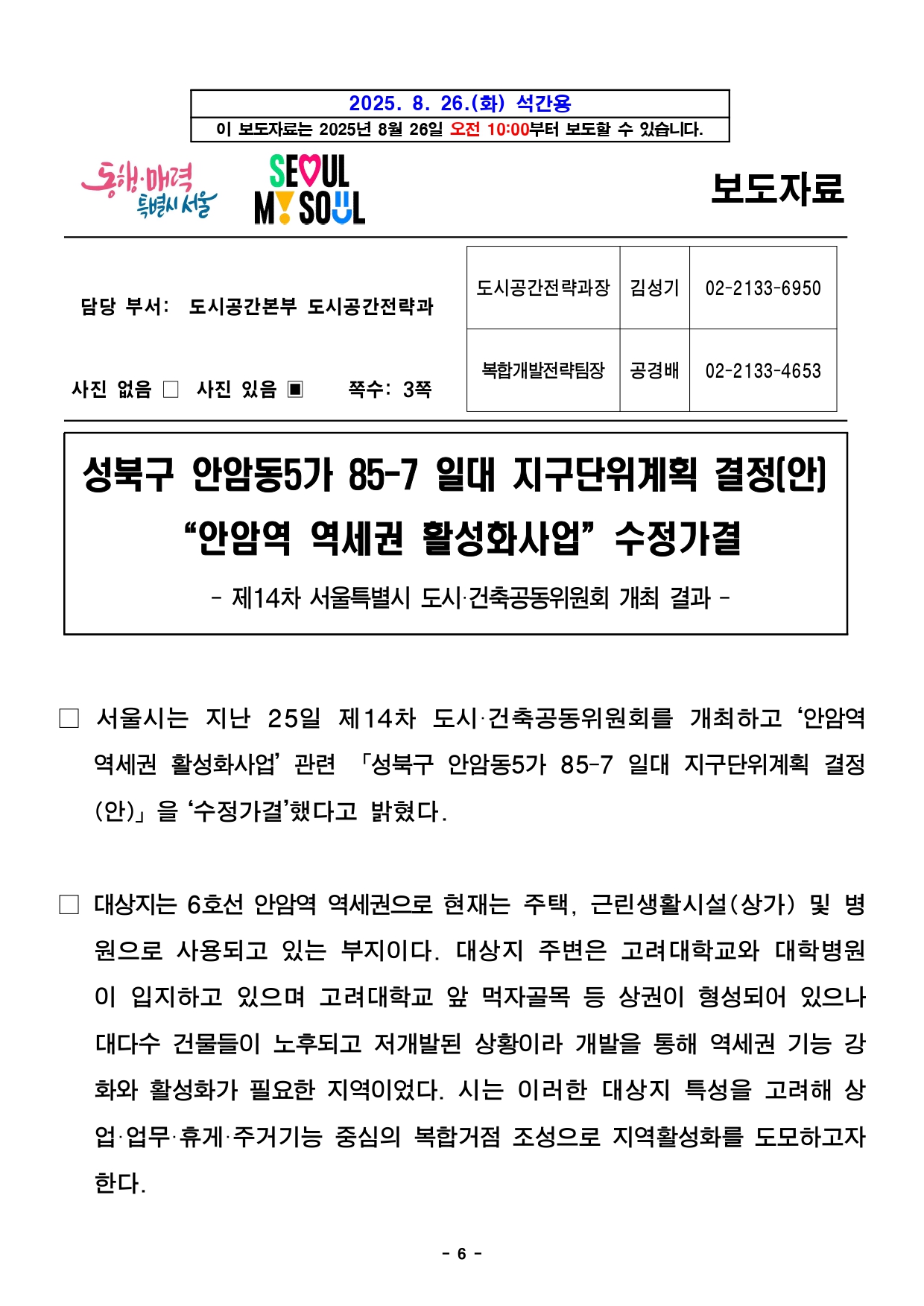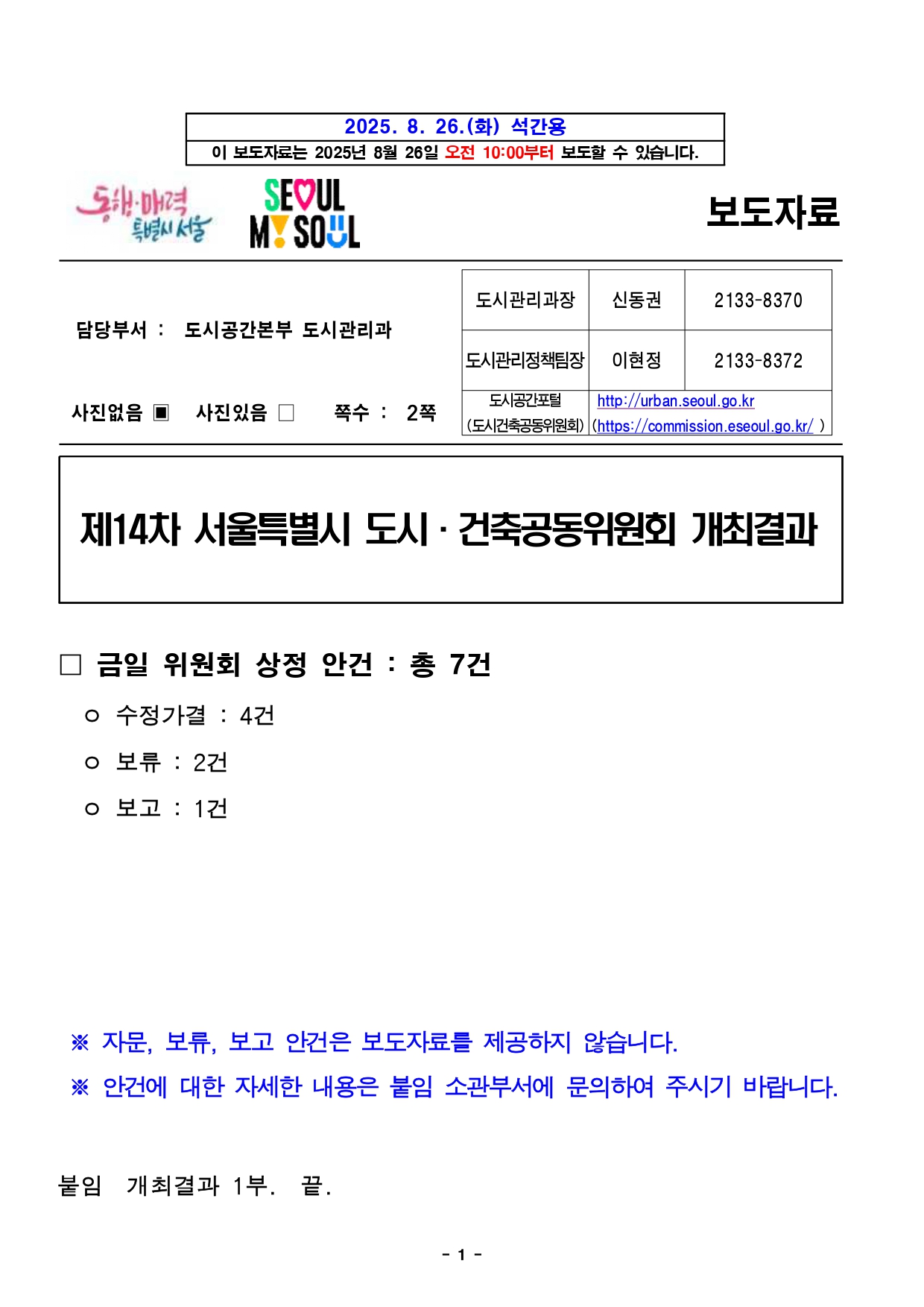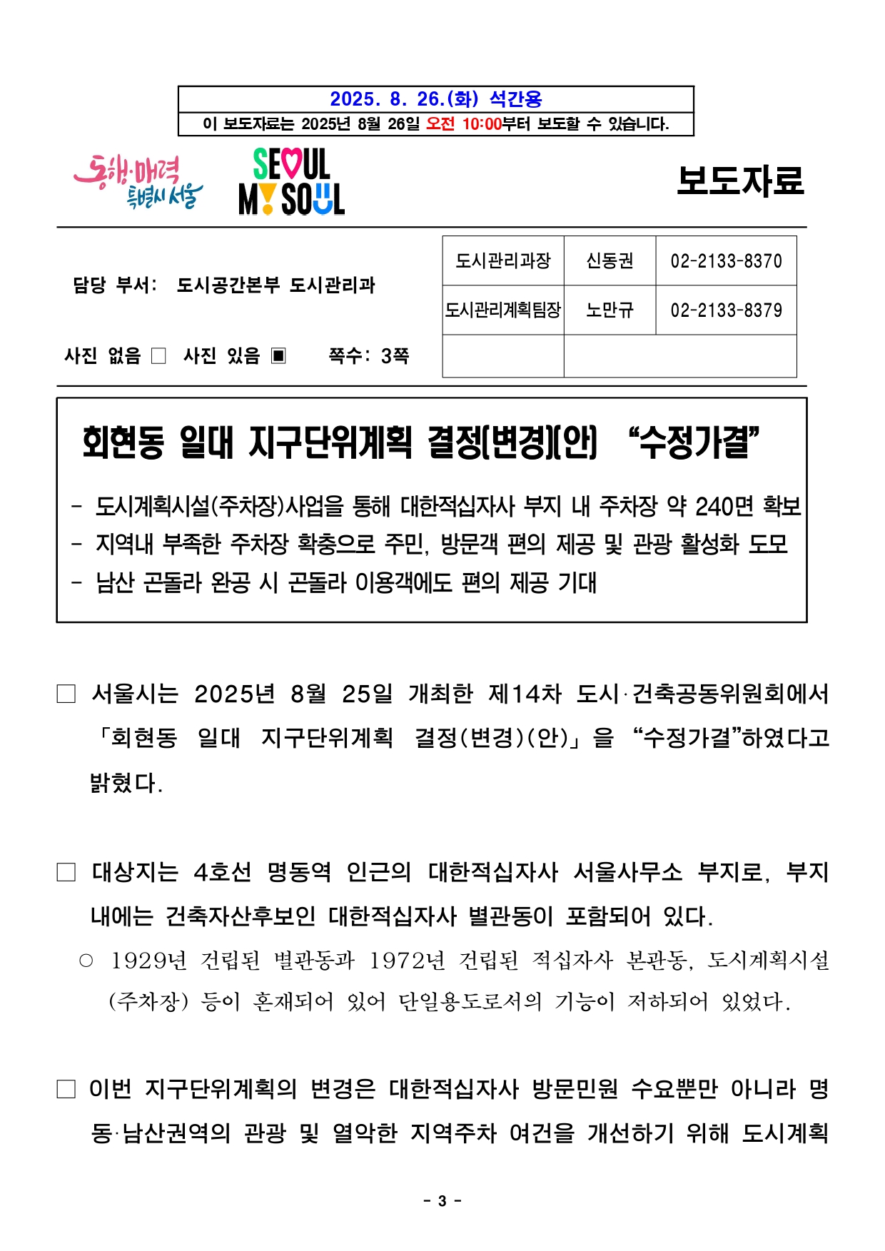 - 1 - 2025. 8. 26.(화) 석간용 이 보도자료는 2025년 8월 26일 오전 10:00부터 보도할 수 있습니다. 보도자료담당부서 : 도시공간본부 도시관리과 도시관리과장 신동권 2133-8370 도시관리정책팀장 이현정 2133-8372 사진없음 ▣ 사진있음 □ 쪽수 : 2쪽 도시공간포털 (도시건축공동위원회) http://urban.seoul.go.kr (https://commission.eseoul.go.kr/ ) 제14차 서울특별시 도시·건축공동위원회 개최결과□ 금일 위원회 상정 안건 : 총 7건 ㅇ 수정가결 : 4건 ㅇ 보류 : 2건 ㅇ 보고 : 1건 ※ 자문, 보류, 보고 안건은 보도자료를 제공하지 않습니다. ※ 안건에 대한 자세한 내용은 붙임 소관부서에 문의하여 주시기 바랍니다. 붙임 개최결과 1부. 끝. - 2 - 제14차 도시건축공동위원회 개최결과【 2025.08.25. (월) 14:00 】 ▣ 총 7건 (심의 6건, 보고 1건) 연번 안건명 개 요 개최 결과 비고 1 <심의> 회현동 일대 지구단위계획 결정(변경)(안) ○ 위 치 : 중구 남산동3가 32-2 일대(412,142.8㎡) ○ 내 용 : 회현동 일대 지구단위계획 결정(변경) - 도시계획시설(주차장) 건축물의 규모 신설 - 가구 및 획지계획, 계획관리구역 변경 수정가결 <도시관리과> 도시관리계획팀 팀장 : 노만규 담당 : 임세나 (2133-8381) 2 <심의> 안암동5가 일대 역세권 활성화사업 지구단위계획구역 지정 및 계획 결정(안) ○ 위 치 : 성북구 안암동5가 85-7 일대(3,061㎡) ○ 내 용 : 역세권 활성화사업에 따른 지구단위계획구역 지정 및 계획 결정 - 지구단위계획구역 지정 : 3,061㎡ - 용도지역: 제3종일반주거지역 → 근린상업지역 - 공공기여 계획 : 공공임대주택, 지역필요시설, 도로 수정가결 <도시공간전략과> 복합개발전략팀 팀장 : 공경배 담당 : 송영기 (2133-4656) 3 <재심의> 용산 지구단위계획(변경) 및 용산전자상가지구 특별계획구역8 세부개발계획 결정(안) ○ 위 치 : 용산구 한강로2가 15-2 일대(12,894.9㎡) ○ 내 용 : 용산 지구단위계획 결정(변경) 및 용산 전자상가지구 특별계획구역8 세부개발계획 결정 - 도시계획시설(유통업무설비, 주차장, 도로 등) 결정(변경) - 용산전자상가지구 특별계획구역8 신규 지정 등 - 건축물의 용도·밀도·높이·배치계획 등에 관한 사항 수정가결 <도시관리과> 도시관리지원팀 팀장 : 배현경 담당 : 최진혁 (2133-8385) 4 <심의> 용산 지구단위계획(변경) 및 용산전자상가지구 특별계획구역7 세부개발계획 결정(안) ○ 위 치 : 용산구 한강로3가 3-23 일원(1,992.9㎡) ○ 내 용 : 용산 지구단위계획 결정(변경) 및 용산 전자상가지구 특별계획구역7 세부개발계획 결정 - 도시계획시설(유통업무설비) 결정(변경) - 용산전자상가지구 특별계획구역7 신규 지정 등 - 건축물의 용도·밀도·높이·배치계획 등에 관한 사항 수정가결 <도시관리과> 도시관리지원팀 팀장 : 배현경 담당 : 최진혁 (2133-8385) 5 <심의> 장승배기역 장기전세주택 지구단위계획구역 지정 및 계획 결정(안) ○ 위 치 : 동작구 상도동 194-27번지 일대(22,748.2㎡) ○ 내 용 : 지구단위계획구역 결정(변경) 및 특별계획구역 세부개발계획 결정(변경) - 지구단위계획구역 지정 : 22,748.2㎡ - 용도지역 상향 : 제2종(7층이하), 제3종일반 → 준주거지역 - 도시계획시설·밀도·높이계획에 관한 사항 등 보류 <공공주택과> 지역주택조합팀 팀장 : 김병문 담당 : 하이현 (2133-7059) 6 <심의> 신목동역세권 장기전세주택 지구단위계획구역 지정 및 특별계획구역2 세부개발계획 결정(안) ○ 위 치 : 양천구 목동 131-9번지 일대(22,171㎡) ○ 내 용 : 지구단위계획구역 결정(변경) 및 특별계획구역 세부개발계획 결정(변경) - 지구단위계획구역 지정 : 22,171㎡ - 용도지역 상향 : 제2종(7층이하), 제3종일반 → 준주거지역 - 도시계획시설·밀도·높이계획에 관한 사항 등 보류 <공공주택과> 지역주택조합팀 팀장 : 김병문 담당 : 하이현 (2133-7059) 7 <보고> 제2종·3종일반주거 지역한시적 용적률 완화 일괄 재정비 결정(안) ○ 위 치 : 가로수길 지구단위계획구역 등 244개 구역 ○ 내 용 : 제2종·제3종일반주거지역 내 한시적 용적률 일괄 반영에 따른 지구단위계획 결정 - 지구단위계획 결정(안) 재열람공고 제출의견에 대한 조치계획 보고 - <도시관리과> 도시관리정책팀 팀장 : 이현정 담당 : 이성열 (2133-8373) - 3 - 2025. 8. 26.(화) 석간용 이 보도자료는 2025년 8월 26일 오전 10:00부터 보도할 수 있습니다. 보도자료담당 부서: 도시공간본부 도시관리과 도시관리과장 신동권 02-2133-8370 도시관리계획팀장 노만규 02-2133-8379 사진 없음 □ 사진 있음 ▣ 쪽수: 3쪽 회현동 일대 지구단위계획 결정(변경)(안) “수정가결”- 도시계획시설(주차장)사업을 통해 대한적십자사 부지 내 주차장 약 240면확보- 지역내 부족한 주차장 확충으로 주민, 방문객 편의 제공 및 관광 활성화도모- 남산 곤돌라 완공 시 곤돌라 이용객에도 편의 제공 기대 □ 서울시는 2025년 8월 25일 개최한 제14차 도시‧건축공동위원회에서「회현동 일대 지구단위계획 결정(변경)(안)」을 “수정가결”하였다고밝혔다. □ 대상지는 4호선 명동역 인근의 대한적십자사 서울사무소 부지로, 부지내에는 건축자산후보인 대한적십자사 별관동이 포함되어 있다. ○ 1929년 건립된 별관동과 1972년 건립된 적십자사 본관동, 도시계획시설