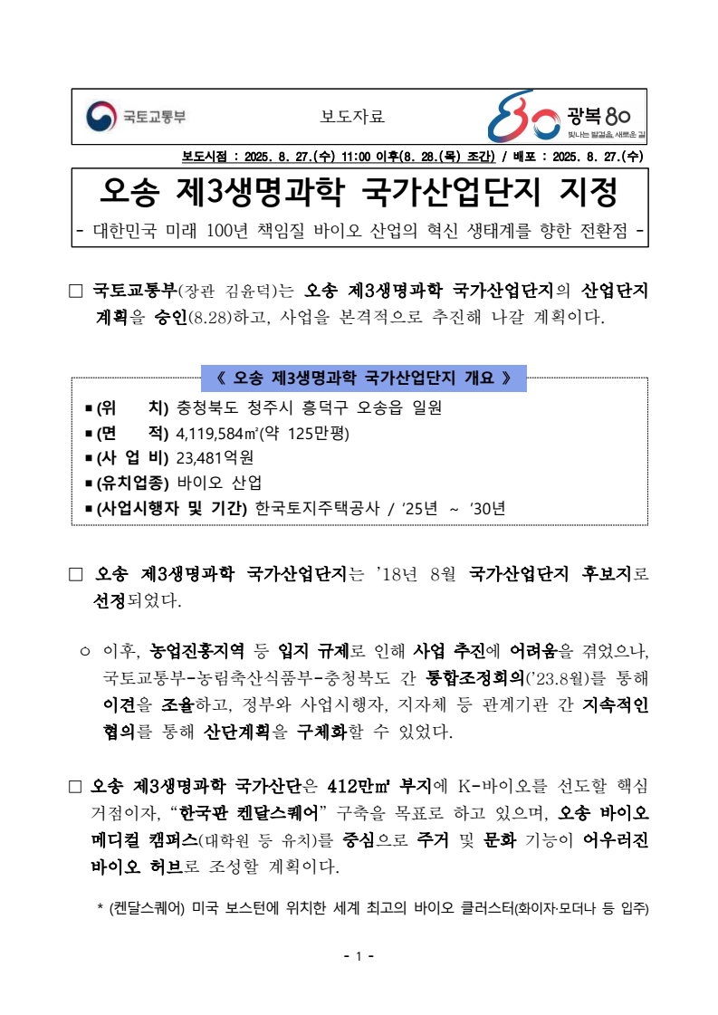 - 1 - 보도시점 수 이후 목 조간 : 2025. 8. 27.( ) 11:00 (8. 28.( ) ) / : 2025. 8. 27.( )배포 수오송 제 생명과학 국가산업단지 지정 3 - 100 - 대한민국 미래 년 책임질 바이오 산업의 혁신 생태계를 향한 전환점 □ 국토교통부( ) 장관 김윤덕 는 오송 제 생명과학 국가산업단지 3 의 산업단지 계획을 승인(8.28)하고 사업을 본격적으로 추진해 나갈 계획이다 , . 《 》 오송 제 생명과학 국가산업단지 개요 3 ▪(위 치) 충청북도 청주시 흥덕구 오송읍 일원 ▪(면 적) 4,119,584 ( 125 ) ㎡ 약 만평 ▪(사 업 비) 23,481억원 ▪( 치업종) 유 바이오 산업 ▪(사업시행자 및 기간) / ’25 ’30 한국토지주택공사 년 년 ~ □ 오송 제 생명과학 국가산업단지 3 는 년 월 ’18 8 국가산업단지 후보지로 선정되었다. 이후, ㅇ 농업진흥지역 등 입지 규제로 인해 사업 추진에 어려움을 겪었으나, 국토교통부 농림축산식품부 충청북도 간 - - 통합조정회의(’23.8 ) 월 를 통해 이견을 조율하고 정부와 사업시행자 지자체 등 관계기관 간 , , 지속적인 협의를 통해 산단계획을 구체화할 수 있었다. □ 오송 제 생명과학 국가산단 3 은 412 ㎡ 만 부지에 바이오를 선도할 핵심 K거점이자, “한국판 켄달스퀘어” , 구축을 목표로 하고 있으며 오송 바이오 메디컬 캠퍼스( ) 대학원 등 유치 를 중심으로 주거 및 문화 기능이 어우러진 바이오 허브로 조성할 계획이다. * 켄달스퀘어 미국 보스턴에 위치한 세계 최고의 바이오 클러스터 ( ) ( ) 화이자 모더나 등 입주 ‧ 보도자료 - 2 - 조성 초기부터 바이오메디컬 캠퍼스 바이오 기업 주거 및 상업 시설을 ㅇ , , 함께 배치하여, 연구개발(R&D)부터 사업화에 이르는 전주기 혁신시스템을 갖춘 바이오 생태계를 구축하여, 대한민국 바이오 산업의 성장 잠재력을 높이고, 글로벌 경쟁력을 강화할 계획이다. □ 오송은 이미 오송생명과학단지 오송바이오폴리스 등 기존 , 바이오 산업 단지가 조성된 지역으로 식품의약품안전처 질병관리청 국립보건연구원 , , , 등 보건의료 대 국책기관 6 을 비롯해, 바이오 기업과 신약개발지원센터, 비임상지원센터 등 연구기관이 밀집해 있다. ㅇ 여기에 오송 제 생명과학 국가산업단지 3 까지 추가로 조성되면 오송은 , 국내 바이오 산업의 중추 거점이자 글로벌 경쟁력을 갖춘 K-바이오의 핵심 축으로 자리매김할 것으로 기대된다. 특히 바이오메디컬 캠퍼스와 국가 의료 인프라와의 연계를 통해 연구 ㅇ , , 개발 인력 양성과 혁신 성장기업 유치가 활발히 이루어질 전망이며, 산단 조성으로 1 7,968 조 억원 생산유발 효과와 1 1,562 만 명 고용유발 효과*가 있을 것으로 분석된다 이에 따라 . , ’30년 준공을 목표로 올해 부터 토지보상 등 후속 절차를 본격 추진해 나갈 계획이다. 한국은행 지역 간 사업연관 모형 으로 분석 * (IRIO, Inter-Regional Input Output Model) □ 국토교통부 김지연 국토정책관은 이번 “ 오송 제 생명과학 국가산업단지 3 지정은 대한민국의 미래 년을 책임질 100 바이오 산업의 혁신 생태계를 조성하고, 체계적인 발전을 도모하는 데 있어 중요한 전환점이 될 것” 이라고 강조하며, 단순한 산업시설의 집적을 넘어 ㅇ “ , K-바이오 산업의 핵심 거점으로 육성하고, 연구 활동과 근로자의 삶이 조화를 이루는 산업단지를 조성할 수 있도록 적극 지원하겠다” . 고 밝혔다 - 3 - 담당 부서 국토정책관 책임자 과 장 김민태 (044-201-3674) 산업입지정책과 담당자 사무관 홍창빈 (044-201-3700) - 4 - 참 고 3 오송 제 생명과학 국가산단 토지이용계획 및 위치도 □ 토지이용계획 구 분 면 적 비율 합계 4,119,584㎡ 100% 산업용지 1,811,773㎡ 44.0% 복합용지 186,332㎡ 4.5% 주거용지 491,963㎡ 12.0% 상업용지 43,262㎡ 1.1% 지원용지 5,129㎡ 0.1% 공공용지 1,581,125㎡ 38.3% □ 위치도
