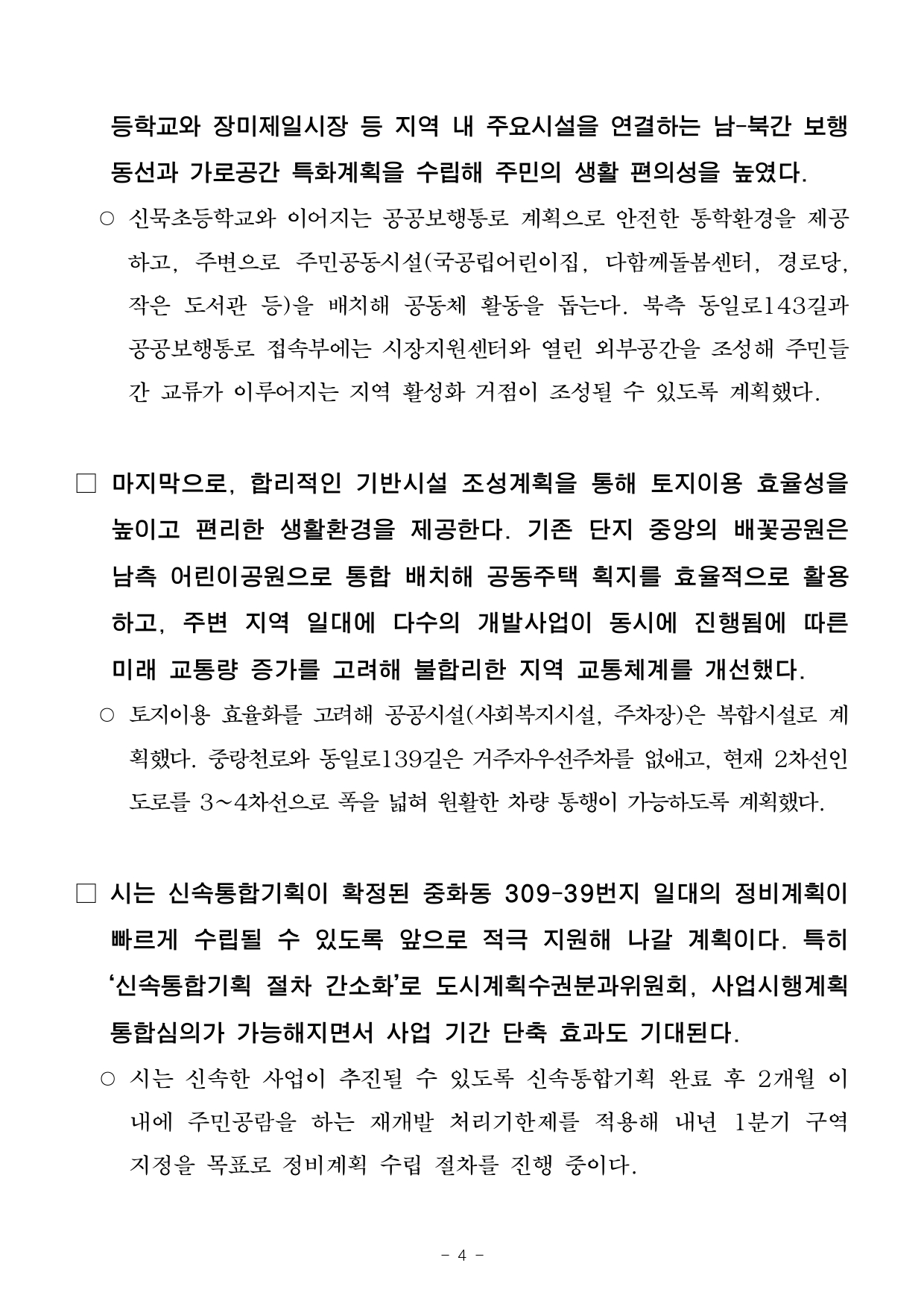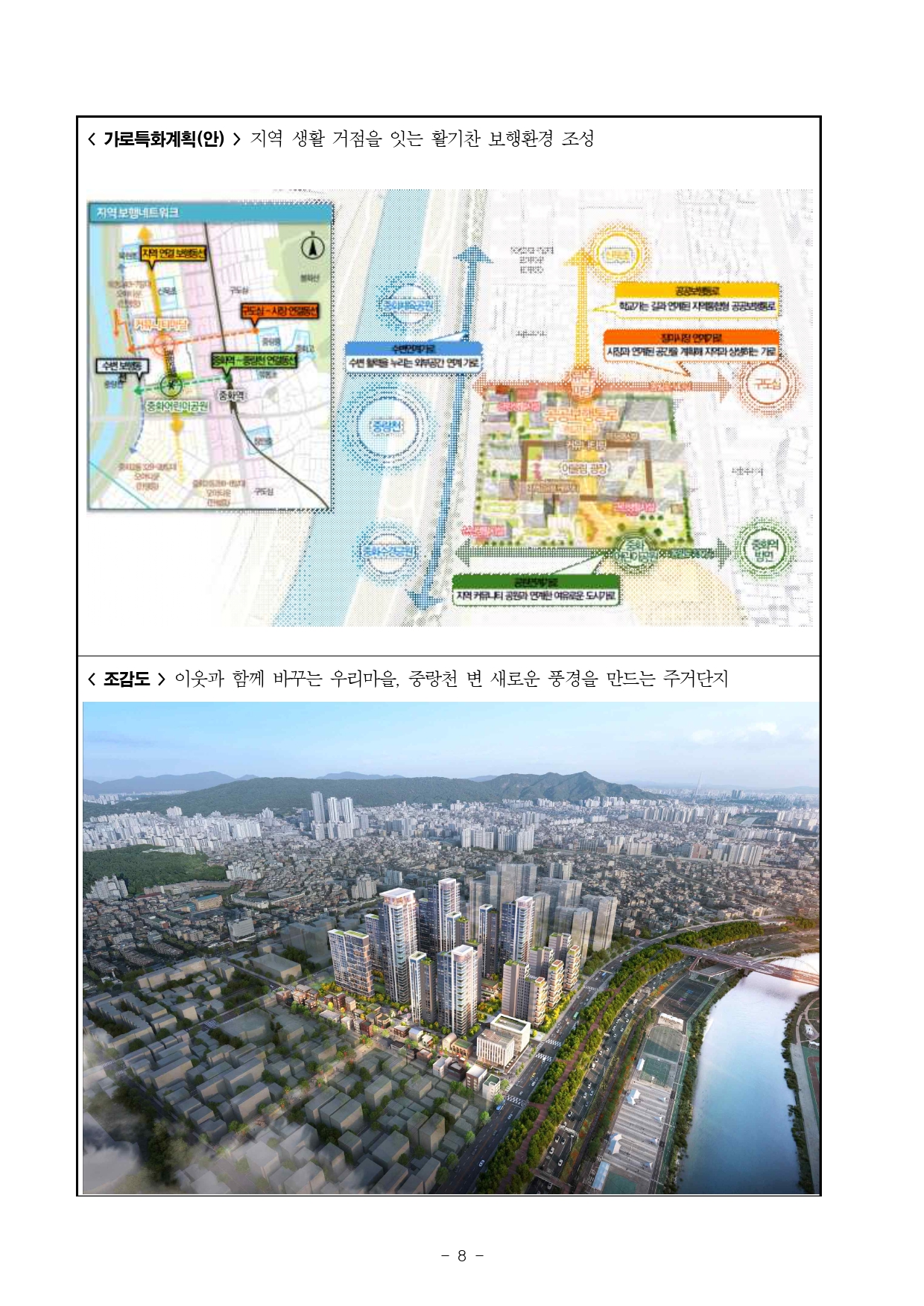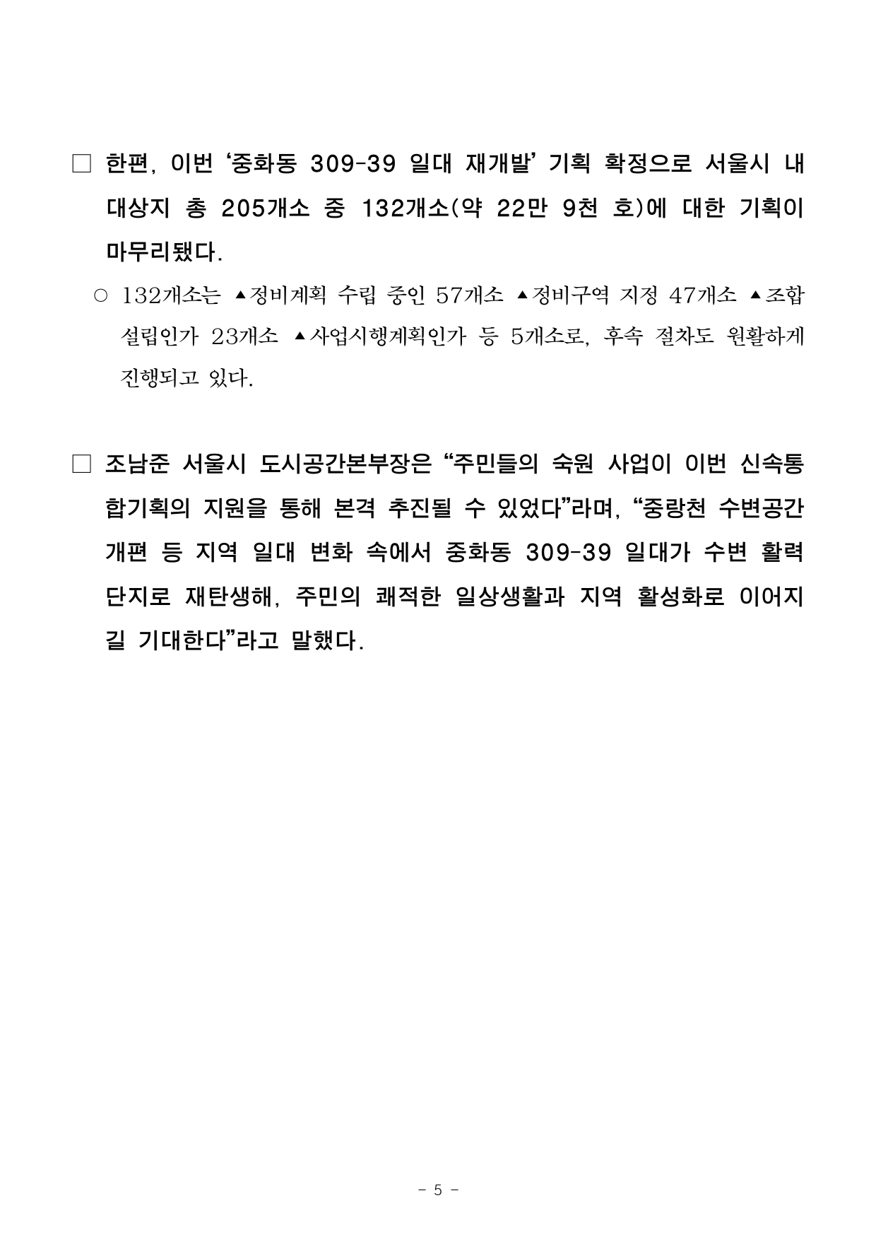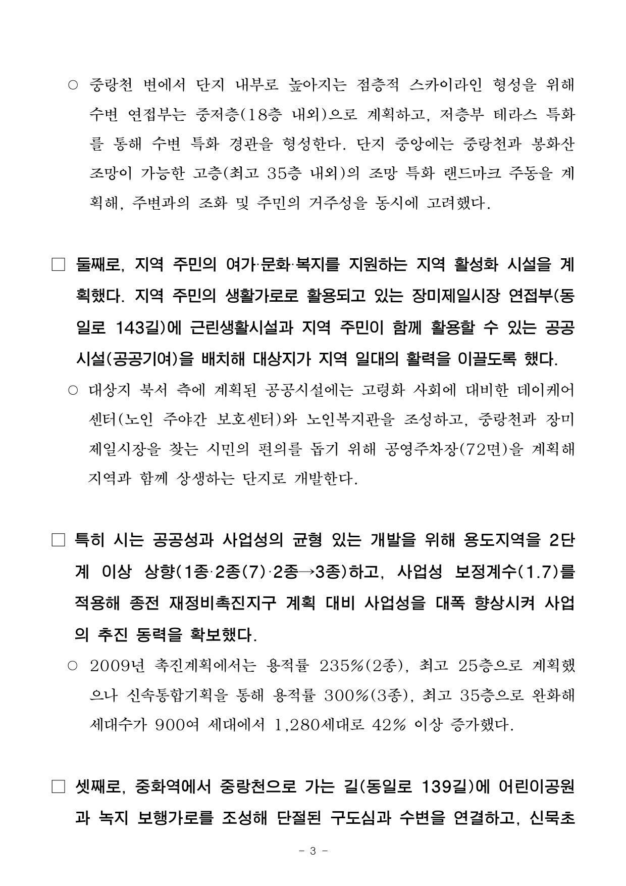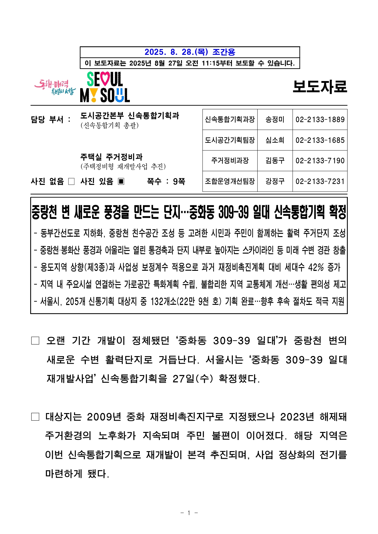 - 1 - 2025. 8. 28.(목) 조간용 이 보도자료는 2025년 8월 27일 오전 11:15부터 보도할 수 있습니다.보도자료담당 부서 : 도시공간본부 신속통합기획과 (신속통합기획 총괄) 신속통합기획과장 송정미 02-2133-1889도시공간기획팀장 심소희 02-2133-1685주택실 주거정비과 (주택정비형 재개발사업 추진) 주거정비과장 김동구 02-2133-7190사진 없음 □ 사진 있음 ▣ 쪽수 : 9쪽 조합운영개선팀장 강정구 02-2133-7231중랑천 변 새로운 풍경을 만드는 단지…중화동 309-39 일대 신속통합기획 확정- 동부간선도로 지하화, 중랑천 친수공간 조성 등 고려한 시민과 주민이 함께하는 활력 주거단지조성- 중랑천·봉화산 풍경과 어울리는 열린 통경축과 단지 내부로 높아지는 스카이라인 등 미래 수변경관창출- 용도지역 상향(제3종)과 사업성 보정계수 적용으로 과거 재정비촉진계획 대비 세대수 42%증가- 지역 내 주요시설 연결하는 가로공간 특화계획 수립, 불합리한 지역 교통체계 개선…생활편의성제고- 서울시, 205개 신통기획 대상지 중 132개소(22만 9천 호) 기획 완료…향후 후속 절차도적극지원□ 오랜 기간 개발이 정체됐던 ‘중화동 309-39 일대’가 중랑천변의새로운 수변 활력단지로 거듭난다. 서울시는 ‘중화동 309-39 일대재개발사업’ 신속통합기획을 27일(수) 확정했다. □ 대상지는 2009년 중화 재정비촉진지구로 지정됐으나 2023년해제돼주거환경의 노후화가 지속되며 주민 불편이 이어졌다. 해당지역은이번 신속통합기획으로 재개발이 본격 추진되며, 사업 정상화의전기를마련하게 됐다. - 2 - □ 대상지는 중랑천에 접해 서울장미축제가 열리는 수변공원과가까울뿐만 아니라, 중화역 등 대중교통 이용이 편리해 우수한 입지여건을 지니고 있다. □ 특히 동부간선도로 지하화, 중랑천 일대 친수공간 조성, 생태하천복원 등 향후 지역 전반에 큰 변화가 예상됨에 따라 시는 중랑천을찾는 시민과 단지 주민이 함께 활용할 수 있는 시설 배치와 보행가로정비에 중점을 뒀다. □ 이번 신속통합기획이 확정됨에 따라 대상지는 ‘중랑천 변 새로운풍경을 만드는 수변 활력 주거단지’(면적 45,566㎡, 최고 35층, 1,280세대 규모)로 거듭난다. □ 시는 중랑천, 봉화산, 장미축제 등 지역 일대가 가진 자연·문화자원을적극적으로 활용해 생활권의 중심 단지로 거듭날 수 있도록 ▴중랑천의 새로운 풍경을 만드는 수변 경관 ▴지역의 활력을 이끄는 주거단지▴주변 지역과 연계되는 보행 친화형 생활공간 ▴생활 기반시설조성을 통한 편리한 정주 환경 조성 등 4가지 계획 원칙을 담았다. □ 먼저, 중랑천 및 봉화산 자락과 조화로운 수변 특화 단지를 계획했다. 중랑천~봉화산 능선 방향으로 동-서 통경축(폭 24m)을 계획해수변으로 열린 경관 및 바람길을 만들고, 수변에서 바라보는 보행자시점에서 입체적 경관을 형성할 수 있도록 다양한 주동 높이의 중첩을통해 다채로운 수변 풍경을 연출한다. - 3 - ○ 중랑천 변에서 단지 내부로 높아지는 점층적 스카이라인 형성을위해수변 연접부는 중저층(18층 내외)으로 계획하고, 저층부 테라스특화를 통해 수변 특화 경관을 형성한다. 단지 중앙에는 중랑천과봉화산조망이 가능한 고층(최고 35층 내외)의 조망 특화 랜드마크 주동을계획해, 주변과의 조화 및 주민의 거주성을 동시에 고려했다. □ 둘째로, 지역 주민의 여가·문화·복지를 지원하는 지역 활성화 시설을계획했다. 지역 주민의 생활가로로 활용되고 있는 장미제일시장 연접부(동일로 143길)에 근린생활시설과 지역 주민이 함께 활용할 수 있는공공시설(공공기여)을 배치해 대상지가 지역 일대의 활력을 이끌도록했다. ○ 대상지 북서 측에 계획된 공공시설에는 고령화 사회에 대비한 데이케어센터(노인 주야간 보호센터)와 노인복지관을 조성하고, 중랑천과장미제일시장을 찾는 시민의 편의를 돕기 위해 공영주차장(72면)을계획해지역과 함께 상생하는 단지로 개발한다. □ 특히 시는 공공성과 사업성의 균형 있는 개발을 위해 용도지역을2단계 이상 상향(1종·2종(7)·2종→3종)하고, 사업성 보정계수(1.7)를적용해 종전 재정비촉진지구 계획 대비 사업성을 대폭 향상시켜사업의 추진 동력을 확보했다. ○ 2009년 촉진계획에서는 용적률 235%(2종), 최고 25층으로계획했으나 신속통합기획을 통해 용적률 300%(3종), 최고 35층으로완화해세대수가 900여 세대에서 1,280세대로 42% 이상 증가했다. □ 셋째로, 중화역에서 중랑천으로 가는 길(동일로 139길)에 어린이공원과 녹지 보행가로를 조성해 단절된 구도심과 수변을 연결하고, 신묵초 - 4 - 등학교와 장미제일시장 등 지역 내 주요시설을 연결하는 남-북간보행동선과 가로공간 특화계획을 수립해 주민의 생활 편의성을 높였다. ○ 신묵초등학교와 이어지는 공공보행통로 계획으로 안전한 통학환경을제공하고, 주변으로 주민공동시설(국공립어린이집, 다함께돌봄센터, 경로당, 작은 도서관 등)을 배치해 공동체 활동을 돕는다. 북측 동일로143길과공공보행통로 접속부에는 시장지원센터와 열린 외부공간을 조성해주민들간 교류가 이루어지는 지역 활성화 거점이 조성될 수 있도록 계획했다. □ 마지막으로, 합리적인 기반