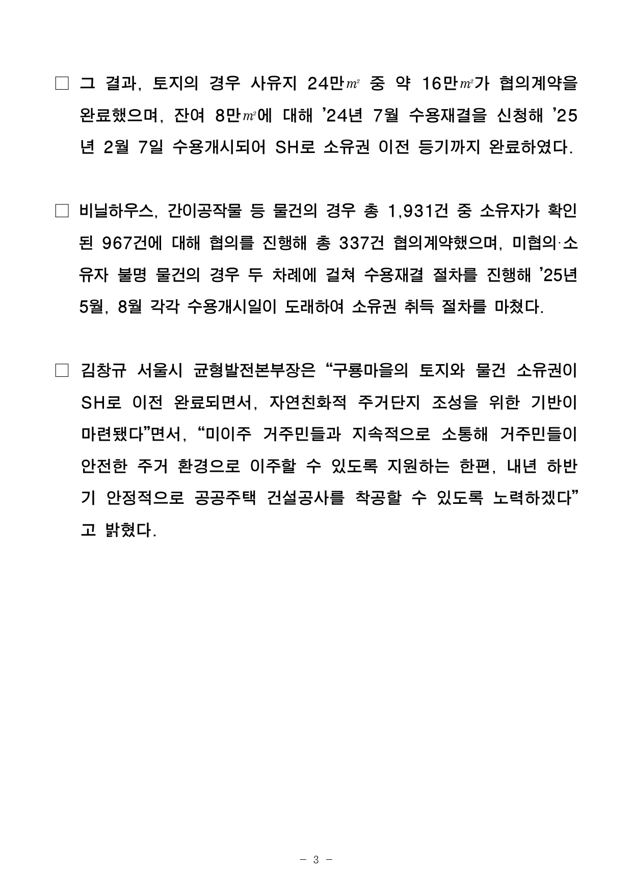 - 1 - 2025. 8. 27.(수) 석간용 이 보도자료는 2025년 8월 27일 06:00부터 보도할 수 있습니다. 보도자료담당 부서: 균형발전본부 도시정비과 도시정비과장 홍현탁 02-2133-8485 도시개발팀장 곽명희 02-2133-8494 SH공사 도시개발본부 도시계획처 (도시개발계획부) 도시계획처장 강성민 02-3410-7576 도시개발계획부장 최문석 02-3410-7587 SH공사 자산운용본부 보상처 (수탁보상부) 보상처장 조국영 02-3410-7208 수탁보상부장 배기덕 02-3410-7625 사진 없음 □ 사진 있음 ■ 쪽수: 5쪽 관련 누리집 project.seoul.go.kr 시·SH, 개포 구룡마을 토지·물건 소유권 취득 완료- ’23년 5월부터 진행된 2년여 간의 보상협의 및 수용절차 마무리- 토지 24만㎡, 비닐하우스 등 물건 1,931건에 대한 소유권 이전 완료- 시‧SH “주민들과 지속 소통하며 전세대 공존하는 자연친화 주거단지 조성할것” □ 서울 최대 규모 판자촌이자 강남 지역의 마지막 판자촌인 서울강남구 구룡마을(강남구 양재대로 478 일원)이 약 2년에 걸친 보상협의와수용절차를 마무리하고, 토지 및 비닐하우스 등 물건에 대한 소유권을서울주택도시개발공사로 이전 완료하였다고 밝혔다. ○ 구룡마을은 1970~1980년대 철거민 등이 이주하면서 형성된무허가판자촌으로, 2012년 도시개발구역으로 최초 지정되었으나 개발방식에 대한 의견차 등으로 장기간 표류하다 최근 정상궤도에 올랐다. - 2 - □ 서울시는 지난 3월 구룡마을 도시개발사업의 설계공모 당선작을발표하며, 오는 ’29년까지 해당 지역에 청년, 신혼부부, 노년층 등전세대가 공존하는 자연친화 주거단지를 조성하겠다는 계획을 발표한 바있다. □ 시는 서울주택도시개발공사(SH)에서 구룡마을 도시개발사업구역내 토지 및 물건의 소유권 취득을 완료함으로써, 화재‧홍수 등안전사고에 노출돼 있는 구룡마을을 주거와 녹지가 어우러진 양질의주거환경으로 탈바꿈시킬 수 있는 기반을 마련했다고 설명했다. □ SH는 지난 ’23년 5월 보상계획 공고를 시작으로 3차례에 걸친보상협의회와 감정평가를 거쳐 협의 계약을 진행했다. 협의가 성립되지않은 토지와 물건에 대해서는 토지보상법에 따라 수용재결절차를진행하였다. 보상공고 ‣ 보상협의회(3회) ‣ 토지·물건 감정평가 ‣ 보상 협의계약 ‣ 수용재결(공탁) ’23. 5. ’23. 9. ~ 10. ’23. 11. ~ 2. ’24. 5.~ 6. ’24. 7. ~ ’25. 8. ○ 수용재결 절차란 사업시행자가 공익사업의 수행을 위해 토지 등을취득하고자 토지, 물건 소유자 등과 먼저 협의 계약을 진행하고, 협의가성립되지 않으면 지방토지수용위원회를 통해 토지, 물건 등을취득할수 있는 법적 절차다. ○ 수용재결 신청이 접수되면 서울시 지방토지수용위원회에서 수용재결보상금을 최종 결정하고, 토지 및 물건 소유주들은 재결 보상금을신청해 받게 된다. 보상금을 신청하지 않은 소유주의 보상금은 SH가서울중앙지방법원에 공탁한다. 이러한 모든 절차가 완료되어야토지와물건의 소유권을 취득할 수 있다. - 3 - □ 그 결과, 토지의 경우 사유지 24만㎡ 중 약 16만㎡가 협의계약을완료했으며, 잔여 8만㎡에 대해 ’24년 7월 수용재결을 신청해’25년 2월 7일 수용개시되어 SH로 소유권 이전 등기까지 완료하였다. □ 비닐하우스, 간이공작물 등 물건의 경우 총 1,931건 중 소유자가확인된 967건에 대해 협의를 진행해 총 337건 협의계약했으며, 미협의·소유자 불명 물건의 경우 두 차례에 걸쳐 수용재결 절차를 진행해’25년5월, 8월 각각 수용개시일이 도래하여 소유권 취득 절차를 마쳤다. □ 김창규 서울시 균형발전본부장은 “구룡마을의 토지와 물건 소유권이SH로 이전 완료되면서, 자연친화적 주거단지 조성을 위한기반이마련됐다”면서, “미이주 거주민들과 지속적으로 소통해 거주민들이안전한 주거 환경으로 이주할 수 있도록 지원하는 한편, 내년하반기 안정적으로 공공주택 건설공사를 착공할 수 있도록 노력하겠다” 고 밝혔다. - 4 - 붙임1 사업개요 사업개요(서고시 제2024-354호, 24.7.기준) ㅇ 위 치 : 강남구 양재대로 478 일원 ㅇ 면 적 : 약 267,466.4㎡ ㅇ 시 행 자 : 서울주택도시개발공사(SH) ㅇ 사업기간 : ’16. 12. ~ ’27. 12.(변동예정) ㅇ 개발계획 : 공동주택, 공공복합시설, 초등학교, 공원 등 주요 추진경위 ㅇ ’16.12.08. : 구역지정 및 개발계획 수립(시고시 제2016-397호) ㅇ ’17.01.~ : 보상 및 이주협의 착수 ㅇ ’20.06.11. : 개발계획 변경 및 실시계획인가 고시(시고시 제2020-238호) ㅇ ’23.05.01. : 보상계획 공고 ㅇ ’23.11.30. : 이주대책 공고 ㅇ ’24.07.18. : 개발계획 변경 고시(시고시 제2024-354호) - 공동주택용지 용도지역상향(2종→3종) 및 세대수 증가(2,838세대→3,520세대) ㅇ ’24.12.31. : 설계공모 공고(SH) ㅇ ’25.03.31. : 설계공모 당선작 발표 ㅇ 현재 : 설계공모 당선작 반영 개발·실시계획 변경절차 진행 중 향후계획 ㅇ 도시계획위원회 심의 / 개발·실시계획 (변경)고시 : ’25.11. / 12. ㅇ 주택건설공사 착공 : ’26. 하반기 ㅇ 준공 : ’29. - 5 - 붙임2 조감도