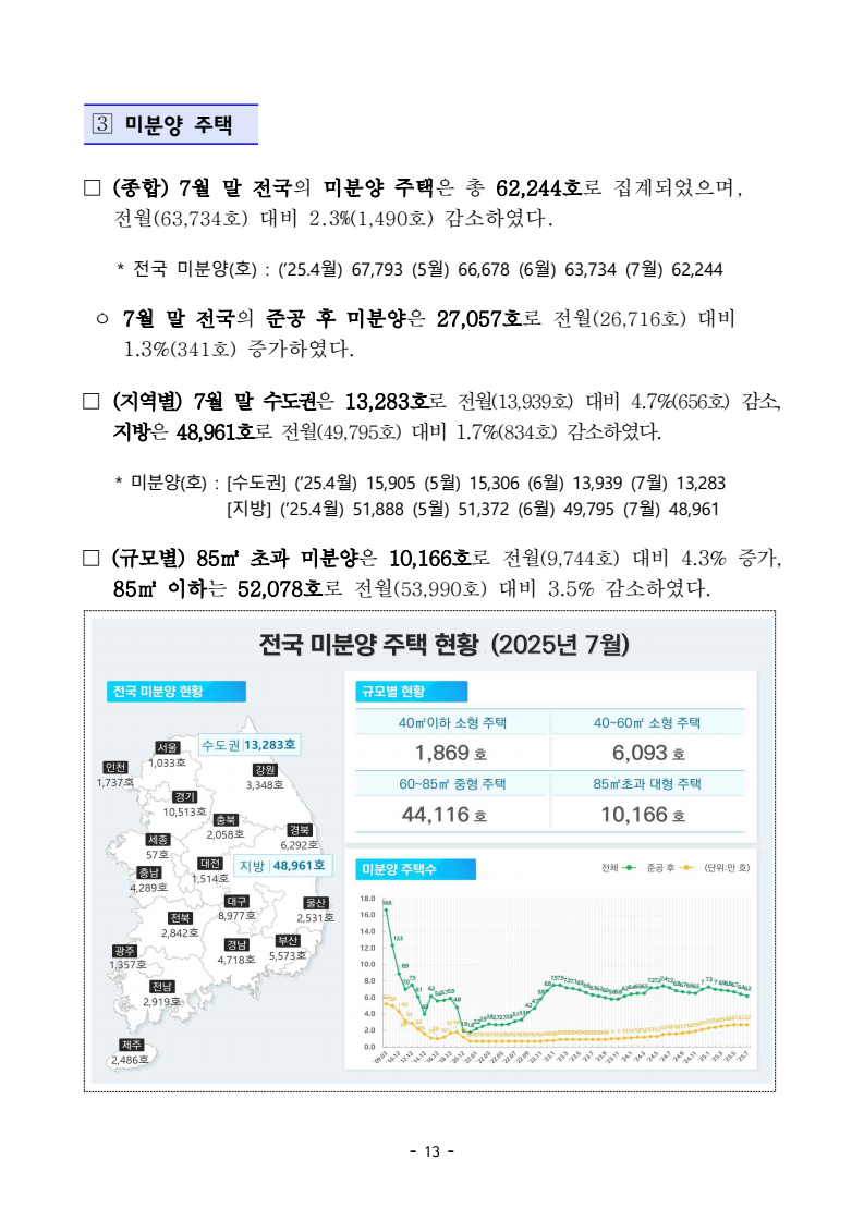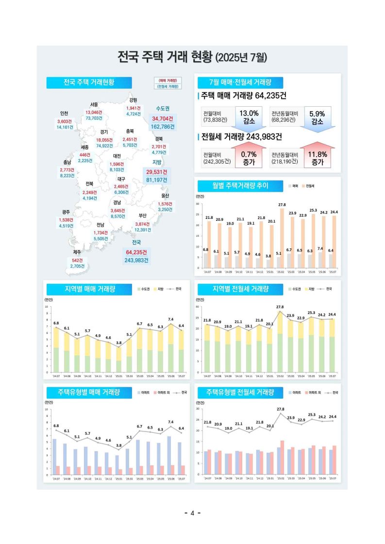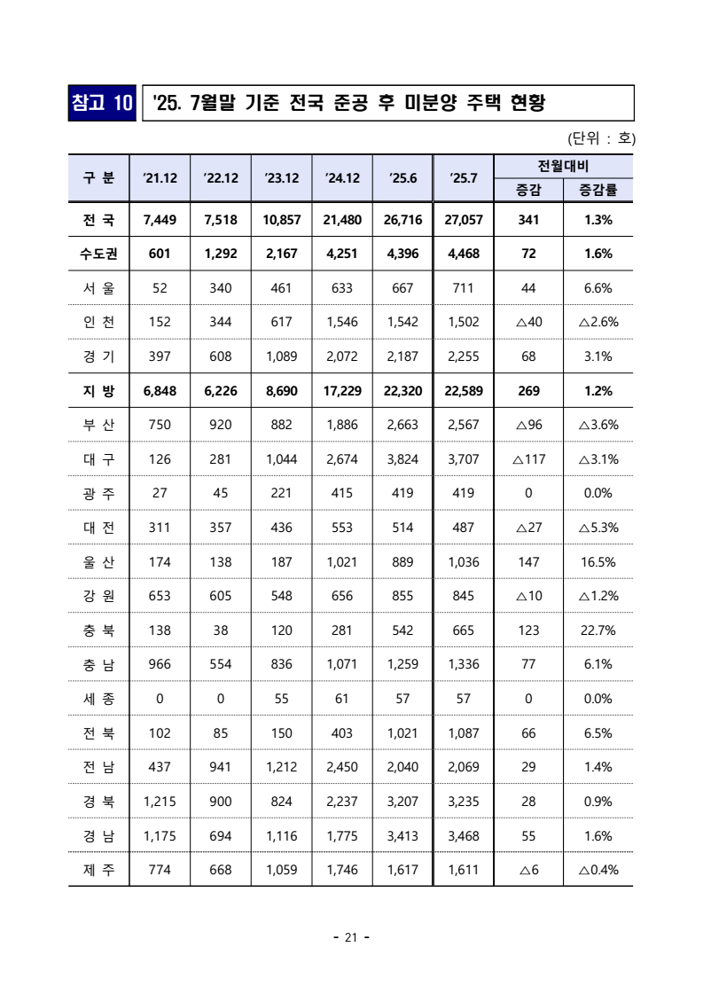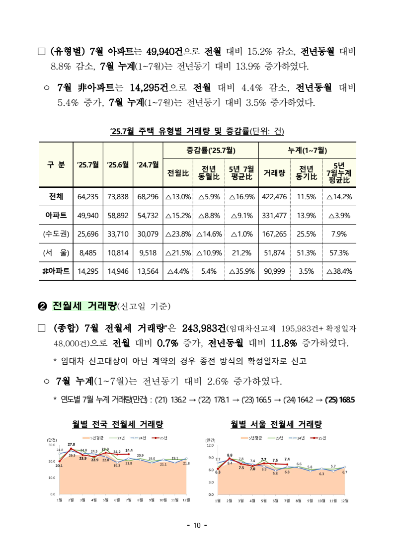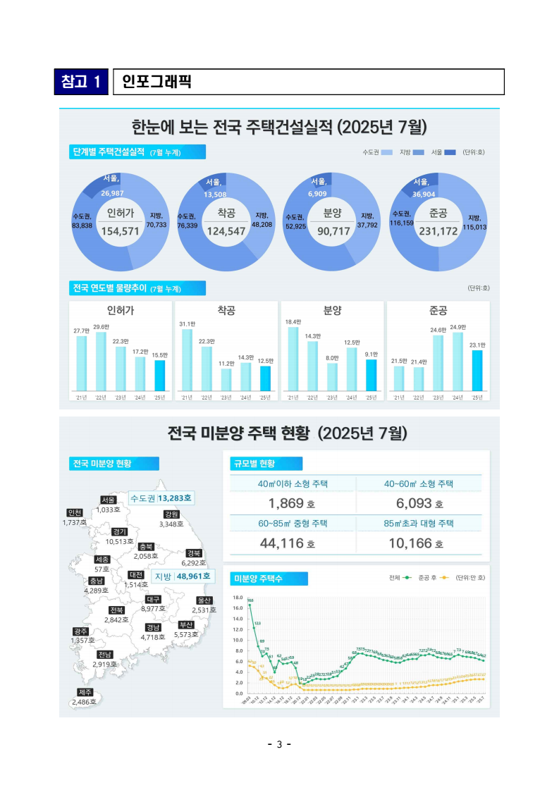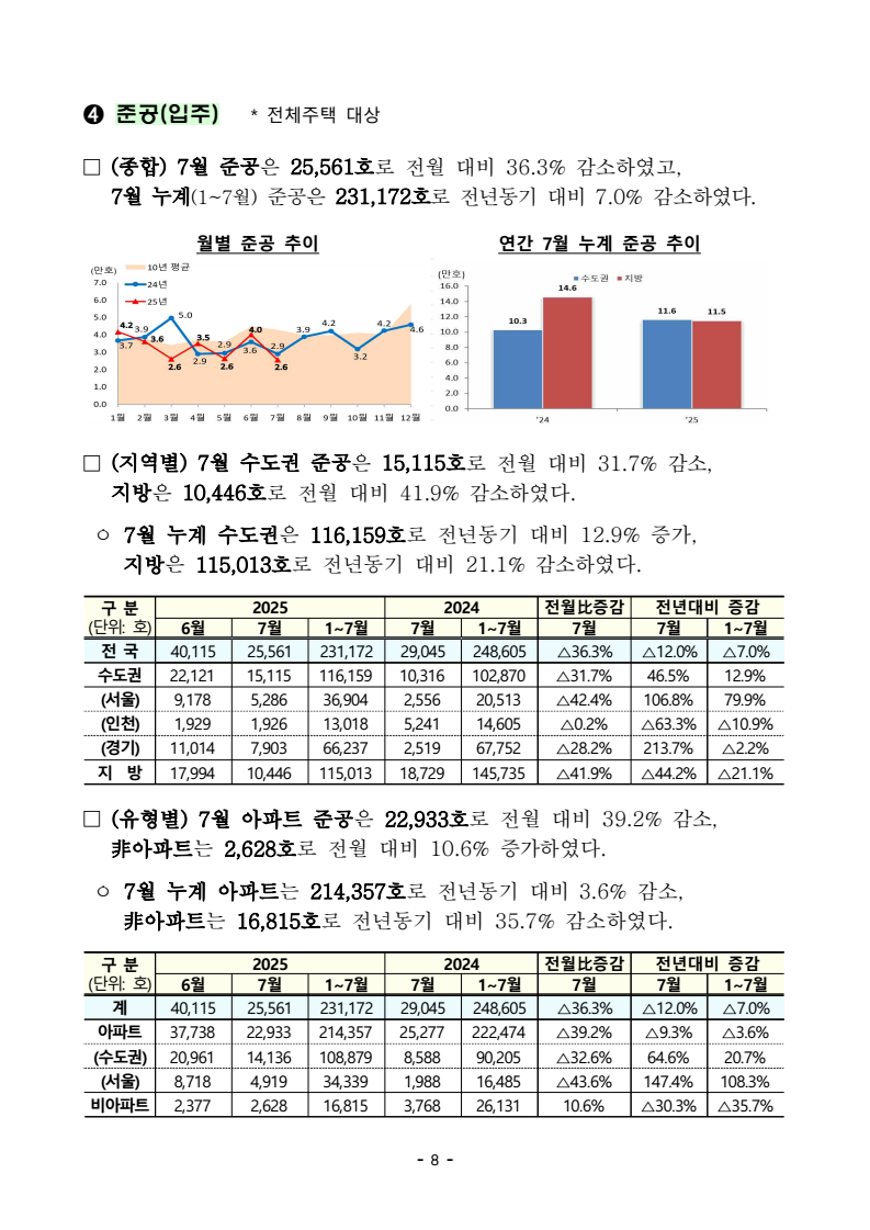 - 1 - 보도자료 보도시점 : 2025.8.29(금) 06:00 이후(8.29.(금) 석간) / 배포 : 2025.8.28.(목) ‘25년 7월 주택통계 □ 국토교통부는 ’25년 7월 기준 주택 통계를 공표하였다. ➊ (건설) ’25년 7월 주택 인허가, 착공, 분양, 준공 실적은 아래와 같다. ㅇ (인허가) 7월 수도권 인허가는 9,879호로 전년동월(9,206호) 대비 7.3% 증가, 7월 누적 실적은 83,838호로 전년동기(69,467호) 대비 20.7% 증가하였다. - 서울 지역 7월 인허가는 4,089호로 전년동월(3,375호) 대비 21.2% 증가, 7월 누적 실적은 26,987호로 전년동기(16,549호) 대비 63.1% 증가하였다. - 비수도권 7월 인허가는 6,236호로 전년동월(12,611호) 대비 50.6% 감소, 7월 누적 실적은 70,733호로 전년동기(102,210호) 대비 30.8% 감소하였다. ㅇ (착공) 7월 수도권 착공은 10,708호로 전년동월(7,888호) 대비 35.8% 증가, 7월 누적 실적은 76,339호로 전년동기(79,336호) 대비 3.8% 감소하였다. - 서울 지역 7월 착공은 642호로 전년동월(1,885호) 대비 65.9% 감소, 7월 누적 실적은 13,508호로 전년동기(15,056호) 대비 10.3% 감소하였다. - 비수도권 7월 착공은 10,692호로 전년동월(8,136호) 대비 31.4% 증가, 7월 누적 실적은 48,208호로 전년동기(63,937호) 대비 24.6% 감소하였다. ㅇ (분양) 7월 수도권 분양은 11,939호로 전년동월(6,973호) 대비 71.2% 증가, 7월 누적 실적은 52,925호로 전년동기(57,173호) 대비 7.4% 감소하였다. - 서울 지역 7월 분양은 351호로 전년동월(2,956호) 대비 88.1% 감소, 7월 누적 실적은 6,909호로 전년동기(11,187호) 대비 38.2% 감소하였다. 주택건설실적통계, 미분양주택현황보고, 부동산거래현황 - 2 - - 비수도권 7월 분양은 10,813호로 전년동월(6,008호) 대비 80.0% 증가, 7월 누적 실적은 37,792호로 전년동기(68,303호) 대비 44.7% 감소하였다. ㅇ (준공) 7월 수도권 준공은 15,115호로 전년동월(10,316호) 대비 46.5% 증가, 7월 누적 실적은 116,159호로 전년동기(102,870호) 대비 12.9% 증가하였다. - 서울 지역 7월 준공은 5,286호로 전년동월(2,556호) 대비 106.8% 증가, 7월 누적 실적은 36,904호로 전년동기(20,513호) 대비 79.9% 증가하였다. - 비수도권 7월 준공은 10,446호로 전년동월(18,729호) 대비 44.2% 감소, 7월 누적 실적은 115,013호로 전년동기(145,735호) 대비 21.1% 감소하였다. ➋ (미분양) 7월 말 미분양 주택은 62,244호로 전월(63,734호) 대비 2.3% 감소, 그중 준공후 미분양은 27,057호로 전월(26,716호) 대비 1.3% 증가하였다. * 미분양 주택: 수도권 13,283호(준공후 4,468호), 비수도권 48,961호(준공후 22,589호) ➌ (거래량) 7월 주택 매매거래는 64,235건으로 전월(73,838건) 대비 13.0% 감소, 전월세 거래는 243,983건으로 전월(242,305건) 대비 0.7% 증가하였다. ㅇ (매매) 수도권 매매거래는 34,704건으로 전월(42,967건) 대비 19.2% 감소, 비수도권은 29,531건으로 전월(30,871건) 대비 4.3% 감소하였다. - 서울 아파트 매매는 8,485건으로 전월(10,814건) 대비 21.5% 감소하였다. ㅇ (전월세) 수도권 전월세 거래는 162,786건으로 전월(163,503건) 대비 0.4% 감소, 비수도권은 81,197건으로 전월(78,802건) 대비 3.0% 증가하였다담당 부서 주택정책관 책임자 과 장 이유리 (044-201-3317) < 총괄 > 주택정책과 담당자 사무관 서지훈 (044-201-3325) <전월세> 주택정책관 책임자 팀 장 양찬윤 (044-201-4389) 주택임대차기획팀 담당자 사무관 김현정 (044-201-4177) 한국 부동산원 부동산분석처 책임자 처 장 선상욱 (053-663-8190) 담당자 부 장 김영혁 (053-663-8717) 담당자 부 장 장정완 (053-663-8521) - 3 - 참고 1 인포그래픽 - 4 - - 5 - 참고 2 '25년 7월 주택 통계 주요 현황 주택 건설 ➊ 인허가 * 전체주택 대상 □ (종합) 7월 주택 인허가는 16,115호로 전월 대비 42.5% 감소하였고, 7월 누계(1~7월) 인허가는 154,571호로 전년동기 대비 10.0% 감소하였다. 월별 인허가 추이 연간 7월 누계 인허가 추이 □ (지역별) 7월 수도권 주택 인허가는 9,879호로 전월 대비 28.4% 감소, 지방은 6,236호로 전월 대비 56.2% 감소하였다. ㅇ 7월 누계 수도권은 83,838호로 전년동기 대비 20.7% 증가, 지방은 70,733호로 전년동기 대비 30.8% 감소하였다. 구 분 (단위: 호) 2025 2024 전월比증감 전년대비 증감6월 7월 1∼7월 7월 1∼7월 7월 7월 1∼7월전 국 28,018 16,115 154,571 21,817 171,677 △42.5% △26.1% △10.0%수도권 13,792 9,879 83,838 9,206 69,467 △28.4% 7.3% 20.7% (서울) 3,569 4,089 26,987 3,375 16,549 14.6% 21.2% 63.1% (인천) 605 989 10,626 286 6,582 63.5% 245.8% 61.4% (경기) 9,618 4,801 46,225 5,545 46,336 △50.1% △13.4% △0.2% 지 방 14,226 6,236 70,733 12,611 102,210 △56.2% △50.6% △30.8%□ (유형별) 7월 아파트 인허가는 13,146호로 전월 대비 48.0% 감소, 非아파트는 2,969호로 전월 대비 8.9% 증가하였다. ㅇ 7월 누계 아파트는 135,450호로 전년동기 대비 9.8% 감소, 非아파트는 19,121호로 전년동기 대비 10.8% 감소하였다. 구 분 (단위: 호) 2025 2024 전월比증감 전년대비 증감6월 7월 1∼7월 7월 1∼7월 7월 7월 1∼7월계 28,018 16,115 154,571 21,817 171,677 △42.5% △26.1% △10.0%아파트 25,292 13,146 135,450 18,710 150,238 △48.0% △29.7% △9.8%(수도권) 12,725 8,567 75,378 8,158 61,577 △32.7% 5.0% 22.4% (서울) 3,127 3,500 23,852 3,140 14,791 11.9% 11.5% 61.3% 비아파트 2,726 2,969 19,121 3,107 21,439 8.9% △4.4% △10.8% - 6 - ➋ 착공 * 전체주택 대상 □ (종합) 7월 주택 착공은 21,400호로 전월 대비 25.9% 감소하였고, 7월 누계(1~7월) 착공은 124,547