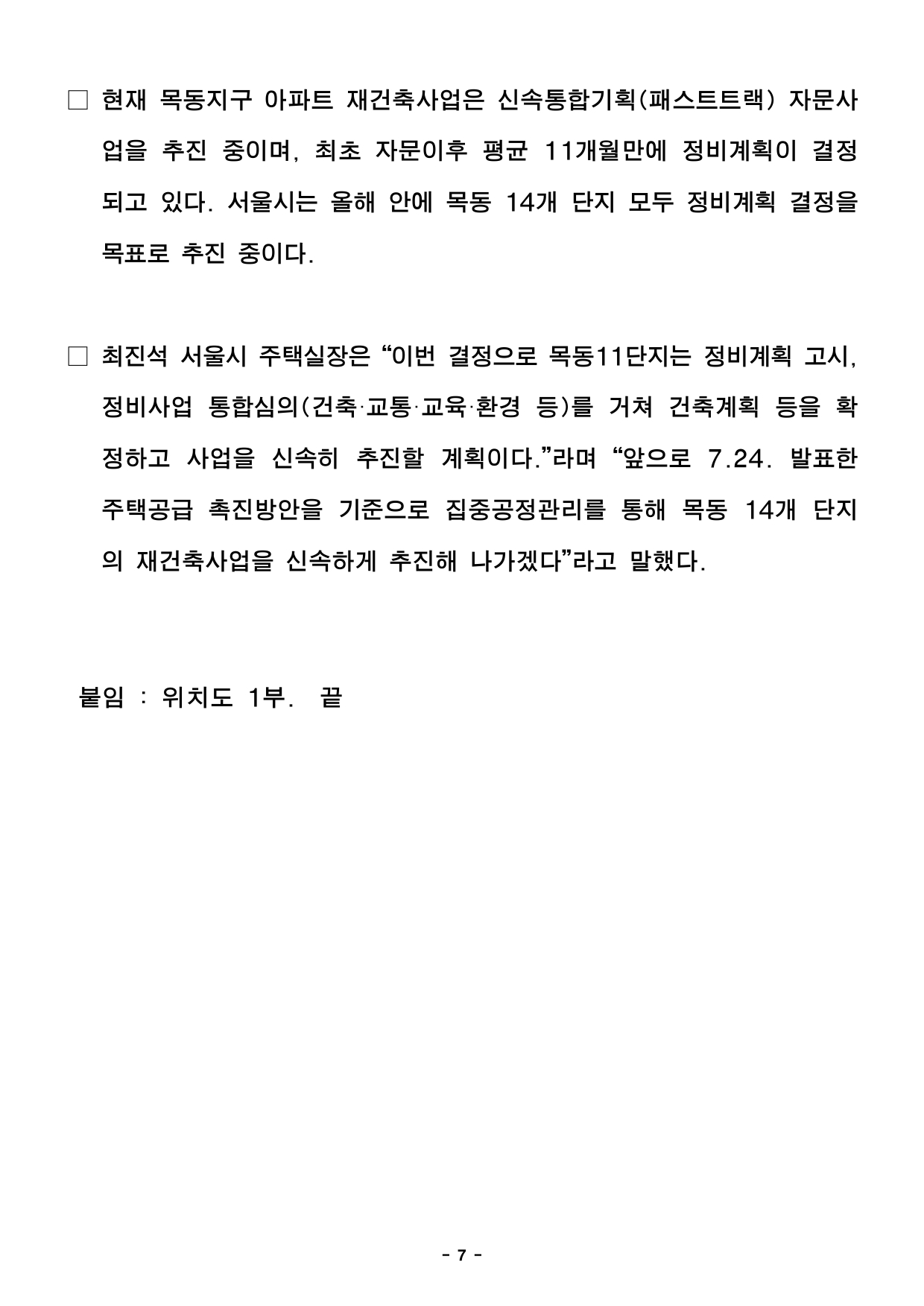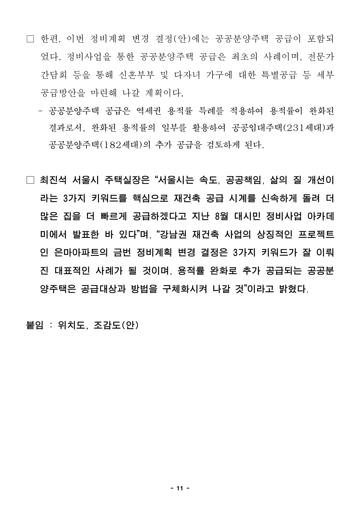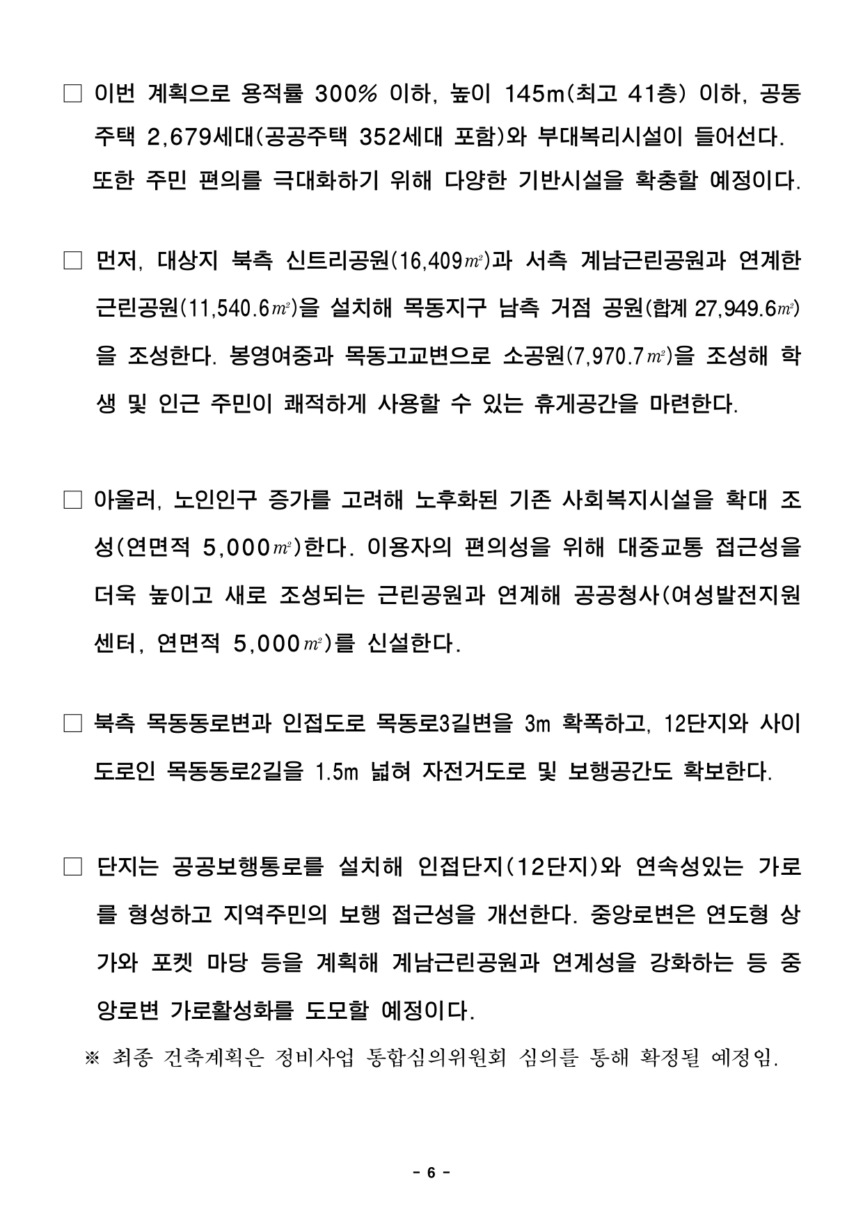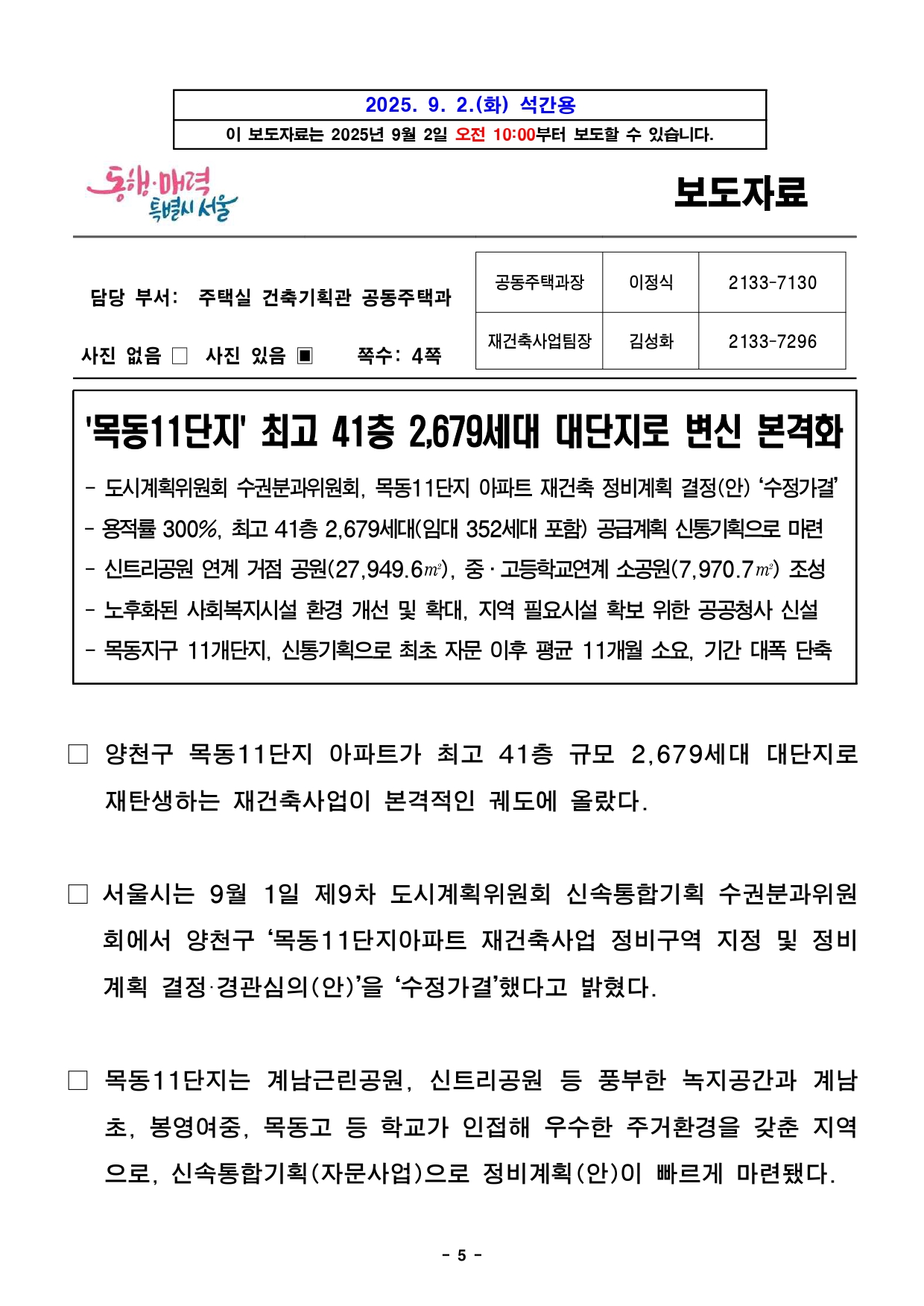 - 1 - 2025. 9. 2.(화) 석간용 이 보도 자료는 2025년 9월 2일 오전 10:00부터 보도할 수 있습니다. 보도자료담당 부서: 도시공간본부 도시계획과 도시계획과장 이광구 02-2133-8305 도시계획혁신 팀장 서준원 02-2133-8326 사진 없음 ▣ 사진 있음 □ 쪽수: 2쪽 도시공간포털 (도시계획위원회) http://urban.seoul.go.kr/ 상단<알림마당> → 위원회 2025년 제 9차 서 울 특 별 시 도 시 계 획 위 원 회 신 속 통 합 기 획 수 권 분 과 위 원 회 개 최 결 과□ 금일 처리 안건 : 총 2건 ○ 수정가결 : 2건 ※ 자문, 보류, 보고 안건은 보도자료를 제공하지 않습니다. ※ 안건에 대한 자세한 내용은 소관부서에 문의하여 주시기 바랍니다. 붙임 : 심의결과 1부 - 2 - 제9차 신속통합기획 수권분과위원회 상정안건 【 2025. 9. 1 (월) 】 ▣ 총 2건 (신규 2건) 연번 안건명 개 요 심의결과 비고1 <공동주택과> 서울목동지구 택지개발사업 지구단위계획구역 내 특별계획구역11 세부개발계획 수립(안), 목동11단지아파트 재건축사업 정비구역 지정 및 정비계획 결정, 경관심의(안) ○ 위 치 : 양천구 신정동 325번지 일대 (128,668.4㎡) ○ 내 용 : 목동11단지 아파트 정비계획(안) 및 정비기반 시설의 적정성 검토 등 수 정 가 결 <신규상정> 재건축사업팀팀장 : 김성화담당 : 정훈희(2133-7286) 2 <공동주택과> 은마아파트 재건축사업 정비계획 결정(변경) 및 지구단위계획 결정(변경)경관심의(안) ○ 위 치 : 강남구 대치동 316 일원(243,552.6㎡) ○ 내 용 : 은마아파트 재건축 정비사업 정비계획 수립(변경) 등 수 정 가 결 <신규상정> 재건축계획팀팀장 : 임동수담당 : 김한주(2133-7139) - 3 - 2025. 9. 2.(화) 석간용 이 보도 자료는 2025년 9월 2일 오전 10:00부터 보도할 수 있습니다. 보도 자료담당 부서: 도시공간본부 도시계획과 도시계획과장 이광구 02-2133-8305 도시계획혁신 팀장 서준원 02-2133-8326 사진 없음 ▣ 사진 있음 □ 쪽수: 2쪽 도시공간포털 (도시계획위원회) http://urban.seoul.go.kr/ 상단<알림마당> → 위원회 2025년 제 2차 서 울 특 별 시 도 시 계 획 위 원 회 수 권 소 위 원 회 개 최 결 과□ 금일 처리 안건 : 총 1건 ○ 수정가결 : 1건 ※ 자문, 보류, 보고 안건은 보도자료를 제공하지 않습니다. ※ 안건에 대한 자세한 내용은 소관부서에 문의하여 주시기 바랍니다. 붙임 : 심의결과 1부 - 4 - 제2차 도시계획위원회 수권소위원회 상정안건 【 2025. 9. 1 (월) 】 ▣ 총 1건 (재상정 1건) 연번 안건명 개 요 심의결과 비고1 <공공주택과> 효창공원앞역세권 장기전세주택 도시정비형 재개발사업 정비구역 지정 및 계획결정(안) ○ 위 치 : 용산구 효창동 5-307 일원(10,402.7㎡) ○ 내 용 : 효창공원앞역세권 장기전세주택 도시정비형 재개발사업 정비구역 지정 및 계획결정(안) ※ 2025년 12차 도시계획위원회 심의 결과(보류)에 따른 수권분과위원회 상정 수 정 가 결 <재상정> 역세권주택팀팀장 : 이현철담당 : 손동근(2133-7060) - 5 - 2025. 9. 2.(화) 석간용 이 보도자료는 2025년 9월 2일 오전 10:00부터 보도할 수 있습니다. 보도자료 담당 부서: 주택실 건축기획관 공동주택과 공동주택과장 이정식 2133-7130 재건축사업팀장 김성화 2133-7296 사진 없음 □ 사진 있음 ▣ 쪽수: 4쪽 '목동11단지' 최고 41층 2,679세대 대단지로 변신 본격화- 도시계획위원회 수권분과위원회, 목동11단지 아파트 재건축 정비계획 결정(안) ‘수정가결’ - 용적률 300%, 최고 41층 2,679세대(임대 352세대 포함) 공급계획 신통기획으로마련- 신트리공원 연계 거점 공원(27,949.6㎡), 중․고등학교연계 소공원(7,970.7㎡) 조성- 노후화된 사회복지시설 환경 개선 및 확대, 지역 필요시설 확보 위한 공공청사신설- 목동지구 11개단지, 신통기획으로 최초 자문 이후 평균 11개월 소요, 기간 대폭단축□ 양천구 목동11단지 아파트가 최고 41층 규모 2,679세대 대단지로재탄생하는 재건축사업이 본격적인 궤도에 올랐다. □ 서울시는 9월 1일 제9차 도시계획위원회 신속통합기획 수권분과위원회에서 양천구 ‘목동11단지아파트 재건축사업 정비구역 지정및정비계획 결정·경관심의(안)’을 ‘수정가결’했다고 밝혔다. □ 목동11단지는 계남근린공원, 신트리공원 등 풍부한 녹지공간과계남초, 봉영여중, 목동고 등 학교가 인접해 우수한 주거환경을 갖춘지역으로, 신속통합기획(자문사업)으로 정비계획(안)이 빠르게 마련됐다. - 6 - □ 이번 계획으로 용적률 300% 이하, 높이 145m(최고 41층) 이하, 공동주택 2,679세대(공공주택 352세대 포함)와 부대복리시설이 들어선다. 또한 주민 편의를 극대화하기 위해 다양한 기반시설을 확충할 예정이다.□ 먼저, 대상지 북측 신트리공원(16,409㎡)과 서측 계남근린공원과연계한근린공원(11,540.6㎡)을 설치해 목동지구 남측 거점 공원(합계 27,949.6㎡)을 조성한다. 봉영여중과 목동고교변으로 소공원(7,970.7㎡)을 조성해학생 및 인근 주민이 쾌적하게 사용할 수 있는 휴게공간을 마련한다. □ 아울러, 노인인구 증가를 고려해 노후화된 기존 사회복지시설을확대조성(연면적 5,000㎡)한다. 이용자의 편의성을 위해 대중교통접근성을더욱 높이고 새로 조성되는 근린공원과 연계해 공공청사(여성발전지원센터, 연면적 5,000㎡)를 신설한다. □ 북측 목동동로변과 
