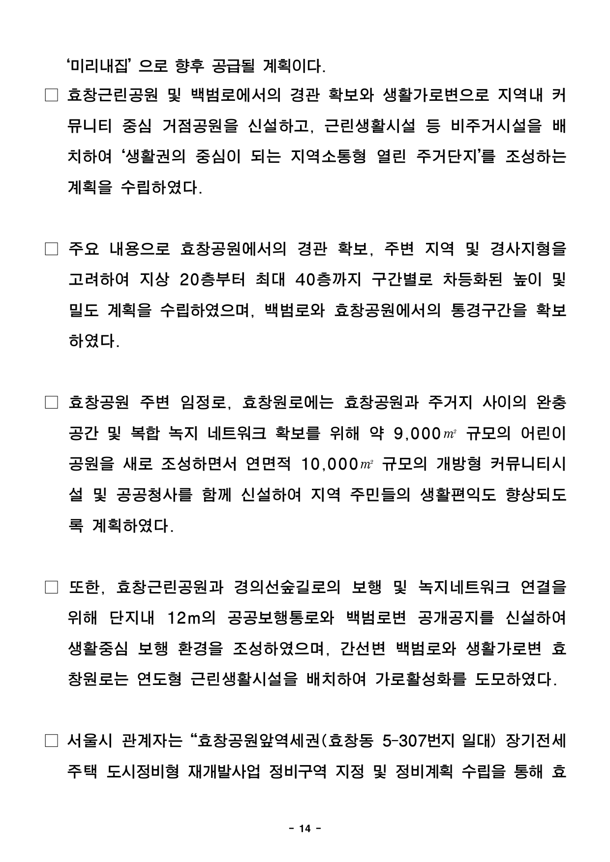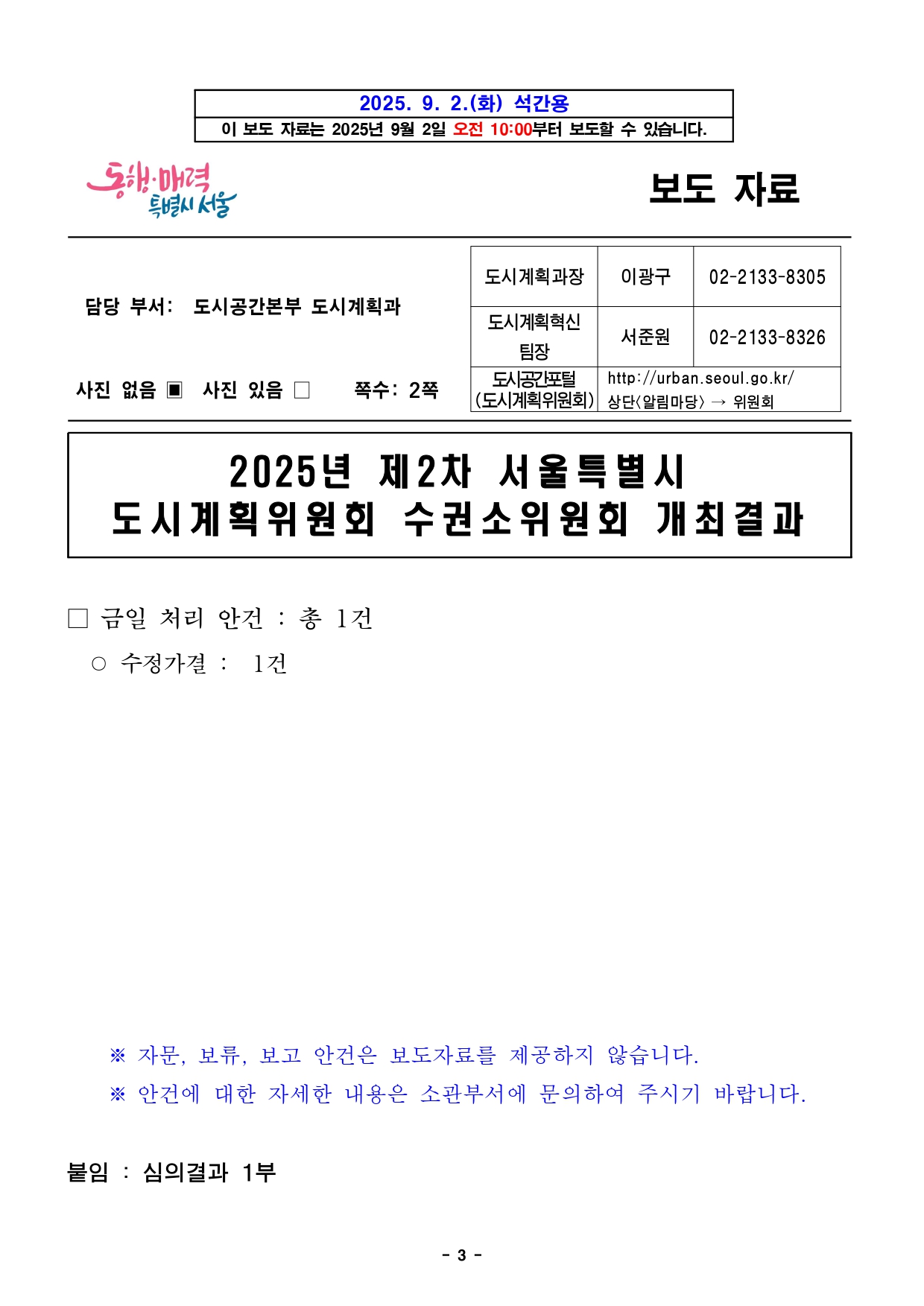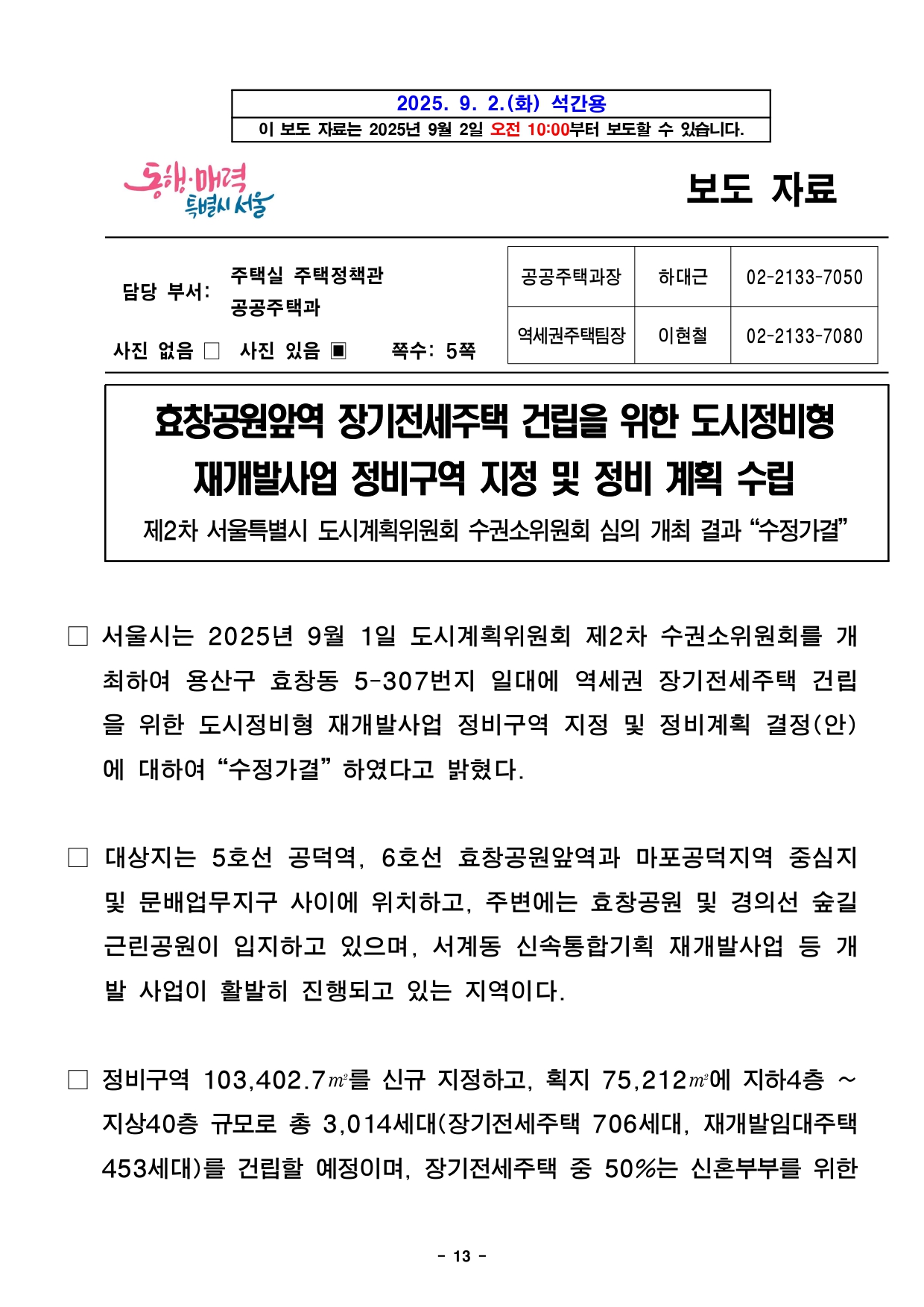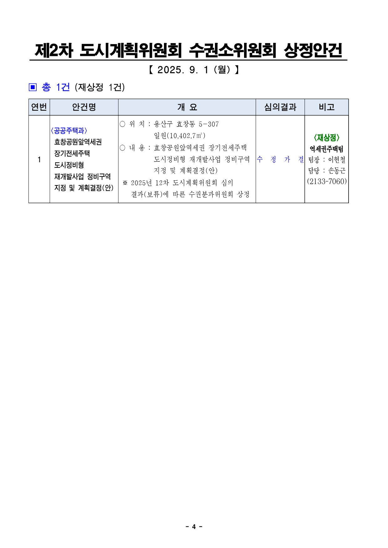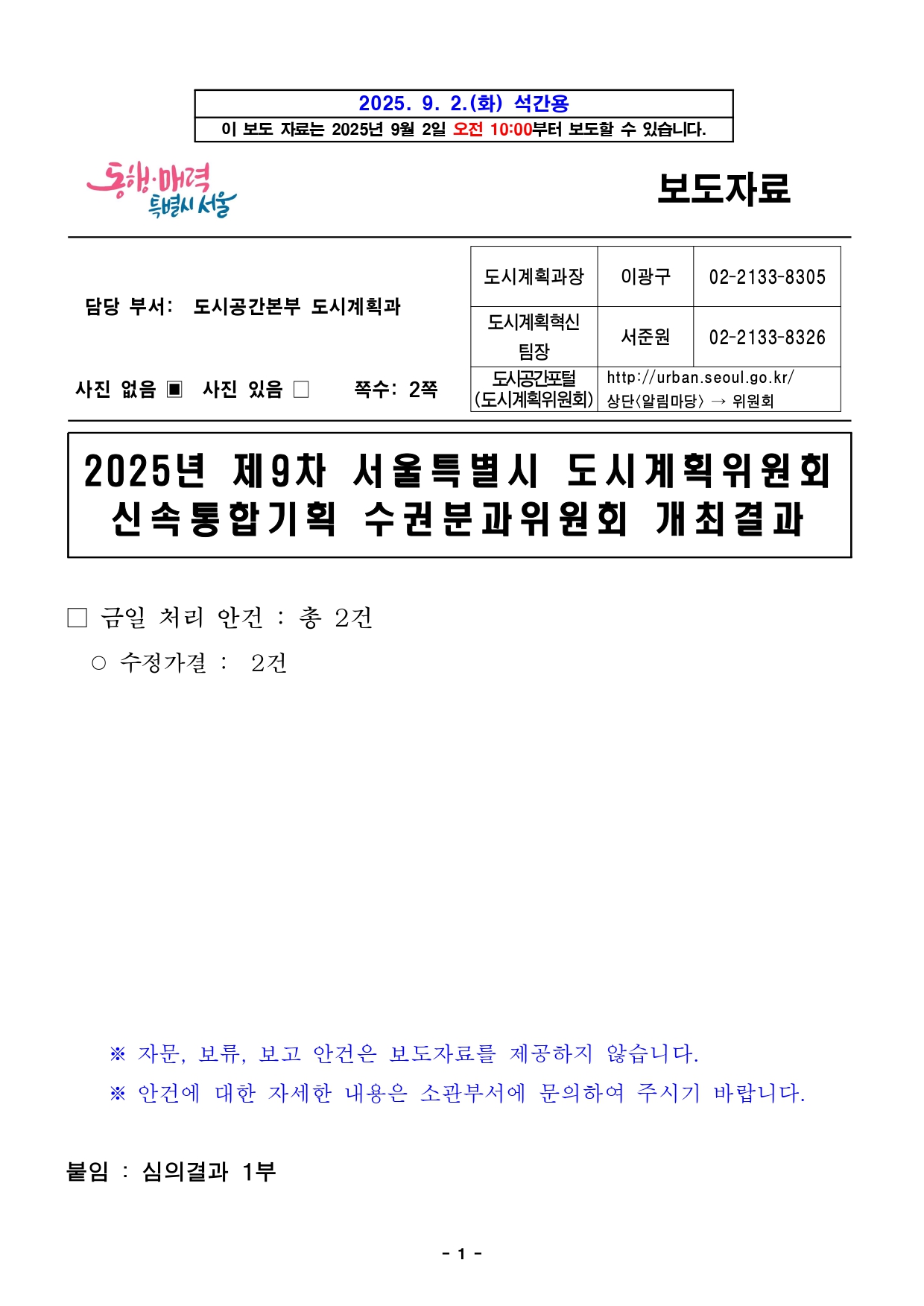 - 1 - 2025. 9. 2.(화) 석간용 이 보도 자료는 2025년 9월 2일 오전 10:00부터 보도할 수 있습니다. 보도자료담당 부서: 도시공간본부 도시계획과 도시계획과장 이광구 02-2133-8305 도시계획혁신 팀장 서준원 02-2133-8326 사진 없음 ▣ 사진 있음 □ 쪽수: 2쪽 도시공간포털 (도시계획위원회) http://urban.seoul.go.kr/ 상단<알림마당> → 위원회 2025년 제 9차 서 울 특 별 시 도 시 계 획 위 원 회 신 속 통 합 기 획 수 권 분 과 위 원 회 개 최 결 과□ 금일 처리 안건 : 총 2건 ○ 수정가결 : 2건 ※ 자문, 보류, 보고 안건은 보도자료를 제공하지 않습니다. ※ 안건에 대한 자세한 내용은 소관부서에 문의하여 주시기 바랍니다. 붙임 : 심의결과 1부 - 2 - 제9차 신속통합기획 수권분과위원회 상정안건 【 2025. 9. 1 (월) 】 ▣ 총 2건 (신규 2건) 연번 안건명 개 요 심의결과 비고1 <공동주택과> 서울목동지구 택지개발사업 지구단위계획구역 내 특별계획구역11 세부개발계획 수립(안), 목동11단지아파트 재건축사업 정비구역 지정 및 정비계획 결정, 경관심의(안) ○ 위 치 : 양천구 신정동 325번지 일대 (128,668.4㎡) ○ 내 용 : 목동11단지 아파트 정비계획(안) 및 정비기반 시설의 적정성 검토 등 수 정 가 결 <신규상정> 재건축사업팀팀장 : 김성화담당 : 정훈희(2133-7286) 2 <공동주택과> 은마아파트 재건축사업 정비계획 결정(변경) 및 지구단위계획 결정(변경)경관심의(안) ○ 위 치 : 강남구 대치동 316 일원(243,552.6㎡) ○ 내 용 : 은마아파트 재건축 정비사업 정비계획 수립(변경) 등 수 정 가 결 <신규상정> 재건축계획팀팀장 : 임동수담당 : 김한주(2133-7139) - 3 - 2025. 9. 2.(화) 석간용 이 보도 자료는 2025년 9월 2일 오전 10:00부터 보도할 수 있습니다. 보도 자료담당 부서: 도시공간본부 도시계획과 도시계획과장 이광구 02-2133-8305 도시계획혁신 팀장 서준원 02-2133-8326 사진 없음 ▣ 사진 있음 □ 쪽수: 2쪽 도시공간포털 (도시계획위원회) http://urban.seoul.go.kr/ 상단<알림마당> → 위원회 2025년 제 2차 서 울 특 별 시 도 시 계 획 위 원 회 수 권 소 위 원 회 개 최 결 과□ 금일 처리 안건 : 총 1건 ○ 수정가결 : 1건 ※ 자문, 보류, 보고 안건은 보도자료를 제공하지 않습니다. ※ 안건에 대한 자세한 내용은 소관부서에 문의하여 주시기 바랍니다. 붙임 : 심의결과 1부 - 4 - 제2차 도시계획위원회 수권소위원회 상정안건 【 2025. 9. 1 (월) 】 ▣ 총 1건 (재상정 1건) 연번 안건명 개 요 심의결과 비고1 <공공주택과> 효창공원앞역세권 장기전세주택 도시정비형 재개발사업 정비구역 지정 및 계획결정(안) ○ 위 치 : 용산구 효창동 5-307 일원(10,402.7㎡) ○ 내 용 : 효창공원앞역세권 장기전세주택 도시정비형 재개발사업 정비구역 지정 및 계획결정(안) ※ 2025년 12차 도시계획위원회 심의 결과(보류)에 따른 수권분과위원회 상정 수 정 가 결 <재상정> 역세권주택팀팀장 : 이현철담당 : 손동근(2133-7060) - 5 - 2025. 9. 2.(화) 석간용 이 보도자료는 2025년 9월 2일 오전 10:00부터 보도할 수 있습니다. 보도자료 담당 부서: 주택실 건축기획관 공동주택과 공동주택과장 이정식 2133-7130 재건축사업팀장 김성화 2133-7296 사진 없음 □ 사진 있음 ▣ 쪽수: 4쪽 '목동11단지' 최고 41층 2,679세대 대단지로 변신 본격화- 도시계획위원회 수권분과위원회, 목동11단지 아파트 재건축 정비계획 결정(안) ‘수정가결’ - 용적률 300%, 최고 41층 2,679세대(임대 352세대 포함) 공급계획 신통기획으로마련- 신트리공원 연계 거점 공원(27,949.6㎡), 중․고등학교연계 소공원(7,970.7㎡) 조성- 노후화된 사회복지시설 환경 개선 및 확대, 지역 필요시설 확보 위한 공공청사신설- 목동지구 11개단지, 신통기획으로 최초 자문 이후 평균 11개월 소요, 기간 대폭단축□ 양천구 목동11단지 아파트가 최고 41층 규모 2,679세대 대단지로재탄생하는 재건축사업이 본격적인 궤도에 올랐다. □ 서울시는 9월 1일 제9차 도시계획위원회 신속통합기획 수권분과위원회에서 양천구 ‘목동11단지아파트 재건축사업 정비구역 지정및정비계획 결정·경관심의(안)’을 ‘수정가결’했다고 밝혔다. □ 목동11단지는 계남근린공원, 신트리공원 등 풍부한 녹지공간과계남초, 봉영여중, 목동고 등 학교가 인접해 우수한 주거환경을 갖춘지역으로, 신속통합기획(자문사업)으로 정비계획(안)이 빠르게 마련됐다. - 6 - □ 이번 계획으로 용적률 300% 이하, 높이 145m(최고 41층) 이하, 공동주택 2,679세대(공공주택 352세대 포함)와 부대복리시설이 들어선다. 또한 주민 편의를 극대화하기 위해 다양한 기반시설을 확충할 예정이다.□ 먼저, 대상지 북측 신트리공원(16,409㎡)과 서측 계남근린공원과연계한근린공원(11,540.6㎡)을 설치해 목동지구 남측 거점 공원(합계 27,949.6㎡)을 조성한다. 봉영여중과 목동고교변으로 소공원(7,970.7㎡)을 조성해학생 및 인근 주민이 쾌적하게 사용할 수 있는 휴게공간을 마련한다. □ 아울러, 노인인구 증가를 고려해 노후화된 기존 사회복지시설을확대조성(연면적 5,000㎡)한다. 이용자의 편의성을 위해 대중교통접근성을더욱 높이고 새로 조성되는 근린공원과 연계해 공공청사(여성발전지원센터, 연면적 5,000㎡)를 신설한다. □ 북측 목동동로변과 