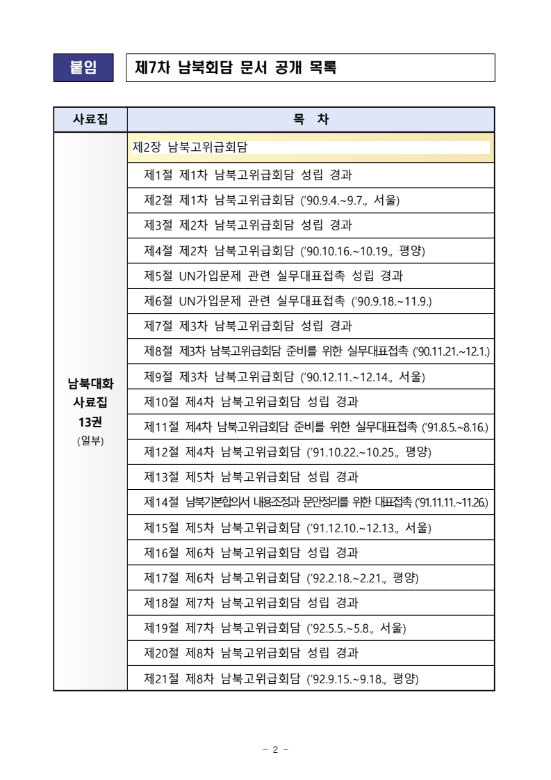 - 1 - 보도자료 보도시점 배포 즉시 배포 2025. 9. 2.(화) 1991년 남북기본합의서 체결 과정 공개- 1990년대 초 남북고위급회담 협의 과정 등 남북회담 문서 공개 - □ 통일부는 1990년 9월부터 1992년 9월까지 여덟 차례에 걸친 남북고위급회담 문서(3,172쪽)를 2025년 9월 2일(화) 국민에게 공개한다. ※ 2022년 첫 공개 이후 일곱 번째 남북회담 문서 공개 o 이번에 공개되는 문서에서는 1990년대 초 당시 20여 년 남북회담 역사에서 가장 최고위급의 회담으로서, 남북한 총리가 수석대표로 참여한 대화·접촉의 실상을 생생히 확인할 수 있다. - △남북고위급회담(8차례, ’90.9월∼’92.9월) △고위급회담 준비 실무대표접촉(2차례, ’90.11월, ’91.8월) △유엔 가입 문제 관련 실무대표 접촉(3차례, ’90.9월∼11월) 등의 진행과정과 회의록 등 포함 □ 공개된 남북회담 문서 원문은 △통일부 남북관계관리단 △국립통일교육원△통일부 북한자료센터 △목포통일플러스센터 △국회도서관 △국회부산도서관에서 열람할 수 있으며, o 남북회담 문서 공개 목록, 공개 방법 및 열람 절차 등은 남북관계관리단누리집(https://dialogue.unikorea.go.kr)을 통해서 확인할 수 있다. □ 통일부는 국민들이 보다 쉽게 접근할 수 있도록 「제7차 남북회담 문서공개 요약집」도 계속해서 발간하여 공개할 예정이다. o 앞으로도 국민의 알권리를 충족시키고 대북정책의 투명성을 제고하기 위하여 남북회담 문서 공개를 지속해 나갈 계획이다. 붙임 : 제7차 남북회담 문서 공개 목록 담당 부서 남북관계관리단 책임자 팀 장 송지영 (02-2076-1060) 상황관리팀 담당자 사무관 강진성 (02-2076-1061) - 2 - 붙임 제7차 남북회담 문서 공개 목록 사료집 목 차 남북대화 사료집 13권 (일부) 제2장 남북고위급회담 제1절 제1차 남북고위급회담 성립 경과 제2절 제1차 남북고위급회담 (’90.9.4.∼9.7., 서울) 제3절 제2차 남북고위급회담 성립 경과 제4절 제2차 남북고위급회담 (’90.10.16.∼10.19., 평양) 제5절 UN가입문제 관련 실무대표접촉 성립 경과 제6절 UN가입문제 관련 실무대표접촉 (’90.9.18.∼11.9.) 제7절 제3차 남북고위급회담 성립 경과 제8절 제3차 남북고위급회담 준비를 위한 실무대표접촉 (’90.11.21.~12.1.) 제9절 제3차 남북고위급회담 (’90.12.11.∼12.14., 서울) 제10절 제4차 남북고위급회담 성립 경과 제11절 제4차 남북고위급회담 준비를 위한 실무대표접촉 (’91.8.5.∼8.16.) 제12절 제4차 남북고위급회담 (’91.10.22.∼10.25., 평양) 제13절 제5차 남북고위급회담 성립 경과 제14절 남북기본합의서 내용조정과 문안정리를 위한 대표접촉 (’91.11.11.∼11.26.) 제15절 제5차 남북고위급회담 (’91.12.10.∼12.13., 서울) 제16절 제6차 남북고위급회담 성립 경과 제17절 제6차 남북고위급회담 (’92.2.18.∼2.21., 평양) 제18절 제7차 남북고위급회담 성립 경과 제19절 제7차 남북고위급회담 (’92.5.5.∼5.8., 서울) 제20절 제8차 남북고위급회담 성립 경과 제21절 제8차 남북고위급회담 (’92.9.15.∼9.18., 평양) - 3 - 사료집 목 차 남북대화 사료집 회의록편 제3권 제2장 남북고위급회담 제1절 제1차 남북고위급회담 (’90.9.4.∼9.7., 서울) 제2절 제2차 남북고위급회담 (’90.10.16.∼10.19., 평양) 제3절 UN가입문제 관련 실무대표접촉 제4절 제3차 남북고위급회담 준비를 위한 실무대표접촉 남북대화 사료집 회의록편 제4권 제5절 제3차 남북고위급회담 (’90.12.11.∼12.14., 서울) 제6절 제4차 남북고위급회담 준비를 위한 실무대표 접촉 제7절 제4차 남북고위급회담 (’91.10.22.∼10.25., 평양) 남북대화 사료집 회의록편 제5권 제8절 남북기본합의서 내용조정과 문안정리를 위한 대표접촉 제9절 제5차 남북고위급회담 (’91.12.10.∼12.13., 서울) 제10절 제6차 남북고위급회담 (’92.2.18.∼2.21., 평양) 남북대화 사료집 회의록편 제6권 (일부) 제11절 제7차 남북고위급회담 (’92.5.5.∼5.8., 서울) 제12절 제8차 남북고위급회담 (’92.9.15.∼9.18., 평양)