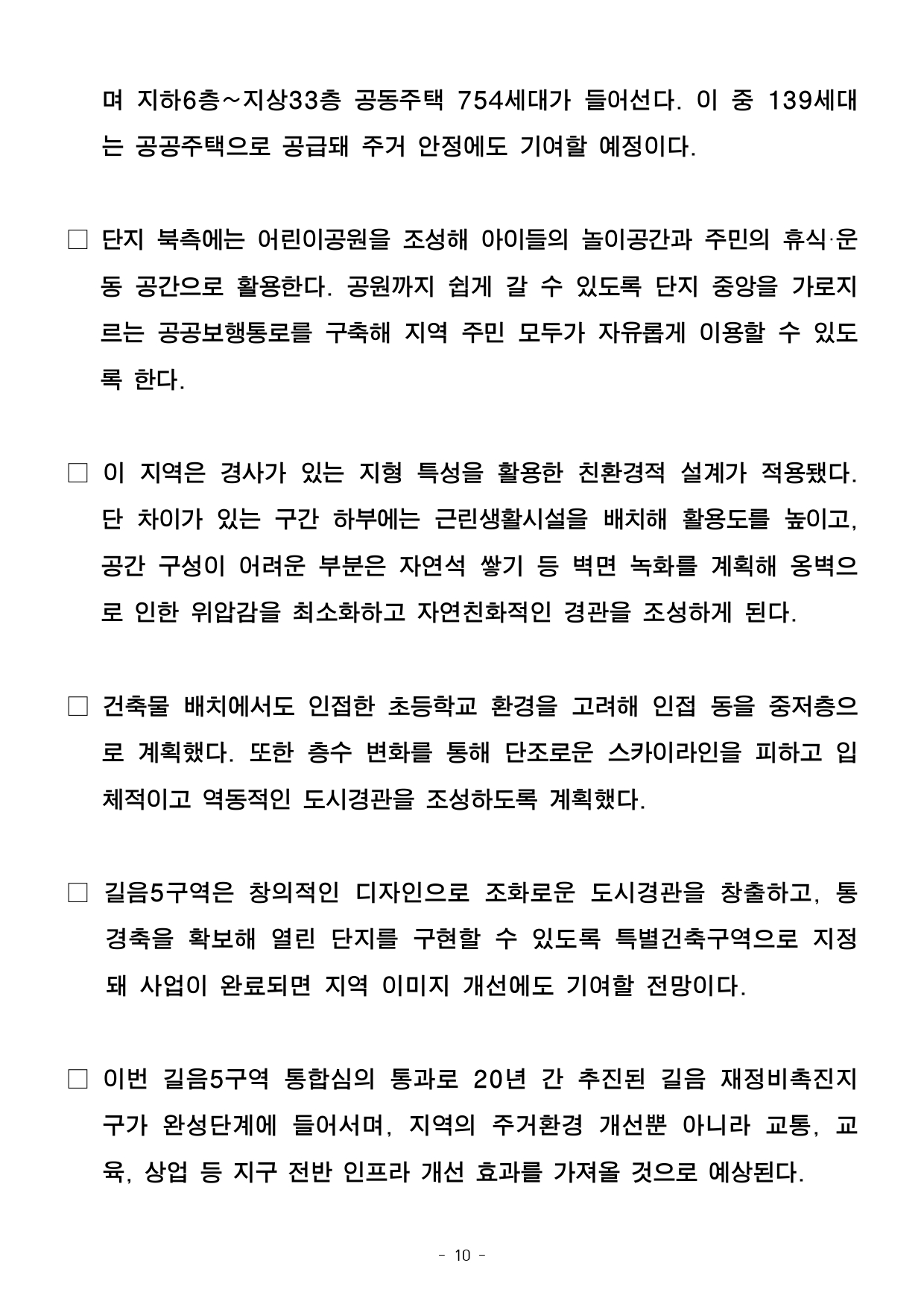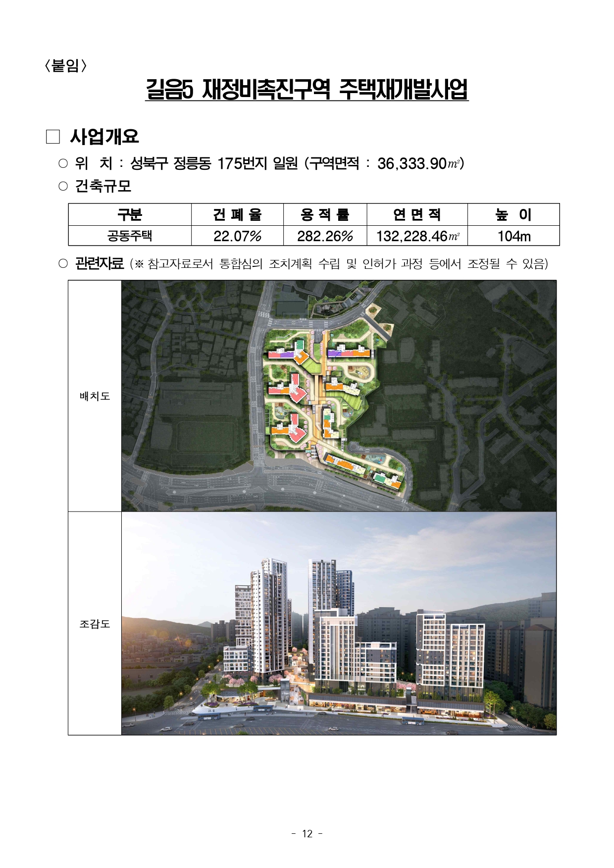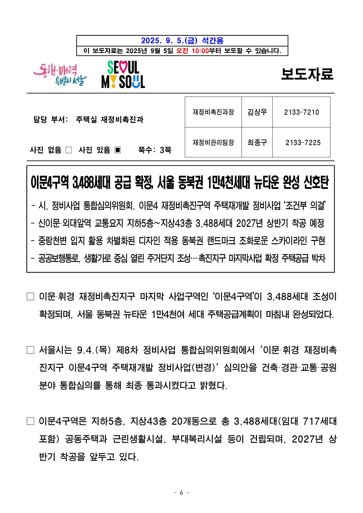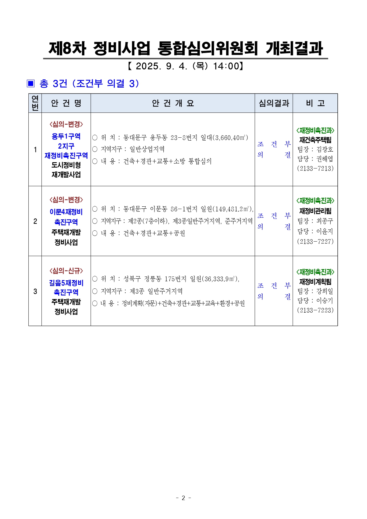 - 1 - 2025. 9. 5.(금) 석간용 이 보도자료는 2025년 9월 5일 오전 10:00부터 보도할 수 있습니다. 보도자료담당 부서: 주택실 주거정비과 주거정비과장 김동구 02-2133-7190통합심의팀장 박성운 02-2133-7204사진없음 ■ 사진있음 □ 쪽수 : 2쪽 2025년 제8차 서울시 정비사업 통합심의위원회 개최결과□ 금일 처리 안건 : 총 3건 ○ 조건부 의결 : 3건 ※ 자문, 보류, 보고 안건은 보도자료를 제공하지 않습니다. ※ 안건에 대한 자세한 내용은 소관부서에 문의하여 주시기 바랍니다. 붙임 심의결과 1부. - 2 - 제8차 정비사업 통합심의위원회 개최결과【 2025. 9. 4. (목) 14:00】 ▣ 총 3건 (조건부 의결 3) 연 번 안 건 명 안 건 개 요 심의결과 비고1 <심의-변경> 용두1구역 2지구 재정비촉진구역 도시정비형 재개발사업 ○ 위 치 : 동대문구 용두동 23-8번지 일대(3,660.40㎡) ○ 지역지구 : 일반상업지역 ○ 내 용 : 건축+경관+교통+소방 통합심의 조 건 부 의 결 <재정비촉진과> 재건축주택팀팀장 : 김광호담당 : 권해엽(2133-7213) 2 <심의-변경> 이문4재정비 촉진구역 주택재개발 정비사업 ○ 위 치 : 동대문구 이문동 86-1번지 일원(149,481.2㎡), ○ 지역지구 : 제2종(7층이하), 제3종일반주거지역, 준주거지역 ○ 내 용 : 건축+경관+교통+공원 조 건 부 의 결 <재정비촉진과> 재정비관리팀팀장 : 최종구담당 : 이윤지(2133-7227) 3 <심의-신규> 길음5재정비 촉진구역 주택재개발 정비사업 ○ 위 치 : 성북구 정릉동 175번지 일원(36,333.9㎡), ○ 지역지구 : 제3종 일반주거지역 ○ 내 용 : 정비계획(자문)+건축+경관+교통+교육+환경+공원 조 건 부 의 결 <재정비촉진과> 재정비계획팀팀장 : 강희일담당 : 이승기(2133-7223) - 3 - 2025. 9. 5.(금) 석간용 이 보도자료는 2025년 9월 5일 오전 10:00부터 보도할 수 있습니다.보도자료담당부서 : 주택실 재정비촉진과 재정비촉진과장 김상우 02-2133-7210 재정비주택팀장 김광호 02-2133-7212 사진없음 □ 사진있음 ■ 쪽수 : 3쪽 용두1구역, 교통·친환경·주거지원센터 갖춘 243세대 공급 - 8차 정비사업 통합심의위원회, 용두1구역(2지구) 도시정비형 재개발사업 ‘조건부의결’ - 37층 친환경 공동주택 조성, 청량리·왕십리 광역중심체계에 부합하는 단지계획수립- 단지 내 공공시설 주거안심종합센터 설치, 지역 주민 주거복지서비스 향상기여□ 용두1구역 2지구가 37층 243세대 공급이 확정되며, 교통 접근성이좋은입지에 친환경 단지와 주거복지시설을 갖춘 미래형 주거단지로 거듭난다. □ 서울시는 9.4. 제8차 정비사업 통합심의위원회에서 '용두1재정비촉진구역제2지구 도시정비형 재개발사업' 심의안이 건축·경관·교통·소방 분야 통합심의를거쳐 '조건부 의결' 됐다고 밝혔다. □ 용두1재정비촉진구역 제2지구(용두동 23-8번지 일대)는 지하철1호선청량리역·제기동역과 2호선 용두역이 가까워 교통 접근성이 뛰어난입지다.사업을 통해 37층 243세대 공동주택과 근린생활시설이 건립될 예정이다. - 4 - □ 주거 환경의 다양성을 고려해 59㎡ 국민주택 규모를 중점 배치한다.실수요자들이 선호하는 중소형 평형대로 질 좋은 주거공간을제공하기위한 것이다. 특히 신혼부부 대상 미리내집 11호가 포함돼 젊은세대의 주거안정에도 실질적인 도움이 될 전망이다. □ 이번 계획은 2040 서울도시기본계획에 따라 지역 특성을 반영한높이기준을 적용했다. 청량리재정비촉진지구 일대에 조성된 초고층건물들과조화로운 스카이라인을 만들어 균형잡힌 도시경관을 조성할 예정이다. ○ 단지는 태양광 등 신재생에너지 설비를 적극 도입하고, 제로에너지건축물5등급을 선제적으로 적용해 미래지향적인 친환경 단지로 조성할 계획이다. ○ 금번 통합심의에서는 소방차전용구간은 진입이 원활토록 개선할 것을조건으로 통과시켰다. □ 단지 내에는 서울주택도시개발공사(SH)가 운영하는 ‘주거안심종합센터’가들어선다. 이 센터는 주거취약계층을 포함한 지역 주민들에게다양한주거복지 서비스를 제공하는 거점 역할을 할 예정이다. □ 최진석 서울시 주택실장은 “용두1구역 2지구가 교통 접근성, 주거복지,친환경성을 모두 갖춘 미래형 주거단지로 조성돼 동북권의 주거환경개선과 지역 발전에 기여할 것으로 기대한다.”고 말했다. - 5 - <붙임1> 용두1재정비촉진구역 제2지구 도시정비형 재개발사업□ 사업개요 ○ 위 치 : 서울시 동대문구 용두동 23-8일대 (구역면적 ; 3,660.4㎡) ○ 건축규모 구분 건 폐 율 용 적 률 연 면 적 높 이공동주택, 근린생활시설 49.59% 898.6% 36,686.41㎡ 139.25m○ 관련자료 (※참고자료로서 통합심의 조치계획 수립 및 인허가 과정 등에서 조정될 수 있음) 배치도 투시도 - 6 - 2025. 9. 5.(금) 석간용 이 보도자료는 2025년 9월 5일 오전 10:00부터 보도할 수 있습니다. 보도자료담당 부서: 주택실 재정비촉진과 재정비촉진과장 김상우 2133-7210 재정비관리팀장 최종구 2133-7225 사진 없음 □ 사진 있음 ▣ 쪽수: 3쪽 이문4구역 3,488세대 공급 확정, 서울 동북권 1만4천세대 뉴타운 완성 신호탄- 시, 정비사업 통합심의위원회, 이문4 재정비촉진구역 주택재개발 정비사업 ‘조건부의결’ - 신이문·외대앞역 교통요지 지하5층~지상43층 3,488세대 2027년 상반기 착공예정- 
