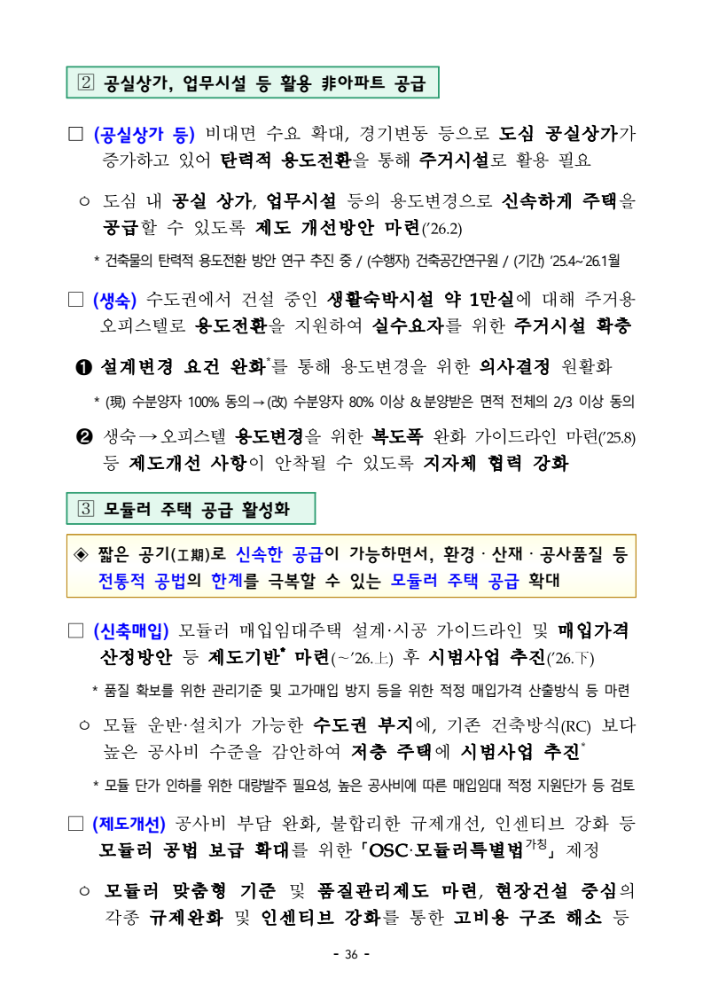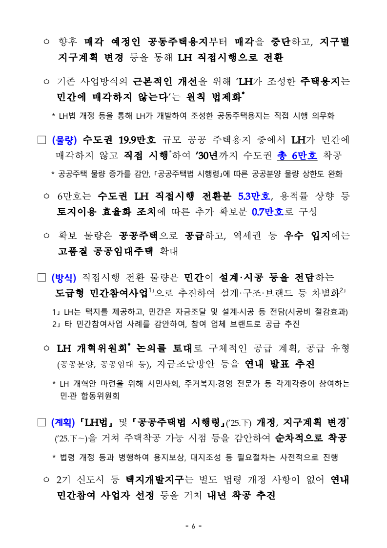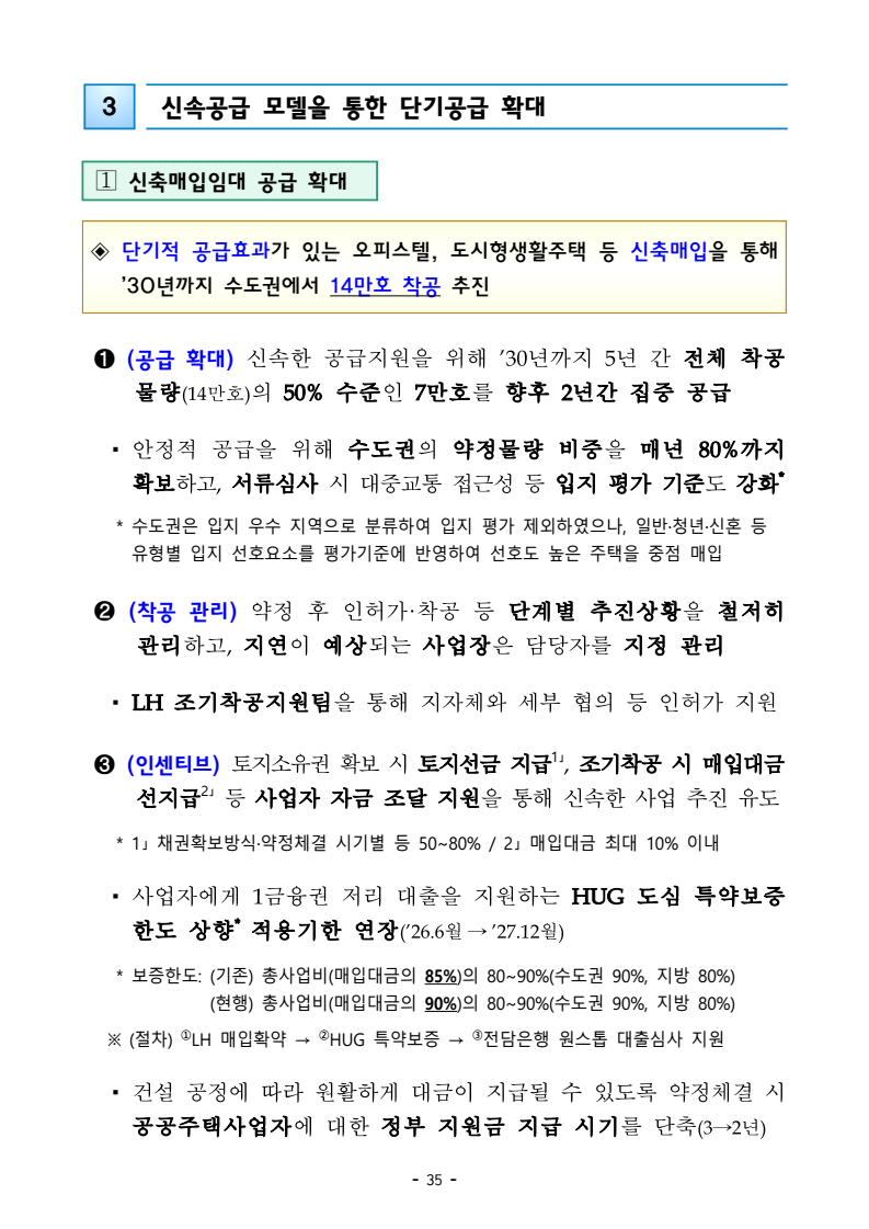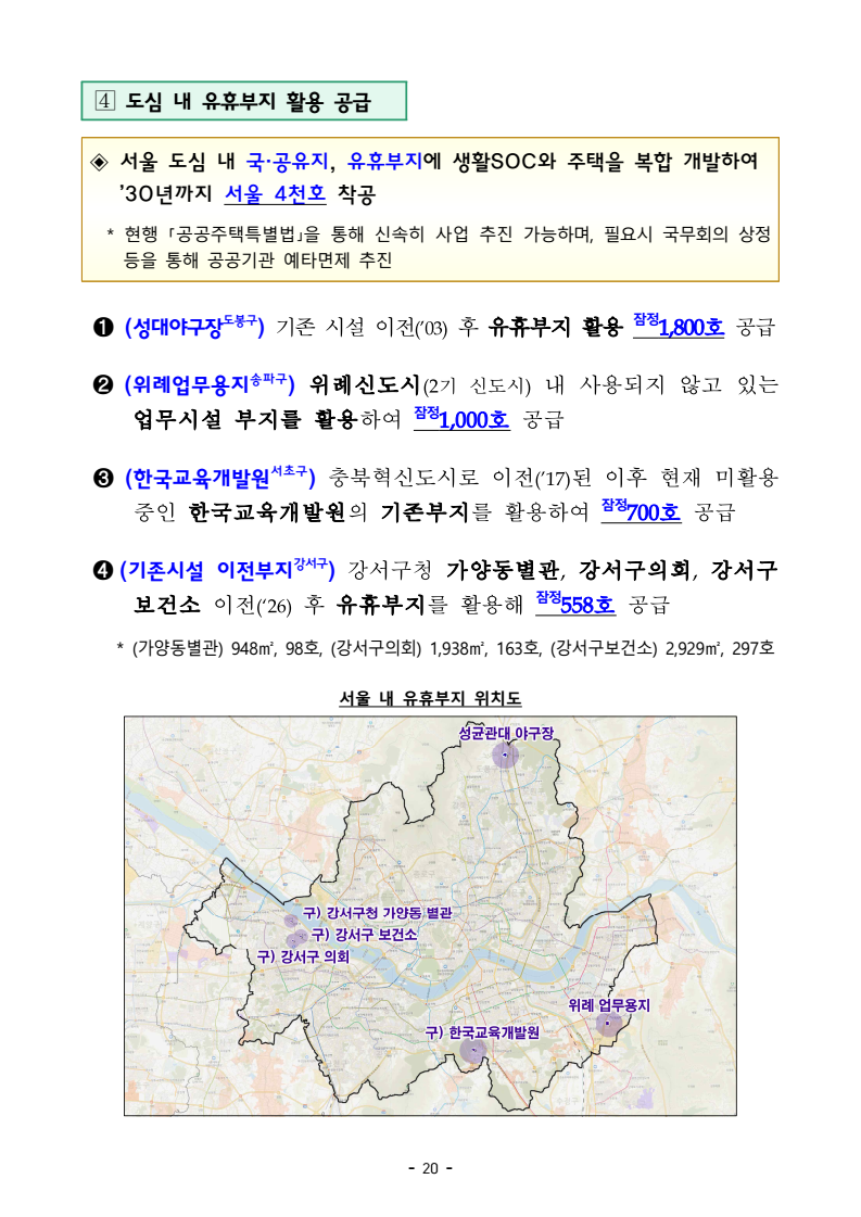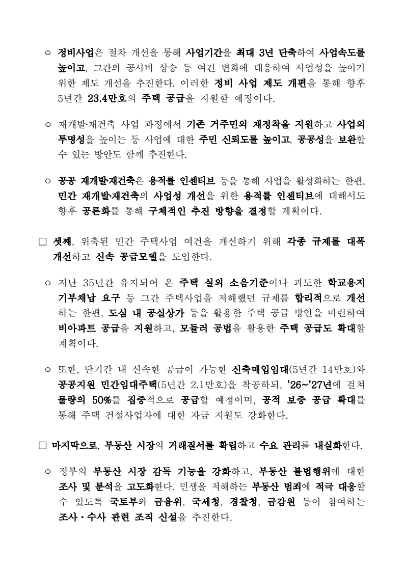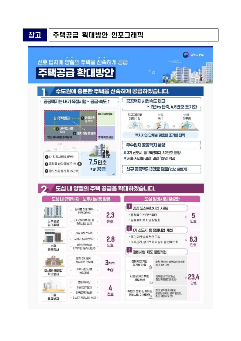 □ 기획재정부(장관 구윤철), 국토교통부(장관 김윤덕), 국무조정실(실장 윤창렬), 금융위원회(위원장 김병환), 국세청(청장 임광현)은 9.7(일) 관계부처 합동으로 부동산 관계장관회의를 개최하고 「주택공급 확대방안」을 발표했다. ㅇ 이에 따라 서울‧수도권에 향후 5년(‘26~’30)간 총 135만호, 연간 27만호의 신규 주택이 공급(착공)된다. 이는 최근 3년 공급실적 대비 1.7배 수준으로 매년 11만호 늘어난 수치다. 그간 인허가 기준으로 산정한 공급 물량이 정책 체감도가 낮고 실제 준공까지 이어지지 않는 경우가 있다는 지적이 있었던 만큼, 새정부의 공급목표는 국민 체감도와 실현가능성을 극대화 할 수 있도록 ‘착공’ 기준으로 관리한다. □ 「주택공급 확대방안」의 주요 내용은 다음과 같다. ㅇ 첫째, 수도권 공공택지에 충분한 주택을 조기에 공급하기 위해, 공공의 역할을 강화하고, 사업 절차에 따른 지연 요소를 개선하여, 37.2만호 이상의 주택을 신속 공급한다. ㅇ LH가 공동주택용지를 민간에 매각하지 않고 직접 주택 건설사업을 시행함으로써 지연될 공급을 조기화하여 공급속도를 높이고, 용적률 상향 등도 추진하여 ’30년까지 수도권에 6만호를 추가 공급한다. 또한 장기간 사용되지 않거나 과다하게 계획된 상업용지 등 비주택용지는 심의를 거쳐 주택용지로 전환하여 1.5만호 이상의 주택을 공급할 예정이다. 보도자료 보도시점 2025. 9. 7.(일) 15:00 배포 2025. 9. 7.(일) 14:00 새정부 「주택공급 확대방안」 발표- 2030년까지 수도권에 총 135만호, 年 27만호(과거比 1.7배) 신규착공 - 공공택지에서는 LH가 주택사업을 직접 시행하여 공급 확대 및 공급속도 제고- 노후 임대주택, 노후 공공청사, 미사용 학교용지 등 활용해 도심 내 공급 ㅇ 그간 인·허가, 보상 등 공공택지 조성 과정에서 반복적으로 발생해 온 지연 요인은 단계별 맞춤형 조기화 전략을 마련하여 사업기간을 2년 이상 단축하고, 4.6만호 주택을 추가 공급한다. ㅇ 기 발표된 서리풀지구 및 과천 과천지구는 ’29년 착공을 차질없이 추진하고, 중장기적 공급 기반을 확보하기 위해 3만호 규모의 신규택지도 검토한다. 주택공급 확대에 따른 교통 수요에 적기 대응이 가능하도록 신도시 교통 개선방안도 추진할 계획이다 ㅇ 이와 더불어, 3기 신도시 등 수도권의 주요 공공택지에서 ’25년 내 0.5만호, ’26년 2.7만호의 공공주택 분양도 추진된다. □ 둘째, 노후시설·유휴부지를 활용하고 재건축·재개발 사업을 촉진함으로써주거 선호도가 높은 도심에 공급을 확대한다. ㅇ 역세권 등 도심 내 주요 입지에 위치한 30년 이상의 노후 공공임대주택을 최대 용적률 500%까지 상향해 고밀도로 전면 재건축하여 2.3만호주택을 공급할 계획이며, ㅇ 도심 내 유휴 국공유지와 준공 30년이 지난 노후 공공청사 등은 의무적으로 복합개발을 검토하고, LH, 캠코 등이 사용권을 확보하여 속도감 있게 사업을 추진할 수 있도록 특별법을 제정하여 2.8만호 주택을 공급할 계획이다. ㅇ 도심 내 학교나, 미사용 학교용지 등도 특별법 제정을 통해 장기간 미사용 시 관계기관 합동으로 복합개발 필요성 검토 후 학교용도를 원칙적으로 해제하여 3천호 이상을 공급할 예정이며, 송파구 위례업무용지, 강서구 공공청사부지 등 서울 내 유휴부지를 즉각 개발하여 4천호 규모 주택을 추가 공급한다. ㅇ 그간 추진력 확보가 어려웠던 공공 도심복합사업은 일몰을 폐지하고 용적률을 상향하여 사업 동력을 확보하여 5만호를 공급하고, 1기 신도시 등 노후계획도시 정비사업은 선정방식과 사업절차를 개선하여 6.3만호의주택 공급이 가능할 것으로 기대된다. ㅇ 정비사업은 절차 개선을 통해 사업기간을 최대 3년 단축하여 사업속도를 높이고, 그간의 공사비 상승 등 여건 변화에 대응하여 사업성을 높이기 위한 제도 개선을 추진한다. 이러한 정비 사업 제도 개편을 통해 향후 5년간 23.4만호의 주택 공급을 지원할 예정이다. ㅇ 재개발‧재건축 사업 과정에서 기존 거주민의 재정착을 지원하고 사업의 투명성을 높이는 등 사업에 대한 주민 신뢰도를 높이고, 공공성을 보완할 수 있는 방안도 함께 추진한다. ㅇ 공공 재개발‧재건축은 용적률 인센티브 등을 통해 사업을 활성화하는 한편, 민간 재개발‧재건축의 사업성 개선을 위한 용적률 인센티브에 대해서도향후 공론화를 통해 구체적인 추진 방향을 결정할 계획이다. □ 셋째, 위축된 민간 주택사업 여건을 개선하기 위해 각종 규제를 대폭 개선하고 신속 공급모델을 도입한다. ㅇ 지난 35년간 유지되어 온 주택 실외 소음기준이나 과도한 학교용지 기부채납 요구 등 그간 주택사업을 저해했던 규제를 합리적으로 개선하는 한편, 도심 내 공실상가 등을 활용한 주택 공급 방안을 마련하여 비아파트 공급을 지원하고, 모듈러 공법을 활용한 주택 공급도 확대할 계획이다. ㅇ 또한, 단기간 내 신속한 공급이 가능한 신축매입임대(5년간 14만호)와 공공지원 민간임대주택(5년간 2.1만호)을 착공하되, ’26~’27년에 걸쳐 물량의 50%를 집중적으로 공급할 예정이며, 공적 보증 공급 확대를 통해 주택 건설사업자에 대한 자금 지원도 강화한다. □ 마지