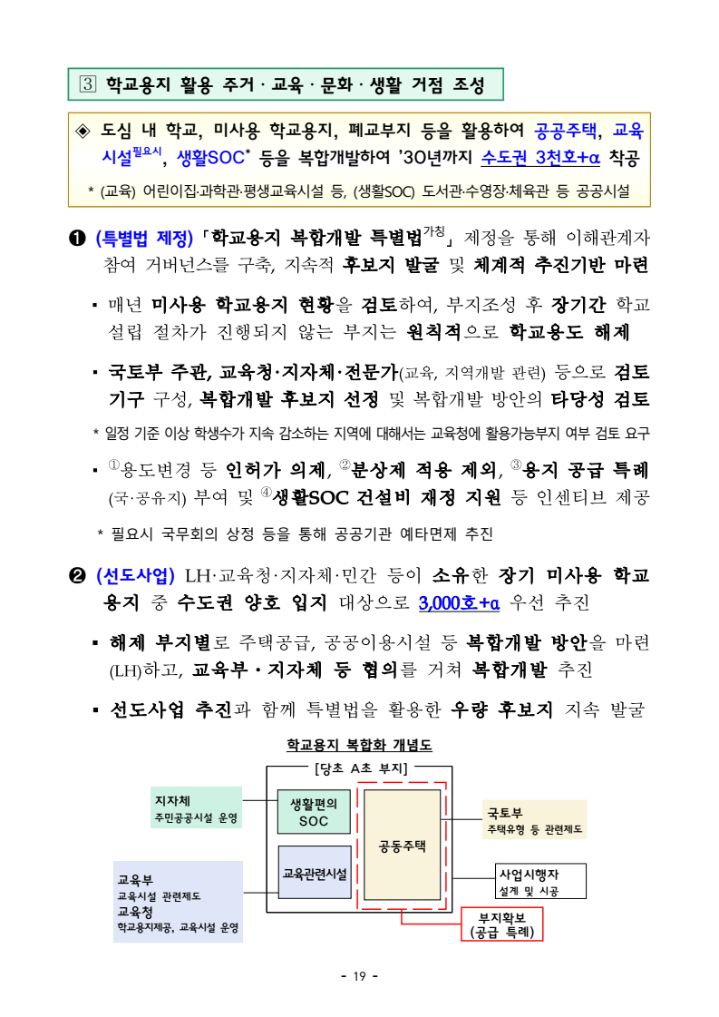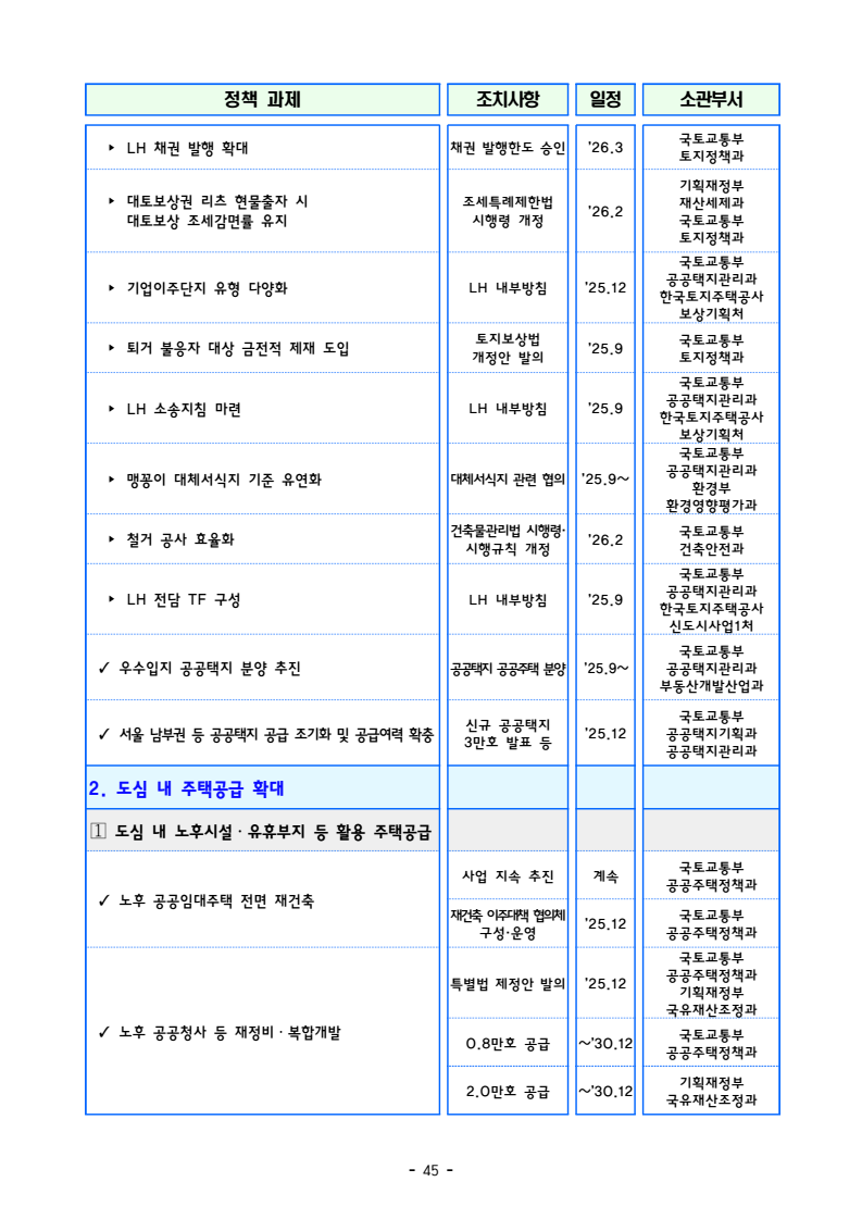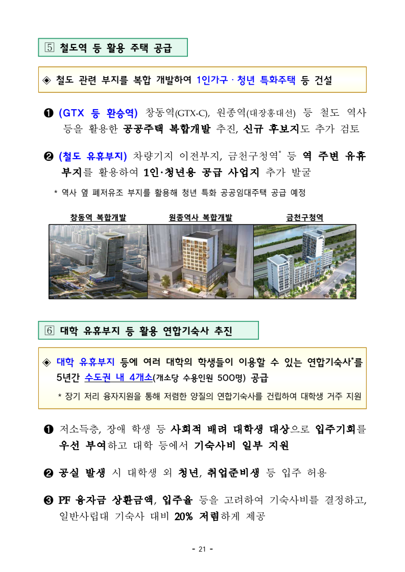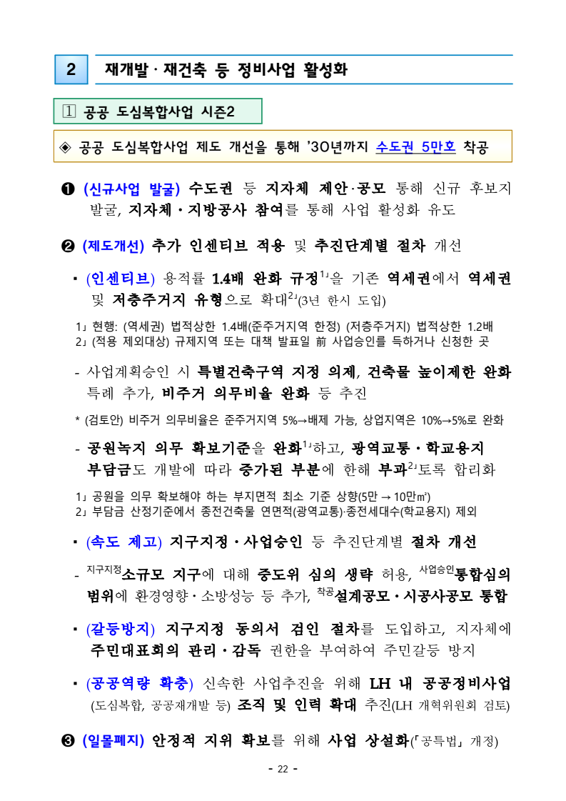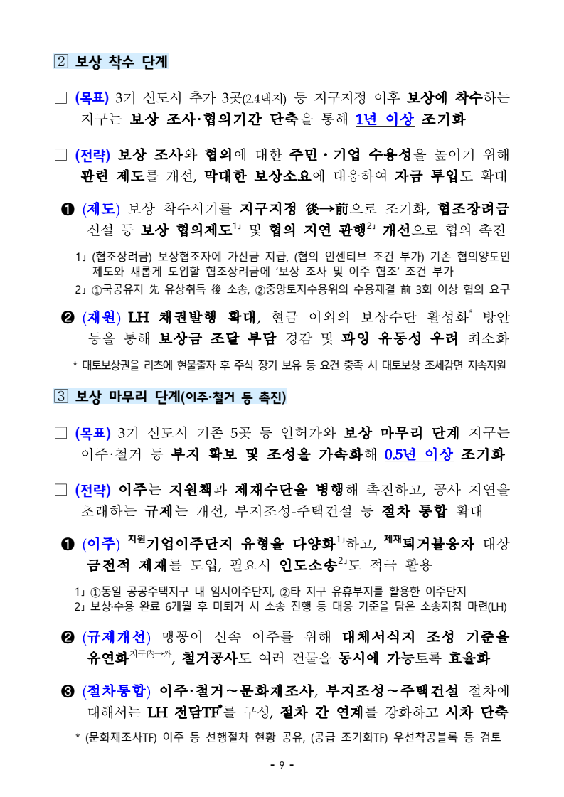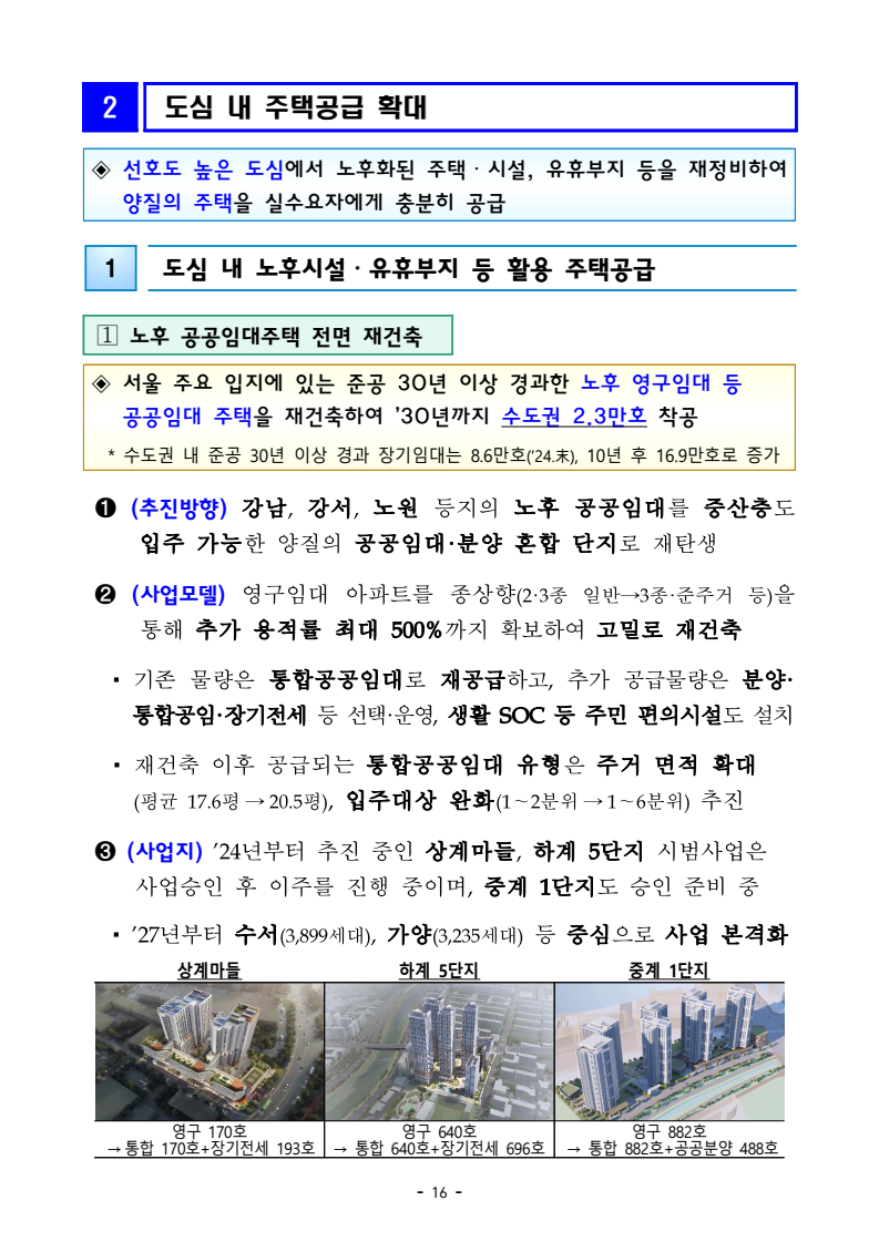 □ 기획재정부(장관 구윤철), 국토교통부(장관 김윤덕), 국무조정실(실장 윤창렬), 금융위원회(위원장 김병환), 국세청(청장 임광현)은 9.7(일) 관계부처 합동으로 부동산 관계장관회의를 개최하고 「주택공급 확대방안」을 발표했다. ㅇ 이에 따라 서울‧수도권에 향후 5년(‘26~’30)간 총 135만호, 연간 27만호의 신규 주택이 공급(착공)된다. 이는 최근 3년 공급실적 대비 1.7배 수준으로 매년 11만호 늘어난 수치다. 그간 인허가 기준으로 산정한 공급 물량이 정책 체감도가 낮고 실제 준공까지 이어지지 않는 경우가 있다는 지적이 있었던 만큼, 새정부의 공급목표는 국민 체감도와 실현가능성을 극대화 할 수 있도록 ‘착공’ 기준으로 관리한다. □ 「주택공급 확대방안」의 주요 내용은 다음과 같다. ㅇ 첫째, 수도권 공공택지에 충분한 주택을 조기에 공급하기 위해, 공공의 역할을 강화하고, 사업 절차에 따른 지연 요소를 개선하여, 37.2만호 이상의 주택을 신속 공급한다. ㅇ LH가 공동주택용지를 민간에 매각하지 않고 직접 주택 건설사업을 시행함으로써 지연될 공급을 조기화하여 공급속도를 높이고, 용적률 상향 등도 추진하여 ’30년까지 수도권에 6만호를 추가 공급한다. 또한 장기간 사용되지 않거나 과다하게 계획된 상업용지 등 비주택용지는 심의를 거쳐 주택용지로 전환하여 1.5만호 이상의 주택을 공급할 예정이다. 보도자료 보도시점 2025. 9. 7.(일) 15:00 배포 2025. 9. 7.(일) 14:00 새정부 「주택공급 확대방안」 발표- 2030년까지 수도권에 총 135만호, 年 27만호(과거比 1.7배) 신규착공 - 공공택지에서는 LH가 주택사업을 직접 시행하여 공급 확대 및 공급속도 제고- 노후 임대주택, 노후 공공청사, 미사용 학교용지 등 활용해 도심 내 공급 ㅇ 그간 인·허가, 보상 등 공공택지 조성 과정에서 반복적으로 발생해 온 지연 요인은 단계별 맞춤형 조기화 전략을 마련하여 사업기간을 2년 이상 단축하고, 4.6만호 주택을 추가 공급한다. ㅇ 기 발표된 서리풀지구 및 과천 과천지구는 ’29년 착공을 차질없이 추진하고, 중장기적 공급 기반을 확보하기 위해 3만호 규모의 신규택지도 검토한다. 주택공급 확대에 따른 교통 수요에 적기 대응이 가능하도록 신도시 교통 개선방안도 추진할 계획이다 ㅇ 이와 더불어, 3기 신도시 등 수도권의 주요 공공택지에서 ’25년 내 0.5만호, ’26년 2.7만호의 공공주택 분양도 추진된다. □ 둘째, 노후시설·유휴부지를 활용하고 재건축·재개발 사업을 촉진함으로써주거 선호도가 높은 도심에 공급을 확대한다. ㅇ 역세권 등 도심 내 주요 입지에 위치한 30년 이상의 노후 공공임대주택을 최대 용적률 500%까지 상향해 고밀도로 전면 재건축하여 2.3만호주택을 공급할 계획이며, ㅇ 도심 내 유휴 국공유지와 준공 30년이 지난 노후 공공청사 등은 의무적으로 복합개발을 검토하고, LH, 캠코 등이 사용권을 확보하여 속도감 있게 사업을 추진할 수 있도록 특별법을 제정하여 2.8만호 주택을 공급할 계획이다. ㅇ 도심 내 학교나, 미사용 학교용지 등도 특별법 제정을 통해 장기간 미사용 시 관계기관 합동으로 복합개발 필요성 검토 후 학교용도를 원칙적으로 해제하여 3천호 이상을 공급할 예정이며, 송파구 위례업무용지, 강서구 공공청사부지 등 서울 내 유휴부지를 즉각 개발하여 4천호 규모 주택을 추가 공급한다. ㅇ 그간 추진력 확보가 어려웠던 공공 도심복합사업은 일몰을 폐지하고 용적률을 상향하여 사업 동력을 확보하여 5만호를 공급하고, 1기 신도시 등 노후계획도시 정비사업은 선정방식과 사업절차를 개선하여 6.3만호의주택 공급이 가능할 것으로 기대된다. ㅇ 정비사업은 절차 개선을 통해 사업기간을 최대 3년 단축하여 사업속도를 높이고, 그간의 공사비 상승 등 여건 변화에 대응하여 사업성을 높이기 위한 제도 개선을 추진한다. 이러한 정비 사업 제도 개편을 통해 향후 5년간 23.4만호의 주택 공급을 지원할 예정이다. ㅇ 재개발‧재건축 사업 과정에서 기존 거주민의 재정착을 지원하고 사업의 투명성을 높이는 등 사업에 대한 주민 신뢰도를 높이고, 공공성을 보완할 수 있는 방안도 함께 추진한다. ㅇ 공공 재개발‧재건축은 용적률 인센티브 등을 통해 사업을 활성화하는 한편, 민간 재개발‧재건축의 사업성 개선을 위한 용적률 인센티브에 대해서도향후 공론화를 통해 구체적인 추진 방향을 결정할 계획이다. □ 셋째, 위축된 민간 주택사업 여건을 개선하기 위해 각종 규제를 대폭 개선하고 신속 공급모델을 도입한다. ㅇ 지난 35년간 유지되어 온 주택 실외 소음기준이나 과도한 학교용지 기부채납 요구 등 그간 주택사업을 저해했던 규제를 합리적으로 개선하는 한편, 도심 내 공실상가 등을 활용한 주택 공급 방안을 마련하여 비아파트 공급을 지원하고, 모듈러 공법을 활용한 주택 공급도 확대할 계획이다. ㅇ 또한, 단기간 내 신속한 공급이 가능한 신축매입임대(5년간 14만호)와 공공지원 민간임대주택(5년간 2.1만호)을 착공하되, ’26~’27년에 걸쳐 물량의 50%를 집중적으로 공급할 예정이며, 공적 보증 공급 확대를 통해 주택 건설사업자에 대한 자금 지원도 강화한다. □ 마지
