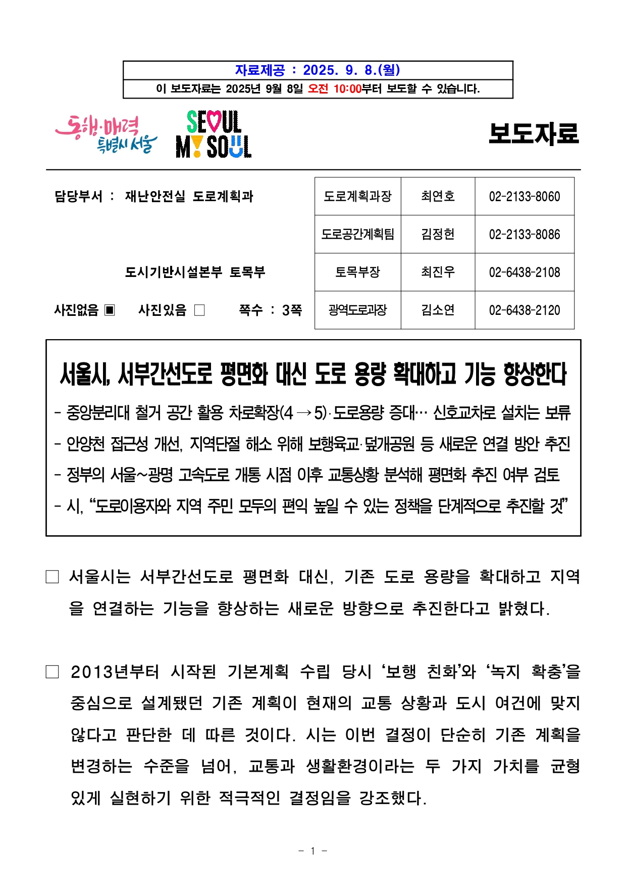 - 1 - □ 서울시는 서부간선도로 평면화 대신, 기존 도로 용량을 확대하고지역을 연결하는 기능을 향상하는 새로운 방향으로 추진한다고 밝혔다. □ 2013년부터 시작된 기본계획 수립 당시 ‘보행 친화’와 ‘녹지확충’을중심으로 설계됐던 기존 계획이 현재의 교통 상황과 도시 여건에맞지않다고 판단한 데 따른 것이다. 시는 이번 결정이 단순히 기존계획을변경하는 수준을 넘어, 교통과 생활환경이라는 두 가지 가치를균형있게 실현하기 위한 적극적인 결정임을 강조했다. 자료제공 : 2025. 9. 8.(월) 이 보도자료는 2025년 9월 8일 오전 10:00부터 보도할 수 있습니다. 보도자료담당부서 : 재난안전실 도로계획과 도로계획과장 최연호 02-2133-8060도로공간계획팀 김정헌 02-2133-8086도시기반시설본부 토목부 토목부장 최진우 02-6438-2108사진없음 ▣ 사진있음 □ 쪽수 : 3쪽 광역도로과장 김소연 02-6438-2120서울시, 서부간선도로 평면화 대신 도로 용량 확대하고 기능 향상한다- 중앙분리대 철거 공간 활용 차로확장(4 →5)‧도로용량 증대… 신호교차로 설치는보류- 안양천 접근성 개선, 지역단절 해소 위해 보행육교‧덮개공원 등 새로운 연결방안추진- 정부의 서울~광명 고속도로 개통 시점 이후 교통상황 분석해 평면화 추진 여부검토- 시, “도로이용자와 지역 주민 모두의 편익 높일 수 있는 정책을 단계적으로추진할것” - 2 - □ 이에 시는 당분간 출퇴근길 교통정체 완화를 최우선 과제로 삼아도로기능을 조속히 회복하고, 도로 용량을 지금보다 늘려 교통 흐름을개선하는 데 집중한다. <중앙분리대 철거 공간 활용 차로확장(4→5)‧도로용량 증대, 신호교차로 설치는 보류>□ 우선 만성적 차량 정체를 완화하기 위해 도로 가운데 중앙분리대를축소하고 그 자리에 1개 차로를 추가로 확보해 4차로를 5차로로늘린다. 늘어난 차로는 교통 정체가 심한 출퇴근 시간대 교통량에따라가변차로로 운영하는 방안을 검토한다. 당초 일반도로화를 위해설치예정이었던 신호교차로는 전면 보류해 차량 주행의 연속성을 확보한다. □ 현재 진행 중인 오목교 교차로 평면화 공사는 즉시 중단하고, 지하차도를 원상 복구해 도로 본래 기능을 회복한다. 대체도로가 부족한상황에서 공사로 인한 교통불편과 교차로 평면화 이후 교통흐름악화를우려하는 시민들의 의견을 적극 수용한 결정이다. ○ 일직방향 지하차도 공사는 즉시 중단하고, 복구 작업은 추석 명절전까지완료해 시민 불편을 최소화한다. <안양천 접근성 개선, 지역단절 해소 위해 보행육교‧덮개공원 등 새로운 연결 방안 검토>□ 아울러 시는 단기적으로 교통 문제 해결에 집중하면서도, 장기적으로는 서부간선도로로 인해 단절된 서남부 동서 생활권을 연결하고, 안양천 접근성을 높이기 위한 다양한 방법을 모색한다. - 3 - □ 폭이 넓어 이용하기 쉬운 보행육교 설치, 도로 상부를 활용한덮개공원 조성 등 새로운 방식의 공간 활용안을 적극 추진해, 교통기능은유지하면서도 주민들의 생활 편익과 도시 활력을 함께 담아내는공간으로 발전시킨다는 구상이다. □ 또한, 현재 정부에서 추진 중인 서울~광명 고속도로가 완공되어향후대체도로가 추가로 확보되면 교통량이 분산될 것으로 예상되는만큼,그 이후 교통상황을 면밀히 분석해 서부간선도로의 일반도로화‧평면화추진 여부를 검토‧결정할 계획이다. □ 한병용 서울시 재난안전실장은 “서울시는 교통 체증 해소와 시민불편최소화를 최우선으로 두고 있다”면서 “교통 문제와 지역 단절해소라는두 가지 과제를 고려해, 도로이용자와 인근 주민 모두의 편익을높일수 있는 정책을 단계적으로 추진하겠다”라고 말했다.