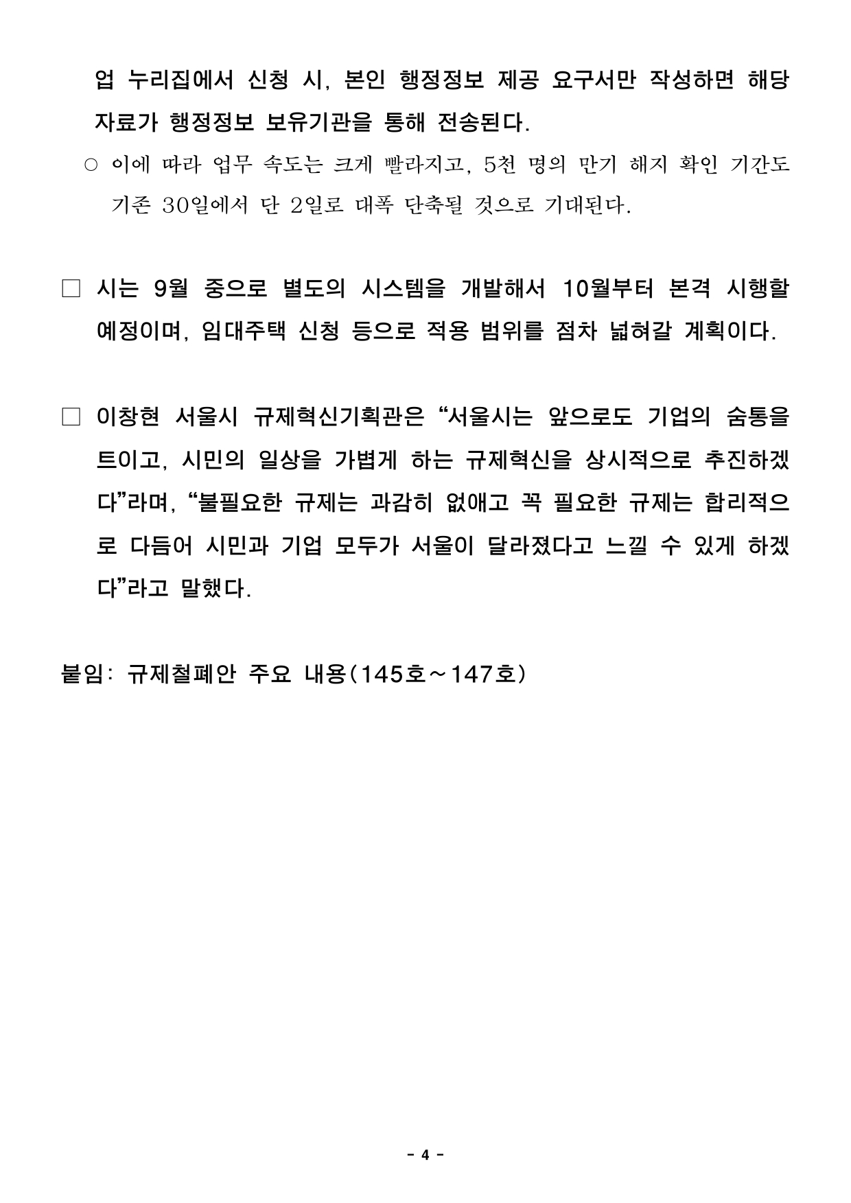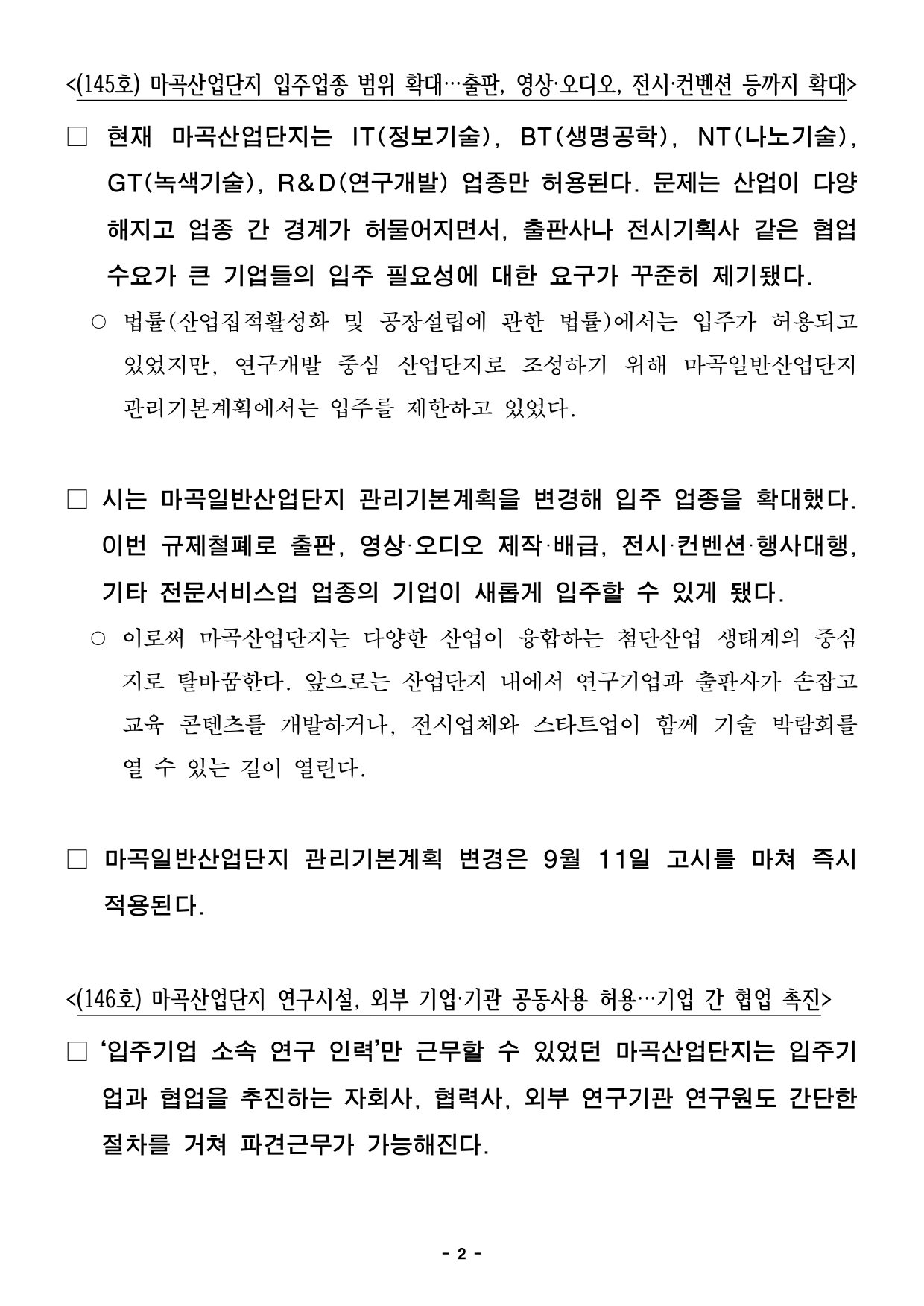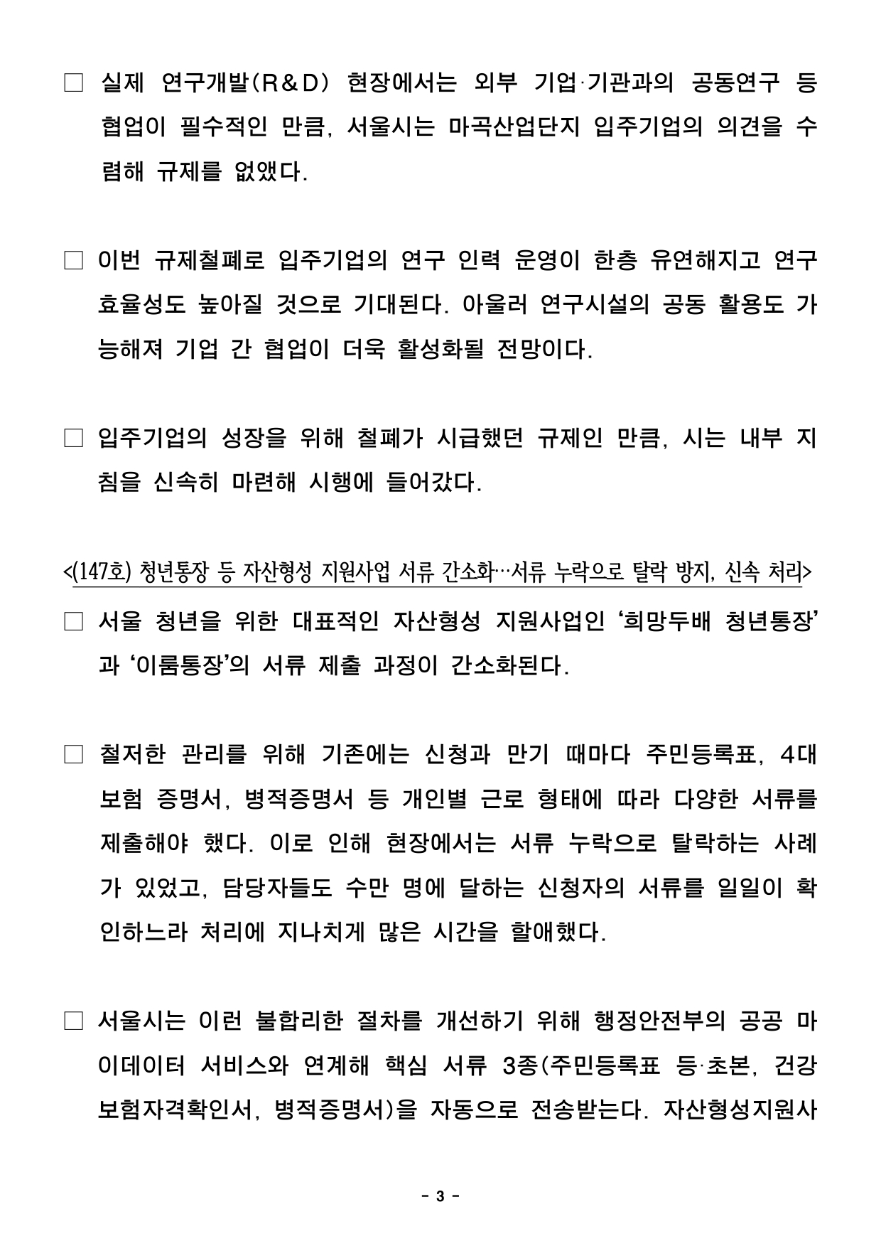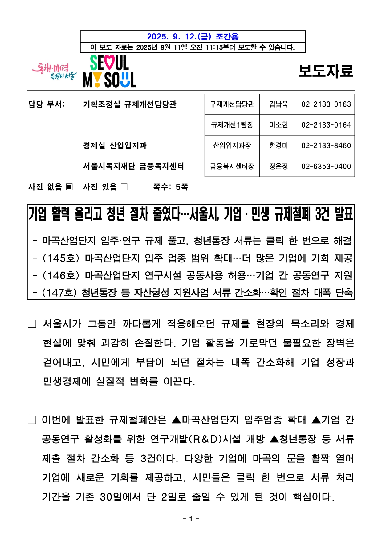 - 1 - 2025. 9. 12.(금) 조간용 이 보도 자료는 2025년 9월 11일 오전 11:15부터 보도할 수 있습니다. 보도자료담당 부서: 기획조정실 규제개선담당관 규제개선담당관 김남욱 02-2133-0163규제개선1팀장 이소현 02-2133-0164경제실 산업입지과 산업입지과장 한경미 02-2133-8460서울시복지재단 금융복지센터 금융복지센터장 정은정 02-6353-0400사진 없음 ▣ 사진 있음 □ 쪽수: 5쪽 기업 활력 올리고 청년 절차 줄였다…서울시, 기업·민생 규제철폐 3건 발표- 마곡산업단지 입주·연구 규제 풀고, 청년통장 서류는 클릭 한 번으로해결- (145호) 마곡산업단지 입주 업종 범위 확대…더 많은 기업에 기회제공- (146호) 마곡산업단지 연구시설 공동사용 허용…기업 간 공동연구지원- (147호) 청년통장 등 자산형성 지원사업 서류 간소화…확인 절차 대폭단축□ 서울시가 그동안 까다롭게 적용해오던 규제를 현장의 목소리와경제현실에 맞춰 과감히 손질한다. 기업 활동을 가로막던 불필요한장벽은걷어내고, 시민에게 부담이 되던 절차는 대폭 간소화해 기업성장과민생경제에 실질적 변화를 이끈다. □ 이번에 발표한 규제철폐안은 ▲마곡산업단지 입주업종 확대 ▲기업간공동연구 활성화를 위한 연구개발(R&D)시설 개방 ▲청년통장등서류제출 절차 간소화 등 3건이다. 다양한 기업에 마곡의 문을 활짝열어기업에 새로운 기회를 제공하고, 시민들은 클릭 한 번으로 서류처리기간을 기존 30일에서 단 2일로 줄일 수 있게 된 것이 핵심이다. - 2 - <(145호) 마곡산업단지 입주업종 범위 확대···출판, 영상·오디오, 전시·컨벤션 등까지 확대>□ 현재 마곡산업단지는 IT(정보기술), BT(생명공학), NT(나노기술),GT(녹색기술), R&D(연구개발) 업종만 허용된다. 문제는 산업이다양해지고 업종 간 경계가 허물어지면서, 출판사나 전시기획사 같은협업수요가 큰 기업들의 입주 필요성에 대한 요구가 꾸준히 제기됐다. ○ 법률(산업집적활성화 및 공장설립에 관한 법률)에서는 입주가 허용되고있었지만, 연구개발 중심 산업단지로 조성하기 위해 마곡일반산업단지관리기본계획에서는 입주를 제한하고 있었다. □ 시는 마곡일반산업단지 관리기본계획을 변경해 입주 업종을 확대했다.이번 규제철폐로 출판, 영상·오디오 제작·배급, 전시·컨벤션·행사대행,기타 전문서비스업 업종의 기업이 새롭게 입주할 수 있게 됐다. ○ 이로써 마곡산업단지는 다양한 산업이 융합하는 첨단산업 생태계의중심지로 탈바꿈한다. 앞으로는 산업단지 내에서 연구기업과 출판사가손잡고교육 콘텐츠를 개발하거나, 전시업체와 스타트업이 함께 기술 박람회를열 수 있는 길이 열린다. □ 마곡일반산업단지 관리기본계획 변경은 9월 11일 고시를 마쳐즉시적용된다. <(146호) 마곡산업단지 연구시설, 외부 기업·기관 공동사용 허용···기업 간 협업 촉진>□ ‘입주기업 소속 연구 인력’만 근무할 수 있었던 마곡산업단지는입주기업과 협업을 추진하는 자회사, 협력사, 외부 연구기관 연구원도간단한절차를 거쳐 파견근무가 가능해진다. - 3 - □ 실제 연구개발(R&D) 현장에서는 외부 기업·기관과의 공동연구등협업이 필수적인 만큼, 서울시는 마곡산업단지 입주기업의 의견을수렴해 규제를 없앴다. □ 이번 규제철폐로 입주기업의 연구 인력 운영이 한층 유연해지고연구효율성도 높아질 것으로 기대된다. 아울러 연구시설의 공동 활용도가능해져 기업 간 협업이 더욱 활성화될 전망이다. □ 입주기업의 성장을 위해 철폐가 시급했던 규제인 만큼, 시는내부지침을 신속히 마련해 시행에 들어갔다. <(147호) 청년통장 등 자산형성 지원사업 서류 간소화···서류 누락으로 탈락 방지, 신속 처리>□ 서울 청년을 위한 대표적인 자산형성 지원사업인 ‘희망두배 청년통장’ 과 ‘이룸통장’의 서류 제출 과정이 간소화된다. □ 철저한 관리를 위해 기존에는 신청과 만기 때마다 주민등록표, 4대보험 증명서, 병적증명서 등 개인별 근로 형태에 따라 다양한서류를제출해야 했다. 이로 인해 현장에서는 서류 누락으로 탈락하는사례가 있었고, 담당자들도 수만 명에 달하는 신청자의 서류를 일일이확인하느라 처리에 지나치게 많은 시간을 할애했다. □ 서울시는 이런 불합리한 절차를 개선하기 위해 행정안전부의공공마이데이터 서비스와 연계해 핵심 서류 3종(주민등록표 등·초본, 건강보험자격확인서, 병적증명서)을 자동으로 전송받는다. 자산형성지원사 - 4 - 업 누리집에서 신청 시, 본인 행정정보 제공 요구서만 작성하면해당자료가 행정정보 보유기관을 통해 전송된다. ○ 이에 따라 업무 속도는 크게 빨라지고, 5천 명의 만기 해지 확인기간도기존 30일에서 단 2일로 대폭 단축될 것으로 기대된다. □ 시는 9월 중으로 별도의 시스템을 개발해서 10월부터 본격시행할예정이며, 임대주택 신청 등으로 적용 범위를 점차 넓혀갈 계획이다. □ 이창현 서울시 규제혁신기획관은 “서울시는 앞으로도 기업의숨통을트이고, 시민의 일상을 가볍게 하는 규제혁신을 상시적으로 추진하겠다”라며, “불필요한 규제는 과감히 없애고 꼭 필요한 규제는합리적으로 다듬어 시민과 기업 모두가 서울이 달라졌다고 