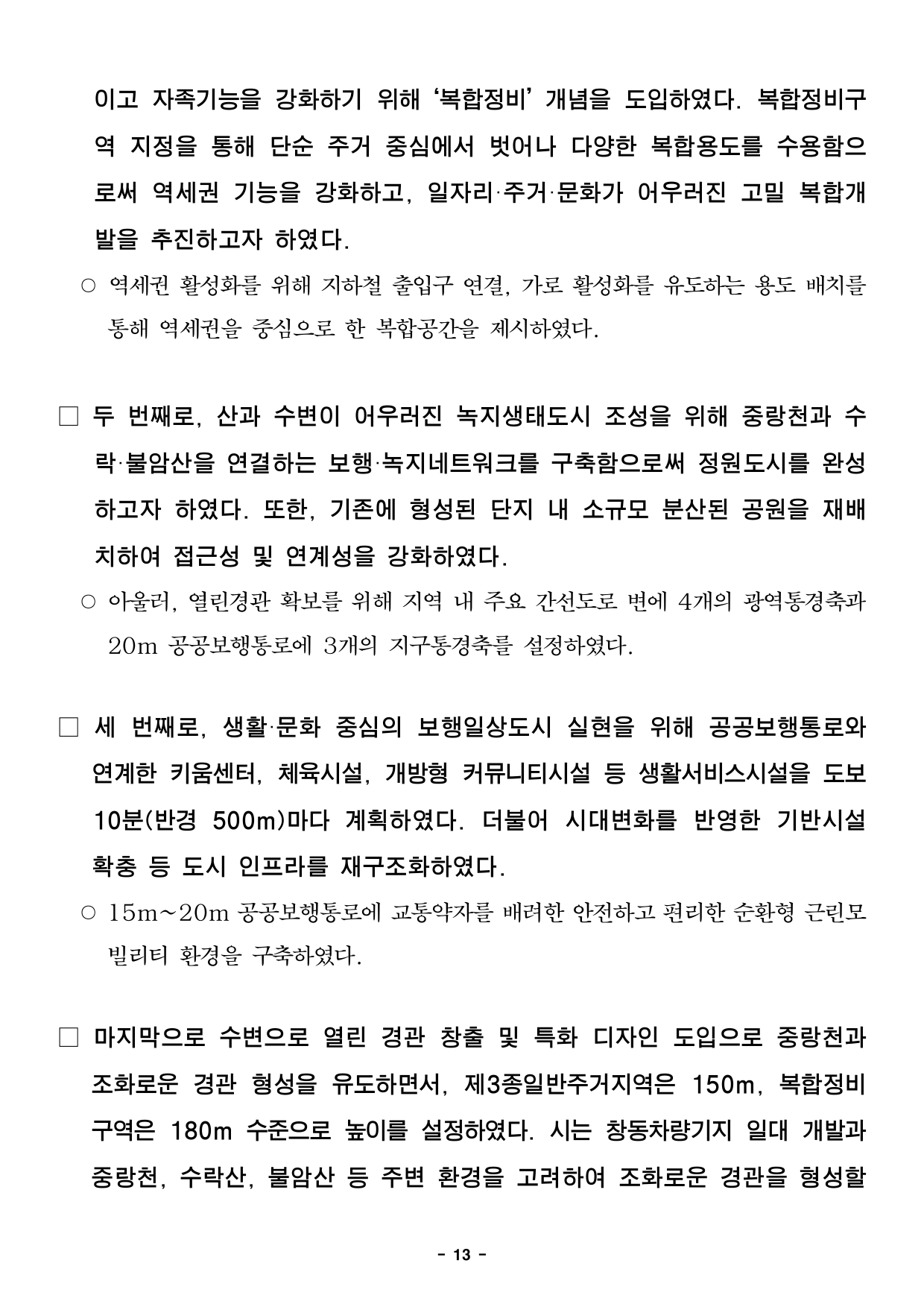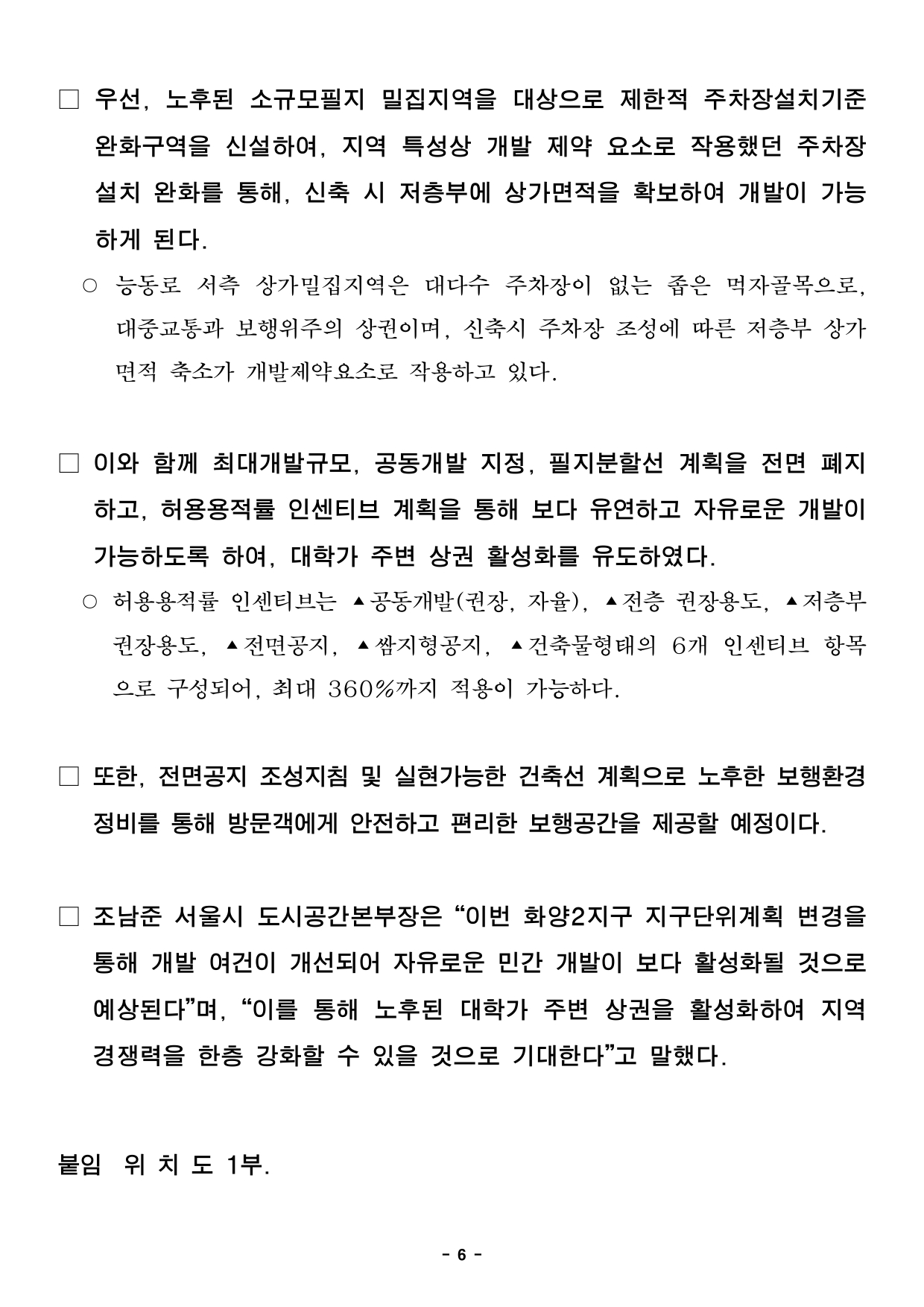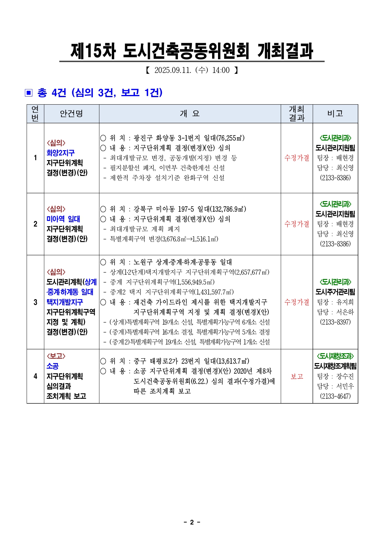 - 1 - 2025. 9. 11.(목) 석간용 이 보도자료는 2025년 9월 11일 오전 10:00부터 보도할 수 있습니다. 보도자료담당부서 : 도시공간본부 도시관리과 도시관리과장 신동권 2133-8370 도시관리정책팀장 이현정 2133-8372 사진없음 ▣ 사진있음 □ 쪽수 : 2쪽 서울도시공간포털 (도시건축공동위원회) http://urban.seoul.go.kr (https://commission.eseoul.go.kr/ ) 제15차 서울특별시 도시·건축공동위원회 개최결과□ 금일 위원회 상정 안건 : 총 4건 ㅇ 수정가결 : 3건 ㅇ 보 고 : 1건 ※ 안건에 대한 자세한 내용은 붙임 소관부서에 문의하여 주시기 바랍니다. 붙임 개최결과 1부. 끝. - 2 - 제15차 도시건축공동위원회 개최결과【 2025.09.11. (수) 14:00 】 ▣ 총 4건 (심의 3건, 보고 1건) 연 번 안건명 개 요 개최 결과 비고1 <심의> 화양2지구 지구단위계획 결정(변경)(안) ○ 위 치 : 광진구 화양동 3-1번지 일대(76,255㎡) ○ 내 용 : 지구단위계획 결정(변경)(안) 심의 - 최대개발규모 변경, 공동개발(지정) 변경 등 - 필지분할선 폐지, 이면부 건축한계선 신설 - 제한적 주차장 설치기준 완화구역 신설 수정가결 <도시관리과> 도시관리지원팀팀장 : 배현경담당 : 최신영(2133-8386) 2 <심의> 미아역 일대 지구단위계획 결정(변경)(안) ○ 위 치 : 강북구 미아동 197-5 일대(132,786.9㎡) ○ 내 용 : 지구단위계획 결정(변경)(안) 심의 - 최대개발규모 계획 폐지 - 특별계획구역 변경(3,676.8㎡→1,516.1㎡) 수정가결 <도시관리과> 도시관리지원팀팀장 : 배현경담당 : 최신영(2133-8386) 3 <심의> 도시관리계획(상계 ․중계․하계동 일대 택지개발지구 지구단위계획구역 지정 및 계획) 결정(변경)(안) ○ 위 치 : 노원구 상계․중계․하계․공릉동 일대 - 상계(1․2단계)택지개발지구 지구단위계획구역(2,657,677㎡) - 중계 지구단위계획구역(1,556,949.5㎡) - 중계2 택지 지구단위계획구역(1,431,597.7㎡) ○ 내 용 : 재건축 가이드라인 제시를 위한 택지개발지구 지구단위계획구역 지정 및 계획 결정(변경)(안) - (상계)특별계획구역 19개소 신설, 특별계획가능구역 6개소 신설 - (중계)특별계획구역 16개소 결정, 특별계획가능구역 5개소 결정 - (중계2)특별계획구역 19개소 신설, 특별계획가능구역 1개소 신설 수정가결 <도시관리과> 도시주거관리팀팀장 : 유지희담당 : 서은하(2133-8397) 4 <보고> 소공 지구단위계획 심의결과 조치계획 보고 ○ 위 치 : 중구 태평로2가 23번지 일대(13,613.7㎡) ○ 내 용 : 소공 지구단위계획 결정(변경)(안) 2020년 제8차 도시건축공동위원회(6.22.) 심의 결과(수정가결)에 따른 조치계획 보고 보고 <도시재창조과>도시재창조계획팀팀장 : 장수진담당 : 서민우(2133-4647) - 3 - 2025. 9. 11.(목) 석간용 이 보도자료는 2025년 9월 11일 오전 10:00부터 보도할 수 있습니다. 보도자료담당부서 : 도시공간본부 도시관리과 도시관리과장 신동권 2133-8370 도시관리정책팀장 이현정 2133-8372 사진없음 ▣ 사진있음 □ 쪽수 : 2쪽 서울도시공간포털 (도시건축공동위원회) http://urban.seoul.go.kr (https://commission.eseoul.go.kr/ ) 제4차 서울특별시 도시·건축공동위원회 수권분과위원회 개최결과 □ 금일 위원회 상정 안건 : 총 1건 ㅇ 수정가결 : 1건 ※ 안건에 대한 자세한 내용은 붙임 소관부서에 문의하여 주시기 바랍니다. 붙임 개최결과 1부. 끝. - 4 - 제4차 도시건축공동위원회 수권분과위원회 개최결과【 2025.09.11. (수) 14:00 】 ▣ 총 1건 (심의 1건) 연 번 안건명 개 요 개최 결과 비고5 <재심의> 도시관리계획 (압구정 아파트지구 지구단위계획 결정(변경), 특별계획구역⑧ 세부개발계획) 결정(변경)(안) ○ 위 치 : 강남구 압구정동 494번지 일대(20,362.9㎡) ○ 내 용 : 도시건축디자인 혁신사업에 따른 압구정아파트지구 지구단위계획 결정(변경) 및 특별계획구역⑧ 세부개발계획 결정(변경) ※ 2025년 제3차 수권분과위원회 심의결과 보류(7.15.) - 도시계획시설(도로) 신설(1개소) 및 변경(3개소) - 경관계획 변경(야간경관 특화구간 신설) - 창의혁신디지안 세부계획(신설) 수정가결 <미래공간담당관> 미래공간정책팀팀장 : 권경희담당 : 김대원(2133-7623) - 5 - 2025. 9. 11.(목) 석간용 이 보도자료는 2025년 9월 11일 오전 10:00부터 보도할 수 있습니다. 보도자료담당 부서: 도시공간본부 도시관리과 도시관리과장 신동권 2133-8370 도시관리지원팀장 배현경 2133-8383 사진 없음 □ 사진 있음 ▣ 쪽수: 3쪽 화양2지구 지구단위계획 결정(변경)(안)“수정가결”- 주차장 설치기준 완화를 통한 대학가 주변 상권기능 활성화- 최대개발규모, 공동개발(지정), 필지분할선 폐지 등 자율적 개발을 위한 규제완화- 건축한계선 계획 등 보행환경 개선을 통한 방문객 유입 유도□ 서울시는 2025년 9월 10일 개최한 제15차 도시·건축공동위원회를개최하여 화양2지구 지구단위계획 결정(변경)(안)에 대하여 “수정가결”하였다고 밝혔다. □ 대상지는 지하철 환승역인 건대입구역을 포함하여 대중교통 이용이편리하며, 주변에 건국대학교, 대학병원, 대규모점포 등이 입지한 지역이다.또한, 이면부는 외식업, 패션잡화 중심의 저층 소규모 소매업이밀집해상권을 이루는 등 다양한 기능이 복합되어 있다. □ 이번 지구단위계획 변경은 2011년 지구단위계획 재정비 이후주변지역여건 