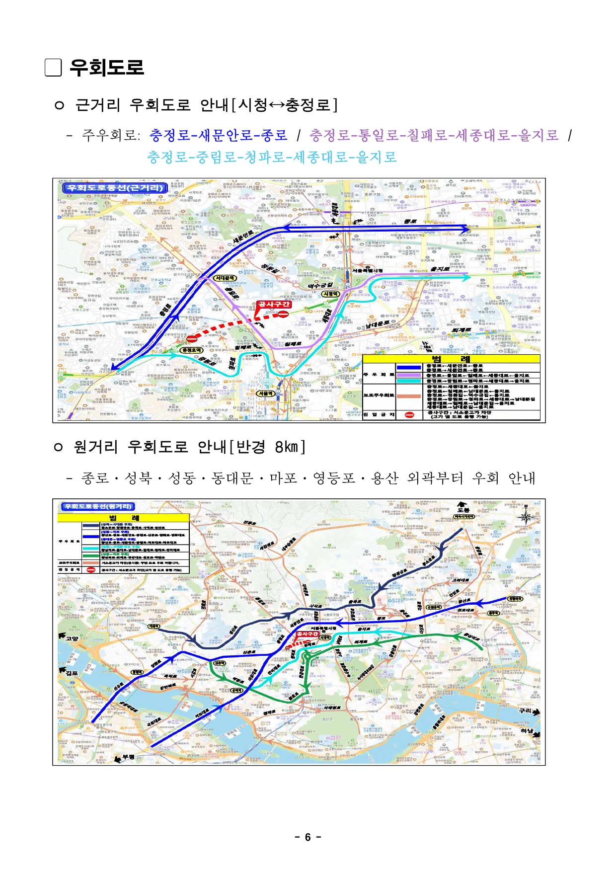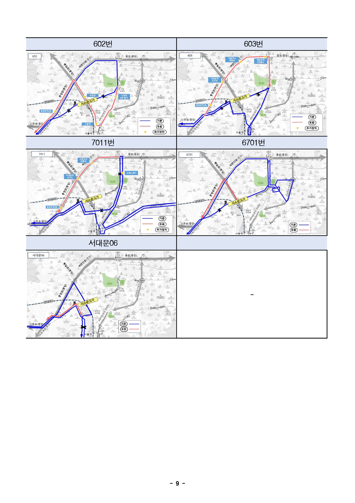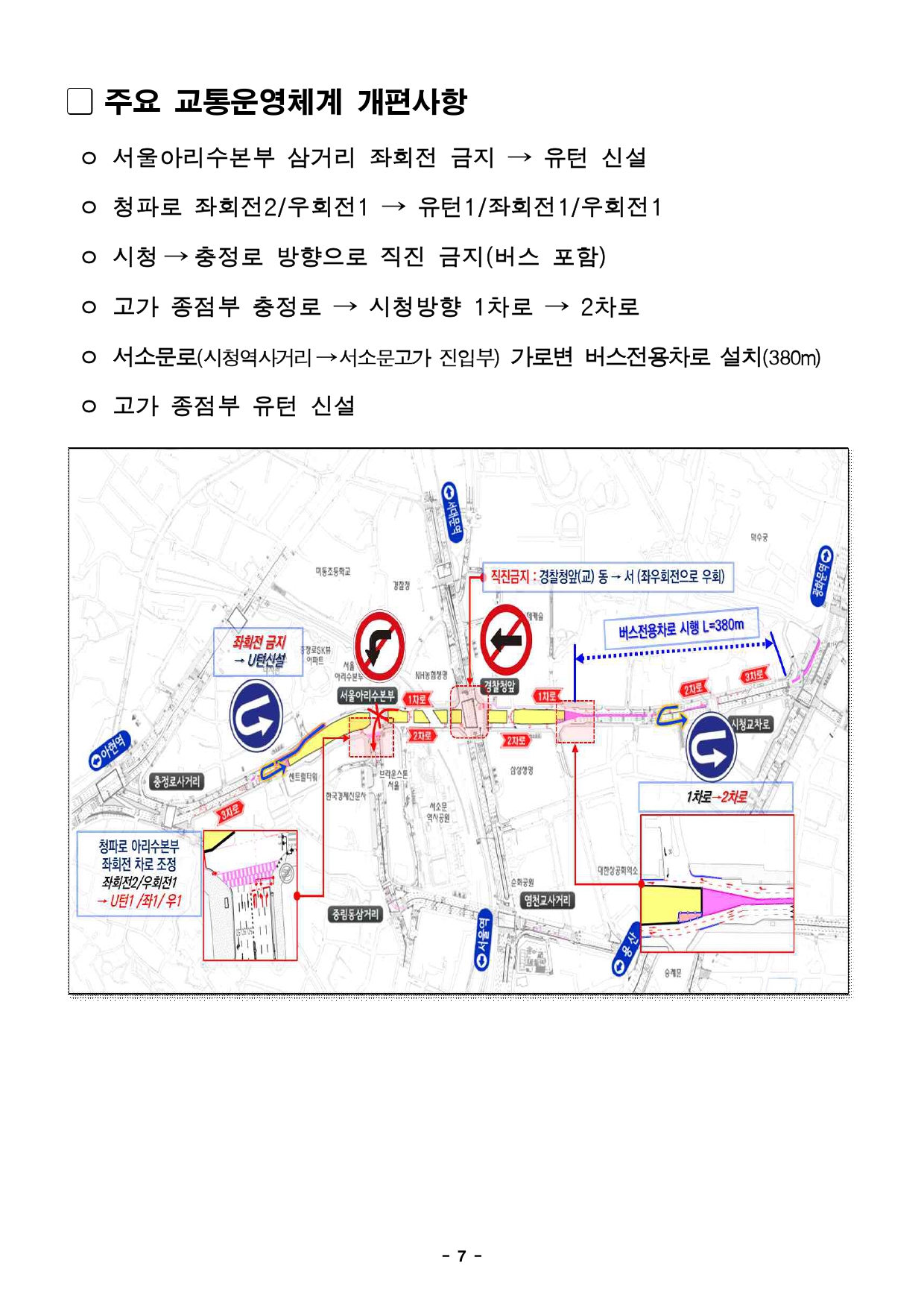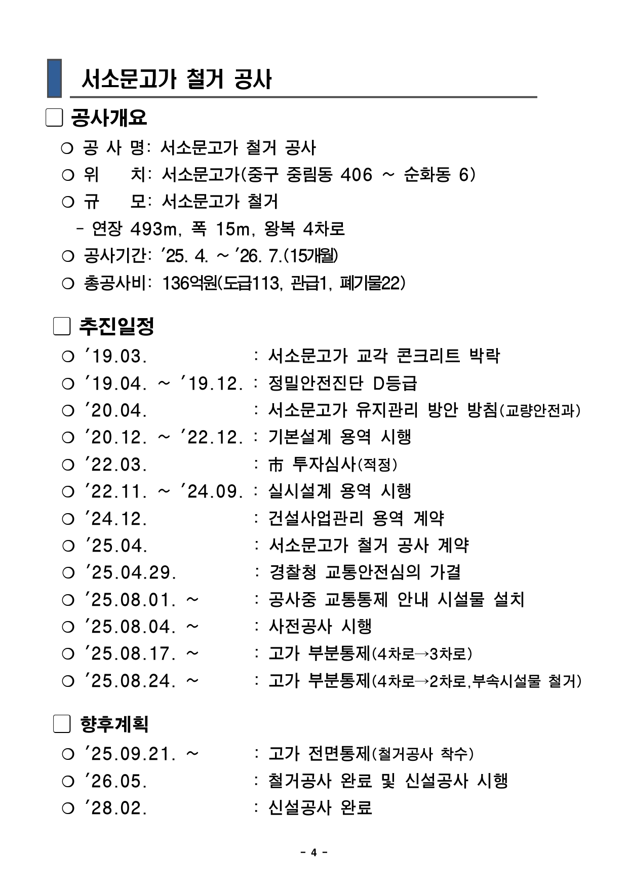 - 1 - 2025. 9. 16.(화) 조간용 이 보도자료는 2025년 9월 15일 오전 11:15부터 보도할 수 있습니다. 보도자료담당 부서: 도시기반시설본부 토목부(공사) 토목부장 최진우 6438-2108 광역도로과장 김소연 6438-2120 재난안전실 교량안전과(계획) 교량안전과장 김동철 02-2133-1940특수교량팀장 박영철 02-2133-1951교통실 교통운영과(교통) 교통운영과장 김상신 02-2133-2450교통안전팀장 김세교 02-2133-2447교통실 버스정책과(교통) 버스정책과장 이자영 2133-2260 사진 없음 □ 사진 있음 ▣ 쪽수: 9쪽 노선팀장 박흥식 2133-2281 서울시, 서소문고가차도 이달 21일(일)부터 전면 통제…철거공사 본격 착수- 2026년 5월 철거 완료 후 신설 공사 착수, 2028년 2월 준공 목표 - 경의중앙선 건널목 안전확보 위해 고가 하부 교차로 직진·좌회전 일부 제한 및우회로운영- 전면 통제에 따라 광역·시내버스 31개 노선 우회…일반차량도 인근 도로 우회협조당부□ 서울시는 오는 9월 21일(일) 0시부터 서소문고가차도를 전면 통제하고본격적인 철거공사에 착수한다고 밝혔다. ○ 1966년 준공 이후 59년 동안 도심 교통의 핵심 역할을 해 온 서소문고가차도는 정밀안전진단에서 ‘D등급’ 판정을 받아 더 이상 시민안전을담보할 수 없는 상태이다. ○ 2019년 교각 콘크리트 탈락, 2021년 바닥판 붕괴, 2024년 보손상등구조물 파손이 반복되면서 서울시는 시민의 생명과 안전 확보를 위해철거를 추진하게 됐다. - 2 - □ 철거공사는 약 8개월간 진행되어 내년 5월 완료를 목표로 한다. 이후신설공사를 착수해 2028년 2월 준공을 목표로 하고 있다. □ 공사 기간 중 고가 하부에 있는 경의중앙선 철도 건널목의 사고 예방을위해시청→충정로 방향 교차로 직진은 금지된다. 차량은 통일로, 새문안로, 칠패로등 주변도로로 우회해야 한다. 또한 서소문 고가 하부 아리수본부앞에서는서소문로에서 청파로로 좌회전이 금지되며, 청파로로 진입하려면조금더직진해 전방 횡단보도에서 유턴해야 한다. □ 대중교통을 이용하는 시민을 위해 서소문로 시청역교차로→서소문고가방면380m 구간에 가로변 버스전용차로가 신설되어 전일제로 운영된다. 버스도단계적으로 우회한다. 지난 8월 17일부터 경기·인천 광역버스 20개노선이이미 우회 운행을 시작했으며, 9월 21일부터는 서울 시내·심야버스11개노선도 충정로, 세종대로, 통일로 등을 경유하여 운행한다. ○ 172번, 472번 등 기존 서소문고가를 왕복하던 5개 노선은 충정로~통일로~세종대로로, 600번, 602번 등 편도 통과 노선은 세종대로~통일로~충정로로 경로가 변경된다. ○ 자세한 우회 경로는 서울시 누리집, 토피스, 정류소 안내문과 버스내부에부착된 안내문에서 확인할 수 있다. □ 일반차량은 가급적 서소문로를 피하고 인근 도로를 이용해야 한다. 서울외곽에서 도심으로 진입할 때는 성산로와 사직로로 진입하거나 마포대로에서만리재로와 청파로를 통해 세종대로 방면으로 진입하면 된다. 서울도심에서 외곽으로 나갈 때는 세종대로에서 사직로로 우회하거나 새문안로와충정로, 청파로와 만리재로를 경유해 이동하면 된다. - 3 - □ 서울시는 경찰청·자치구·교통전문가와 협력하여 공사 구간을 지속적으로모니터링하며 교통혼잡을 최소화할 계획이다. ○ 주요 교차로에는 모범운전자, 보행안전도우미 등 30여 명의 안내인력을탄력적으로 배치하여 차량 흐름과 보행 안전을 관리할 계획이다. ○ 도로전광판(VMS), 버스정류장 안내기, SNS, 내비게이션 앱 등다양한매체로 실시간 교통정보를 제공한다. □ 안대희 서울시 도시기반시설본부장은 “9월 21일 전면 통제로 교통혼잡이예상되는 만큼, 시민 여러분께서는 가급적 승용차 이용을 자제하고지하철등 대중교통을 적극 이용해 주시길 부탁드린다.”라며, “서울시는공사기간시민불편을 최소화하고 안전을 최우선으로 공사를 조속히 완료하겠다.”라고말했다. - 4 - 서소문고가 철거 공사 공사개요 ❍ 공 사 명: 서소문고가 철거 공사 ❍ 위 치: 서소문고가(중구 중림동 406 ~ 순화동 6) ❍ 규 모: 서소문고가 철거 - 연장 493m, 폭 15m, 왕복 4차로 ❍ 공사기간: '25. 4. ~ '26. 7.(15개월) ❍ 총공사비: 136억원(도급113, 관급1, 폐기물22) 추진일정 ❍ '19.03. : 서소문고가 교각 콘크리트 박락 ❍ '19.04. ~ '19.12. : 정밀안전진단 D등급 ❍ '20.04. : 서소문고가 유지관리 방안 방침(교량안전과)❍ '20.12. ~ '22.12. : 기본설계 용역 시행 ❍ '22.03. : 市 투자심사(적정) ❍ '22.11. ~ '24.09. : 실시설계 용역 시행 ❍ '24.12. : 건설사업관리 용역 계약 ❍ '25.04. : 서소문고가 철거 공사 계약 ❍ '25.04.29. : 경찰청 교통안전심의 가결 ❍ '25.08.01. ~ : 공사중 교통통제 안내 시설물 설치❍ '25.08.04. ~ : 사전공사 시행 ❍ '25.08.17. ~ : 고가 부분통제(4차로→3차로) ❍ '25.08.24. ~ : 고가 부분통제(4차로→2차로,부속시설물철거) 향후계획 ❍ '25.09.21. ~ : 고가 전면통제(철거공사 착수) ❍ '26.05. : 철거공사 완료 및 신설공사 시행❍ '28.02. : 신설공사 완료 - 5 - 위치도 평면도 시·종점부 현황 시점부(충정로역) 종점부(시청역) - 6 - 우회도로 ㅇ 근거리 우회도로 안내[시청↔충정로] - 주우회로: 충정로-새문안로-종로 / 충정로-통일로-칠패로-세종대로-을