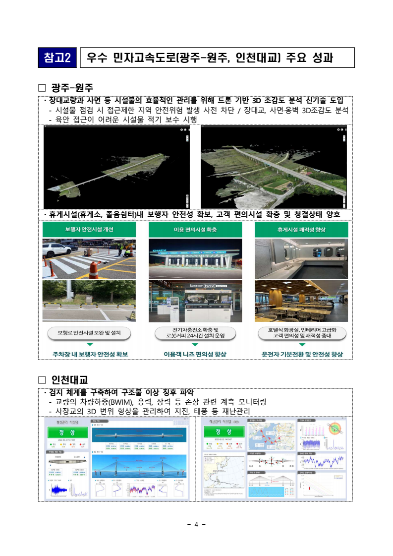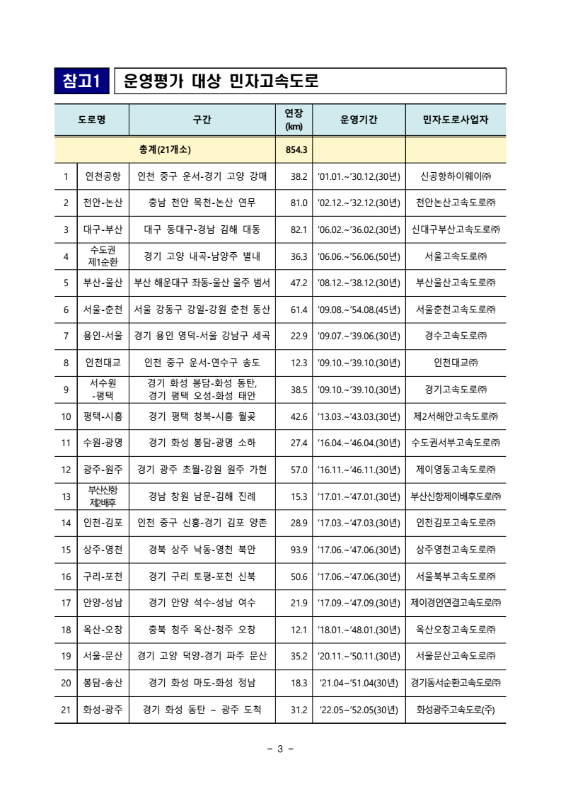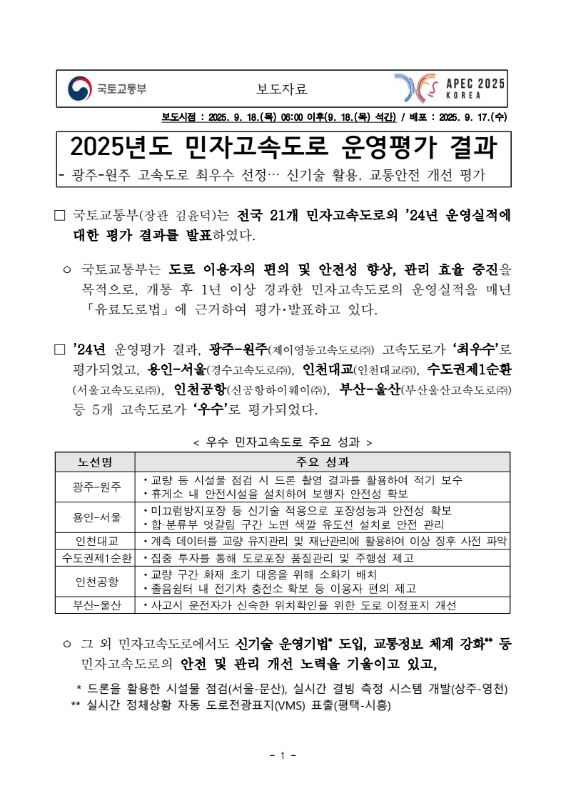 - 1 - 보도자료 보도시점 목 이후 목 석간 : 2025. 9. 18.( ) 06:00 (9. 18.( ) ) / : 2025. 9. 17.( )배포 수2025년도 민자고속도로 운영평가 결과 - - , 광주 원주 고속도로 최우수 선정 신기술 활용 교통안전 개선 평가 … □ 국토교통부( ) 장관 김윤덕 는 전국 개 민자고속도로의 년 운영실적에 21 ’24 대한 평가 결과를 발표하였다. ㅇ 국토교통부는 도로 이용자의 편의 및 안전성 향상 관리 효율 증진 , 을 목적으로 개통 후 년 이상 경과한 민자고속도로의 운영실적을 매년 , 1 「 」 유료도로법 에 근거하여 평가 발표하고 있다. ・ □ ’24년 운영평가 결과, 광주 원주 - ( ) 제이영동고속도로㈜ 고속도로가 ‘ ’ 최우수 로 평가되었고, 용인 서울 - ( ) 경수고속도로㈜ , 인천대교( ) 인천대교㈜ , 수도권제 순환 1 ( ) 서울고속도로㈜ , 인천공항( ) 신공항하이웨이㈜ , 부산 울산 - ( ) 부산울산고속도로㈜ 등 개 고속도로가 5 ‘ ’ 우수 로 평가되었다. < > 우수 민자고속도로 주요 성과 ㆍ ㆍ ㆍ ㆍ ㆍ ㆍ ㆍ ㆍ ㆍ 그 외 민자고속도로에서도 ㅇ 신기술 운영기법* , 도입 교통정보 체계 강화** 등 민자고속도로의 안전 및 관리 개선 노력을 기울이고 있고, * 드론을 활용한 시설물 점검 서울 문산 실시간 결빙 측정 시스템 개발 상주 영천 ( - ), ( - ) ** (VMS) ( - ) 실시간 정체상황 자동 도로전광표지 표출 평택 시흥 - 2 - - 민자고속도로의 교통사고 그 결과, 사망자수가 감소하고(2.4 1.2 ) 명 명 → , 교통 사고 발생시 민자도로사업자의 출동시간이 단축(8 29 7 54 ) 분 초 분 초 → 되는 등의 성과가 나타나고 있는 것으로 분석되었다. □ 평가에는 도로 교통 안전 회계 등 , , , 분야별 전문가와 함께 민자고속도로 이용자*가 전 노선 현장심사를 통해 불편사항 개선필요사항 , 등 현장의 의견을 반영하였다. * , ( , ) 화물차 버스 운전자가 도로 포트홀 고속도로 휴게시설 졸음쉼터 휴게소 의 편의 ・ 시설 등 이용자가 중요하게 인식하는 항목에 대해 평가위원으로 평가 참여 ㅇ 국토교통부는 이번 평가를 통해 확인된 미흡사항은 조속히 개선하는 등 사후관리를 강화하는 한편, 우수 운영사례를 공유하고 해당 민자도로 사업자에게 장관표창( 1, 1) 사업자 직원 및 포상금( 1 , 2 최우수 천만원 우수 각 백만원)을 지급할 예정이다. □ 국토교통부 이우제 도로국장은 민자고속도로의 “ 안전 서비스에 대한 ・ 국민의 요구에 부응하고 기후변화로 인한 자연재해에 적절히 대응할 수 있도록 민자고속도로 운영평가를 더욱 내실있게 강화해 나가겠다 고 밝혔다 ” . 담당 부서 도로국 책임자 과 장 김경헌 (044-201-3897) 도로투자지원과 담당자 사무관 김민수 (044-201-3900) 주무관 박푸른 (044-201-4576) < > 공동 한국교통연구원 책임자 팀 장 이재용 (044-211-3266) 민자도로 관리지원센터 담당자 부연구위원 서창범 (044-211-3172) - 3 - 참고1 대상 민자고속도로 운영평가 도로명 구간 연장 (km) 운영기간 민자도로사업자 총계 개소 (21 ) 854.3 1 인천공항 인천 중구 운서 경기 고양 강매- 38.2 년’01.01. ’30.12.(30 ) ∼ 신공항하이웨이㈜2 천안 논산 - 충남 천안 목천 논산 연무 - 81.0 년’02.12. ’32.12.(30 ) ∼ 천안논산고속도로㈜3 대구 부산 - 대구 동대구 경남 김해 대동 - 82.1 년’06.02. ’36.02.(30 ) ∼ 신대구부산고속도로㈜4 수도권 제 순환 1 경기 고양 내곡 남양주 별내 - 36.3 년’06.06. ’56.06.(50 ) ∼ 서울고속도로㈜5 부산 울산 - 부산 해운대구 좌동 울산 울주 범서- 47.2 년’08.12. ’38.12.(30 ) ∼ 부산울산고속도로㈜6 서울 춘천 - 서울 강동구 강일 강원 춘천 동산- 61.4 년’09.08. ’54.08.(45 ) ∼ 서울춘천고속도로㈜7 용인 서울 - 경기 용인 영덕 서울 강남구 세곡- 22.9 년’09.07. ’39.06.(30 ) ∼ 경수고속도로㈜8 인천대교 인천 중구 운서 연수구 송도 - 12.3 년’09.10. ’39.10.(30 ) ∼ 인천대교㈜9 서수원 -평택 경기 화성 봉담 화성 동탄 - , 경기 평택 오성 화성 태안 - 38.5 년’09.10. ’39.10.(30 ) ∼ 경기고속도로㈜10 평택 시흥 - 경기 평택 청북 시흥 월곶 - 42.6 년’13.03. ’43.03.(30 ) ∼ 제 서해안고속도로2 ㈜11 수원 광명 - 경기 화성 봉담 광명 소하 - 27.4 년’16.04. ’46.04.(30 ) ∼ 수도권서부고속도로㈜12 광주 원주 - 경기 광주 초월 강원 원주 가현- 57.0 년’16.11. ’46.11.(30 ) ∼ 제이영동고속도로㈜13 부산신항 제 배후 2 경남 창원 남문 김해 진례 - 15.3 년’17.01. ’47.01.(30 ) ∼ 부산신항제이배후도로㈜14 인천 김포 - 인천 중구 신흥 경기 김포 양촌- 28.9 년’17.03. ’47.03.(30 ) ∼ 인천김포고속도로㈜15 상주 영천 - 경북 상주 낙동 영천 북안 - 93.9 년’17.06. ’47.06.(30 ) ∼ 상주영천고속도로㈜16 구리 포천 - 경기 구리 토평 포천 신북 - 50.6 년’17.06. ’47.06.(30 ) ∼ 서울북부고속도로㈜17 안양 성남 - 경기 안양 석수 성남 여수 - 21.9 년’17.09. ’47.09.(30 ) ∼ 제이경인연결고속도로㈜18 옥산 오창 - 충북 청주 옥산 청주 오창 - 12.1 년’18.01. ’48.01.(30 ) ∼ 옥산오창고속도로㈜19 서울 문산 - 경기 고양 덕양 경기 파주 문산- 35.2 년’20.11. ’50.11.(30 ) ∼ 서울문산고속도로㈜20 봉담 송산 - 경기 화성 마도 화성 정남 - 18.3 년‘21.04~’51.04(30 ) 경기동서순환고속도로㈜21 화성 광주 - 경기 화성 동탄 광주 도척~ 31.2 년‘22.05~’52.05(30 ) 화성