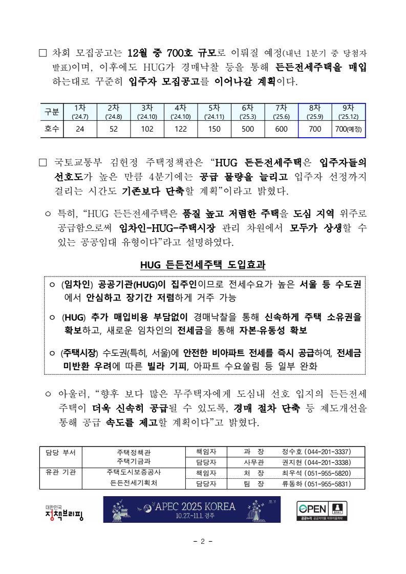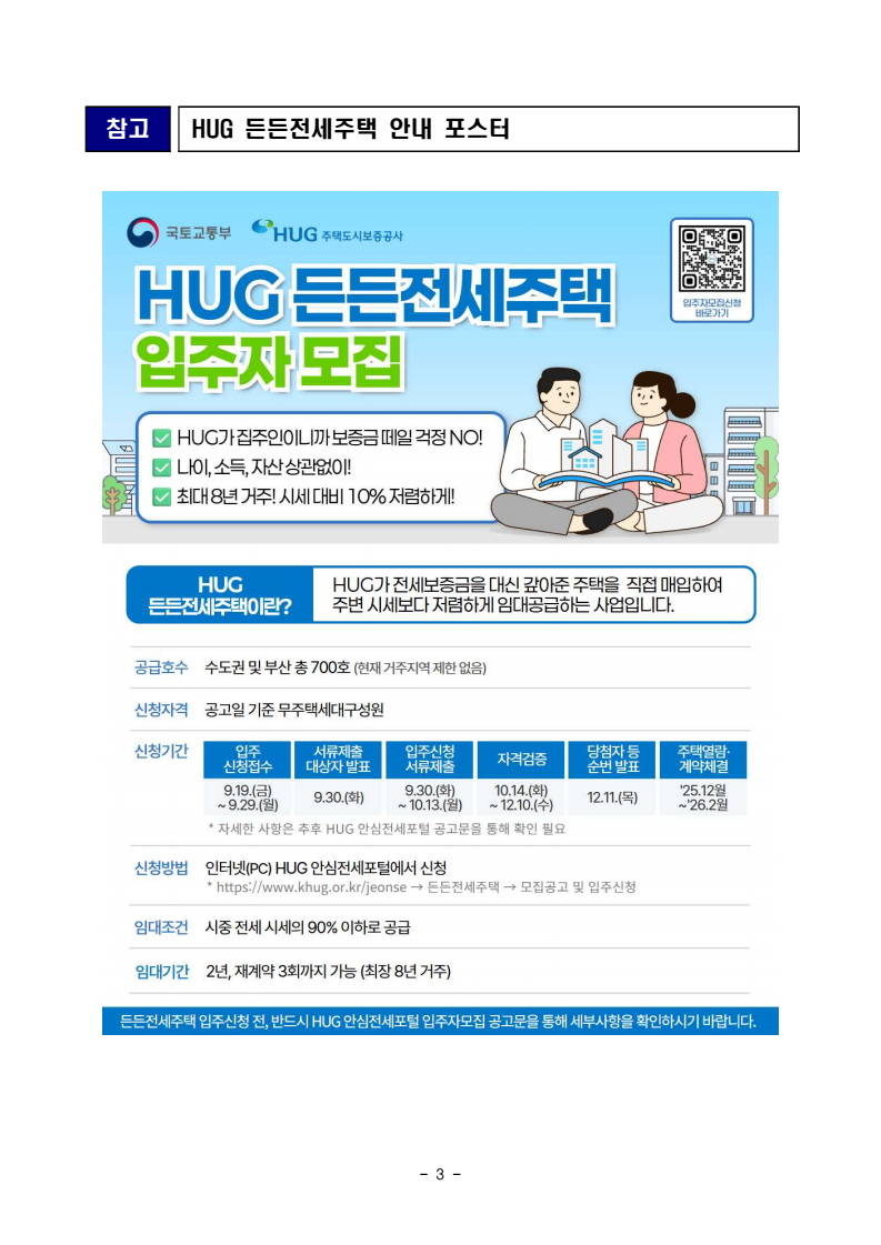 - 1 - 보도자료 보도시점 수 이후 목 조간 : 2025. 9. 17.( ) 11:00 (9. 18.( ) ) / : 2025. 9. 17.( )배포 수HUG 4 1,400 든든전세 분기까지 호 입주자 모집 - 1,550 , 그간 호 모집공고 금번은 수도권에 더해 부산까지 대상 지역을 확대 - 모든 무주택자를 대상으로 시세 대비 저렴하게 최장 년간 안심 거주 가능 8 □ 국토교통부( ) 장관 김윤덕 는 소득 자산 제한 없이 · 모든 무주택자가 전세로 저렴하게 안심하고 장기간 거주할 수 있는 주택도시보증공사( HUG) 이하 든든전세주택을 분기까지 두 차례에 걸쳐 총 4 1,400호 공급한다. □ HUG HUG 든든전세주택은 집주인 대신 전세금을 갚아준 주택을 가 직접 경매 낙찰받아 입주자 부담이 덜한 전세로 공급하는 주택으로, ㅇ 입주자 관점에서는 공공이 집주인으로서 전세금 미반환 걱정 없이 주변 시세 대비 약 수준의 보증금 90% 으로 최장 8년간 살 수 있다는 장점이 있고, HUG로서는 대위변제한 주택의 소유권을 직접 확보하여 임대 운영함으로써 재무 건전성을 회복하는 효과가 있다. HUG 7 ㅇ 는 지난해 월부터 총 호 1,550 에 대한 모집공고를 진행하였으며 대부분 수도권 선호입지*에 공급한 결과 평균 경쟁률이 90 1 대 (최고 경쟁률 대 4,087 1)을 기록하는 등 큰 인기를 끈 바 있다. * 804, 270, 476 1,550 서울 경기 인천 호 등 총 호 입주자 모집 □ 금번 차 모집공고는 8 대상 지역을 기존의 수도권에 더해 부산까지 확대 하였으며 공급 물량 또한 , 전 회차 대비 증가한 700호*로 지원된다. * 323, 145, 224, 8 서울 경기 인천 부산 호 9.19 ㅇ 입주 희망자들은 ( ) 금 부터 안심전세포털 HUG (https://khug.or.kr/jeonse)을 통해 모집공고된 주택의 세부 정보를 확인한 후 온라인으로 입주 신청*이 가능하며 는 무주택 여부 등 검증을 거쳐 , HUG 12.11( ) 목 최종 당첨자를 발표할 예정이다. * ( · · ), , 소재지 시 군 구 보증금 규모 전용면적 등을 선택하여 신청 가능 - 2 - □ 차회 모집공고는 12 700 월 중 호 규모로 이뤄질 예정( 1 내년 분기 중 당첨자 발표)이며 이후에도 가 경매낙찰 등을 통해 , HUG 든든전세주택을 매입 하는대로 꾸준히 입주자 모집공고를 이어나갈 계획이다. 구분 1차 (‘24.7) 2차 (‘24.8) 3차 (‘24.10) 4차 (‘24.10) 5차 (‘24.11) 6차 (‘25.3) 7차 (‘25.6) 8차 (‘25.9) 9차 (‘25.12) 호수 24 52 102 122 150 500 600 700 700( ) 예정 □ 국토교통부 김헌정 주택정책관은 “HUG 든든전세주택은 입주자들의 선호도가 높은 만큼 분기에는 4 공급 물량을 늘리고 입주자 선정까지 걸리는 시간도 기존보다 단축할 계획 이라고 밝혔다 ” . , “HUG ㅇ 특히 든든전세주택은 품질 높고 저렴한 주택을 도심 지역 위주로 공급함으로써 임차인 주택시장 -HUG- 관리 차원에서 모두가 상생할 수 있는 공공임대 유형이다 라고 설명하였다 ” . HUG 든든전세주택 도입효과 ㅇ (임차인) 공공기관 이 집주인 (HUG) 이므로 전세수요가 높은 서울 등 수도권 에서 안심하고 장기간 저렴하게 거주 가능 ㅇ (HUG) 추가 매입비용 부담없이 경매낙찰을 통해 신속하게 주택 소유권을 확보하고 새로운 임차인의 , 전세금을 통해 자본 유동성 확보 · ㅇ (주택시장) ( , ) 수도권 특히 서울 에 안전한 비아파트 전세를 즉시 공급하여, 전세금 미반환 우려에 따른 빌라 기피, 아파트 수요쏠림 등 일부 완화 , “ 든든전세 ㅇ 아울러 향후 보다 많은 무주택자에게 도심내 선호 입지의 주택이 더욱 신속히 공급될 수 있도록, 경매 절차 단축 등 제도개선을 통해 공급 속도를 제고할 계획이다 고 밝혔다 ” . 담당 부서 주택정책관 책임자 과 장 정수호 (044-201-3337) 주택기금과 담당자 사무관 권지현 (044-201-3338) 유관 기관 주택도시보증공사 책임자 처 장 최우석 (051-955-5820) 든든전세기획처 담당자 팀 장 류동하 (051-955-5831) - 3 - 참고 HUG 든든전세주택 안내 포스터