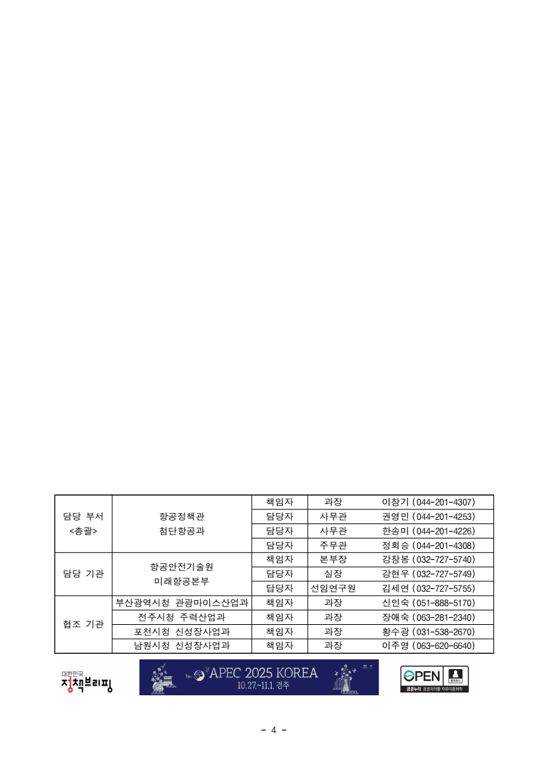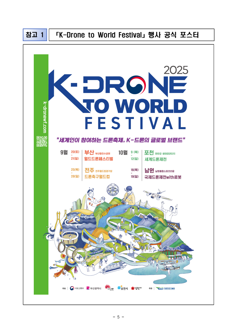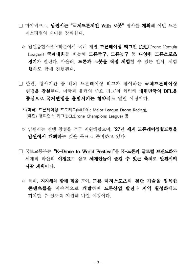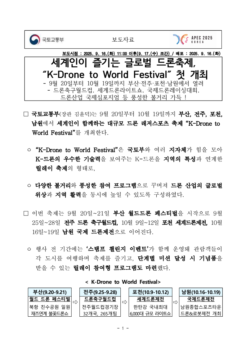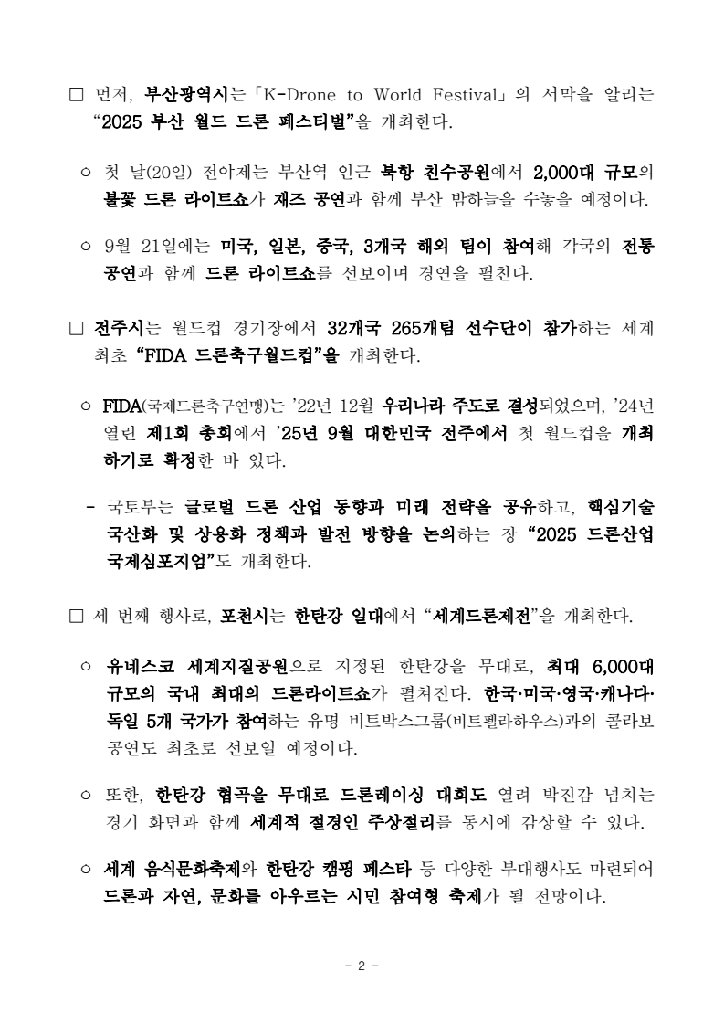 - 1 - 보도시점 화 이후 수 조간 : 2025. 9. 16.( ) 11:00 (9. 17.( ) ) / : 2025. 9. 16.( )배포 화세계인이 즐기는 글로벌 드론축제, “K-Drone to World Festival” 첫 개최 - 9 20 10 19 · · · 월 일부터 월 일까지 부산 전주 포천 남원에서 열려 - , , , 드론축구월드컵 세계드론라이트쇼 국제드론레이싱대회 드론산업 국제심포지엄 등 풍성한 볼거리 가득 ! □ 국토교통부( ) 장관 김윤덕 는 9 20 10 19 월 일부터 월 일까지 , , , 부산 전주 포천 남원에서 “K-Drone to 세계인이 함께하는 대규모 드론 레저스포츠 축제 World Festival”를 개최한다. ㅇ “K-Drone to World Festival”은 국토부와 여러 지자체가 힘을 모아 K-드론의 우수한 기술력을 보여주는 K-드론을 지역의 특성과 연계한 릴레이 축제의 형태로, ㅇ 다양한 볼거리와 풍성한 참여 프로그램으로 꾸며져 드론 산업의 글로벌 위상과 지역 활력을 동시에 높일 수 있도록 구성하였다. □ 이번 축제는 월 일 일 9 20 ~21 부산 월드드론 페스티벌을 시작으로 월 9 25 ~28 일 일 전주 드론 축구월드컵, 10 일 일 월 9 ~12 포천 세계드론제전, 10 월 16 일 일~19 남원 국제 드론제전으로 이어진다. ㅇ 행사 전 기간에는 ‘ ’ 스탬프 챌린지 이벤트 가 함께 운영돼 관람객들이 각 도시를 여행하며 축제를 즐기고, 단계별 미션 달성 시 기념품을 받을 수 있는 릴레이 참여형 프로그램도 마련했다. < K-Drone to World Festival> 부산(9.20-9.21) ⇨ 전주(9.25-9.28) ⇨ 포천(10.9-10.12) ⇨ 남원(10.16-10.19) 월드 드론 페스티벌 북항 친수공원 일원 재즈연계 불꽃드론쇼 드론축구월드컵 전주월드컵경기장 32 , 265 개국 개팀 세계드론제전 한탄강 국내최대 6,000대 규모 라이트쇼 국제드론제전 남원종합스포츠타운 드론 로봇제전 개최 & 보도자료 - 2 - □ 먼저, 부산광역시는 의 서막을 알리는 「 」 K-Drone to World Festival “2025 ” 부산 월드 드론 페스티벌 을 개최한다. ㅇ 첫 날(20 ) 일 전야제는 부산역 인근 북항 친수공원에서 2,000대 규모의 불꽃 드론 라이트쇼가 재즈 공연과 함께 부산 밤하늘을 수놓을 예정이다. 월 일에는 ㅇ 9 21 미국 일본 중국 개국 해외 팀이 참여 , , , 3 해 각국의 전통 공연과 함께 드론 라이트쇼를 선보이며 경연을 펼친다. □ 전주시는 월드컵 경기장에서 32 265 개국 개팀 선수단이 참가하는 세계 최초 “FIDA ” 드론축구월드컵 을 . 개최한다 ㅇ FIDA( ) 국제드론축구연맹 는 년 월 ’22 12 우리나라 주도로 결성되었으며, 년 ’24 열린 제 회 총회 1 에서 ’25 9 년 월 대한민국 전주에서 첫 월드컵을 개최 하기로 확정한 바 있다. - 국토부는 글로벌 드론 산업 동향과 미래 전략을 공유 하고, 핵심기술 국산화 및 상용화 정책과 발전 방향을 논의하는 장 “2025 드론산업 국제심포지엄”도 개최한다. □ 세 번째 행사로, 포천시는 한탄강 일대에서 “세계드론제전” . 을 개최한다 ㅇ 유네스코 세계지질공원으로 지정된 한탄강을 무대로, 최대 대 6,000 규모의 국내 최대의 드론라이트쇼가 펼쳐진다. 한국 미국 영국 캐나다 · · · · 독일 개 국가가 참여 5 하는 유명 비트박스그룹( ) 비트펠라하우스 과의 콜라보 공연도 최초로 선보일 예정이다. , ㅇ 또한 한탄강 협곡을 무대로 드론레이싱 대회도 열려 박진감 넘치는 경기 화면과 함께 세계적 절경인 주상절리 를 동시에 감상할 수 있다. ㅇ 세계 음식문화축제와 한탄강 캠핑 페스타 등 다양한 부대행사도 마련되어 드론과 자연 문화를 아우르는 시민 참여형 축제 , 가 될 전망이다. - 3 - □ 마지막으로, 남원시는 국제드론제전 로봇 “ With ” 행사를 개최해 이번 드론 페스티벌의 대미를 장식한다 . 남원종합스포츠타운에서 국내 ㅇ 개발 드론레이싱 리그인 DFL(Drone Fomula League) 국제대회를 비롯해 드론축구 드론농구 , 등 다양한 드론스포츠 경기가 열린다 아울러 . , 드론과 로봇을 직접 체험할 수 있는 전시 체험 , 행사도 함께 진행된다. □ 편 행사기간 중 해외 드론레이싱 리그가 참여하는 한 , 국제드론레이싱 연맹을 창설한다 미국과 유럽의 주요 리그 . *와 협력해 대한민국의 을 DFL 중심으로 국제연맹을 출범시키는 협약식도 열릴 예정이다. * ( ) (MLDR : Major League Drone Racing), 미국 드론레이싱 프로리그 ( ) (DCL:Drone Champions League) 유럽 챔피언스 리그 등 남원시는 연맹 창설을 적극 지원해왔으며, ’ ㅇ 27 년 세계 드론레이싱월드컵을 남원에서 개최하는 것을 목표로 준비하고 있다. □ 국토교통부는 “K-Drone to World Festival”을 K-드론의 글로벌 브랜드화와 세계적 확산의 이정표로 삼고 세계인들이 즐길 수 있는 축제로 발전시켜 나갈 계획이다. 특히, ㅇ 지자체와 함께 힘을 모아, 드론 레저스포츠와 첨단 기술을 접목한 콘텐츠들을 지속적으로 개발하여 드론산업 발전과 지역 활성화에도 기여할 수 있도록 지원해 나갈 예정이다. - 4 - 담당 부서 < > 총괄 항공정책관 첨단항공과 책임자 과장 이창기 (044-201-4307) 담당자 사무관 권영민 (044-201-4253) 담당자 사무관 한송미 (044-201-4226) 담당자 주무관 정희승 (044-201-4308) 담당 기관 항공안전기술원 미래항공본부 책임자 본부장 강창봉 (032-727-5740) 담당자 실장 강현우 (032-727-5749) 답당자 선임연구원 김세연 (032-727-5755) 협조 기관 부산광역시청 관광마이스산업과 책