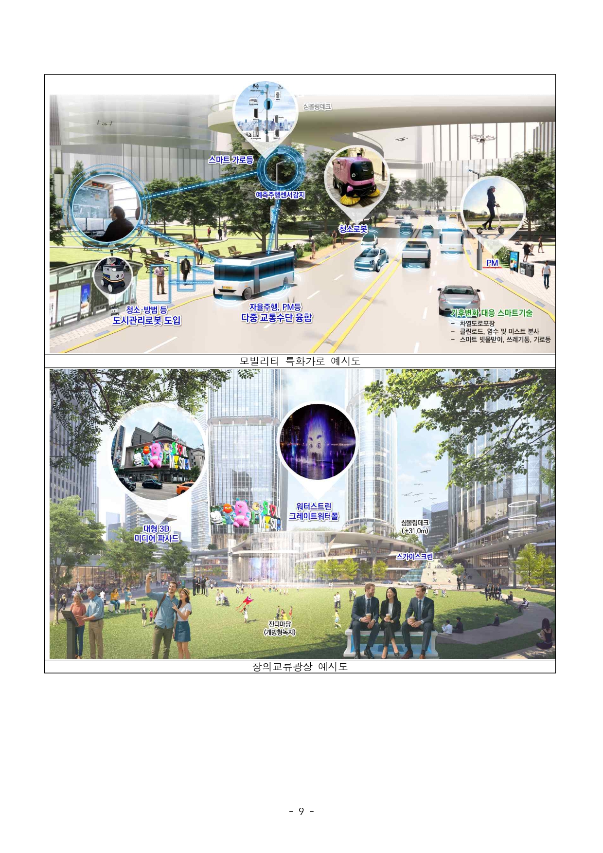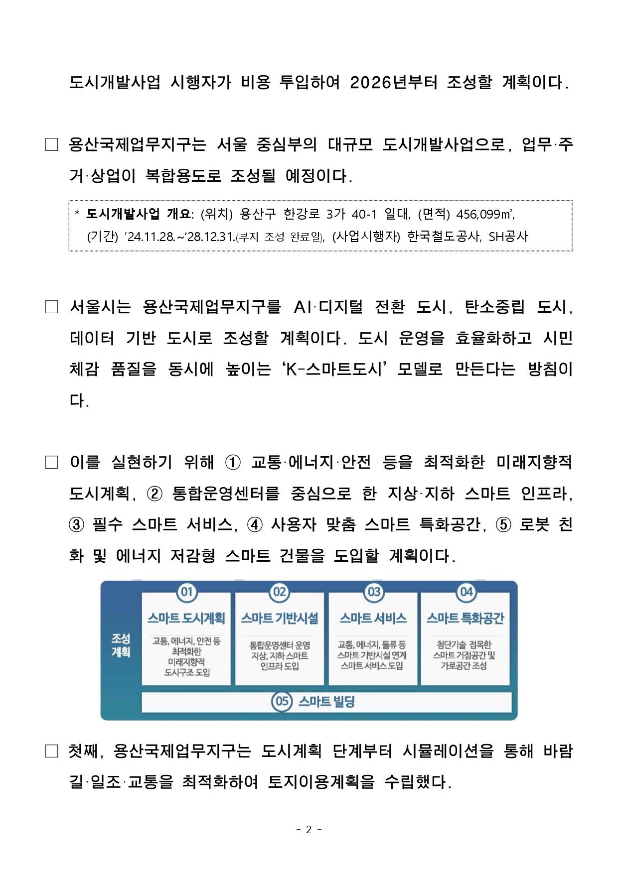 - 1 - 2025. 9. 25.(목) 조간용 이 보도자료는 2025년 9월 25일 오전 11:15부터 보도할 수 있습니다. 보도자료담당 부서: 미래공간기획관 용산입체도시담당관 용산입체도시담당관 배성호 02-2133-9435용산기반시설팀장 홍준형 02-2133-9456담당 주무관 주미 02-2133-9457사진 없음 □ 사진 있음 ▣ 쪽수: 9쪽 관련 누리집 (메뉴) 용산국제업무지구,‘서울 스마트 코어’로 재탄생 : AI·디지털트윈·에너지·첨단물류 등 세계 선도도시 구현 - 통합운영센터 중심으로 데이터 기반 AI·디지털트윈 도시구현 - 스마트도시 조성에 총 841.2억 원 투입, 2026년 상반기 본격 착수 - 도시운영·에너지·물류·교통 등 필수 서비스 단계적 실증… 민관 협력으로속도 - SLW 2025에서 ‘용산 스마트도시관’ 2개 쇼룸 공개, 시민 체험형홍보추진□ 서울시는 용산국제업무지구에 세계 최고 수준의 스마트도시를조성하는 ‘스마트도시 추진계획’을 마련하고, 9월 30일~10월 2일코엑스에서 열리는 SLW 2025에 ‘용산 스마트도시관’ 쇼룸을 마련해시민에게 비전과 핵심 서비스를 공개한다고 밝혔다. □ 용산역 일원 45.6만㎡에 통합운영센터 등 스마트 기반시설을중심으로 AI·디지털트윈·도시에너지관리·첨단물류·자율주행 등 필수서비스를 단계적으로 실증해 ‘데이터로 계획·건설·운영되는 도시’를구현한다. 스마트도시 조성 총사업비는 841.2억 원이며, 용산국제업무지구 - 2 - 도시개발사업 시행자가 비용 투입하여 2026년부터 조성할 계획이다. □ 용산국제업무지구는 서울 중심부의 대규모 도시개발사업으로, 업무·주거·상업이 복합용도로 조성될 예정이다. * 도시개발사업 개요: (위치) 용산구 한강로 3가 40-1 일대, (면적) 456,099㎡, (기간) ’24.11.28.~‘28.12.31.(부지 조성 완료일), (사업시행자) 한국철도공사, SH공사□ 서울시는 용산국제업무지구를 AI·디지털 전환 도시, 탄소중립도시,데이터 기반 도시로 조성할 계획이다. 도시 운영을 효율화하고시민체감 품질을 동시에 높이는 ‘K-스마트도시’ 모델로 만든다는방침이다. □ 이를 실현하기 위해 ① 교통·에너지·안전 등을 최적화한 미래지향적도시계획, ② 통합운영센터를 중심으로 한 지상·지하 스마트인프라,③ 필수 스마트 서비스, ④ 사용자 맞춤 스마트 특화공간, ⑤로봇친화 및 에너지 저감형 스마트 건물을 도입할 계획이다. □ 첫째, 용산국제업무지구는 도시계획 단계부터 시뮬레이션을 통해바람길·일조·교통을 최적화하여 토지이용계획을 수립했다. - 3 - ○ 남산에서 한강으로 이어지는 바람길을 분석하여 녹지축을 설정했다. ○ 일조 분석으로 건물로 인한 공공공간 음영 최소화 및 제로에너지건축물인증 목표 설정을 했으며, 지하 신재생에너지 시설을 통해 도시 에너지자립률을 높인다. ○ 지하도로·지하환승센터·지상환승정류장의 혼잡도와 안전을 사전에시뮬레이션해 차선과 진출입구를 계획했고, ○ 용산국제업무지구와 용산역을 잇는 지하 연결통로는 예상 보행 인구밀도를반영해 폭과 경로를 확대하였다. □ 둘째, 도시정보를 총괄하는 통합운영센터를 지구 중심부에 배치, 에너지·교통·안전·환경 등의 데이터를 실시간으로 수집·분석·대응한다. 지상에는 약 20여 종의 교통·안전·환경 등의 스마트 인프라를조성하여 도시 운영 효율을 극대화한다. 지하에는 유지보수 효율을 높이기 위해 상수·전력·통신·열수송관·물류를 한데 모아 IoT와 센서가 결합된 스마트 공동구를 구축한다. ○ 통합운영센터 : 도시운영 기능을 넘어 주민 커뮤니티와 글로벌 교류의거점으로 운영할 계획이다. ○ 지상 인프라 : 노변기지국(RSE), GPS 신호 중계기, 도시정밀지도, AI 기반 스마트 교차로와 버스 도착안내, 스마트 버스쉘터로 자율주행과대중교통의 시간을 실시간으로 확인하고, 신호·과속·배출가스 단속과 생활방범CCTV, 스마트 횡단보도 등으로 보행 안전성을 높인다. 환경신호등과S-DoT 센서는 미세먼지와 폭염 정보를 실시간 제공하고, 공공 와이파이와 5G 기반 자가망으로 누구나 비용 부담 없이 빠르고 안정적인접속이가능해진다. - 4 - ○ 지하 인프라 : 스마트 공동구를 도입한다. 유지보수 시, 도로를 파헤치지않고도 신속한 점검과 확장이 가능해 도심 생활의 불편을 줄이고, 전문화된 관리로 안전성과 효율을 동시에 확보한다. 공동구 내 지하 물류배송로를 결합해 공동물류시설에서 각 필지로 자동 배송이 되도록 하여지상하역으로 인한 교통 혼잡을 크게 줄이고 탄소 저감에 기여한다. □ 셋째, 스마트 인프라를 움직이는 각종 서비스를 소프트웨어로도입한다. 도시운영·에너지·물류·모빌리티·헬스케어를 필수 서비스로도입하고, ‘두뇌’ 역할을 하는 디지털트윈을 구축한다. ○ 디지털트윈은 1단계로 정밀 3D 모델을 구축하고, 2단계로 각종센서를연동해 실시간 도시 상태를 입체적으로 파악한다. 3단계에서는 AI 예측시뮬레이션을 통해 교통혼잡·에너지피크·재난상황을 사전에 예측하고최적대응 시나리오를 제시해 의사결정의 신속·정확도를 높인다. ○ 에너지 분야는 변전소와 지하 신재생에너지 시설을 핵심 거점으로삼아도시 에너지 관리 시스템(CEMS)을 가동한다. 건물과 지구 