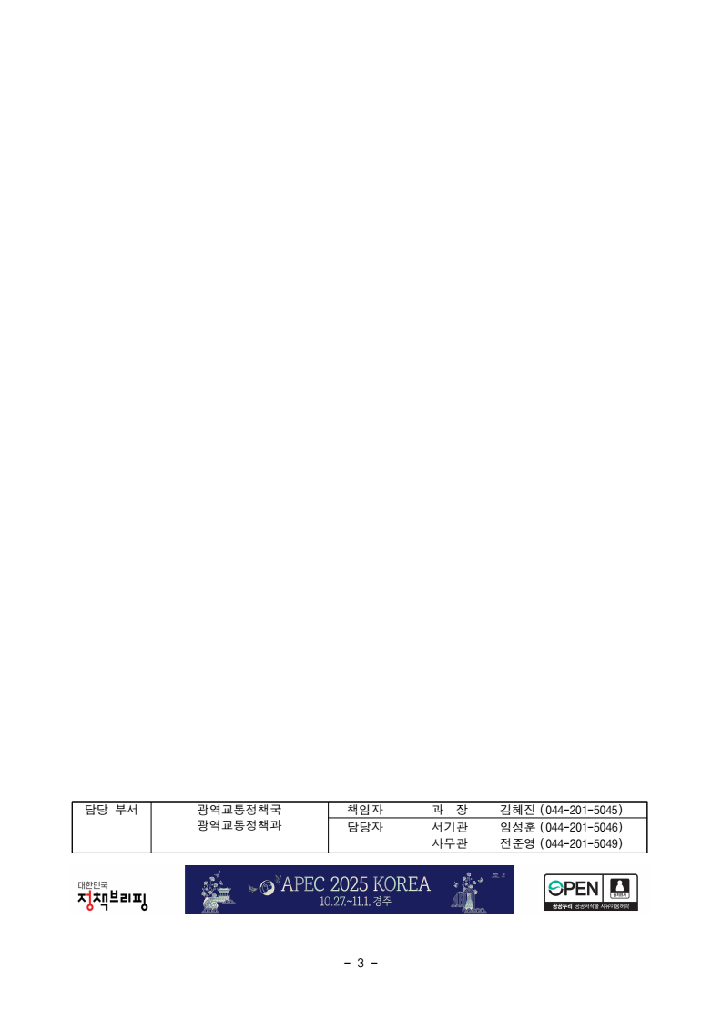 - 1 - 보도자료 보도시점 목 이후 금 조간 : 2025. 9. 25.( ) 11:00 (9. 26.( ) ) / : 2025. 9. 25.( )배포 목“ , ” 광역교통 개선 속도 높이고 성과 키운다 ‘ TF’ · 신도시 교통대책 신속추진 확대 강화 - 갈등조정 신속 인 허가 추진 등 지자체 협력을 통한 광역교통시설 신속 구축 · ‧ □ 국토교통부( , ) 장관 김윤덕 이하 국토부 대도시권광역교통위원회( , 위원장 김용석 이하 대광위)는 월 일 오후 9 26 한국토지주택공사( , LH) 서울본부 이하 에서 ‘신도시 교통대책 신속추진 제 차 전체회의 TF 4 ’ , 를 열고 실질적인 성과 중심의 대책을 논의한다. , , 경기도 등 ㅇ 회의에는 서울시 인천시 지자체 관계자와 한국토지주택공사 ( LH), , 15 참여한다 이하 코레일 국가철도공단 등 개 기관이 . □ ‘신도시 교통대책 신속추진 TF’ 신도시 는 주요 광역교통 개선대책 사업 중 개선 효과가 크거나 이해관계자 간 갈등 등으로 적기 구축이 우려 되는 으로 사업을 대상 ’24년부터 대광위와 지자체 공공기관과 함께 , 운영해 왔다. ㅇ ’24년에는 수도권을 대상으로 32 리 개 사업을 관 하면서 14건의 갈등 사업을 조정하였고 인허가 절차를 신속하게 추진하여 , 사업 기간을 최대 개월 단축 15 시키는 성과가 있었으며, ㅇ ’ 년25 에는 수도권을 넘어 지방권까지 범위를 확대하여 24개 사업을 관리 하고 있으며 현재까지 , 40 , 여 차례의 회의를 통해 갈등조정 인허가 단축 방안 마련 등 광역교통시설 적기 구축을 . 위해 노력하고 있다 <‘25 TF > 년 신도시 교통대책 신속추진 갈등조정 사례 ‣ ( 남양주 왕숙 삼패사거리 입체화 사업) ( VS ) 입체화 방식 고가차도 지하차도 을 두고 장기간 이어진 갈등에 대해 현장점검 전문가 검토 등을 거쳐 도로 확장 대안으로 조정 , ‘ ’ ‣ (과천 지식정보 47 국도 호선 우회도로 사업) 방음터널 사업비 증가에 따라 사업비 부담주체를 두고 갈등이 있었으나 태양광 설치 조건부 합의 라는 해법으로 조정 , ‘ ’ - 2 - □ 「 」 이번 전체회의는 최근 발표된 주택공급 확대방안 과 연계하여 (9.7) , 그간의 성과를 점검하고 TF TF · 를 한층 더 확대 강화하여 신도시 교통 문제가 발생하지 않도록, 지속적이고 체계적인 관리체계를 구축하기 위해 마련되었다. ① ( ) ’ 사업대상 확대 25 TF 24 개 추가 년 의 개 사업에 집중관리가 필요한 4 사업을 더해 총 개 사업 28 의 갈등조정 또는 인허가 기간 단축을 추진 할 예정이다. ② (TF 구성 강화) 에 국토부 지자체 사업시행자 외에도 TF , , 광역교통 개선 대책 수립권자( · , · ) 시 도 국토부 공공주택추진단 토지정책관 등 와 민간 전문가까지 참여범위를 확대한다. 이를 통해 의사결정이 신속하고 실효성 있게 이뤄지도록 한다 또한 갈등이 복잡한 사업에는 . 민간 갈등조정 위원이 참여 해 객관적이고 합리적인 조정이 가능하도록 할 예정이다. ③ ( : ) 운영 방식 전환 단년도 지속관리 → 거에는 과 TF가 단년도 단위로 운영되며 일정 단계가 끝나면 종료되는 방식이었지만 이제는 사업 착공 , 시점까지 지속 관리하는 방식으로 전환한다 이를 위해 . 반기마다 대광 위원장이 직접 주재하는 전체 점검회의를 열고 필요하면 사업별 , TF를 추가로 개최해 돌발변수에도 즉각 대응할 수 있도록 한다. ④ (제도개선 발굴) TF회의 과정에서 드러나는 문제점을 바탕으로 제도 개선 과제를 발굴해, 인허가 절차를 간소화하거나 협의 프로세스를 정비하는 등 광역교통 인프라 구축 전반을 제도적으로 보완할 예정이다. □ 김용석 대광위원장은 “주택공급 확대 정책에 따른 ‘신도시 교통대책 신속 추진 TF’의 운영은 광역교통시설의 적기 구축을 통해 주민들이 오랫동안 겪어온 교통 불편을 줄이고 출퇴근 시간을 단축하는 데 큰 효과가 있을 것으로 기대된다 며” , ㅇ “모든 관계기관이 원팀 ‘ ’이 되어 더 나은 교통 편의를 위해 최선의 노력을 다 할 것” . 이라고 말했다 - 3 - 담당 부서 광역교통정책국 책임자 과 장 김혜진 (044-201-5045) 광역교통정책과 담당자 서기관 사무관 임성훈 전준영 (044-201-5046) (044-201-5049) - 4 - 참고 TF 신도시 교통대책 신속 추진 사업 리스트 연번 지구 사업명 비고 1 고양 창릉 고양은평선 ‘24년 선정 2 화전역 환승시설 ‘24년 선정 3 백석동 화전동 도로 확장 ~ ‘24년 선정 4 남양주 왕숙 경의중앙선 역사신설 ‘24년 선정 5 강동하남남양주선 ‘24년 선정 6 경춘선 역사 신설 정차 (GTX-B ) ‘25년 선정 7 상봉 마석간 셔틀열차 ~ ‘25년 선정 8 한강교량신설 및 올림픽대로 확장 ‘25년 신규 선정 9 지방도 호선 확장 383 ‘25년 신규 선정 10 과천 지식 국도 호선 우회도로 신설 47 ‘24년 선정 11 하남 감일 초광삼거리 확장 ‘24년 선정 12 하남 교산 송파하남선 ‘24년 선정 13 동남로 연결도로 신설 ‘24년 선정 14 동남로 확장 및 개선 ‘24년 선정 15 중앙보훈병원역 환승시설 ‘25년 선정 16 서하남로 확장 사업지구 초광삼거리 ( ~ ) ‘25년 선정 17 화성 동탄2 동탄역 환승센터 ‘24년 선정 18 양정 역세권 국도 호선 확장 6 ‘24년 선정 19 시도 호선 확장 13 ‘24년 선정 20 왕숙 양정 연결도로 2~ 1 ‘25년 선정 21 수석 호평간 고속화도로 연결로 설치 ~ ‘25년 선정 22 삼패사거리 입체화 ‘25