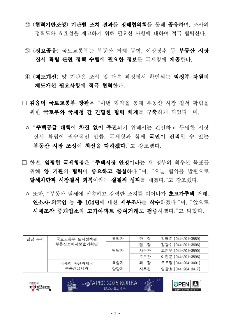 - 1 - 보도자료 보도시점 : 2025. 10. 1.( ) 12:00 수 이후(10. 1.( ) ) 수 석간 / : 2025. 9. 30.( )배포 화부동산 시장 거래질서 확립을 위한 「 」 국토부 국세청 간 업무협약 체결 - - - 국토부 국세청간 정례협의회를 통해 부처간 칸막이 해소 - 부동산 시장 거래 동향 의심사례 및 기관별 조치 결과를 공유하고 부동산 , 시장 감독을 강화하기 위한 업무협력 기반 마련 □ 국토교통부( ) 장관 김윤덕 와 국세청( ) 청장 임광현 은 부처 간 협업을 통해 부동산 시장의 이상거래를 방지하고, 편법 증여와 세금탈루 등 불법행위에 신속 하게 대응하기 위해 10 1 월 일( ) 수 (MOU) 업무협약 을 체결하였다. * (일자 수 장소 세종정부청사 동 국제회의실 참석 국토교통부장관 주택토지 ) ’25.10.1( ) ( ) 6 ( ) , 실장 토지정책관 부동산소비자보호기획단장 국세청장 자산과세국장 부동산납세과장 , , . , , □ 이번 업무협약은 월 일 발표된 9 7 「주택공급 확대방안」의 후속조치 중 하나로 부처간 협업을 통해 , 부동산 시장의 감독 기능을 강화하기 위하여 실시한다. 앞으로 양 기관은 협약을 바탕으로 ㅇ 정례협의회를 개최하여 기관별 조사 조치 결과 · 를 공유하고 부동산 불법행위 조사 단속의 정확성과 , · 효율성을 높일 수 있는 협력방안을 논의하게 되며, 양 기관의 긴밀한 ㅇ 협력을 바탕으로 불법행위에 대해 보다 신속하고 효과적인 대응 이 가능할 것으로 기대된다. □ 이번 업무협약의 주요 내용은 다음과 같다. ( ① 조사협조) 불법행위가 의심되어 상대기관으로부터 통보받은 사건에 대하여는 신속하게 조사 및 단속 등 조치한다. - 2 - ( ② 협력기반조성) 기관별 조치 결과를 정례협의회를 통해 공유하며 조사의 , 정확도와 효율성을 제고하기 위해 필요한 사항에 대하여 적극 협력한다. ( ③ 정보공유) , 국토교통부는 부동산 거래 동향 이상징후 등 부동산 시장 질서 확립 관련 정책 수립에 필요한 정보를 국세청에 제공한다. ( ④ 제도개선) 양 기관은 조사 및 단속 과정에서 확인되는 범정부 차원의 제도개선 필요사항에 적극 협력한다. □ 김윤덕 국토교통부 장관은 이번 협약을 통해 부동산 시장 질서 확립을 “ 위한 국토부와 국세청 간 긴밀한 협력 체계를 구축하게 되었다 며” , “ ㅇ 주택공급 대책이 차질 없이 추진되기 위해서는 건전하고 투명한 시장 질서 확립이 필수적인 만큼 국세청과 함께 , 국민이 신뢰할 수 있는 부동산 시장 조성에 최선을 다하겠다.” . 고 강조했다 □ 한편, 임광현 국세청장은 “주택시장 안정이라는 새 정부의 최우선 목표를 위해 양 기관의 협력이 중요하고 절실하다 며 오늘 협약을 발판으로 .” , “ 탈세차단과 시장질서 회복이라는 실질적 성과를 내겠다 고 강조했다 .” . 또한 부동산 탈세에 신속하고 강력한 조치를 이어나가 ㅇ , “ 초고가주택 거래, 연소자 외국인 ・ 등 총 명 104 에 대한 세무조사를 착수하겠다 며 앞으로 .” , “ 시세조작 중개업소와 고가아파트 증여거래도 검증하겠다 고 밝혔다 .” . 담당 부서 국토교통부 토지정책관 책임자 단 장 김명준 (044-201-3589) 부동산소비자보호기획단 담당자 팀 장 김광수 (044-201-3606) 사무관 고건우 (044-201-3590) 주무관 이진문 (044-201-3596) 국세청 자산과세국 책임자 과 장 오은정 (044-204-3401) 부동산납세과 담당자 사무관 양창호 (044-204-3417)