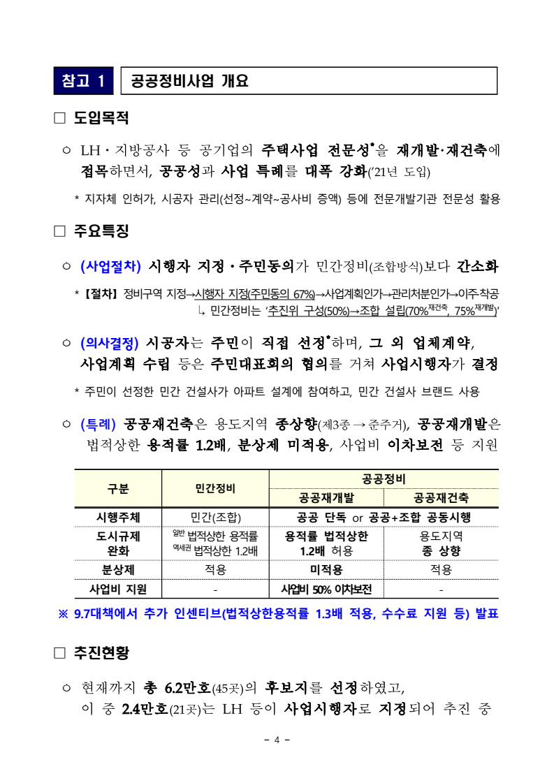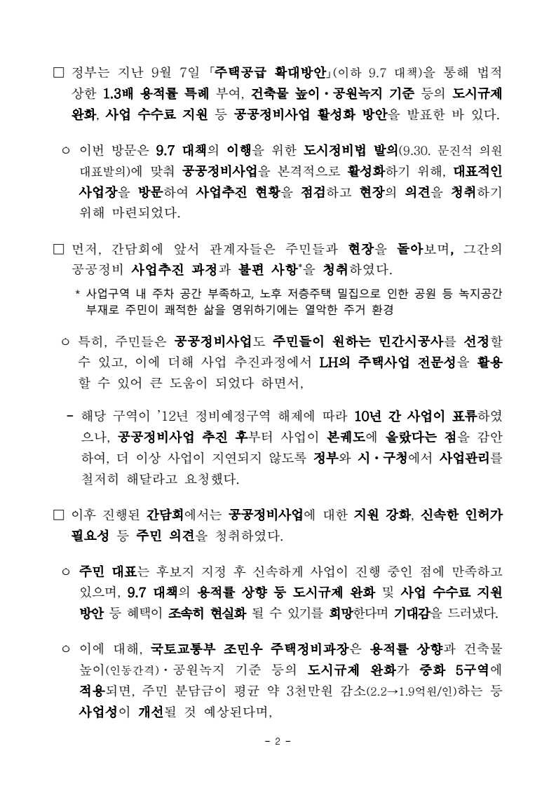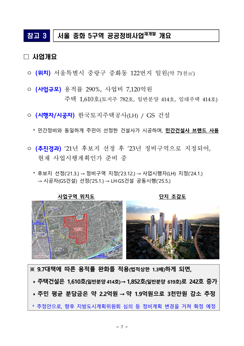 - 1 - 보도자료 보도시점 : 2025. 9. 30.(화) 15:00 이후(10. 1.(수) 조간) / 배포 : 2025. 9. 30.(화) 공공 주도 정비사업, 부담은 낮추고 속도는 높인다- 30일, 서울 중화5 구역 사업 현장 찾아 공공정비사업 활성화 의지 강조- 도시정비법 개정 등 신속한 9.7 대책 후속조치를 통해 주민 체감 가속화□ 국토교통부(장관 김윤덕)는 9월 30일 오전 서울 중화5 공공정비사업구역을방문하여 사업추진 현황을 점검하고, 주민과 관계기관[중랑구, 한국토지주택공사(LH)], 시공자(GS 건설)와 간담회*를 가졌다. * (참석) 국토부 주택토지실장, 중랑구 부구청장, LH 서울본부장, GS 건설 도시정비부문장 등ㅇ ’21년 도입된 공공정비사업은 LH 등 공기업의 주택·도시개발 전문성을 정비사업에 접목하여 사업기간을 단축하고 주민 부담은 최소화하는 공공 주도의 정비사업 시행방식으로, - 올해까지 서울을 중심으로 총 6.2만호 규모의 후보지를 발굴하였고, 이 중 2.4만호는 사업시행자 지정까지 완료되어 사업이 본격화되고 있다. ㅇ 이번에 방문한 중화5 구역은 중화역과 상봉역이 인접한 우수 입지에 총 1,610세대의 주택과 공원 등을 건설하는 지역 내 최대규모 사업으로, 올해 초 GS 건설을 시공자로 선정하는 등 속도감 있게 사업이 추진되고 있다. 중화5 공공정비사업 개요 ‣ (면적/규모) 71,465.9㎡ / 지하 2층, 지상 35층 ‣ (세대수) 1,610호 (일반분양 414호, 임대주택 414호) * 현재 구역내 주택은 1.260세대 ‣ (정비기반시설) 도로, 공원, 공공청사(주민센터) ‣ (사업시행자) 한국토지주택공사 / (시공자) GS 건설 ‣ (추진경과) ’21.3 후보지 선정 → ’23.12 정비구역 지정 → ’24.1 사업시행자 지정 - 2 - □ 정부는 지난 9월 7일 「주택공급 확대방안」(이하 9.7 대책)을 통해 법적 상한 1.3배 용적률 특례 부여, 건축물 높이ㆍ공원녹지 기준 등의 도시규제 완화, 사업 수수료 지원 등 공공정비사업 활성화 방안을 발표한 바 있다. ㅇ 이번 방문은 9.7 대책의 이행을 위한 도시정비법 발의(9.30. 문진석 의원대표발의)에 맞춰 공공정비사업을 본격적으로 활성화하기 위해, 대표적인 사업장을 방문하여 사업추진 현황을 점검하고 현장의 의견을 청취하기 위해 마련되었다. □ 먼저, 간담회에 앞서 관계자들은 주민들과 현장을 돌아보며, 그간의 공공정비 사업추진 과정과 불편 사항*을 청취하였다. * 사업구역 내 주차 공간 부족하고, 노후 저층주택 밀집으로 인한 공원 등 녹지공간부재로 주민이 쾌적한 삶을 영위하기에는 열악한 주거 환경 ㅇ 특히, 주민들은 공공정비사업도 주민들이 원하는 민간시공사를 선정할 수 있고, 이에 더해 사업 추진과정에서 LH의 주택사업 전문성을 활용할 수 있어 큰 도움이 되었다 하면서, - 해당 구역이 ’12년 정비예정구역 해제에 따라 10년 간 사업이 표류하였으나, 공공정비사업 추진 후부터 사업이 본궤도에 올랐다는 점을 감안하여, 더 이상 사업이 지연되지 않도록 정부와 시ㆍ구청에서 사업관리를철저히 해달라고 요청했다. □ 이후 진행된 간담회에서는 공공정비사업에 대한 지원 강화, 신속한 인허가 필요성 등 주민 의견을 청취하였다. ㅇ 주민 대표는 후보지 지정 후 신속하게 사업이 진행 중인 점에 만족하고있으며, 9.7 대책의 용적률 상향 등 도시규제 완화 및 사업 수수료 지원방안 등 혜택이 조속히 현실화 될 수 있기를 희망한다며 기대감을 드러냈다. ㅇ 이에 대해, 국토교통부 조민우 주택정비과장은 용적률 상향과 건축물 높이(인동간격)ㆍ공원녹지 기준 등의 도시규제 완화가 중화 5구역에 적용되면, 주민 분담금이 평균 약 3천만원 감소(2.2→1.9억원/인)하는 등 사업성이 개선될 것 예상된다며, - 3 - - 관련 인허가도 신속하게 추진되도록, 사업시행자가 요청하면 정비계획 변경을 위한 도시계획위원회 심의와 사업계획인가를 위한 통합심의도 하면 병합 진행하도록 개선할 것이라고 부연했다. ㅇ LH 박현근 서울지역본부장은 LH가 가진 지자체ㆍ시공사와의 협의경험과노하우를 살려, 인허가 기간을 단축하고 각종 분쟁을 최소화하여 가장 빠른 속도로 정비사업을 추진하겠다고 밝혔다. ㅇ GS건설 이상의 도시정비부문장은 중화5 구역이 공공정비사업의 선도모델이될 수 있도록 누구나 살고 싶은 질 좋은 아파트 건설을 약속하였으며, - 중랑구 정상택 부구청장도 서울시와 적극 협력하여 내년 예정된 통합심의 등 각종 인허가 절차를 차질 없이 진행하겠다고 밝혔다. □ 마지막으로, 국토교통부 김규철 주택토지실장은 “9.7 대책 후속조치로서도시정비법 개정안이 오늘 발의된 만큼, 국회와 적극 협력하여 입법을 추진하고 공공정비사업을 활성화하겠다”면서, ㅇ “앞으로는 더 많은 곳에서 주민이 공공정비사업을 선택하고 추진할 수있도록, 주민 설명회, 컨설팅 등 주민 접점을 적극적으로 늘리는 한편, 공공정비사업에 대한 중·장기 정책 방향도 심도 있게 검토하겠다”고 밝혔다. 담당 부서 주택정책관 책임자 과 장 조민우 (044-201-3383) 주택정비과 담당자 서기관 오원택 (044-201-3385) 사무관 김용선 (044-201-3384) 사무관 윤종현 (044-201-3387) - 4 - 참고 1 공공정비사업 개요 □ 도입목적 ㅇ LHㆍ지방공사 등 공기업의 주택사업 전