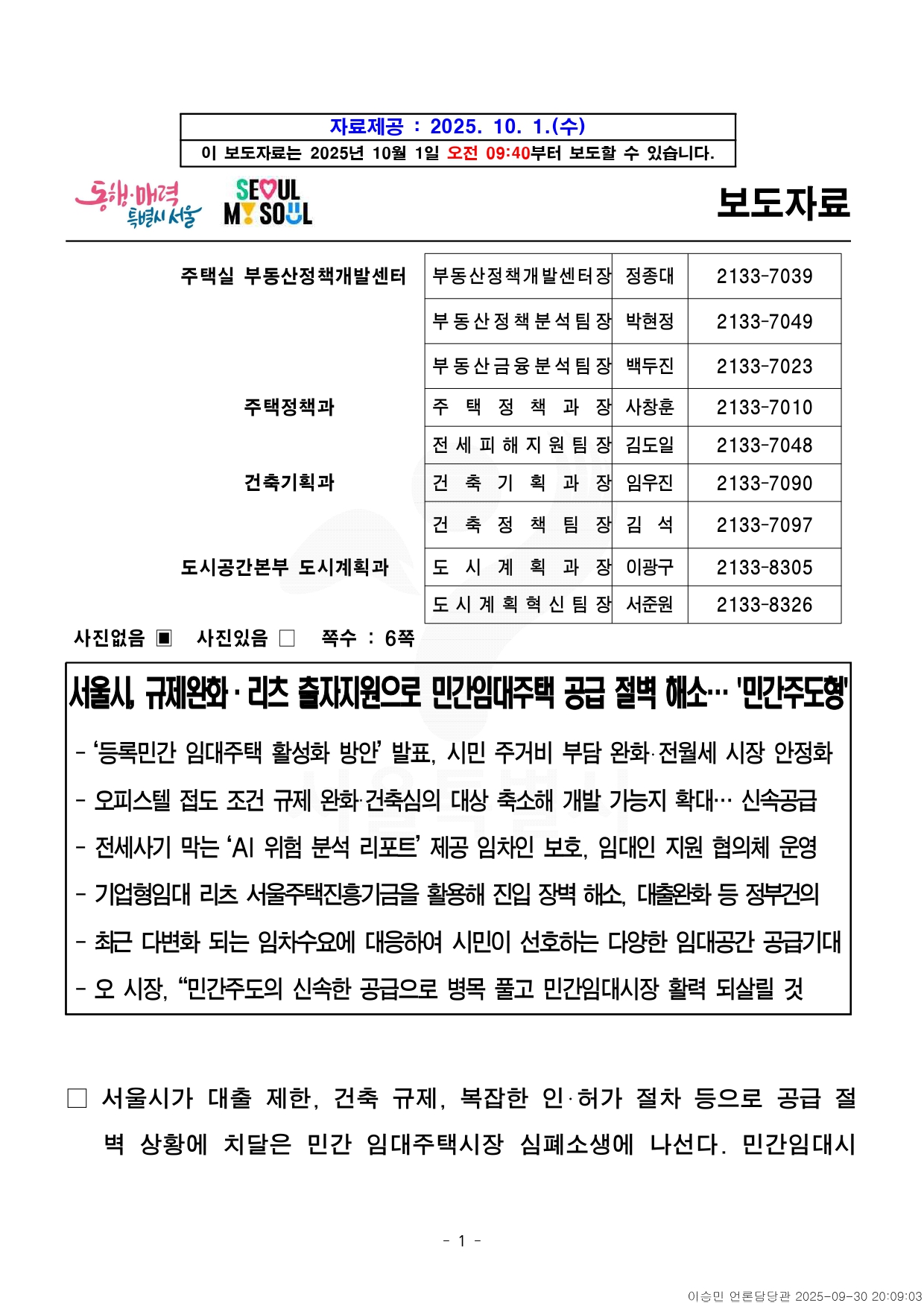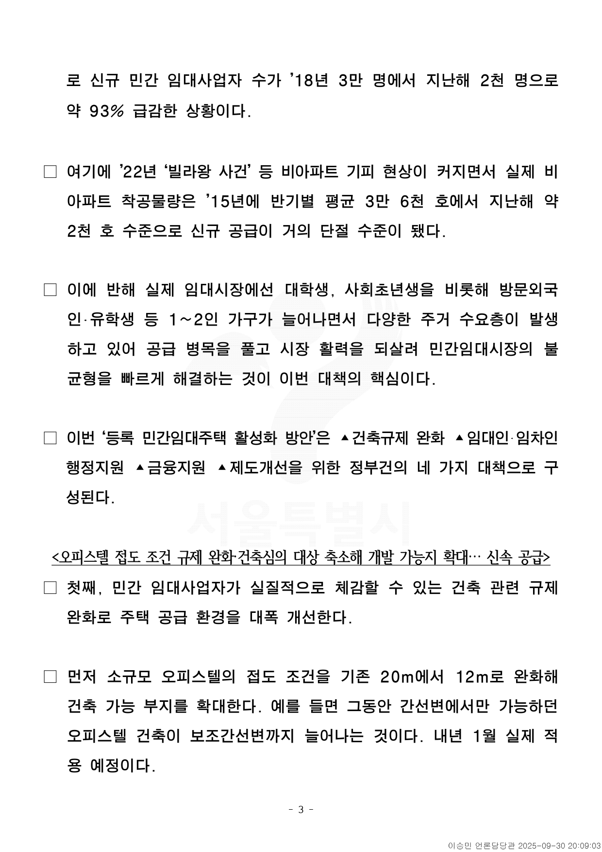 - 1 - 자료제공 : 2025. 10. 1.(수) 이 보도자료는 2025년 10월 1일 오전 09:40부터 보도할 수 있습니다. 보도자료 주택실 부동산정책개발센터 부동산정책개발센터장 정종대 2133-7039 부 동 산 정 책 분 석 팀 장 박현정 2133-7049 부 동 산 금 융 분 석 팀 장 백두진 2133-7023 주택정책과 주 택 정 책 과 장 사창훈 2133-7010 전 세 피 해 지 원 팀 장 김도일 2133-7048 건축기획과 건 축 기 획 과 장 임우진 2133-7090 건 축 정 책 팀 장 김 석 2133-7097 도시공간본부 도시계획과 도 시 계 획 과 장 이광구 2133-8305 도 시 계 획 혁 신 팀 장 서준원 2133-8326 사진없음 ▣ 사진있음 □ 쪽수 : 6쪽 서울시, 규제완화·리츠 출자지원으로 민간임대주택 공급 절벽 해소… '민간주도형' - ‘등록민간 임대주택 활성화 방안’ 발표, 시민 주거비 부담 완화‧전월세 시장안정화- 오피스텔 접도 조건 규제 완화·건축심의 대상 축소해 개발 가능지 확대… 신속공급- 전세사기 막는 ‘AI 위험 분석 리포트’ 제공 임차인 보호, 임대인 지원 협의체운영- 기업형임대 리츠 서울주택진흥기금을 활용해 진입 장벽 해소, 대출완화 등정부건의- 최근 다변화 되는 임차수요에 대응하여 시민이 선호하는 다양한 임대공간공급기대- 오 시장, “민간주도의 신속한 공급으로 병목 풀고 민간임대시장 활력 되살릴것□ 서울시가 대출 제한, 건축 규제, 복잡한 인‧허가 절차 등으로공급절벽 상황에 치달은 민간 임대주택시장 심폐소생에 나선다. 민간임대시 - 2 - 장을 활성화해 시민 주거비 부담을 덜고, 전‧월세 시장을 안정화한다는 목표다. <‘등록 민간 임대주택 활성화 방안’ 발표, 시민 주거비 부담 완화‧전월세 시장 안정화>□ 서울시는 규제 완화‧금융지원을 통한 민간임대주택 공급 확대와임차인‧임대인에 대한 행정지원을 주요내용으로 하는「서울시 등록민간임대주택 활성화 방안」을 1일(수) 발표했다. □ 공공만으로는 한계가 있는 임대시장을 민간주도로 활성화하기위해건축시 걸림돌이 되는 규제는 손보고, 인허가 기간은 줄여 신규공급을속도감 있게 진행한다는 계획이다. □ 현재 서울시 내 등록 민간임대주택은 총 41만 6천호로 전체임차주택시장에 20%에 달한다. 유형별로는 다세대·다가구, 오피스텔, 도시형생활주택 등 비아파트가 80% 이상이다. 민간임대사업자는 9만8천명에 이른다. ○ 등록 민간임대주택은 임대료 증액을 5% 이내로 제한하고 있으며, 보증보험이 가입돼 있고 임대기간(6~10년) 동안 갱신 거절 불가 등 임차인들이 안정적으로 거주할 수 있도록 제도적으로 보호하고 있다. □ 민간임대주택의 경우 지난 2015년 민간임대특별법 도입 당시에는각종 세제 지원으로 임대사업자 등록을 유도했지만 이후 세제 혜택축소(’18년), 단‧장기 아파트 임대 폐지(’20년) 등 잦은 정부 정책변경으 - 3 - 로 신규 민간 임대사업자 수가 ’18년 3만 명에서 지난해 2천명으로약 93% 급감한 상황이다. □ 여기에 ’22년 ‘빌라왕 사건’ 등 비아파트 기피 현상이 커지면서실제비아파트 착공물량은 ’15년에 반기별 평균 3만 6천 호에서 지난해약2천 호 수준으로 신규 공급이 거의 단절 수준이 됐다. □ 이에 반해 실제 임대시장에선 대학생, 사회초년생을 비롯해 방문외국인‧유학생 등 1~2인 가구가 늘어나면서 다양한 주거 수요층이발생하고 있어 공급 병목을 풀고 시장 활력을 되살려 민간임대시장의불균형을 빠르게 해결하는 것이 이번 대책의 핵심이다. □ 이번 ‘등록 민간임대주택 활성화 방안’은 ▴건축규제 완화 ▴임대인‧임차인행정지원 ▴금융지원 ▴제도개선을 위한 정부건의 네 가지 대책으로구성된다. <오피스텔 접도 조건 규제 완화·건축심의 대상 축소해 개발 가능지 확대… 신속 공급>□ 첫째, 민간 임대사업자가 실질적으로 체감할 수 있는 건축 관련규제완화로 주택 공급 환경을 대폭 개선한다. □ 먼저 소규모 오피스텔의 접도 조건을 기존 20m에서 12m로완화해건축 가능 부지를 확대한다. 예를 들면 그동안 간선변에서만 가능하던오피스텔 건축이 보조간선변까지 늘어나는 것이다. 내년 1월실제적용 예정이다. - 4 - □ 또 오피스텔 건축 시 건축위원회 심의 대상을 ‘30실 이상’에서‘50실이상’으로 축소해 31실~49실 중소규모 오피스텔도 심의없이빠르게건축할 수 있도록 한다. ○ 아울러 용적률 추가 확보를 위해 일조사선 규정 완화와 도시형 생활주택층수 완화를 1층→2층으로 확대하는 방안을 정부에 건의, 공급물량이더욱 확대될 수 있도록 할 계획이다. □ ‘신속인허가협의체’도 구성‧운영한다. 자치구별 재량범위가 달라발생하던 인허가 분쟁을 줄여 사업자 부담을 덜고 행정 절차 병행추진으로 인허가 기간 자체를 줄이는 역할이다. 건축계획 사전검토제를도입해 지구단위계획 변경 절차와 건축인허가 절차를 중첩 적용하고, 해체‧굴토‧구조심의를 병행 진행하는 방식이다. <전세사기 막는 ‘AI 위험 분석 리포트’ 제공 임차인 보호, 임대인 지원 협의체 운영>□ 둘째, 비아파트 시장 위축을 초래하는 전세사기 예방에도 앞장선다.임차인이 전세계약 전에 주택과 집주인에 대한 위험도를 확인하고,안전한 계약을 진행할 수 있도록 AI 전세사