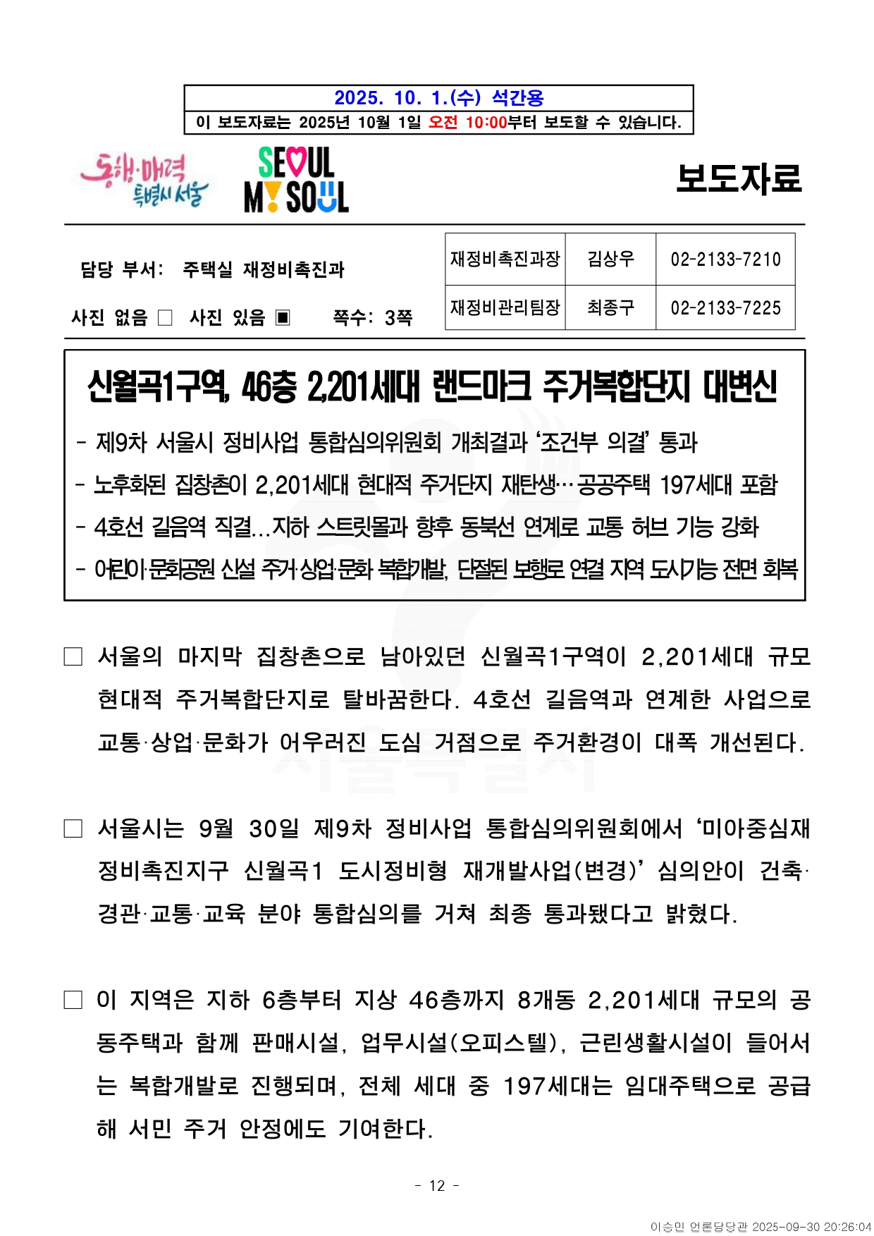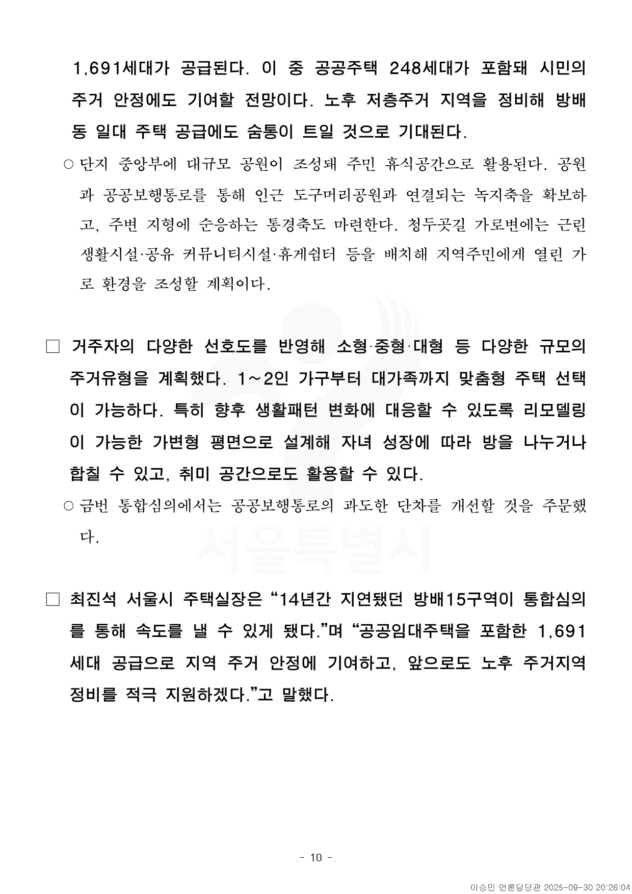 - 1 - 2025. 10. 1.(수) 석간용 이 보도자료는 2025년 10월 1일 오전 10:00부터 보도할 수 있습니다. 보도자료담당 부서: 주택실 주거정비과 주거정비과장 김동구 02-2133-7190통합심의팀장 박성운 02-2133-7204사진없음 ■ 사진있음 □ 쪽수 : 2쪽 2025년 제9차 서울시 정비사업 통합심의위원회 개최결과□ 금일 처리 안건 : 총 5건 ○ 조건부 의결 : 4건 ○ 보 류 : 1건 ※ 자문, 보류, 보고 안건은 보도자료를 제공하지 않습니다. ※ 안건에 대한 자세한 내용은 소관부서에 문의하여 주시기 바랍니다. 붙임 심의결과 1부. - 2 - 제9차 정비사업 통합심의위원회 개최결과【 2025. 9. 30. (화) 14:00 】 ▣ 총 5건 (조건부 의결 4건, 보류 1건) 연 번 안 건 명 안 건 개 요 심의결과 비고1 <심의-신규> 천호8 재정비촉진구역 도시정비형 재개발사업 ○ 위 치 : 강동구 천호동 166-4번지 일원(7,613.00㎡) ○ 지역지구 : 일반상업지역 ○ 내 용 : 건축+경관+교통+소방 통합심의 조 건 부 의 결 <재정비촉진과> 재정비관리팀팀장 : 최종구담당 : 이윤지(2133-7227) 2 <심의-신규> 거여새마을구역 공공재개발 정비사업 ○ 위 치 : 송파구 거여동 549번지 일원(71,922.40㎡) ○ 지역지구 : 제2종, 제3종일반주거지역 ○ 내 용 : 건축+경관+교통+교육+공원+재해 통합심의 조 건 부 의 결 <재정비촉진과> 재정비관리팀팀장 : 최종구담당 : 김용덕(2133-7226) 3 <심의-신규> 방배15구역 주택재건축 정비사업 ○ 위 치 : 서울시 서초구 방배동 528-3 일대(73,728.0㎡) ○ 지역지구 : 제2종일반주거지역 ○ 내 용 : 건축+경관+교통+교육+공원 통합심의 조 건 부 의 결 <재정비촉진과> 재정비주택팀팀장 : 김광호담당 : 정민주(2133-7214) 4 <심의-변경> 신월곡1 재정비촉진구역 도시정비형 재개발사업 ○ 위 치 : 성북구 하월곡동 88-142번지 일원(56,024.5㎡) ○ 지역지구 : 일반상업지역 ○ 내 용 : 건축+경관+교통+교육 통합심의 조 건 부 의 결 <재정비촉진과> 재정비관리팀팀장 : 최종구담당 : 김용덕(2133-7226) 5 <심의-신규> 안암1 주택재건축 정비사업 ○ 위 치 : 성북구 안암동3가 136-1 일대(15,124.2㎡) ○ 지역지구 : 제2종일반주거지역(7층이하),제2종일반주거지역 ○ 내 용 : 건축+교통+교육 통합심의 보 류 <재정비촉진과> 재정비계획팀팀장 : 강희일담당 : 이영선(2133-7213) - 3 - 2025. 10. 1.(수) 석간용 이 보도자료는 2025년 10월 1일 오전 10:00부터 보도할 수 있습니다. 보도자료담당 부서: 주택실 재정비촉진과 재정비촉진과장 김상우 2133-7210 재정비관리팀장 최종구 2133-7225 사진 없음 □ 사진 있음 ▣ 쪽수: 3쪽 천호8구역, 주거·상업·복지 어우러진 520세대 공급…천호성내촉진지구 완성 눈앞- 시, 제9차 정비사업 통합심의위원회서 천호8 재정비촉진구역 도시정비형 재개발사업‘조건부의결’ - 지하7~지상43층, 공공주택 157세대 포함 총 520세대 공동주택·근린생활시설·복지시설건립- 지하철 5호선 천호역·강동역 도보권, 천호대로·올림픽대로 인접 프리미엄 입지개발- 단지 내 공개공지·공공보행통로 조성, 아이맘센터·노인복지시설 등 맞춤형 복지시설확충□ 천호동 교통 요충지 ‘천호8 재정비촉진구역’에 공공주택과 복지시설을갖춘520세대 주거복합단지가 들어선다. 지하철역 도보권 프리미엄 입지에주거·복지·상업이 하나로 어우러진 미래형 주거단지가 탄생할 전망이다. □ 서울시는 9.30. 제9차 정비사업 통합심의위원회에서 ‘천호8 재정비촉진구역도시정비형 재개발사업’ 심의안을 건축·경관·교통·소방 분야 통합심의를통해최종 통과시켰다고 밝혔다. 이로써 천호성내촉진지구 완성이 가시화됐다. □ 천호8구역은 지하철 5호선 천호역과 강동역 사이, 천호대로와 올림픽대로가교차하는 서울 동남권 교통의 중심지에 위치한다. 최적 입지에 지하7~지상43층 규모 총 520세대 공동주택이 조성되며, 공공주택 157세대(30%)를포함해 복지시설·근린생활시설이 함께 들어선다. - 4 - □ 단지 내에는 약 900㎡ 규모 공개공지와 공공보행통로를 설치해 지역주민에게 개방한다. 강동구청이 운영할 예정인 아이맘 강동센터와 노인복지시설도설치해 영유아부터 어르신까지 필요한 복지서비스를 받을 수 있다. 저층부근린생활시설은 지역 상권 특성을 반영한 생활편의 업종으로 구성해 주민일상편의성을 극대화하며, 심의가 통과됨에 따라 2027년 1월 착공할 예정이다. □ 천호동 로데오거리, 천호대로 상권과 연계한 지역 경제 시너지 효과도기대된다. 새로운 인구 유입과 상업시설 확충으로 침체된 지역 상권에 활력을불어넣고, 올림픽대로 접근성을 활용한 광역 연결성까지 확보하게 됐다. ○ 이번 통합심의에서는 공공보행통로가 인접 단지와 편리하게 연계될 수있도록추가 주문하였다. □ 최진석 서울시 주택실장은 “천호8구역은 주택공급 확대는 물론, 공공주택·복지·상업·교통이 유기적으로 연결된 새로운 주거복합단지로 조성될것”이라며“지역사회와 함께하는 열린 주거공간을 확충하고 주민이 체감할수있는쾌적한 도시 환경을 만들어가겠다.”고 말했다. - 5 - <붙임> 천호8 재정비촉진구역 도시정비형 재개발정비사업□ 사업개요 ○ 위 치 : 강동구 천호동 166-4번지 일대(면적 : 7,613.0㎡) ○ 건축규모 구분 건 폐 