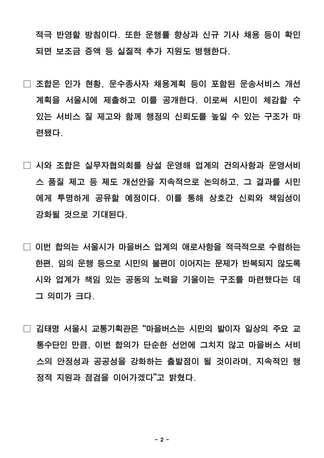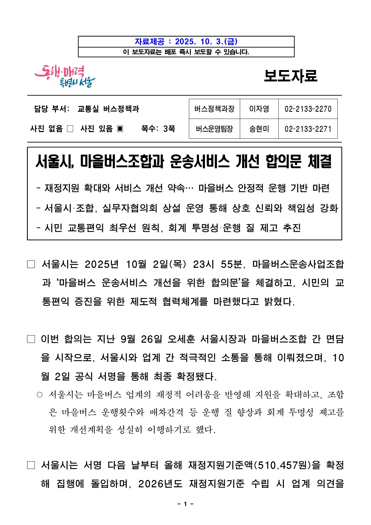 - 1 - 자료제공 : 2025. 10. 3.(금) 이 보도자료는 배포 즉시 보도할 수 있습니다. 보도자료담당 부서: 교통실 버스정책과 버스정책과장 이자영 02-2133-2270 사진 없음 □ 사진 있음 ▣ 쪽수: 3쪽 버스운영팀장 송현미 02-2133-2271 서울시, 마을버스조합과 운송서비스 개선 합의문 체결- 재정지원 확대와 서비스 개선 약속… 마을버스 안정적 운행 기반마련- 서울시·조합, 실무자협의회 상설 운영 통해 상호 신뢰와 책임성강화- 시민 교통편익 최우선 원칙, 회계 투명성·운행 질 제고 추진 □ 서울시는 2025년 10월 2일(목) 23시 55분, 마을버스운송사업조합과 ‘마을버스 운송서비스 개선을 위한 합의문’을 체결하고, 시민의교통편익 증진을 위한 제도적 협력체계를 마련했다고 밝혔다. □ 이번 합의는 지난 9월 26일 오세훈 서울시장과 마을버스조합간면담을 시작으로, 서울시와 업계 간 적극적인 소통을 통해 이뤄졌으며, 10월 2일 공식 서명을 통해 최종 확정됐다. ○ 서울시는 마을버스 업계의 재정적 어려움을 반영해 지원을 확대하고, 조합은 마을버스 운행횟수와 배차간격 등 운행 질 향상과 회계 투명성제고를위한 개선계획을 성실히 이행하기로 했다. □ 서울시는 서명 다음 날부터 올해 재정지원기준액(510,457원)을확정해 집행에 돌입하며, 2026년도 재정지원기준 수립 시 업계의견을 - 2 - 적극 반영할 방침이다. 또한 운행률 향상과 신규 기사 채용 등이확인되면 보조금 증액 등 실질적 추가 지원도 병행한다. □ 조합은 인가 현황, 운수종사자 채용계획 등이 포함된 운송서비스개선계획을 서울시에 제출하고 이를 공개한다. 이로써 시민이 체감할수있는 서비스 질 제고와 함께 행정의 신뢰도를 높일 수 있는 구조가마련됐다. □ 시와 조합은 실무자협의회를 상설 운영해 업계의 건의사항과운영서비스 품질 제고 등 제도 개선안을 지속적으로 논의하고, 그 결과를시민에게 투명하게 공유할 예정이다. 이를 통해 상호간 신뢰와 책임성이강화될 것으로 기대된다. □ 이번 합의는 서울시가 마을버스 업계의 애로사항을 적극적으로수렴하는한편, 임의 운행 등으로 시민의 불편이 이어지는 문제가 반복되지않도록시와 업계가 책임 있는 공동의 노력을 기울이는 구조를 마련했다는데그 의미가 크다. □ 김태명 서울시 교통기획관은 “마을버스는 시민의 발이자 일상의주요교통수단인 만큼, 이번 합의가 단순한 선언에 그치지 않고 마을버스서비스의 안정성과 공공성을 강화하는 출발점이 될 것이라며, 지속적인행정적 지원과 점검을 이어가겠다”고 밝혔다. - 3 - 붙임 : 합의문 체결 사진 왼쪽부터 김용승 서울시마을버스운송사업조합 이사장, 김태명 서울시 교통기획관