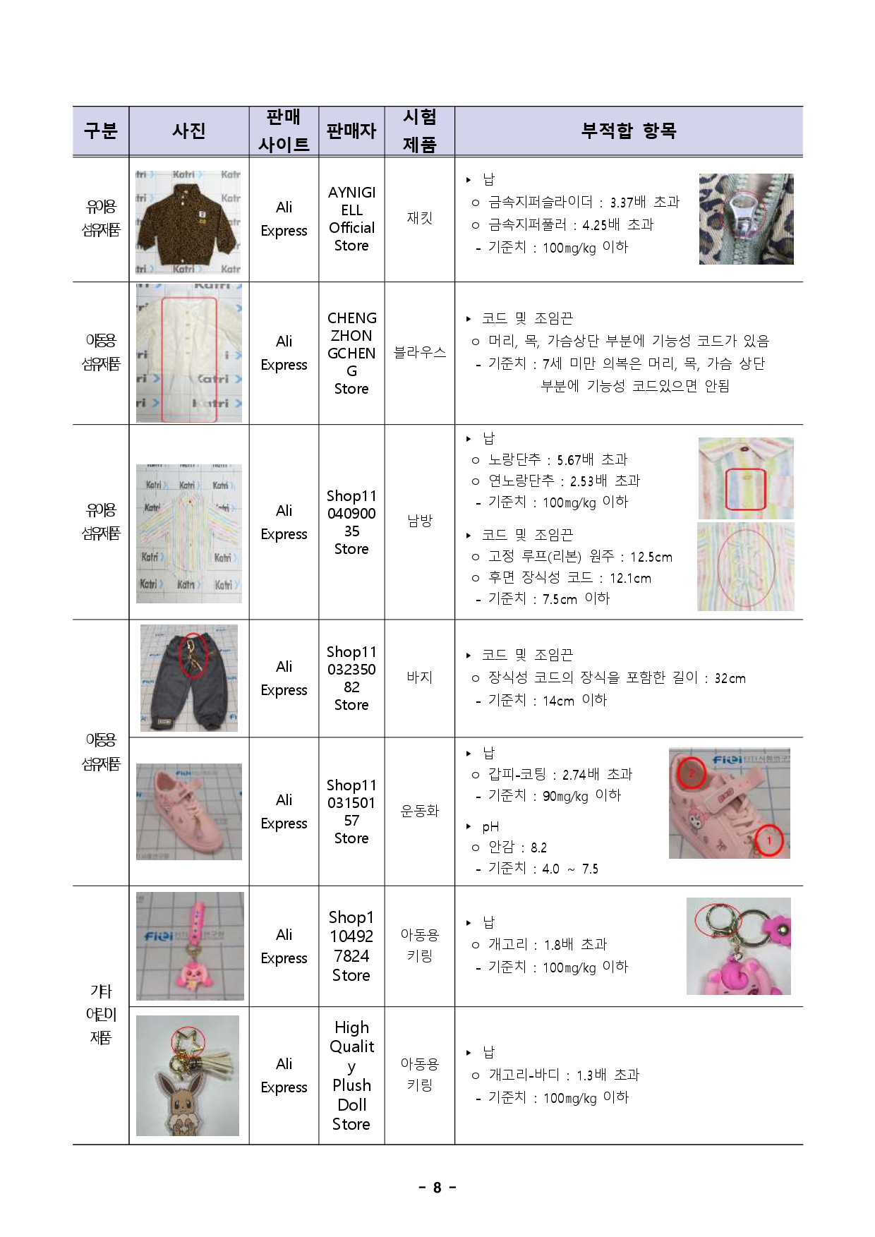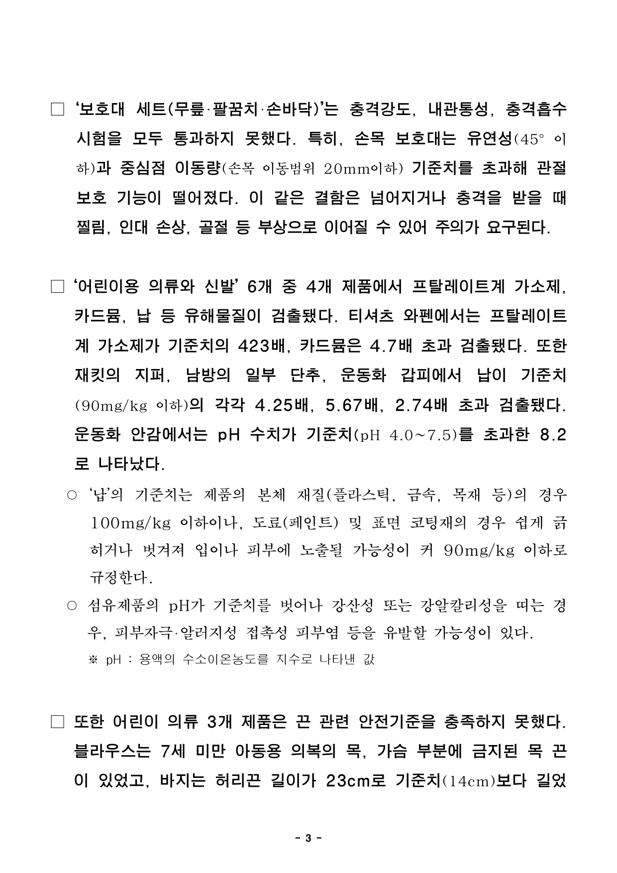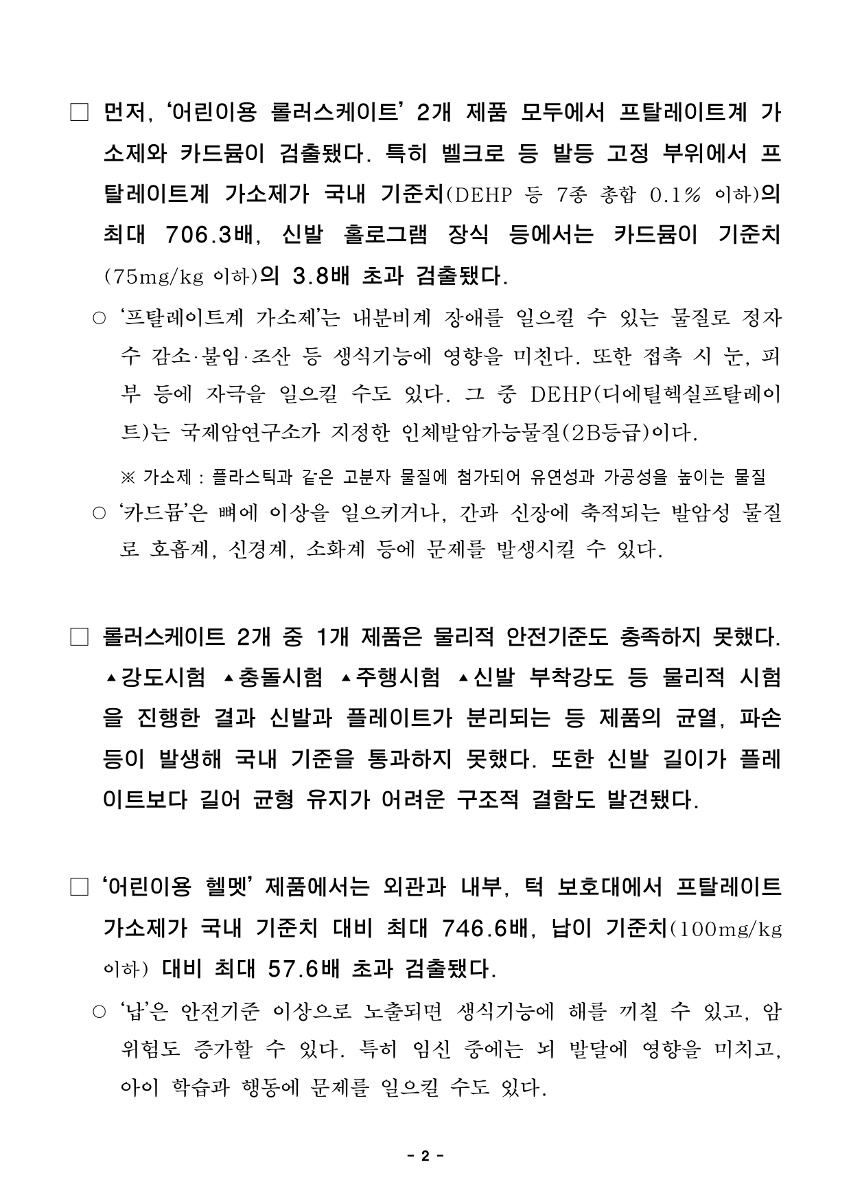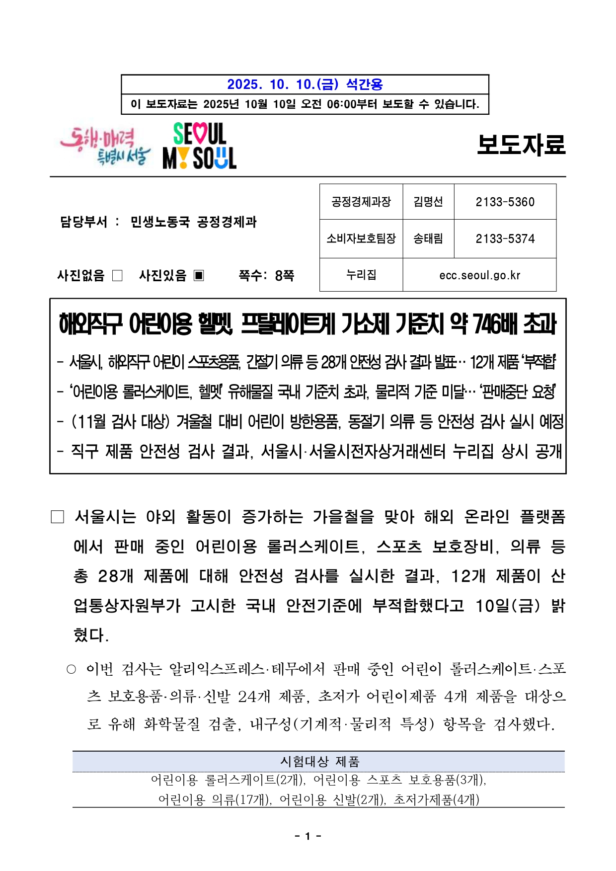 - 1 - 2025. 10. 10.(금) 석간용 이 보도자료는 2025년 10월 10일 오전 06:00부터 보도할 수 있습니다.보도자료담당부서 : 민생노동국 공정경제과 공정경제과장 김명선 2133-5360 소비자보호팀장 송태림 2133-5374 사진없음 □ 사진있음 ▣ 쪽수: 8쪽 누리집 ecc.seoul.go.kr 해외직구 어린이용 헬멧, 프탈레이트계 가소제 기준치 약 746배 초과- 서울시, 해외직구어린이스포츠용품, 간절기의류등28개안전성검사결과발표…12개제품‘부적합’ - ‘어린이용 롤러스케이트, 헬멧’ 유해물질 국내 기준치 초과, 물리적 기준 미달… ‘판매중단요청’ - (11월 검사 대상) 겨울철 대비 어린이 방한용품, 동절기 의류 등 안전성 검사실시예정- 직구 제품 안전성 검사 결과, 서울시‧서울시전자상거래센터 누리집상시공개□ 서울시는 야외 활동이 증가하는 가을철을 맞아 해외 온라인플랫폼에서 판매 중인 어린이용 롤러스케이트, 스포츠 보호장비, 의류등총 28개 제품에 대해 안전성 검사를 실시한 결과, 12개 제품이산업통상자원부가 고시한 국내 안전기준에 부적합했다고 10일(금) 밝혔다. ○ 이번 검사는 알리익스프레스‧테무에서 판매 중인 어린이 롤러스케이트‧스포츠 보호용품‧의류‧신발 24개 제품, 초저가 어린이제품 4개 제품을대상으로 유해 화학물질 검출, 내구성(기계적‧물리적 특성) 항목을 검사했다. 시험대상 제품 어린이용 롤러스케이트(2개), 어린이용 스포츠 보호용품(3개), 어린이용 의류(17개), 어린이용 신발(2개), 초저가제품(4개) - 2 - □ 먼저, ‘어린이용 롤러스케이트’ 2개 제품 모두에서 프탈레이트계가소제와 카드뮴이 검출됐다. 특히 벨크로 등 발등 고정 부위에서프탈레이트계 가소제가 국내 기준치(DEHP 등 7종 총합 0.1% 이하)의최대 706.3배, 신발 홀로그램 장식 등에서는 카드뮴이기준치(75mg/kg 이하)의 3.8배 초과 검출됐다. ○ ‘프탈레이트계 가소제’는 내분비계 장애를 일으킬 수 있는 물질로정자수 감소‧불임‧조산 등 생식기능에 영향을 미친다. 또한 접촉 시눈, 피부 등에 자극을 일으킬 수도 있다. 그 중 DEHP(디에틸헥실프탈레이트)는 국제암연구소가 지정한 인체발암가능물질(2B등급)이다. ※ 가소제 : 플라스틱과 같은 고분자 물질에 첨가되어 유연성과 가공성을 높이는 물질○ ‘카드뮴’은 뼈에 이상을 일으키거나, 간과 신장에 축적되는 발암성물질로 호흡계, 신경계, 소화계 등에 문제를 발생시킬 수 있다. □ 롤러스케이트 2개 중 1개 제품은 물리적 안전기준도 충족하지못했다. ▴강도시험 ▴충돌시험 ▴주행시험 ▴신발 부착강도 등 물리적시험을 진행한 결과 신발과 플레이트가 분리되는 등 제품의 균열, 파손등이 발생해 국내 기준을 통과하지 못했다. 또한 신발 길이가플레이트보다 길어 균형 유지가 어려운 구조적 결함도 발견됐다. □ ‘어린이용 헬멧’ 제품에서는 외관과 내부, 턱 보호대에서 프탈레이트가소제가 국내 기준치 대비 최대 746.6배, 납이 기준치(100mg/kg이하) 대비 최대 57.6배 초과 검출됐다. ○ ‘납’은 안전기준 이상으로 노출되면 생식기능에 해를 끼칠 수 있고, 암위험도 증가할 수 있다. 특히 임신 중에는 뇌 발달에 영향을 미치고, 아이 학습과 행동에 문제를 일으킬 수도 있다. - 3 - □ ‘보호대 세트(무릎‧팔꿈치‧손바닥)’는 충격강도, 내관통성, 충격흡수시험을 모두 통과하지 못했다. 특히, 손목 보호대는 유연성(45° 이하)과 중심점 이동량(손목 이동범위 20mm이하) 기준치를 초과해관절보호 기능이 떨어졌다. 이 같은 결함은 넘어지거나 충격을 받을때찔림, 인대 손상, 골절 등 부상으로 이어질 수 있어 주의가 요구된다. □ ‘어린이용 의류와 신발’ 6개 중 4개 제품에서 프탈레이트계가소제, 카드뮴, 납 등 유해물질이 검출됐다. 티셔츠 와펜에서는 프탈레이트계 가소제가 기준치의 423배, 카드뮴은 4.7배 초과 검출됐다. 또한재킷의 지퍼, 남방의 일부 단추, 운동화 갑피에서 납이기준치(90mg/kg 이하)의 각각 4.25배, 5.67배, 2.74배 초과 검출됐다. 운동화 안감에서는 pH 수치가 기준치(pH 4.0~7.5)를 초과한8.2로 나타났다. ○ ‘납’의 기준치는 제품의 본체 재질(플라스틱, 금속, 목재 등)의경우100mg/kg 이하이나, 도료(페인트) 및 표면 코팅재의 경우 쉽게긁히거나 벗겨져 입이나 피부에 노출될 가능성이 커 90mg/kg 이하로규정한다. ○ 섬유제품의 pH가 기준치를 벗어나 강산성 또는 강알칼리성을 띠는경우, 피부자극‧알러지성 접촉성 피부염 등을 유발할 가능성이 있다. ※ pH : 용액의 수소이온농도를 지수로 나타낸 값 □ 또한 어린이 의류 3개 제품은 끈 관련 안전기준을 충족하지못했다. 블라우스는 7세 미만 아동용 의복의 목, 가슴 부분에 금지된목끈이 있었고, 바지는 허리끈 길이가 23cm로 기준치(14cm)보다길었 - 4 - 으며, 남방은 후면에 달린 고정 루프(리본) 원주와 장식끈이기준치(7.5cm)를 보다 길어 질식, 걸림 등의 사고 위험이 있는 것으로나타났다. □ 마지막으로 ‘아동용 키링’ 2개 제품의 개고리 부위에서도 납이기준치(100mg/kg 이하)를 각각 1.8배, 1.3배 초과 검출됐다. 특히키링은 손으로 자주 만지는 제품인 만큼 노출 위험이 높아 각별한주의가 필요하다. 어린이용 롤러스케이트 
