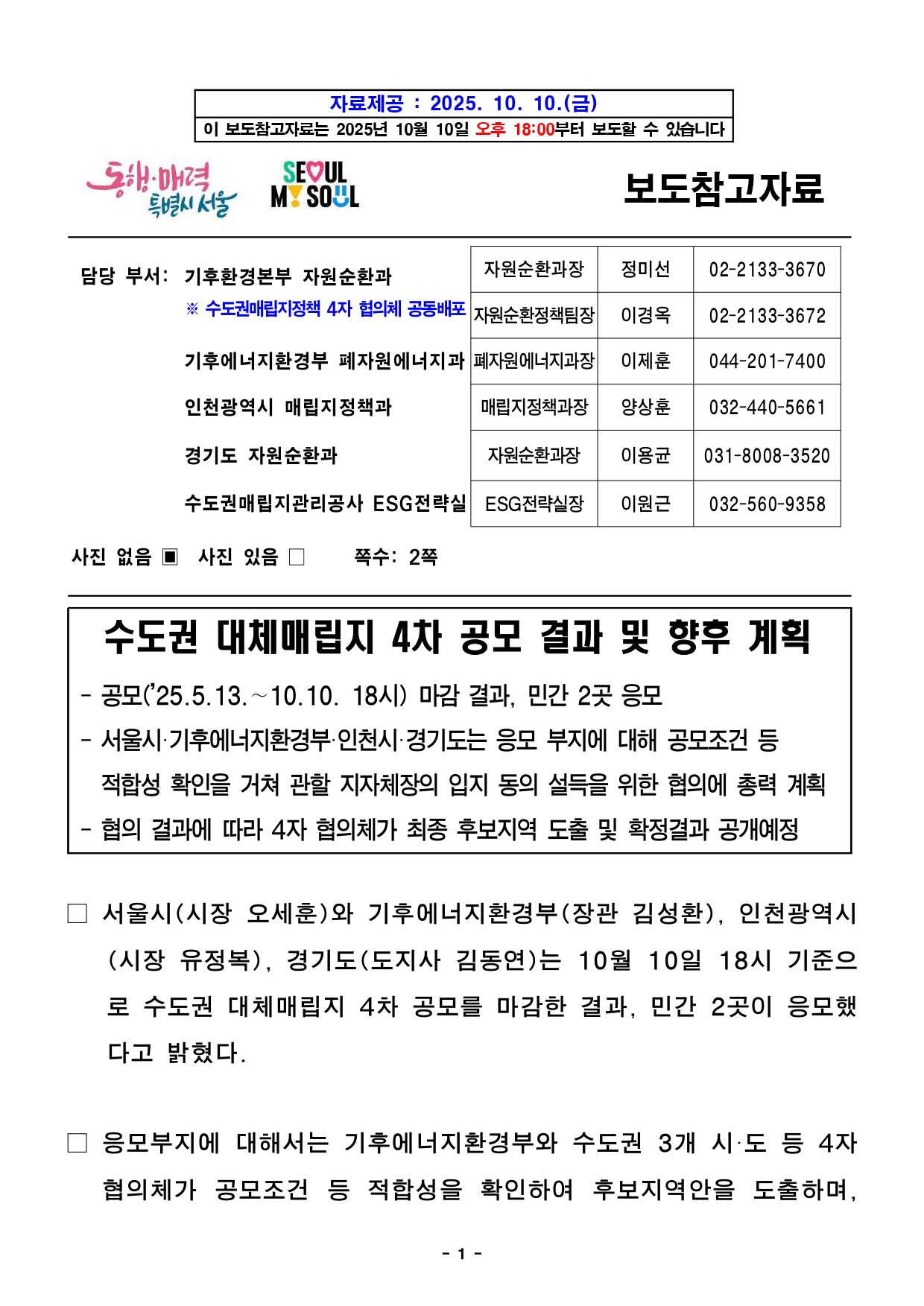 - 1 - 자료제공 : 2025. 10. 10.(금) 이 보도참고자료는 2025년 10월 10일 오후 18:00부터 보도할 수 있습니다 보도참고자료담당 부서: 기후환경본부 자원순환과 ※ 수도권매립지정책 4자 협의체 공동배포 자원순환과장 정미선 02-2133-3670 자원순환정책팀장 이경옥 02-2133-3672 기후에너지환경부 폐자원에너지과 폐자원에너지과장 이제훈 044-201-7400 인천광역시 매립지정책과 매립지정책과장 양상훈 032-440-5661 경기도 자원순환과 자원순환과장 이용균 031-8008-3520수도권매립지관리공사 ESG전략실 ESG전략실장 이원근 032-560-9358 사진 없음 ▣ 사진 있음 □ 쪽수: 2쪽 수도권 대체매립지 4차 공모 결과 및 향후 계획- 공모(’25.5.13.∼10.10. 18시) 마감 결과, 민간 2곳 응모 - 서울시·기후에너지환경부·인천시·경기도는 응모 부지에 대해 공모조건등적합성 확인을 거쳐 관할 지자체장의 입지 동의 설득을 위한 협의에 총력계획- 협의 결과에 따라 4자 협의체가 최종 후보지역 도출 및 확정결과 공개예정□ 서울시(시장 오세훈)와 기후에너지환경부(장관 김성환), 인천광역시(시장 유정복), 경기도(도지사 김동연)는 10월 10일 18시기준으로 수도권 대체매립지 4차 공모를 마감한 결과, 민간 2곳이응모했다고 밝혔다. □ 응모부지에 대해서는 기후에너지환경부와 수도권 3개 시·도등4자협의체가 공모조건 등 적합성을 확인하여 후보지역안을 도출하며, - 2 - 관할 지자체의 입지 동의 설득을 위한 협의조건*을 4자 협의체에서세부적으로 조율한 후 해당 지자체와 협의에 들어갈 계획이다* 매립 및 부대시설의 종류·규모, 특별지원금, 지역 숙원사업 및 건의과제등□ 지자체 협의결과에 따라 4자 협의체가 최종 후보지역을 도출하면그 결과를 공개하는 것으로 기후에너지환경부와 수도권 3개시·도는 합의했다.