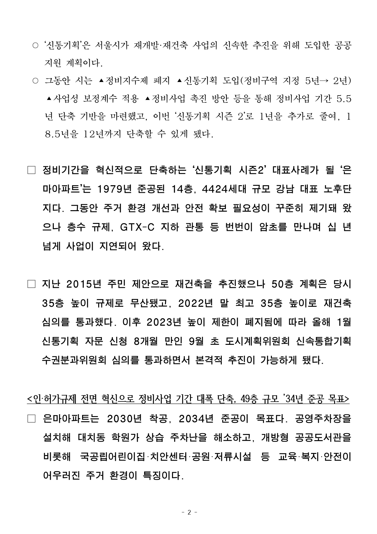 - 1 - 2025. 10. 13.(월) 석간용 이 보도자료는 2025년 10월 13일 오전 10:30부터 보도할 수 있습니다. 보도자료 담당부서: 주택실 공동주택과 공동주택과장 이정식 2133-7130 사진없음 □ 사진있음 ▣ 쪽수 : 10쪽 재건축계획팀장 임동수 2133-7140 서울시, 은마아파트 재건축 '신통기획 시즌2' 첫 적용… 2030년 5893세대 착공- 인‧허가규제 전면 혁신으로 정비사업 기간 대폭 단축, 49층 규모 ’34년준공목표- 역세권 용적률 완화제도 최초 적용, 추가 공급 655세대 중 195세대 공공분양사업성↑- 오 시장, 13일(월) ‘은마아파트’ 현장점검… 12번째 주택현장 행보, 공급속도강조- 市, ‘신통기획 2’ 적용해 ’31년까지 강남구 2만5천 호 착공… 집값 안정실질적기여□ 십 년 넘게 재건축이 정체됐던 대치동 대표 노후단지 ‘은마아파트’가49층높이 5,893세대 대단지로 탈바꿈한다. □ 최근 서울시가 발표한 정비사업 인‧허가규제 전면 혁신이 핵심인‘신속통합기획 시즌2’를 적용한 첫 사례로 시민들이 원하는 곳에 빠르게주택을 공급한다는 서울시의 철학을 담았다. 또 용적률 특례도최초로적용해 민간 주도 재건축에 공공분양을 결합한 사업성 높고조화로운주거모델도 선보인다. - 2 - ○ ‘신통기획’은 서울시가 재개발·재건축 사업의 신속한 추진을 위해 도입한공공지원 계획이다. ○ 그동안 시는 ▴정비지수제 폐지 ▴신통기획 도입(정비구역 지정 5년→2년)▴사업성 보정계수 적용 ▴정비사업 촉진 방안 등을 통해 정비사업 기간5.5년 단축 기반을 마련했고, 이번 ‘신통기획 시즌 2’로 1년을 추가로줄여, 18.5년을 12년까지 단축할 수 있게 됐다. □ 정비기간을 혁신적으로 단축하는 ‘신통기획 시즌2’ 대표사례가될‘은마아파트’는 1979년 준공된 14층, 4424세대 규모 강남 대표노후단지다. 그동안 주거 환경 개선과 안전 확보 필요성이 꾸준히 제기돼왔으나 층수 규제, GTX-C 지하 관통 등 번번이 암초를 만나며십년넘게 사업이 지연되어 왔다. □ 지난 2015년 주민 제안으로 재건축을 추진했으나 50층 계획은당시35층 높이 규제로 무산됐고, 2022년 말 최고 35층 높이로재건축심의를 통과했다. 이후 2023년 높이 제한이 폐지됨에 따라 올해1월신통기획 자문 신청 8개월 만인 9월 초 도시계획위원회 신속통합기획수권분과위원회 심의를 통과하면서 본격적 추진이 가능하게 됐다. <인‧허가규제 전면 혁신으로 정비사업 기간 대폭 단축, 49층 규모 ’34년 준공 목표>□ 은마아파트는 2030년 착공, 2034년 준공이 목표다. 공영주차장을설치해 대치동 학원가 상습 주차난을 해소하고, 개방형 공공도서관을비롯해 국공립어린이집·치안센터·공원·저류시설 등 교육·복지·안전이어우러진 주거 환경이 특징이다. - 3 - □ 정비사업 최초로 ‘공공분양주택’도 도입한다. 민간 주도 재건축에공공분양이 결합 된 최초 사례로 역세권 용적률 특례(300% → 331.9%)적용을 통해 655세대를 추가로 공급하는 방식이다. ○ ‘역세권 용적률 특례’란 대중교통 이용이 편리하고, 기반시설이 우수한역세권에법적 상한의 최대 1.2배까지 용적률을 완화해 사업성을 높이는 제도다. 완화된용적률의 30~40%는 민간주택으로, 60~70%는 공공주택으로 공급한다. □ 용적률 특례로 추가 공급되는 655세대 중 195세대는 다자녀중산층등 실수요자를 위한 공공분양주택으로 공급하고, 나머지 227세대는민간분양, 233세대는 공공임대로 이뤄진다. ○ 현재 서울시는 은마아파트 외 5개 단지에서 역세권 용적률 특례 적용을검토중이며 구역면적, 도로 등 단지별 입지 특성과 주변 환경을 종합적으로고려해, 정비계획 수립단계에서 적정한 용적률 완화범위를 검토하고 위원회심의를 거쳐 결정할 예정이다. □ 한편 서울시는 은마아파트 재건축을 시작으로 ‘신통기획 시즌2’를본격화해 강남권을 비롯한 여의도, 목동, 성수 등 주요 지역의정비사업속도를 높여 나간다는 계획이다. 이를 통해 2031년까지 강남구2만5천 호, 서울 전역 31만 호를 공급한다는 방침이다. □ 이와 관련해 오세훈 서울시장은 13일(월) 오전 10시 30분은마아파트를 찾아 노후 현황을 점검하고 주민들을 만나 차질없는 정비사업추진을 위해 철저한 공정관리와 행정적 지원을 펼치겠다고 밝혔다. - 4 - ○ 오 시장은 지난 7월 15일 자양 4동 재개발 지역을 시작으로 목동 6단지재건축지역(7.30.), 문정동 미리내집(8.13.), 현저동 모아타운(8.19.), 백사마을(9.9.), 미아2구역 재정비촉진사업지구(9.24.) 등 현재까지 12차례의주택 현장 행보를 이어가고 있다. □ 오세훈 시장은 “서울시의 명확한 주택공급 원칙은 민간이 주도하고,공공은 적극적으로 지원해 시민이 원하는 곳에, 좋은 품질의주택을빠르게 공급하는 것”이라며 “은마아파트를 시작으로 노후 주거지의민간 정비사업을 신속하게 추진해 집값 상승을 이끌어 온 핵심지역내주택을 빠르게 확충하겠다”고 말했다. - 5 - 오세훈 서울시장이 13일(월) 오전 대치은마아파트 재건축 현장을 방문해 관련 브리핑을 청취하고 있다. - 6 - 오세훈 서울시장이 13일(월) 오전 대치은마아파트 재건축 현장을 방문해 관련 브리핑을 청취하고 있다. 오세훈 서울시장이 13일(월) 오전 대치은마아파트 