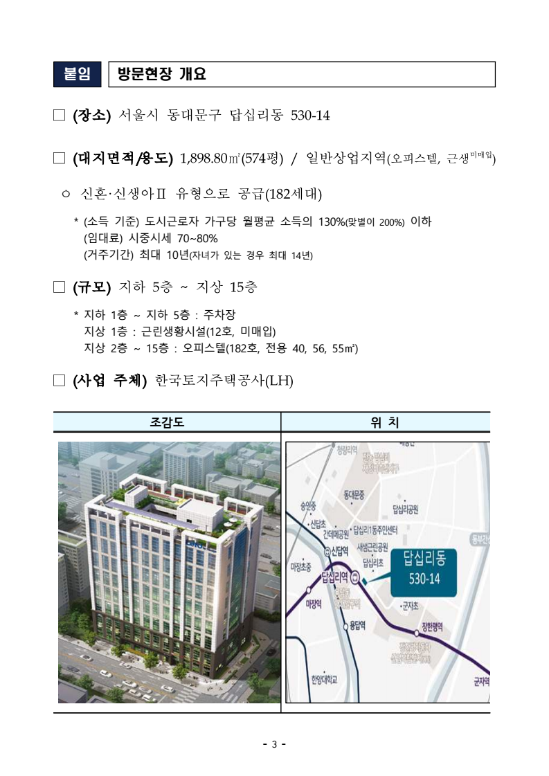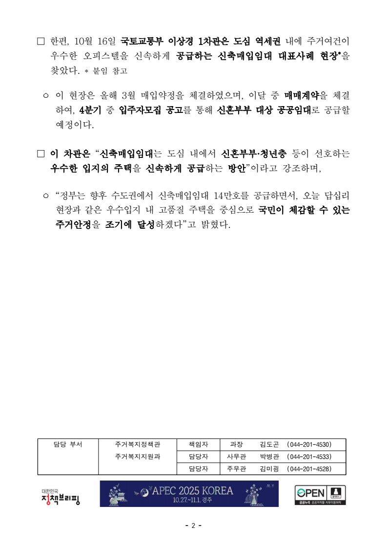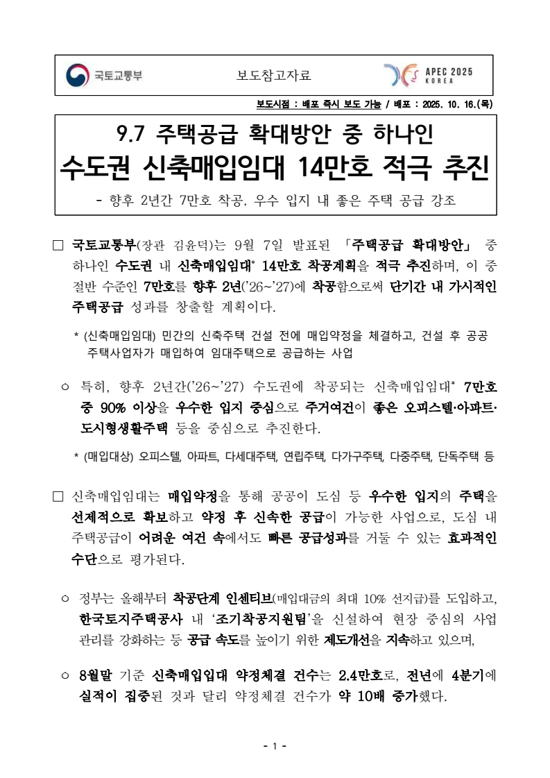 - 1 - 보도참고자료 보도시점 : 배포 즉시 보도 가능 / 배포 : 2025. 10. 16.(목) 9.7 주택공급 확대방안 중 하나인수도권 신축매입임대 14만호 적극 추진- 향후 2년간 7만호 착공, 우수 입지 내 좋은 주택 공급 강조 □ 국토교통부(장관 김윤덕)는 9월 7일 발표된 「주택공급 확대방안」 중 하나인 수도권 내 신축매입임대* 14만호 착공계획을 적극 추진하며, 이 중 절반 수준인 7만호를 향후 2년(’26~’27)에 착공함으로써 단기간 내 가시적인 주택공급 성과를 창출할 계획이다. * (신축매입임대) 민간의 신축주택 건설 전에 매입약정을 체결하고, 건설 후 공공주택사업자가 매입하여 임대주택으로 공급하는 사업 ㅇ 특히, 향후 2년간(’26~’27) 수도권에 착공되는 신축매입임대* 7만호 중 90% 이상을 우수한 입지 중심으로 주거여건이 좋은 오피스텔·아파트· 도시형생활주택 등을 중심으로 추진한다. * (매입대상) 오피스텔, 아파트, 다세대주택, 연립주택, 다가구주택, 다중주택, 단독주택 등□ 신축매입임대는 매입약정을 통해 공공이 도심 등 우수한 입지의 주택을 선제적으로 확보하고 약정 후 신속한 공급이 가능한 사업으로, 도심내 주택공급이 어려운 여건 속에서도 빠른 공급성과를 거둘 수 있는 효과적인 수단으로 평가된다. ㅇ 정부는 올해부터 착공단계 인센티브(매입대금의 최대 10% 선지급)를 도입하고, 한국토지주택공사 내 ‘조기착공지원팀’을 신설하여 현장 중심의 사업관리를 강화하는 등 공급 속도를 높이기 위한 제도개선을 지속하고 있으며, ㅇ 8월말 기준 신축매입입대 약정체결 건수는 2.4만호로, 전년에 4분기에 실적이 집중된 것과 달리 약정체결 건수가 약 10배 증가했다. - 2 - □ 한편, 10월 16일 국토교통부 이상경 1차관은 도심 역세권 내에 주거여건이우수한 오피스텔을 신속하게 공급하는 신축매입임대 대표사례 현장*을 찾았다. * 붙임 참고 ㅇ 이 현장은 올해 3월 매입약정을 체결하였으며, 이달 중 매매계약을 체결하여, 4분기 중 입주자모집 공고를 통해 신혼부부 대상 공공임대로 공급할예정이다. □ 이 차관은 “신축매입임대는 도심 내에서 신혼부부·청년층 등이 선호하는 우수한 입지의 주택을 신속하게 공급하는 방안”이라고 강조하며, ㅇ “정부는 향후 수도권에서 신축매입임대 14만호를 공급하면서, 오늘 답십리 현장과 같은 우수입지 내 고품질 주택을 중심으로 국민이 체감할 수 있는 주거안정을 조기에 달성하겠다”고 밝혔다. 담당 부서 주거복지정책관 책임자 과장 김도곤 (044-201-4530) 주거복지지원과 담당자 사무관 박병관 (044-201-4533) 담당자 주무관 김미굉 (044-201-4528) - 3 - 붙임 방문현장 개요 □ (장소) 서울시 동대문구 답십리동 530-14 □ (대지면적/용도) 1,898.80㎡(574평) / 일반상업지역(오피스텔, 근생미매입) ㅇ 신혼·신생아Ⅱ 유형으로 공급(182세대) * (소득 기준) 도시근로자 가구당 월평균 소득의 130%(맞벌이 200%) 이하 (임대료) 시중시세 70~80% (거주기간) 최대 10년(자녀가 있는 경우 최대 14년) □ (규모) 지하 5층 ~ 지상 15층 * 지하 1층 ~ 지하 5층 : 주차장 지상 1층 : 근린생황시설(12호, 미매입) 지상 2층 ~ 15층 : 오피스텔(182호, 전용 40, 56, 55㎡) □ (사업 주체) 한국토지주택공사(LH) 조감도 위 치 - 4 - □ 세대평면도(대표평면) 오피스텔 전용면적 56m2 (B타입) 오피스텔 전용면적 55m2 (C타입)