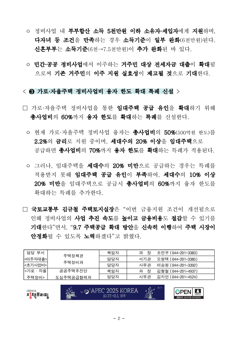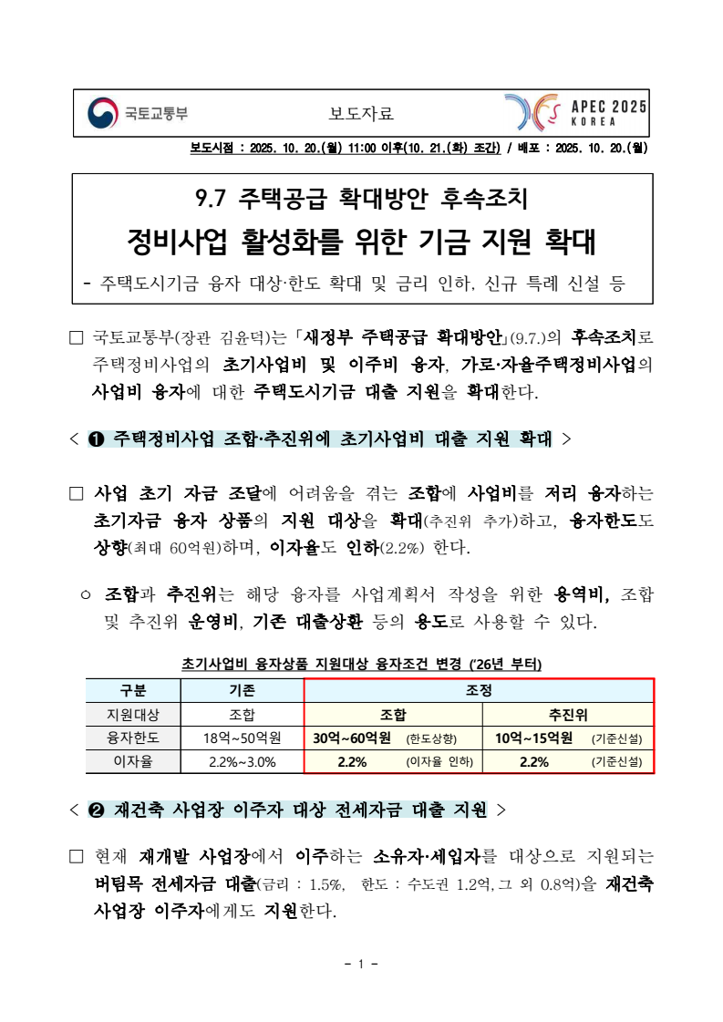 - 1 - 보도자료 보도시점 : 2025. 10. 20.(월) 11:00 이후(10. 21.(화) 조간) / 배포 : 2025. 10. 20.(월) 9.7 주택공급 확대방안 후속조치 정비사업 활성화를 위한 기금 지원 확대- 주택도시기금 융자 대상·한도 확대 및 금리 인하, 신규 특례 신설 등□ 국토교통부(장관 김윤덕)는「새정부 주택공급 확대방안」(9.7.)의 후속조치로 주택정비사업의 초기사업비 및 이주비 융자, 가로·자율주택정비사업의 사업비 융자에 대한 주택도시기금 대출 지원을 확대한다. < ➊ 주택정비사업 조합·추진위에 초기사업비 대출 지원 확대 > □ 사업 초기 자금 조달에 어려움을 겪는 조합에 사업비를 저리 융자하는 초기자금 융자 상품의 지원 대상을 확대(추진위 추가)하고, 융자한도도 상향(최대 60억원)하며, 이자율도 인하(2.2%) 한다. ㅇ 조합과 추진위는 해당 융자를 사업계획서 작성을 위한 용역비, 조합 및 추진위 운영비, 기존 대출상환 등의 용도로 사용할 수 있다. 초기사업비 융자상품 지원대상 융자조건 변경 (‘26년 부터) 구분 기존 조정 지원대상 조합 조합 추진위 융자한도 18억~50억원 30억~60억원 (한도상향) 10억~15억원 (기준신설) 이자율 2.2%~3.0% 2.2% (이자율 인하) 2.2% (기준신설) < ➋ 재건축 사업장 이주자 대상 전세자금 대출 지원 > □ 현재 재개발 사업장에서 이주하는 소유자·세입자를 대상으로 지원되는 버팀목 전세자금 대출(금리 : 1.5%, 한도 : 수도권 1.2억, 그 외 0.8억)을 재건축 사업장 이주자에게도 지원한다. - 2 - ㅇ 정비사업 내 부부합산 소득 5천만원 이하 소유자·세입자에게 지원하며, 다자녀 등 조건을 만족하는 경우 소득기준이 일부 완화(6천만원)된다. 신혼부부는 소득기준(6천→7.5천만원)이 추가 완화된 바 있다. ㅇ 민간·공공 정비사업에서 이주하는 거주민 대상 전세자금 대출이 확대됨으로써 기존 거주민의 이주 지원 실효성이 제고될 것으로 기대한다. < ➌ 가로·자율주택 정비사업비 융자 한도 확대 특례 신설 > □ 가로·자율주택 정비사업을 통한 임대주택 공급 유인을 확대하기 위해 총사업비의 60%까지 융자 한도를 확대하는 특례를 신설한다. ㅇ 현재 가로·자율주택 정비사업 융자는 총사업비의 50%(500억원 한도)를 2.2%의 금리로 지원 중이며, 세대수의 20% 이상을 임대주택으로 공급하면 총사업비의 70%까지 융자 한도를 확대하는 특례가 적용된다. ㅇ 그러나, 임대주택을 세대수의 20% 미만으로 공급하는 경우는 특례를 적용받지 못해 임대주택 공급 유인이 부족하여, 세대수의 10% 이상 20% 미만을 임대주택으로 공급시 총사업비의 60%까지 융자 한도를 확대하는 특례를 추가한다. □ 국토교통부 김규철 주택토지실장은 “이번 금융지원 조건이 개선됨으로 인해 정비사업의 사업 추진 속도를 높이고 금융비용도 절감할 수 있기를기대한다”면서, “9.7 주택공급 확대 방안을 신속히 이행하여 주택 시장이 안정화될 수 있도록 노력하겠다”고 밝혔다. 담당 부서 <이주자대출> 주택정책관 주택정비과 책임자 과 장 조민우 (044-201-3383) 담당자 서기관 오원택 (044-201-3385) <초기사업비> 담당자 사무관 이승원 (044-201-3392) <가로·자율 주택정비> 공공주택추진단 도심주택공급협력과 책임자 과 장 김형철 (044-201-4937) 담당자 사무관 김지인 (044-201-4524)