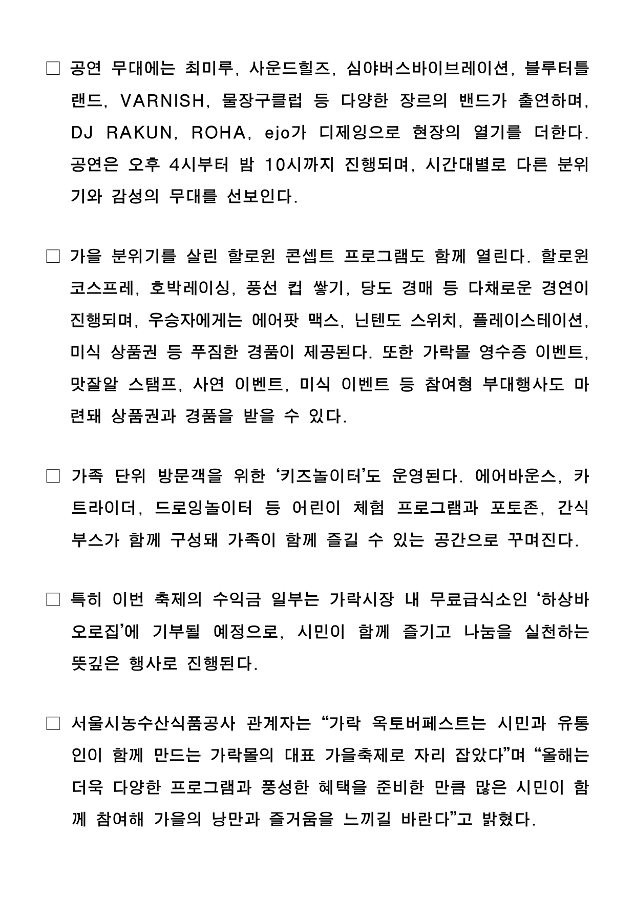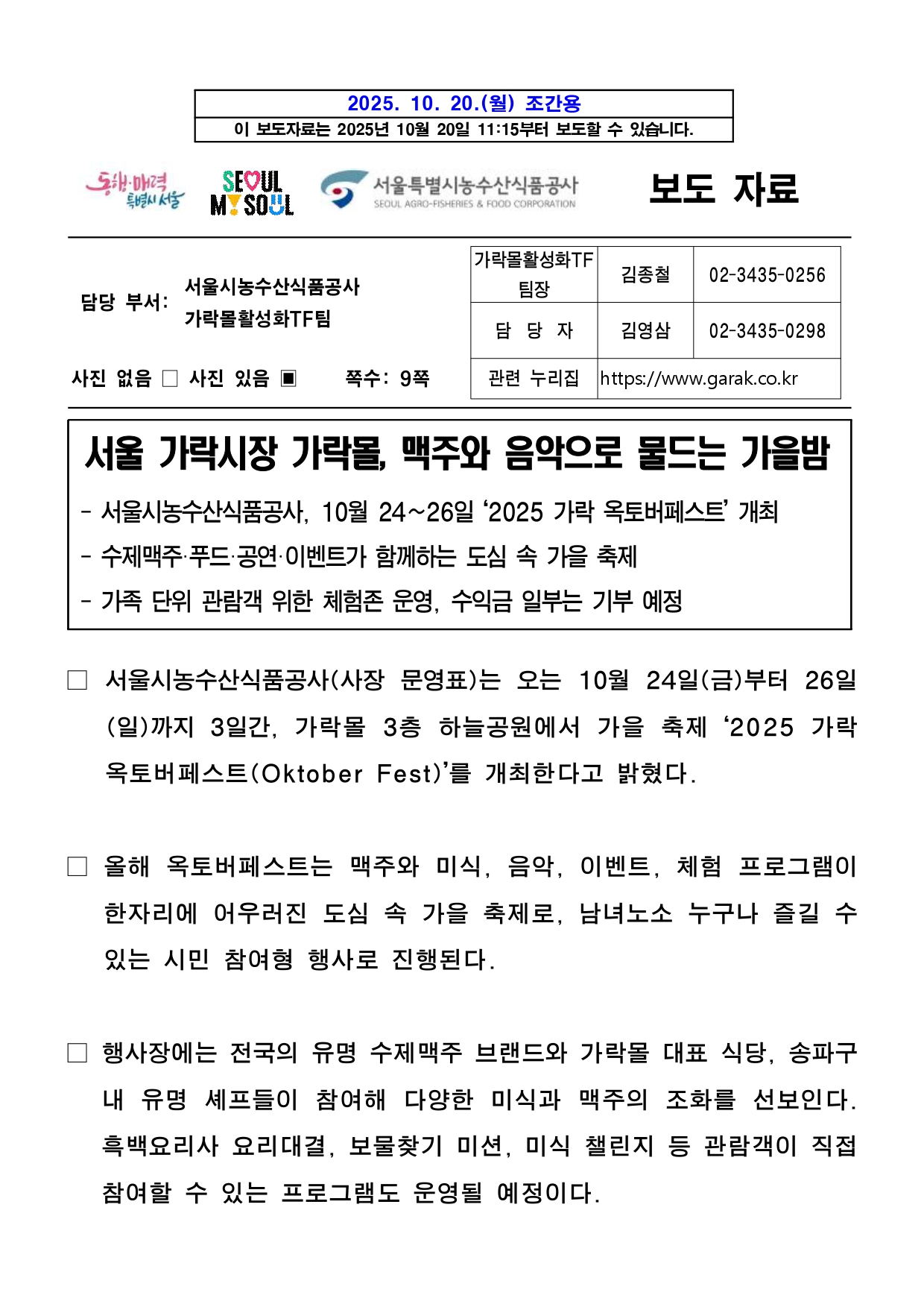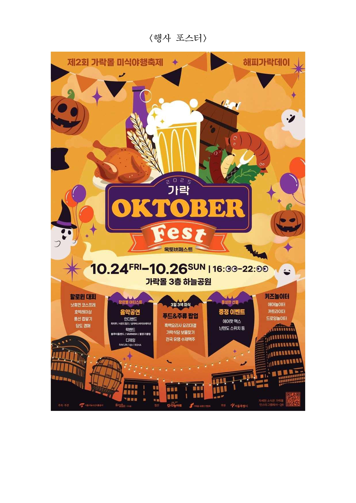 2025. 10. 20.(월) 조간용 이 보도자료는 2025년 10월 20일 11:15부터 보도할 수 있습니다. 보도 자료담당 부서: 서울시농수산식품공사 가락몰활성화TF팀 가락몰활성화TF 팀장 김종철 02-3435-0256 담 당 자 김영삼 02-3435-0298 사진 없음 □ 사진 있음 ▣ 쪽수: 9쪽 관련 누리집 https://www.garak.co.kr 서울 가락시장 가락몰, 맥주와 음악으로 물드는 가을밤- 서울시농수산식품공사, 10월 24~26일 ‘2025 가락 옥토버페스트’ 개최- 수제맥주·푸드·공연·이벤트가 함께하는 도심 속 가을 축제 - 가족 단위 관람객 위한 체험존 운영, 수익금 일부는 기부 예정 □ 서울시농수산식품공사(사장 문영표)는 오는 10월 24일(금)부터26일(일)까지 3일간, 가락몰 3층 하늘공원에서 가을 축제 ‘2025 가락옥토버페스트(Oktober Fest)’를 개최한다고 밝혔다. □ 올해 옥토버페스트는 맥주와 미식, 음악, 이벤트, 체험 프로그램이한자리에 어우러진 도심 속 가을 축제로, 남녀노소 누구나즐길수있는 시민 참여형 행사로 진행된다. □ 행사장에는 전국의 유명 수제맥주 브랜드와 가락몰 대표 식당, 송파구내 유명 셰프들이 참여해 다양한 미식과 맥주의 조화를 선보인다.흑백요리사 요리대결, 보물찾기 미션, 미식 챌린지 등 관람객이직접참여할 수 있는 프로그램도 운영될 예정이다. □ 공연 무대에는 최미루, 사운드힐즈, 심야버스바이브레이션, 블루터틀랜드, VARNISH, 물장구클럽 등 다양한 장르의 밴드가 출연하며,DJ RAKUN, ROHA, ejo가 디제잉으로 현장의 열기를더한다.공연은 오후 4시부터 밤 10시까지 진행되며, 시간대별로 다른분위기와 감성의 무대를 선보인다. □ 가을 분위기를 살린 할로윈 콘셉트 프로그램도 함께 열린다. 할로윈코스프레, 호박레이싱, 풍선 컵 쌓기, 당도 경매 등 다채로운경연이진행되며, 우승자에게는 에어팟 맥스, 닌텐도 스위치, 플레이스테이션,미식 상품권 등 푸짐한 경품이 제공된다. 또한 가락몰 영수증이벤트,맛잘알 스탬프, 사연 이벤트, 미식 이벤트 등 참여형 부대행사도마련돼 상품권과 경품을 받을 수 있다. □ 가족 단위 방문객을 위한 ‘키즈놀이터’도 운영된다. 에어바운스, 카트라이더, 드로잉놀이터 등 어린이 체험 프로그램과 포토존, 간식부스가 함께 구성돼 가족이 함께 즐길 수 있는 공간으로 꾸며진다. □ 특히 이번 축제의 수익금 일부는 가락시장 내 무료급식소인‘하상바오로집’에 기부될 예정으로, 시민이 함께 즐기고 나눔을 실천하는뜻깊은 행사로 진행된다. □ 서울시농수산식품공사 관계자는 “가락 옥토버페스트는 시민과유통인이 함께 만드는 가락몰의 대표 가을축제로 자리 잡았다”며“올해는더욱 다양한 프로그램과 풍성한 혜택을 준비한 만큼 많은 시민이함께 참여해 가을의 낭만과 즐거움을 느끼길 바란다”고 밝혔다. <행사 포스터> <미식 주류 라인업> <공연 라인업> <이벤트 안내>