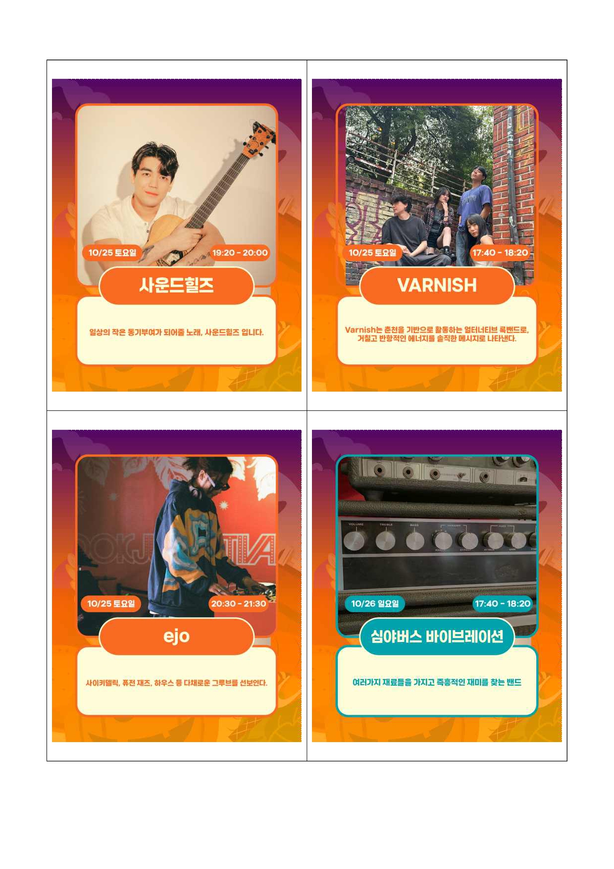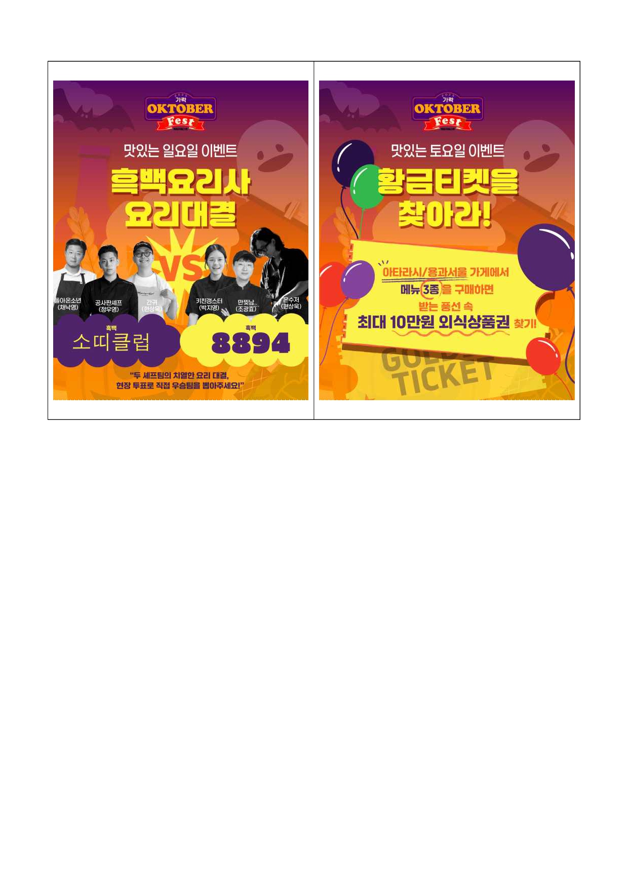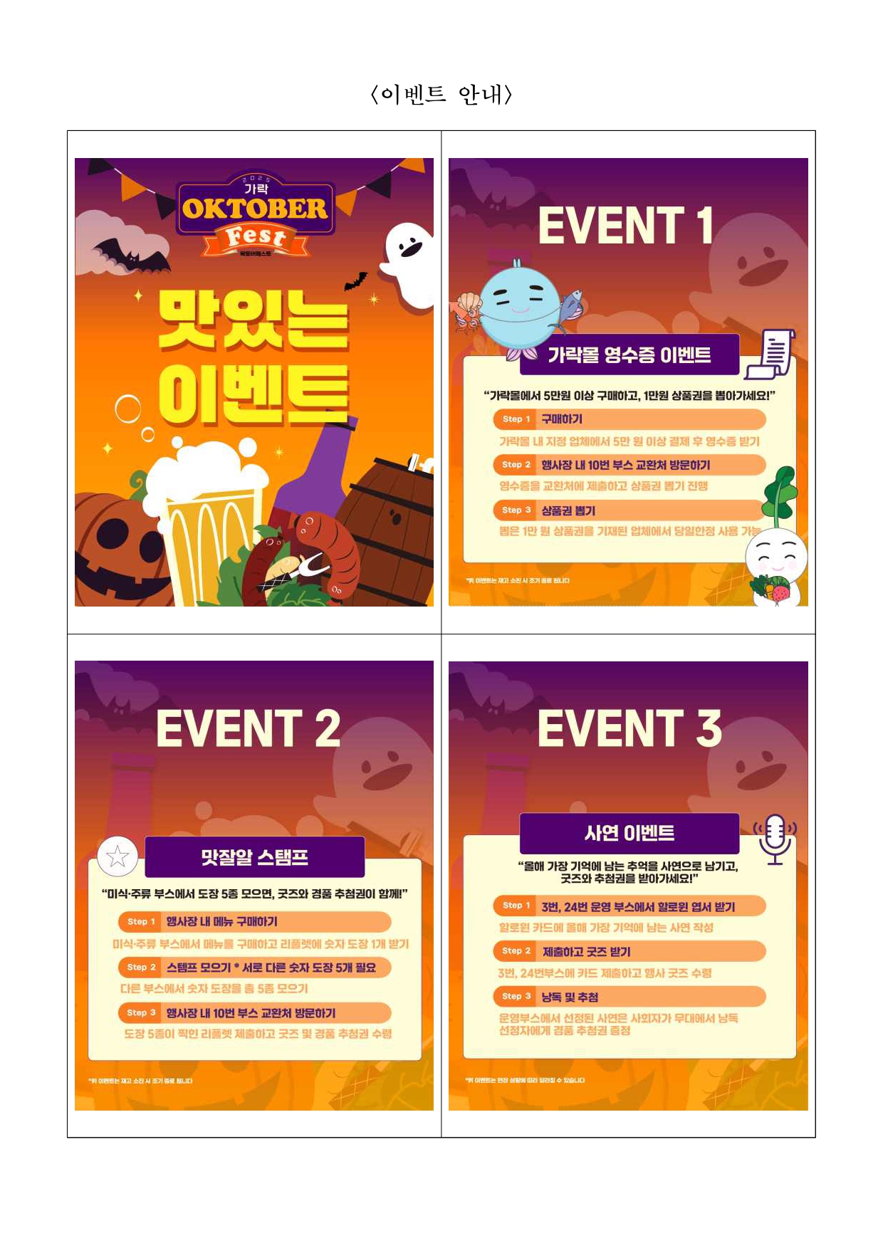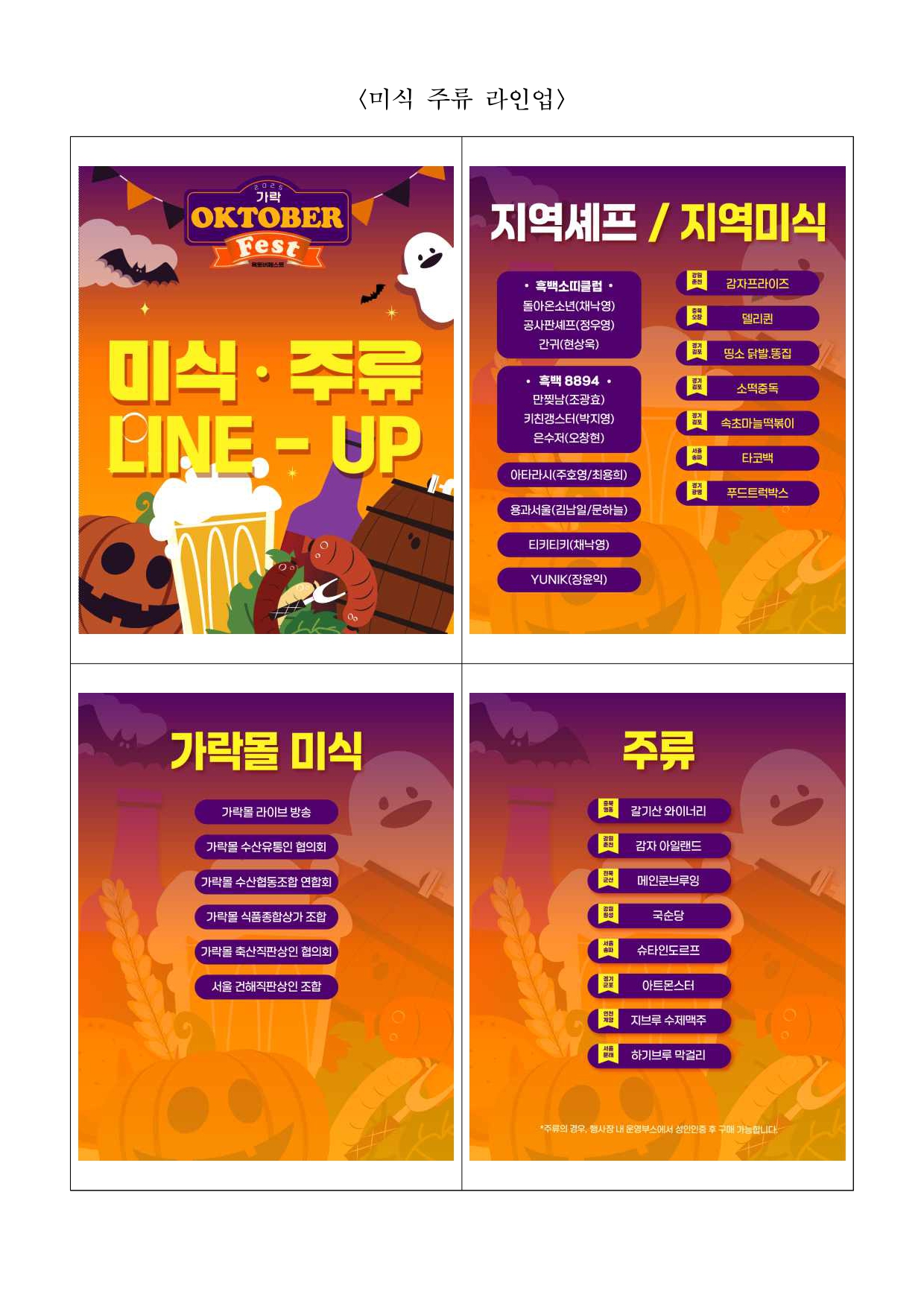 2025. 10. 20.(월) 조간용 이 보도자료는 2025년 10월 20일 11:15부터 보도할 수 있습니다. 보도 자료담당 부서: 서울시농수산식품공사 가락몰활성화TF팀 가락몰활성화TF 팀장 김종철 02-3435-0256 담 당 자 김영삼 02-3435-0298 사진 없음 □ 사진 있음 ▣ 쪽수: 9쪽 관련 누리집 https://www.garak.co.kr 서울 가락시장 가락몰, 맥주와 음악으로 물드는 가을밤- 서울시농수산식품공사, 10월 24~26일 ‘2025 가락 옥토버페스트’ 개최- 수제맥주·푸드·공연·이벤트가 함께하는 도심 속 가을 축제 - 가족 단위 관람객 위한 체험존 운영, 수익금 일부는 기부 예정 □ 서울시농수산식품공사(사장 문영표)는 오는 10월 24일(금)부터26일(일)까지 3일간, 가락몰 3층 하늘공원에서 가을 축제 ‘2025 가락옥토버페스트(Oktober Fest)’를 개최한다고 밝혔다. □ 올해 옥토버페스트는 맥주와 미식, 음악, 이벤트, 체험 프로그램이한자리에 어우러진 도심 속 가을 축제로, 남녀노소 누구나즐길수있는 시민 참여형 행사로 진행된다. □ 행사장에는 전국의 유명 수제맥주 브랜드와 가락몰 대표 식당, 송파구내 유명 셰프들이 참여해 다양한 미식과 맥주의 조화를 선보인다.흑백요리사 요리대결, 보물찾기 미션, 미식 챌린지 등 관람객이직접참여할 수 있는 프로그램도 운영될 예정이다. □ 공연 무대에는 최미루, 사운드힐즈, 심야버스바이브레이션, 블루터틀랜드, VARNISH, 물장구클럽 등 다양한 장르의 밴드가 출연하며,DJ RAKUN, ROHA, ejo가 디제잉으로 현장의 열기를더한다.공연은 오후 4시부터 밤 10시까지 진행되며, 시간대별로 다른분위기와 감성의 무대를 선보인다. □ 가을 분위기를 살린 할로윈 콘셉트 프로그램도 함께 열린다. 할로윈코스프레, 호박레이싱, 풍선 컵 쌓기, 당도 경매 등 다채로운경연이진행되며, 우승자에게는 에어팟 맥스, 닌텐도 스위치, 플레이스테이션,미식 상품권 등 푸짐한 경품이 제공된다. 또한 가락몰 영수증이벤트,맛잘알 스탬프, 사연 이벤트, 미식 이벤트 등 참여형 부대행사도마련돼 상품권과 경품을 받을 수 있다. □ 가족 단위 방문객을 위한 ‘키즈놀이터’도 운영된다. 에어바운스, 카트라이더, 드로잉놀이터 등 어린이 체험 프로그램과 포토존, 간식부스가 함께 구성돼 가족이 함께 즐길 수 있는 공간으로 꾸며진다. □ 특히 이번 축제의 수익금 일부는 가락시장 내 무료급식소인‘하상바오로집’에 기부될 예정으로, 시민이 함께 즐기고 나눔을 실천하는뜻깊은 행사로 진행된다. □ 서울시농수산식품공사 관계자는 “가락 옥토버페스트는 시민과유통인이 함께 만드는 가락몰의 대표 가을축제로 자리 잡았다”며“올해는더욱 다양한 프로그램과 풍성한 혜택을 준비한 만큼 많은 시민이함께 참여해 가을의 낭만과 즐거움을 느끼길 바란다”고 밝혔다. <행사 포스터> <미식 주류 라인업> <공연 라인업> <이벤트 안내>