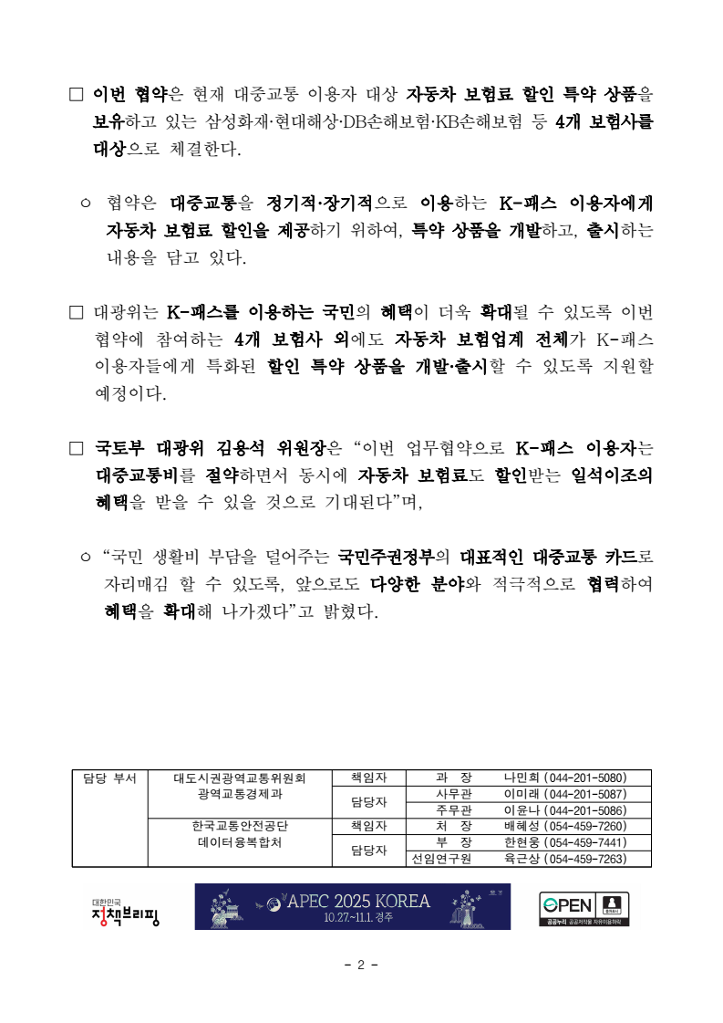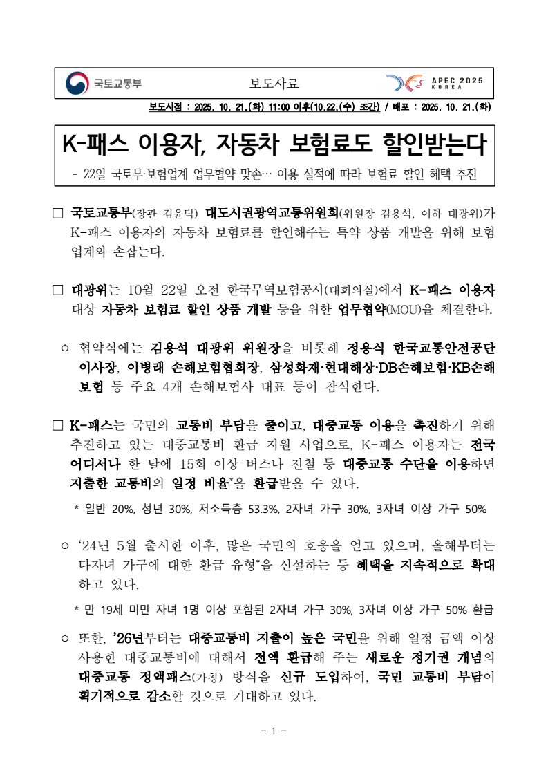 보도자료 - 1 - 보도시점 : 2025. 10. 21.(화) 11:00 이후(10.22.(수) 조간) / 배포 : 2025. 10. 21.(화) K-패스 이용자, 자동차 보험료도 할인받는다- 22일 국토부·보험업계 업무협약 맞손… 이용 실적에 따라 보험료 할인 혜택 추진 □ 국토교통부(장관 김윤덕) 대도시권광역교통위원회(위원장 김용석, 이하 대광위)가 K-패스 이용자의 자동차 보험료를 할인해주는 특약 상품 개발을 위해 보험업계와 손잡는다. □ 대광위는 10월 22일 오전 한국무역보험공사(대회의실)에서 K-패스 이용자대상 자동차 보험료 할인 상품 개발 등을 위한 업무협약(MOU)을 체결한다. ㅇ 협약식에는 김용석 대광위 위원장을 비롯해 정용식 한국교통안전공단 이사장, 이병래 손해보험협회장, 삼성화재·현대해상·DB손해보험·KB손해보험 등 주요 4개 손해보험사 대표 등이 참석한다. □ K-패스는 국민의 교통비 부담을 줄이고, 대중교통 이용을 촉진하기 위해추진하고 있는 대중교통비 환급 지원 사업으로, K-패스 이용자는 전국 어디서나 한 달에 15회 이상 버스나 전철 등 대중교통 수단을 이용하면 지출한 교통비의 일정 비율*을 환급받을 수 있다. * 일반 20%, 청년 30%, 저소득층 53.3%, 2자녀 가구 30%, 3자녀 이상 가구 50% ㅇ ‘24년 5월 출시한 이후, 많은 국민의 호응을 얻고 있으며, 올해부터는 다자녀 가구에 대한 환급 유형*을 신설하는 등 혜택을 지속적으로 확대하고 있다. * 만 19세 미만 자녀 1명 이상 포함된 2자녀 가구 30%, 3자녀 이상 가구 50% 환급ㅇ 또한, ’26년부터는 대중교통비 지출이 높은 국민을 위해 일정 금액 이상사용한 대중교통비에 대해서 전액 환급해 주는 새로운 정기권 개념의 대중교통 정액패스(가칭) 방식을 신규 도입하여, 국민 교통비 부담이획기적으로 감소할 것으로 기대하고 있다. - 2 - □ 이번 협약은 현재 대중교통 이용자 대상 자동차 보험료 할인 특약 상품을보유하고 있는 삼성화재·현대해상·DB손해보험·KB손해보험 등 4개 보험사를 대상으로 체결한다. ㅇ 협약은 대중교통을 정기적·장기적으로 이용하는 K-패스 이용자에게 자동차 보험료 할인을 제공하기 위하여, 특약 상품을 개발하고, 출시하는내용을 담고 있다. □ 대광위는 K-패스를 이용하는 국민의 혜택이 더욱 확대될 수 있도록 이번 협약에 참여하는 4개 보험사 외에도 자동차 보험업계 전체가 K-패스 이용자들에게 특화된 할인 특약 상품을 개발·출시할 수 있도록 지원할 예정이다. □ 국토부 대광위 김용석 위원장은 “이번 업무협약으로 K-패스 이용자는 대중교통비를 절약하면서 동시에 자동차 보험료도 할인받는 일석이조의 혜택을 받을 수 있을 것으로 기대된다”며, ㅇ “국민 생활비 부담을 덜어주는 국민주권정부의 대표적인 대중교통 카드로 자리매김 할 수 있도록, 앞으로도 다양한 분야와 적극적으로 협력하여 혜택을 확대해 나가겠다”고 밝혔다. 담당 부서 대도시권광역교통위원회 책임자 과 장 나민희 (044-201-5080) 광역교통경제과 담당자 사무관 이미래 (044-201-5087) 주무관 이윤나 (044-201-5086) 한국교통안전공단 책임자 처 장 배혜성 (054-459-7260) 데이터융복합처 담당자 부 장 한현웅 (054-459-7441) 선임연구원 육근상 (054-459-7263)