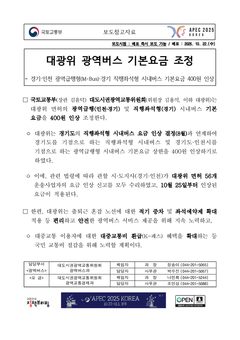 보도참고자료 보도시점 : 배포 즉시 보도 가능 / 배포 : 2025. 10. 22.(수) 대광위 광역버스 기본요금 조정- 경기·인천 광역급행형(M-Bus)·경기 직행좌석형 시내버스 기본요금 400원 인상□ 국토교통부(장관 김윤덕) 대도시권광역교통위원회(위원장 김용석, 이하 대광위)는대광위 면허의 광역급행(인천‧경기) 및 직행좌석형(경기) 시내버스 기본요금을 400원 인상 조정한다. ㅇ 대광위는 경기도의 직행좌석형 시내버스 요금 인상 결정(8월)과 연계하여경기도를 기점으로 하는 직행좌석형 시내버스 및 경기도·인천시를 기점으로 하는 광역급행형 시내버스 기본요금 상한을 400원 인상하기로하였다. ㅇ 이에, 관련 법령에 따라 관할 시·도지사(경기·인천)가 대광위 면허 56개운송사업자의 요금 인상 신고를 모두 수리하였고, 10월 25일부터 인상된요금이 적용된다. □ 한편, 대광위는 출퇴근 혼잡 노선에 대한 적기 증차 및 좌석예약제 확대적용 등 편리하고 안전한 광역버스 서비스 제공을 위해 지속 노력하고, ㅇ 대중교통 이용자에 대한 대중교통비 환급(K-패스) 혜택을 확대하는 등 국민 교통비 절감을 위해 노력할 계획이다. 담당부서 대도시권광역교통위원회 책임자 과 장 정송이 (044-201-5065) <광역버스> 광역버스과 담당자 사무관 박수진 (044-201-5067) <요 금> 대도시권광역교통위원회 책임자 과 장 나민희 (044-201-5244) 광역교통경제과 담당자 사무관 조인상 (044-201-5088)