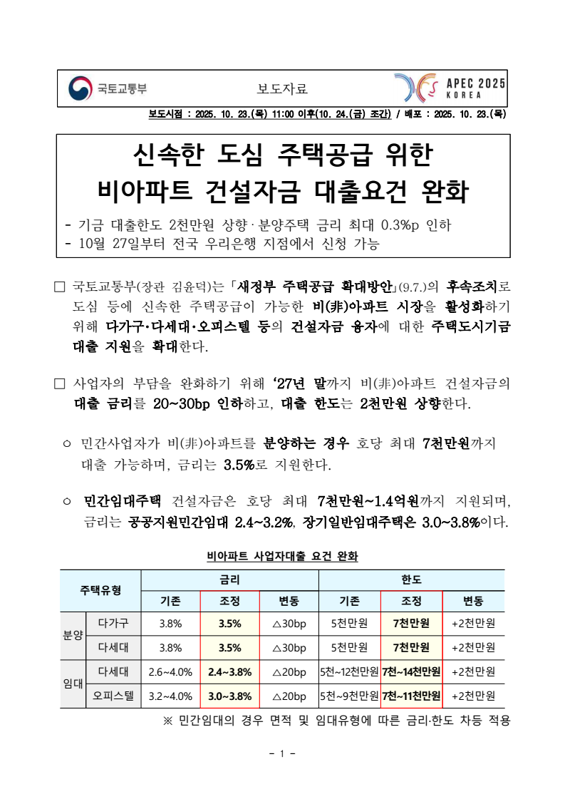 - 1 - 보도자료 보도시점 : 2025. 10. 23.(목) 11:00 이후(10. 24.(금) 조간) / 배포 : 2025. 10. 23.(목) 신속한 도심 주택공급 위한비아파트 건설자금 대출요건 완화- 기금 대출한도 2천만원 상향 ‧ 분양주택 금리 최대 0.3%p 인하 - 10월 27일부터 전국 우리은행 지점에서 신청 가능 □ 국토교통부(장관 김윤덕)는「새정부 주택공급 확대방안」(9.7.)의 후속조치로 도심 등에 신속한 주택공급이 가능한 비(非)아파트 시장을 활성화하기 위해 다가구・다세대・오피스텔 등의 건설자금 융자에 대한 주택도시기금 대출 지원을 확대한다. □ 사업자의 부담을 완화하기 위해 ‘27년 말까지 비(非)아파트 건설자금의 대출 금리를 20~30bp 인하하고, 대출 한도는 2천만원 상향한다. ㅇ 민간사업자가 비(非)아파트를 분양하는 경우 호당 최대 7천만원까지 대출 가능하며, 금리는 3.5%로 지원한다. ㅇ 민간임대주택 건설자금은 호당 최대 7천만원~1.4억원까지 지원되며, 금리는 공공지원민간임대 2.4~3.2%, 장기일반임대주택은 3.0~3.8%이다. 주택유형 금리 한도 기존 조정 변동 기존 조정 변동 분양 다가구 3.8% 3.5% △30bp 5천만원 7천만원 +2천만원다세대 3.8% 3.5% △30bp 5천만원 7천만원 +2천만원임대 다세대 2.6~4.0% 2.4~3.8% △20bp 5천~12천만원 7천~14천만원 +2천만원오피스텔 3.2~4.0% 3.0~3.8% △20bp 5천~9천만원 7천~11천만원 +2천만원비아파트 사업자대출 요건 완화 ※ 민간임대의 경우 면적 및 임대유형에 따른 금리·한도 차등 적용 - 2 - □ 건축허가 또는 주택건설사업승인을 받은 사업자는 10월 27일부터 전국우리은행 지점을 통해 완화된 요건의 비(非)아파트 건설자금 사업자대출신청이 가능하며, 신청 전에 자세한 상담을 받을 수 있도록 전담상담센터(044-862-2410)를 운영한다. □ 국토교통부 김헌정 주택정책관은 “자금 조달에 어려움을 겪는 소규모 비(非)아파트 사업자의 사업 여건이 한층 개선될 전망”이라면서, “주택공급이 부족한 지역에서 신속한 공급을 통해 주택시장 안정에 기여할 것으로 기대한다”고 밝혔다. 국토교통부 주택정책관 책임자 과 장 정수호 (044-201-3337) <총괄> 주택기금과 담당자 서기관 신 연 (044-201-3339) <공동> 우리은행 책임자 부부장 송재웅 (02-2002-5594) 주택기금부 전담상담 차 장 이재훈 (직통: 044-862-2410) (상담예약: 1599-0800)