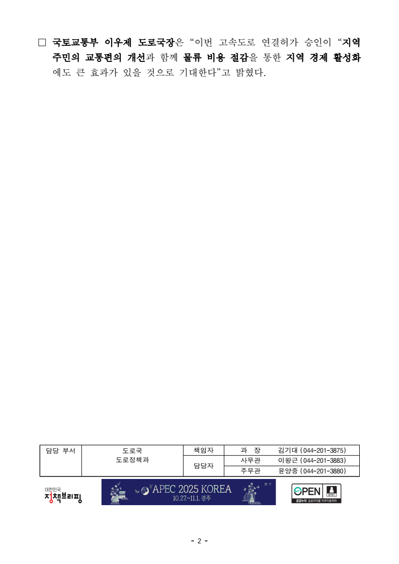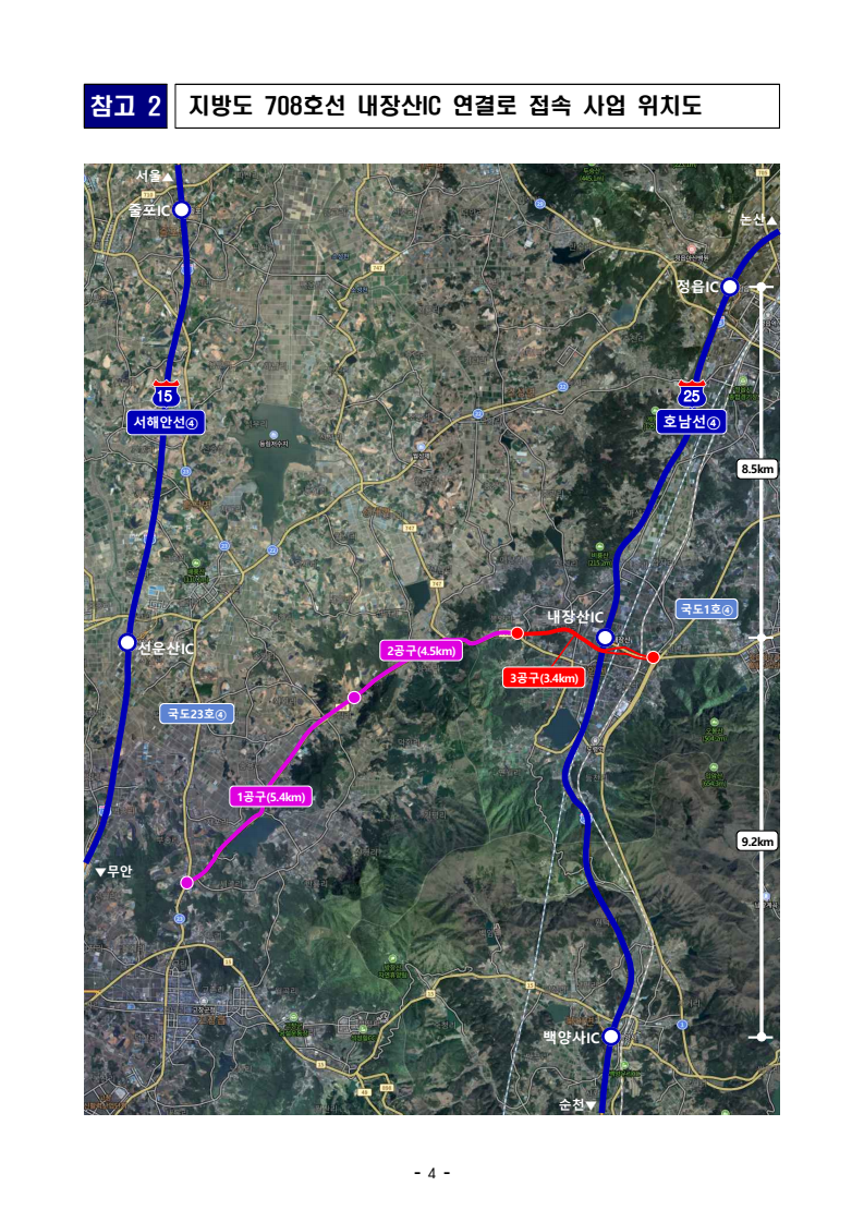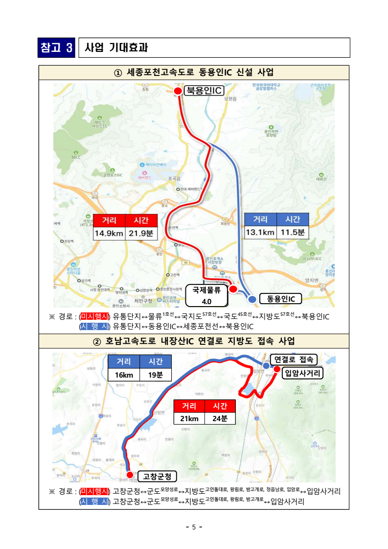 - 1 - 보도참고자료 보도 시점 : 배포 즉시 보도 가능 / 배포 : 2025. 10. 23.(목) “세종포천고속도로 동용인IC 신설, 호남고속도로 내장산IC 연결로” 연결허가 승인- (동용인IC 신설) 용인 국제물류단지 연계 및 경기 용인지역 고속도로 접근성 향상- (내장산IC 연결로 접속) 전북 고창군, 정읍시지역 간선도로망 효율적 연결□ 국토교통부(장관 김윤덕)는 고속도로 접근성을 높이고, 간선도로망을 효율적으로 연계하기 위해 세종포천고속도로 동용인IC 신설과 호남고속도로 내장산IC 연결로 접속하기 위한 고속도로 연결허가를 승인하였다. ㅇ 동용인IC 신설은 용인 국제물류4.0 유통단지의 고속도로 접근성 향상과경기도 용인특례시 주민들의 이동 편의를 위하여 추진되는 사업으로, - 총 사업비 약 936억원, 일평균 교통량은 27,471대로, 용인시 처인구 양지면 일원에 설치되어 향후 물류단지 진입도로 및 국도 42호선과 연결되며, 실시설계(1년)와 건설공사(3년)를 거쳐 ’29년 개통될 예정이다. - 동용인IC가 개통되면, 용인 국제물류4.0 유통단지와 서울 간 이동거리는 최대 2km, 이동시간은 10분 정도 단축이 예상된다, * (미시행시: 북용인IC 이용) 15km, 22분 소요 ⇨ (시행시: 동용인IC 이용) 13km, 12분 소요ㅇ 전라북도는 ‘고창~내장IC 간 지방도 확·포장공사(3공구)’의 종점을호남고속도로 내장산IC 연결로에 접속하기 위해 고속도로 연결허가를 신청하였다. - 이 (연결)사업은 총 사업비 약 611억원, 일평균 교통량은 10,621대로, 전라북도 정읍시 입암면 일원에 설치되며, ’30년 개통될 예정이다. - 지방도 708호선이 내장산IC 연결로에 접속이 되면, 고창군과 정읍시 입암면 간 이동거리는 최대 5km, 이동시간은 5분 정도 단축이 예상된다. * 〔고창군청↔입암사거리〕 (미시행시) 21km, 24분 소요 ⇨ (시행시) 16km, 19분 소요 - 2 - □ 국토교통부 이우제 도로국장은 “이번 고속도로 연결허가 승인이 “지역 주민의 교통편의 개선과 함께 물류 비용 절감을 통한 지역 경제 활성화에도 큰 효과가 있을 것으로 기대한다”고 밝혔다. 담당 부서 도로국 책임자 과 장 김기대 (044-201-3875) 도로정책과 담당자 사무관 이왕근 (044-201-3883) 주무관 윤양중 (044-201-3880) - 3 - 참고 1 동용인IC 신설 사업 위치도 용인IC 용인JC 양지IC) ◀인천 강릉▶서용인JC 마성IC 북용인JC 북용인IC 포곡IC 도척IC (9,695대/일) ◀화성 광주▶▲포천 세종▼ 하남▲ 청주▶50 400 세종포천선⑥ 29 동용인IC (양방향 진출입) 양지졸음쉼터 영동선⑧ 수도권제2순환선④ 남용인IC (‘25.12 개통) 35 1.2km 1.0km 9.8km 3.0km 7.0km 용인휴게소 용인 국제물류4.0 (95만㎡, 민간, ‘19~’29) 국지도57호선 (공사중) 도시계획도로 (공사중) - 4 - 참고 2 지방도 708호선 내장산IC 연결로 접속 사업 위치도 정읍IC 백양사IC 내장산IC 선운산IC 줄포IC 논산▲순천▼ 서울▲ ▼무안 국도23호④ 국도1호④ 15 서해안선④ 호남선④ 25 1공구(5.4km) 2공구(4.5km) 3공구(3.4km) 8.5km 9.2km - 5 - 참고 3 사업 기대효과 ① 세종포천고속도로 동용인IC 신설 사업 국제물류 4.0 동용인IC ※ 경로 : (미시행시) 유통단지↔물류1호선↔국지도57호선↔국도45호선↔지방도57호선↔북용인IC (시 행 시) 유통단지↔동용인IC↔세종포천선↔북용인IC ② 호남고속도로 내장산IC 연결로 지방도 접속 사업 고창군청 입암사거리 연결로 접속 ※ 경로 : (미시행시) 고창군청↔군도모양성로↔지방도고인돌대로, 왕림로, 밤고개로, 정읍남로, 입암로↔입암사거리 (시 행 시) 고창군청↔군도모양성로↔지방도고인돌대로, 왕림로, 밤고개로↔입암사거리 거리 시간 21km 24분 거리 시간 16km 19분